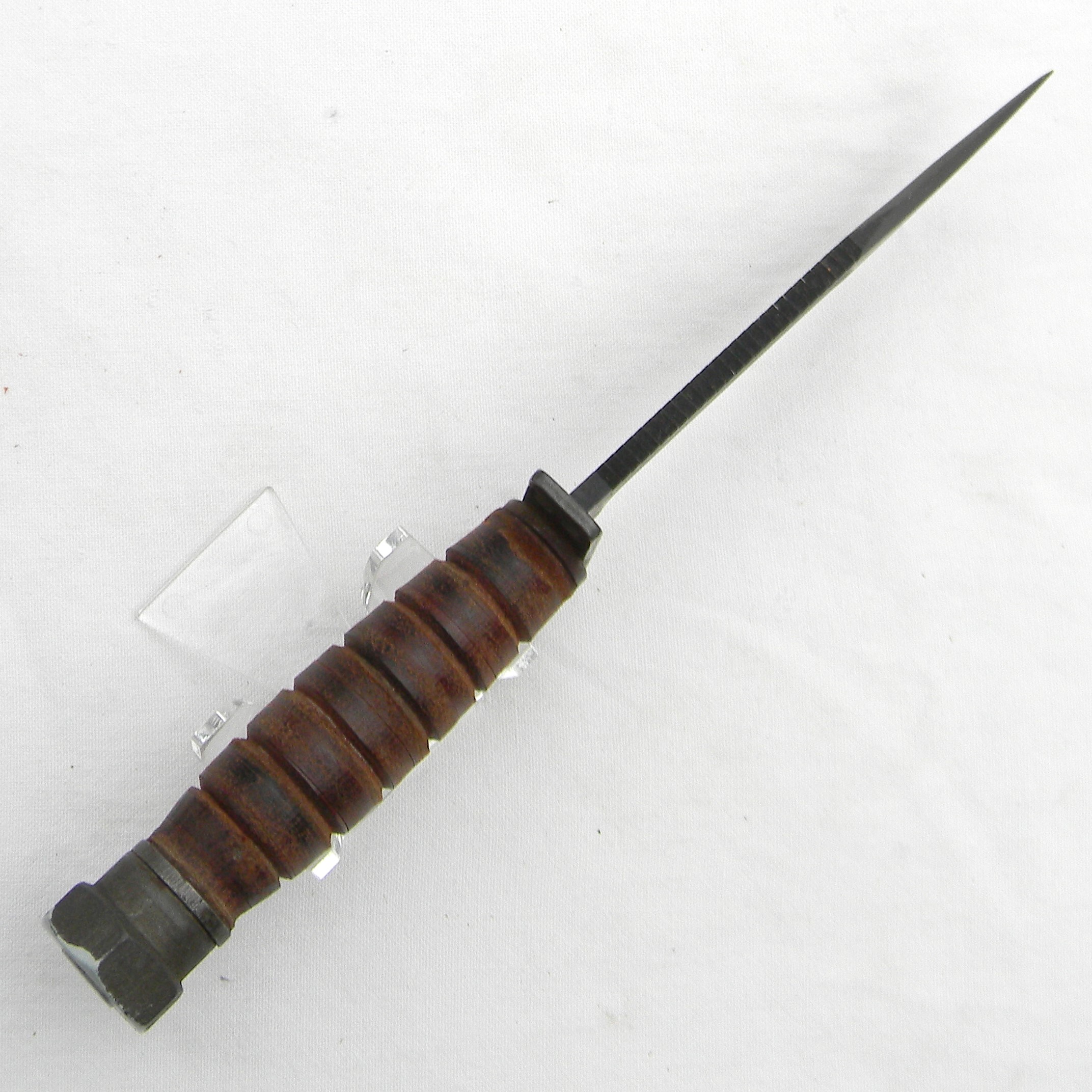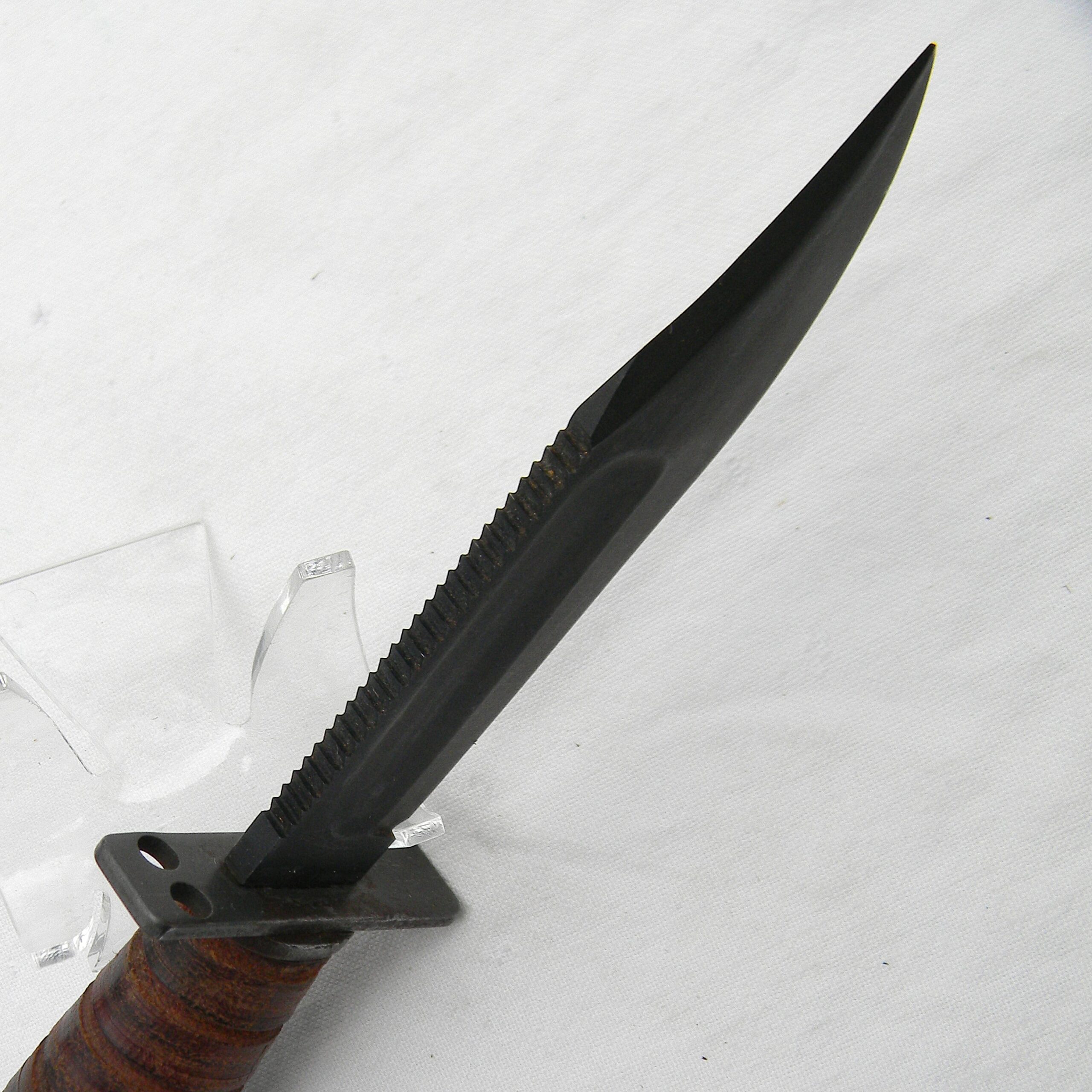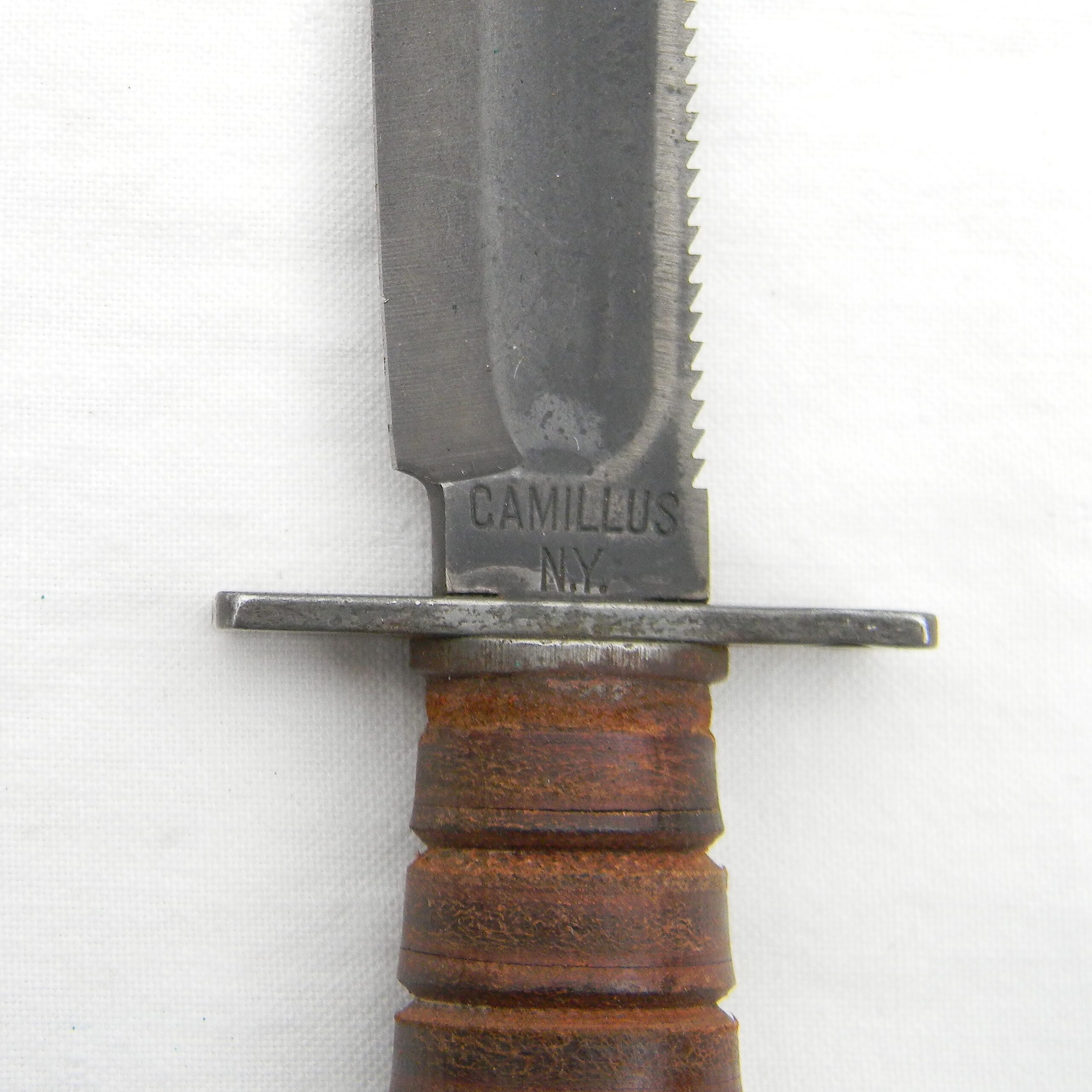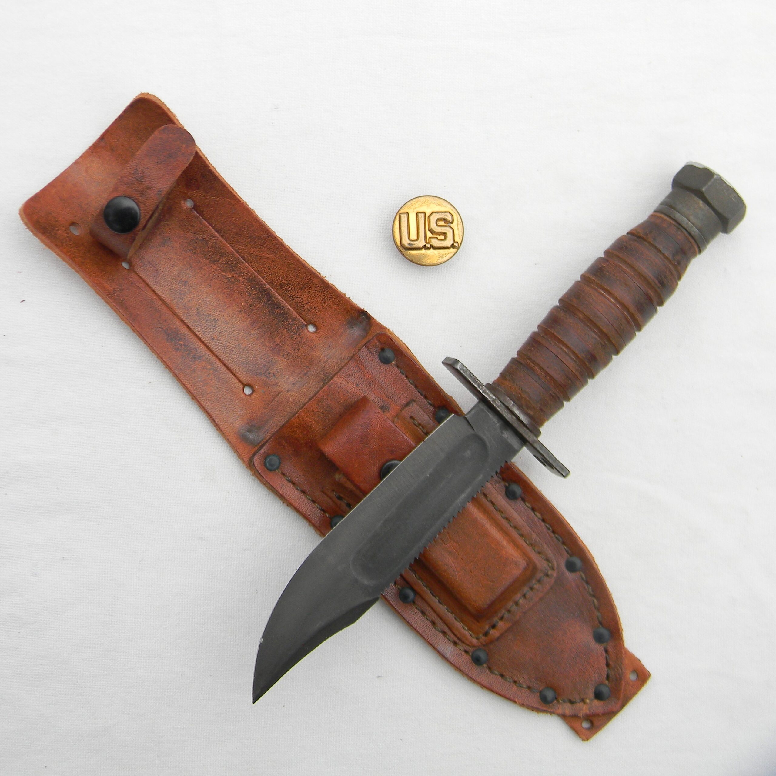 This rare early Vietnam War 1960s Camillus Jet Pilot Knife with original leather scabbard and Pike honing stone has not been cleaned or tampered with in any way, this set is in 100% original “as is” condition; these are the actual photos. I have a few Vietnam War era knives and bayonets, as well as some American, British, Commonwealth, and German WW2 era combat knives and bayonets and several scarce WW1 and WW2 fighting daggers / trench knives – please take a look in the Militaria section.