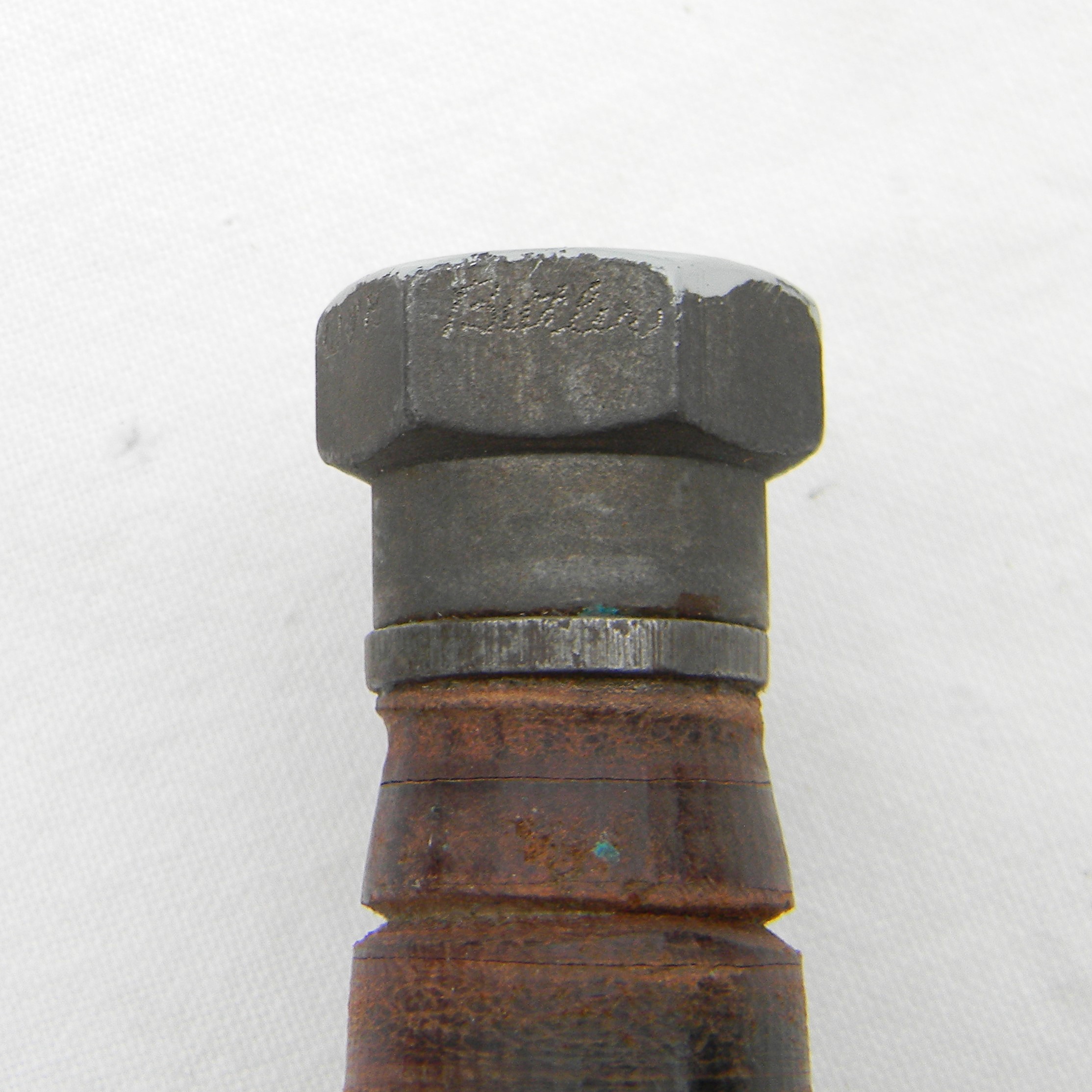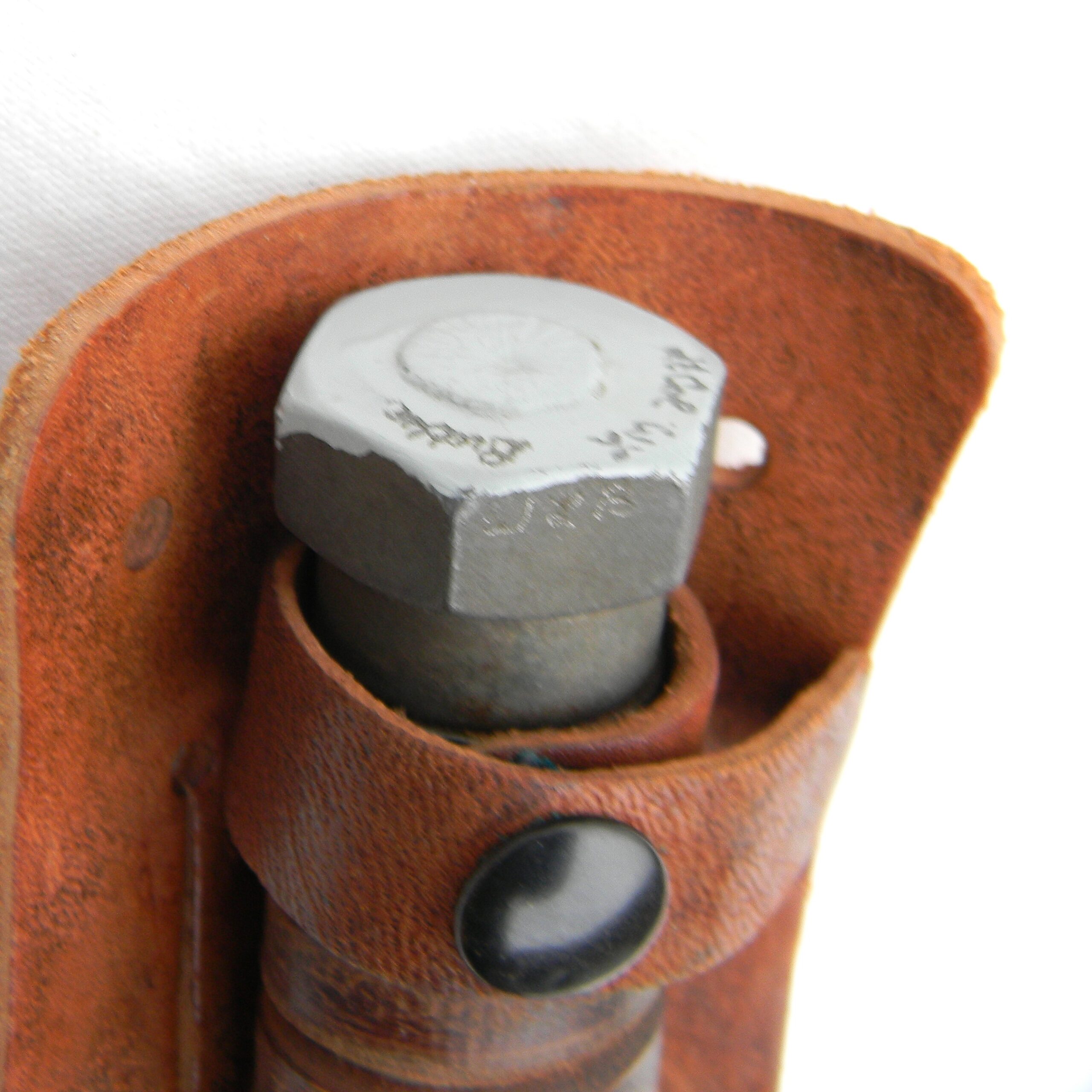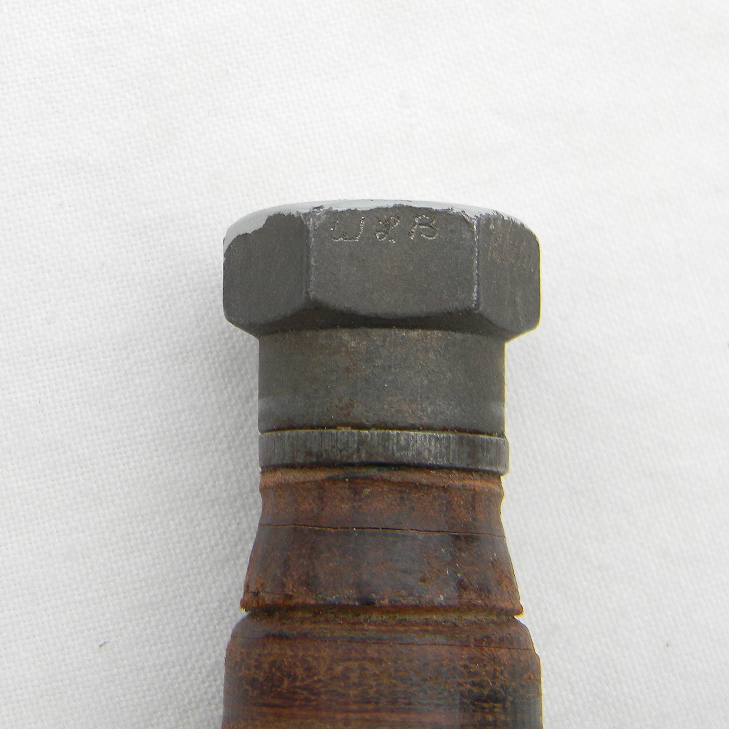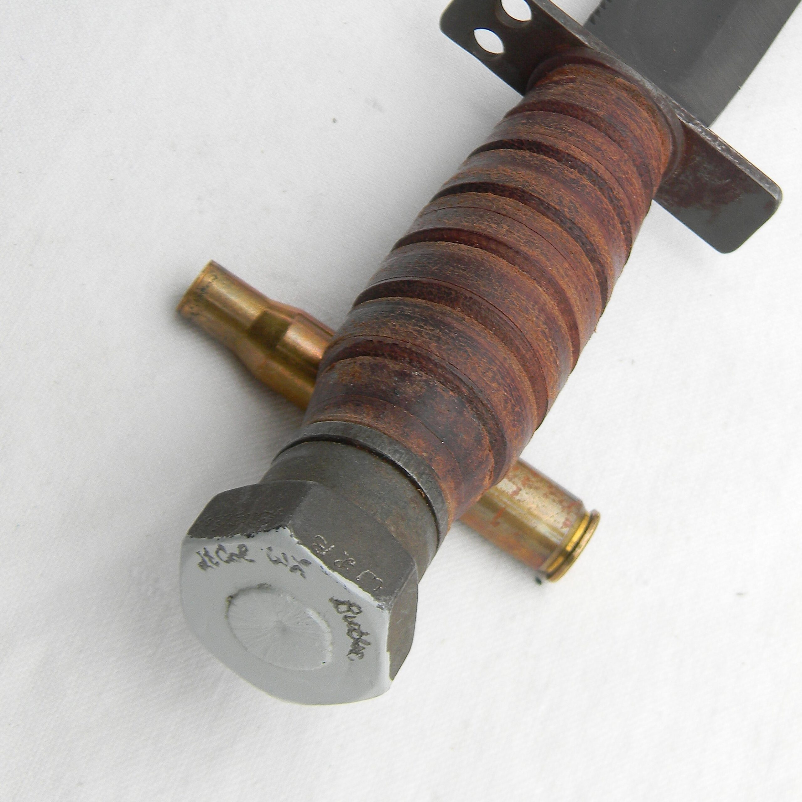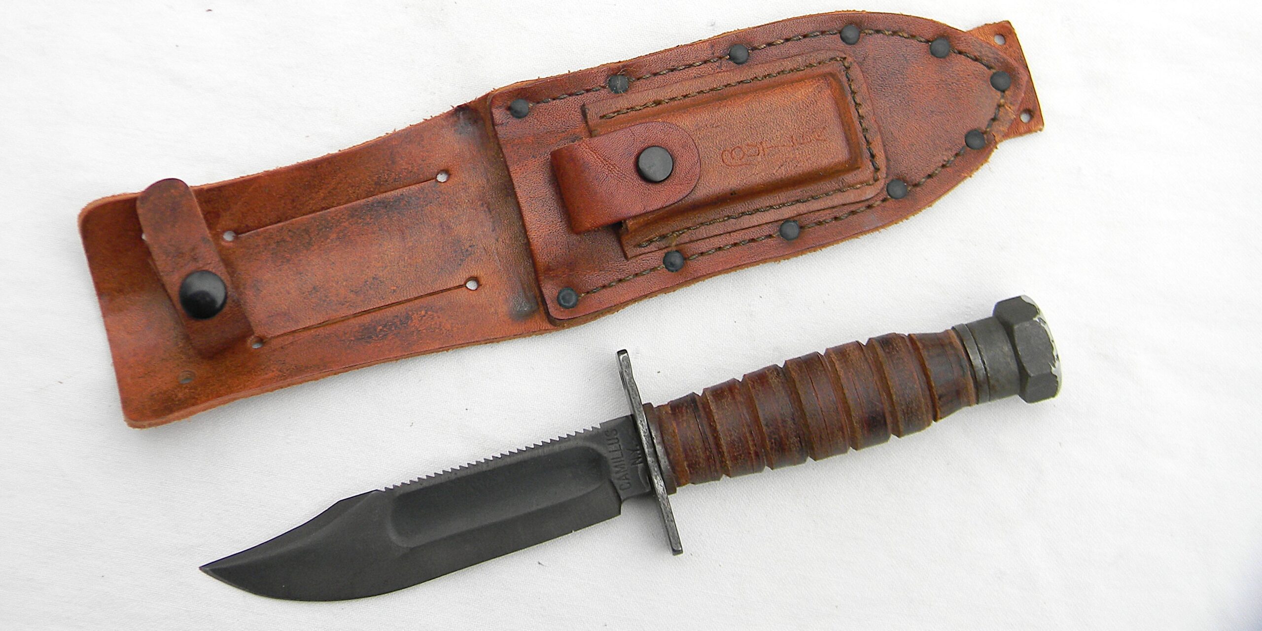 The pommel is signed over the paint and engraved on the hex sides with electro pencil WLB Butler; the scabbard is also inscribed Butler on the honing stone pocket. The knife is about 9-1/2″ / 24.2 cm overall; parkerized blade is about 5″ /12.7 cm. Original factory edge; the tip is intact; no contact marks on the pommel. The saw teeth on the blade’s spine are in excellent condition. Stacked leather washers handle with iron guard and hammer-like pommel; the handle is solid; all parts are tight with no play. Original-issue early all-leather type scabbard with a honing stone in the front pocket are in excellent condition. The scabbard and Norton Pike sharpening stone are unused. The leather is soft and supple still; all original stitching and rivets are intact, original keeper is intact and tight. This Vietnam War 1960s Camillus Jet Pilot Knife / original scabbard set is in excellent overall condition, you will not be disappointed. This great-looking Vietnam War 1960s Camillus Jet Pilot Knife will make an excellent addition to any collection of military blades.