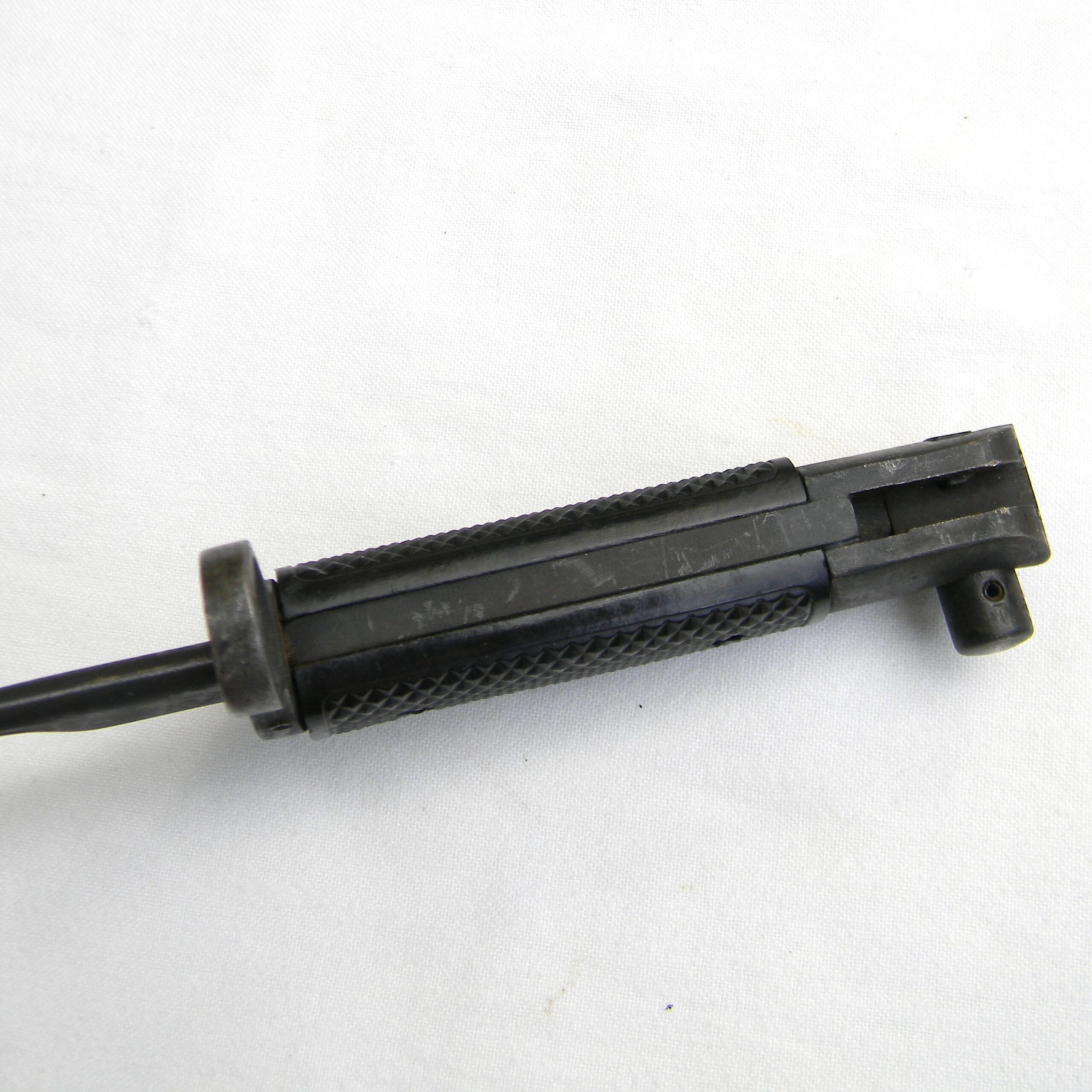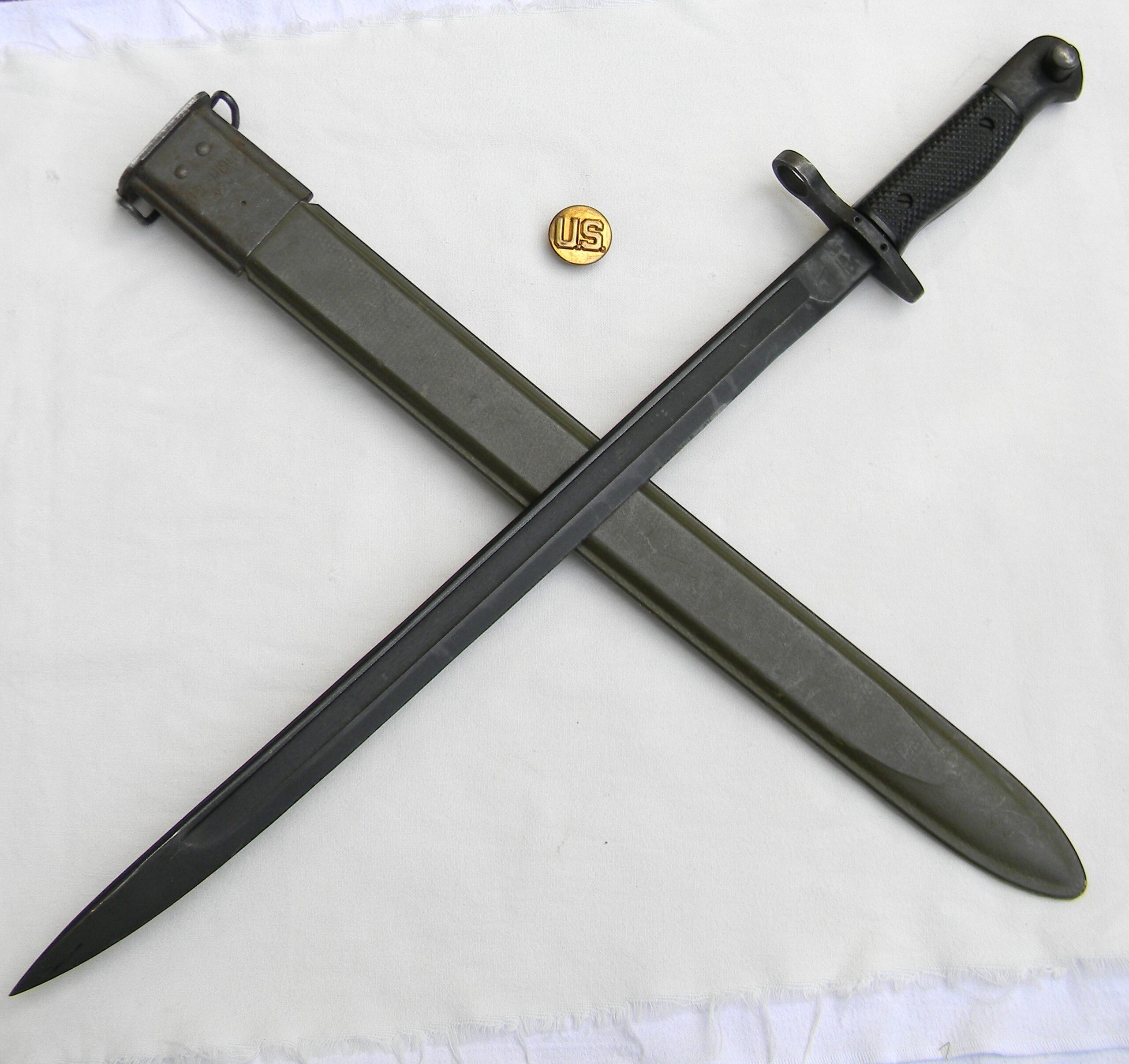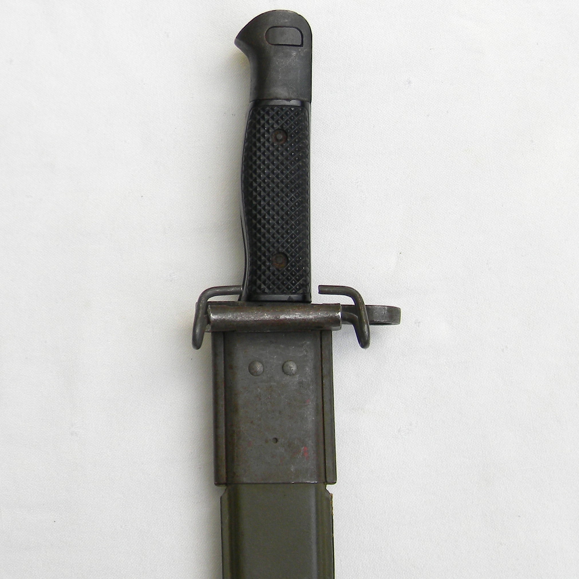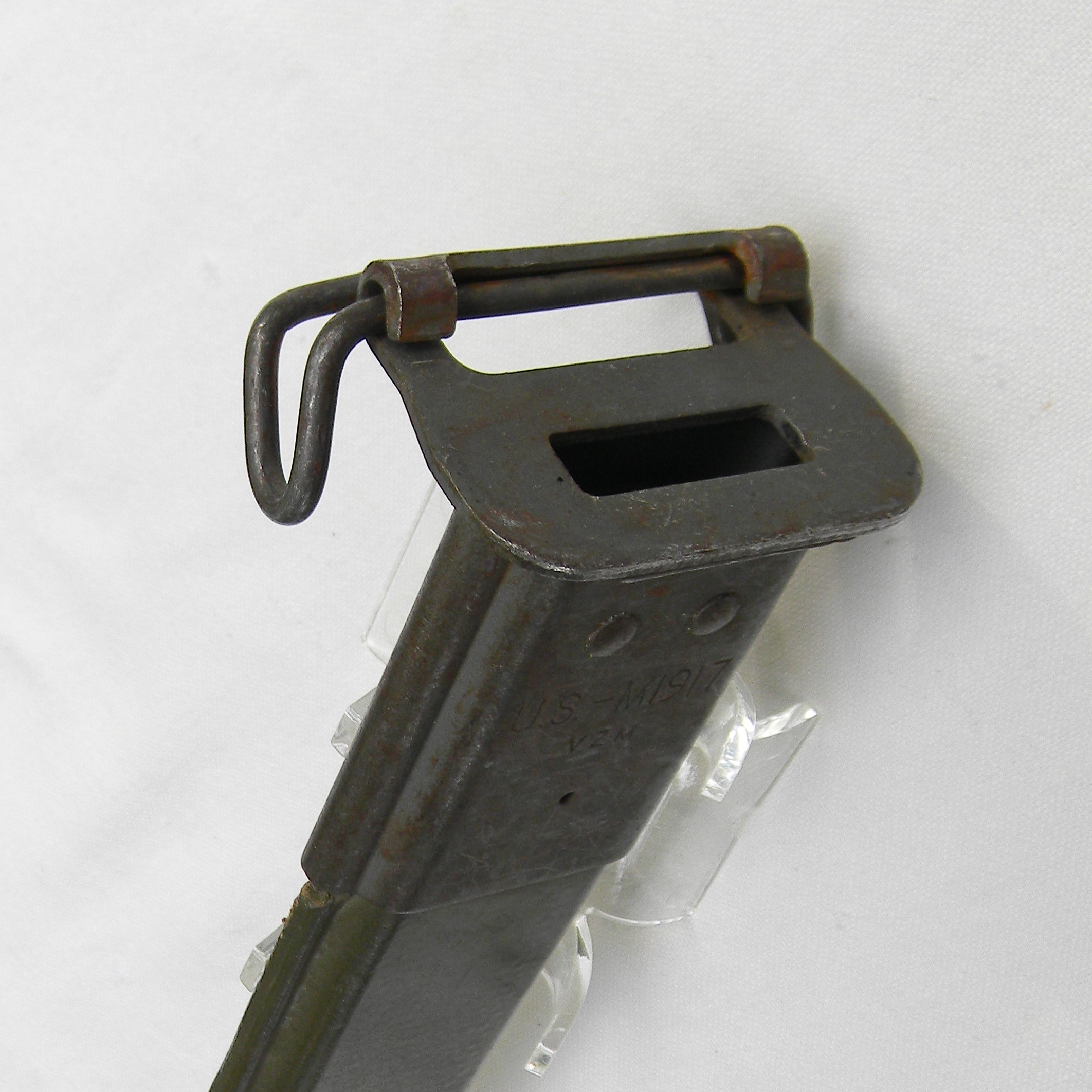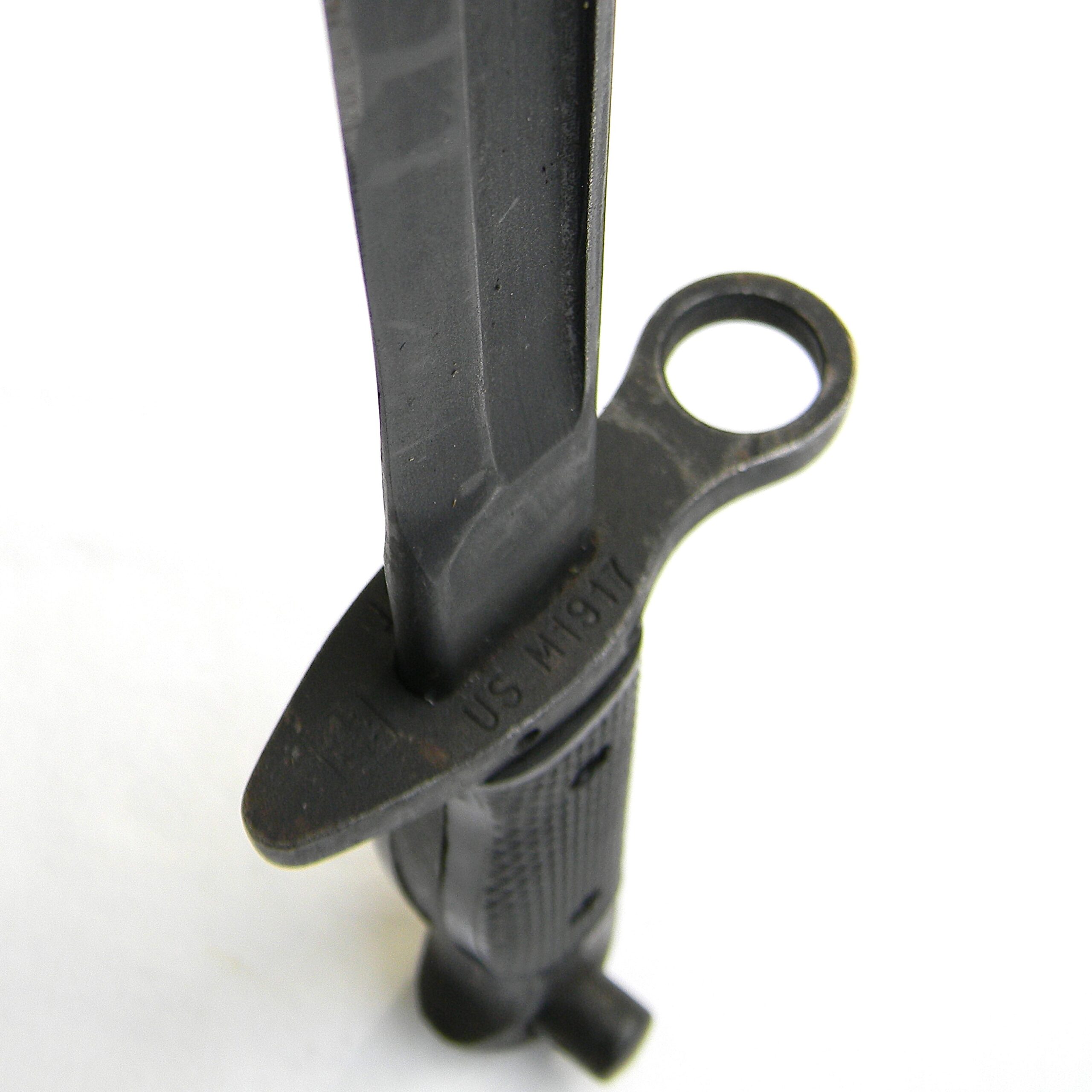 Scarce Vietnam War era US M1917 “trench gun” bayonet issued for the US military 12-gauge pump-action trench guns. The bayonet and the original US-M1917 VZM-marked composition scabbard are in practically unused condition; this type is VERY hard to find this nice. The M1917 originated in the WW1 era; interestingly enough this type was also used in combat in WW2, as well as during the Korean and Vietnam War. More information on this rare bayonet type could be found here, courtesy of Wikipedia. I also have a rare Canadian-made M1917 trench gun bayonet that was ordered by the US military when it became apparent that there will not be enough trench guns bayonets to meet demand. Canadian-made M1917s are scarce in general and are VERY hard to find in the pristine condition; don’t miss your chance!