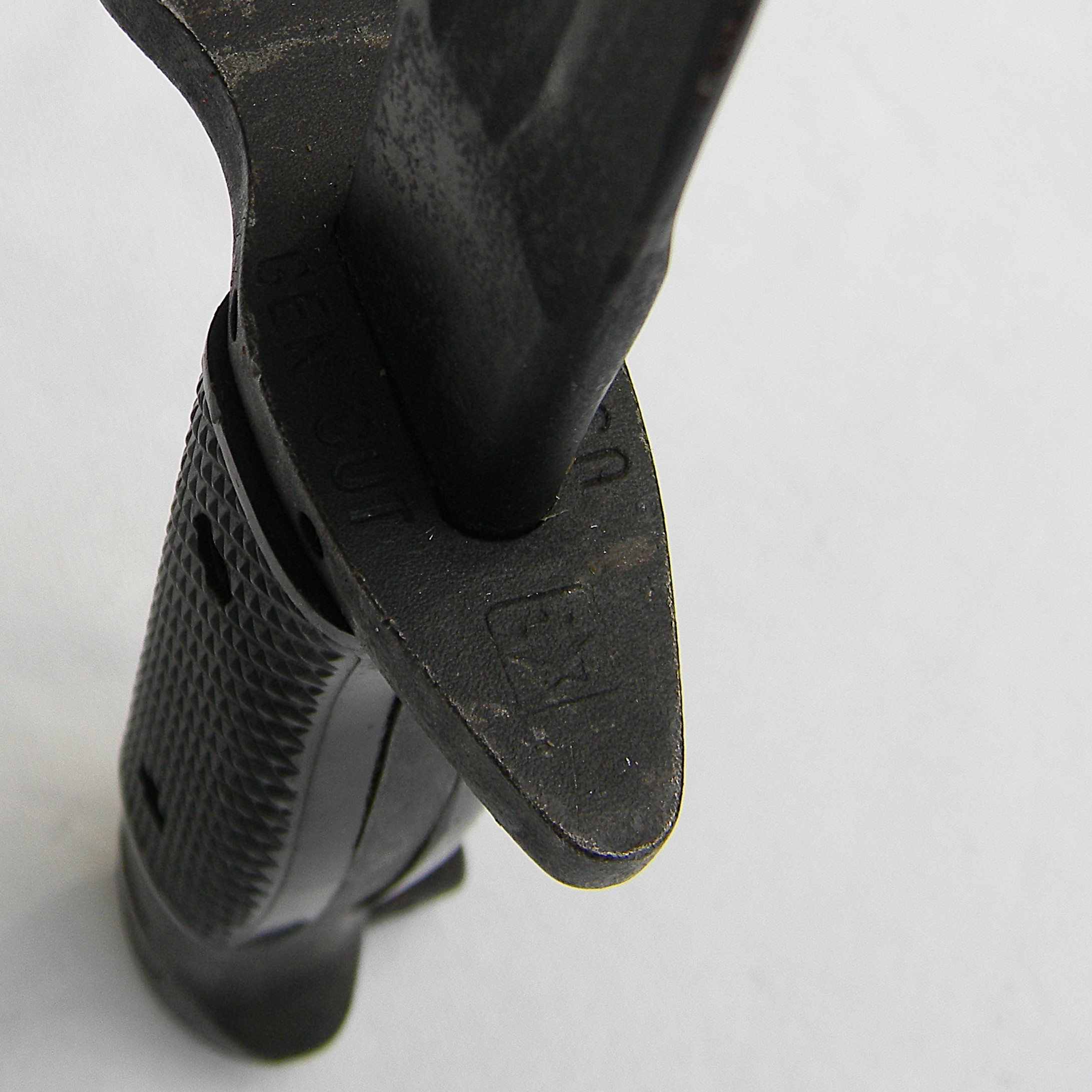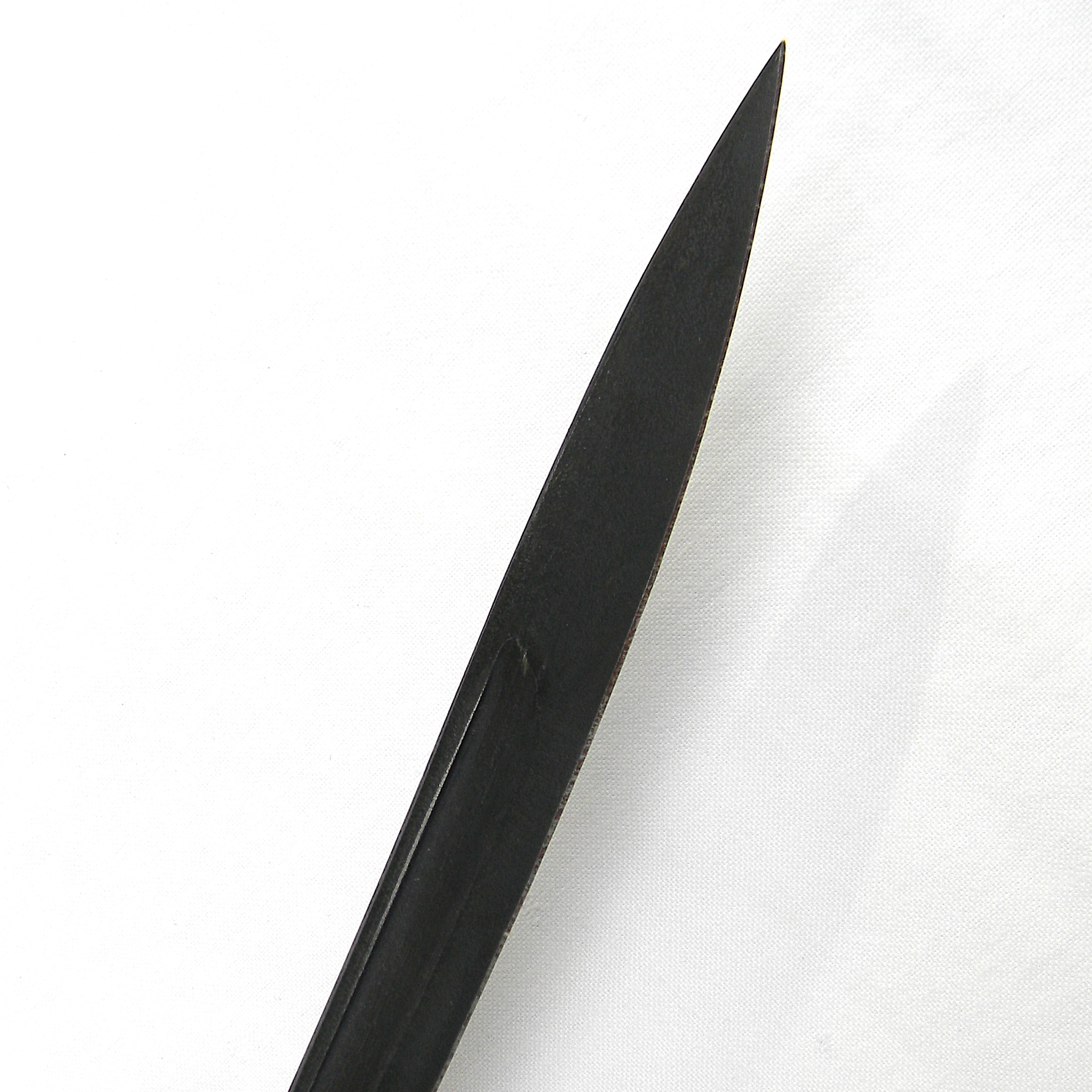 This rare M1917 specimen was manufactured circa 1966-1967 by General Cutlery in Fremont, Ohio (stamped GEN CUT on the guard), under the government contract – see the DOD “spread eagle” acceptance stamp on the guard indicating the early-war manufacture. This is a high-quality manufacture bayonet with crisp blade lines and excellent dark-gray parkerized finish throughout; the blade is very sharp with an original edge; needle-like tip is intact. Black plastic handle grips are perfect with no chips or cracks. All handle parts are tight; the pommel is intact and problem-free; bayonet release mechanism is excellent and 100% functional. The bayonet is about 21-1/2″ / 54.5 cm overall; the blade is about 16-3/4″ / 42.3 cm long. Original composition scabbard was made by Viz Manufacturing Co. in Philadelphia, PA – marked VZM on the throat. The scabbard is in great overall condition with just one small chip at the tip – see photos. This original Vietnam War Gen Cut M1917 trench gun bayonet and its correct original BA Inc scabbard are in overall condition. A desirable and highly collectible type; VERY rare this nice and complete.