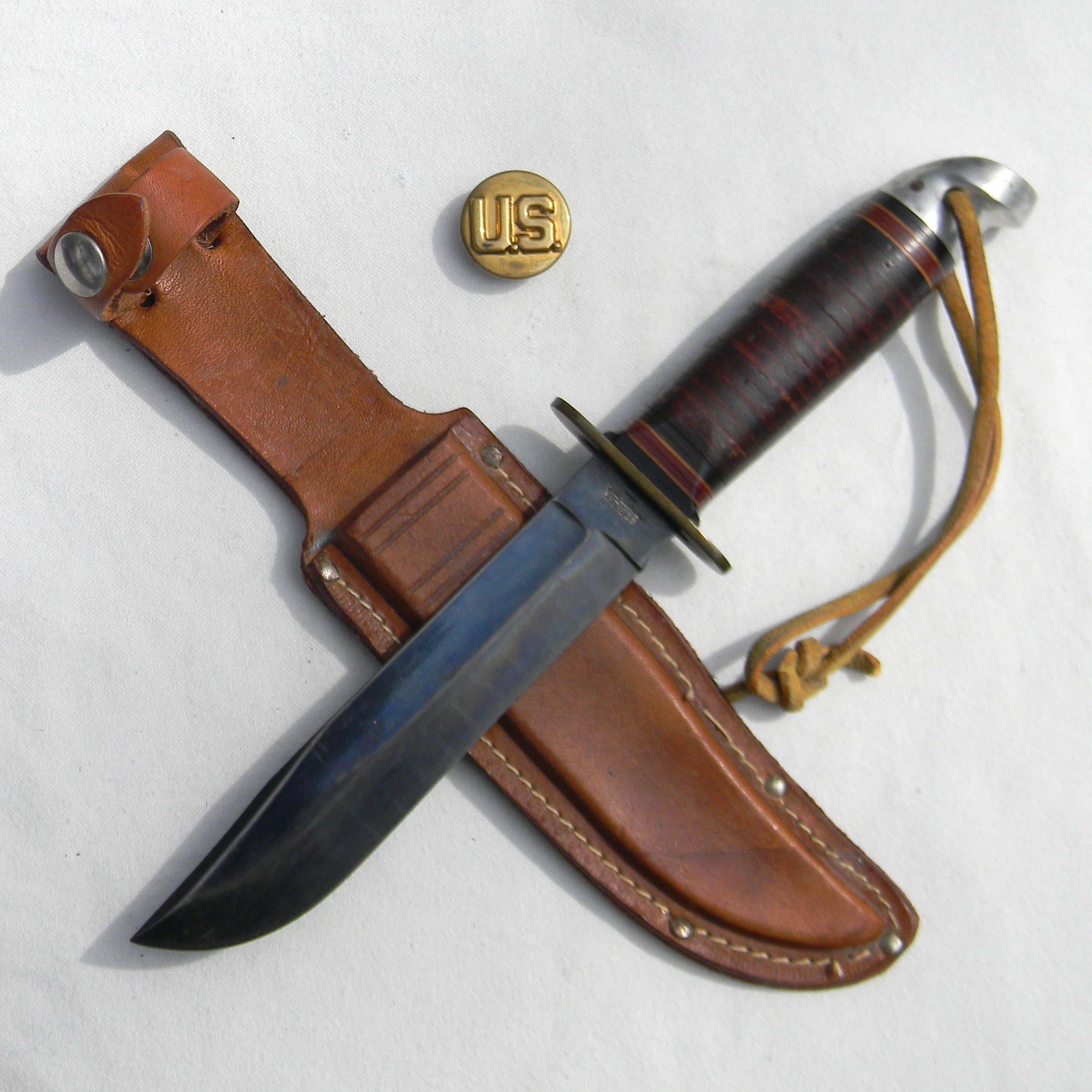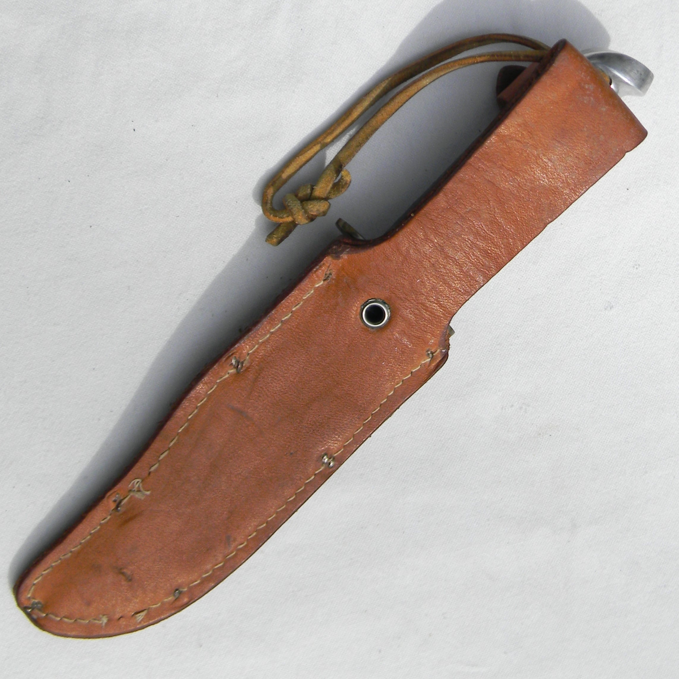 This specimen is in better than average condition for the type: no typical edge nicks or ding marks on the spine or the pommel; blued blade is excellent; the tip is intact. The blade is razor-sharp still; ricasso is stamped L46-6 on one side, WESTERN/ BOULDER / COLO. / USA on the other. Solid bronze guard is unmarked, as it was the case with the early Western models. The handle is stacked leather washers with colored fiber spacers on the ends and a solid aluminum pommel; leather lanyard is still attached. The handle is in excellent shape; all parts are tight with no play. This Vietnam War Western L46-6 fighting knife is about 10-1/4″ / 26 cm overall; blued blade is about 6″ /15.2 cm long. Original leather sheath is in great condition as well. The leather is soft and supple; original keeper is nice and tight.