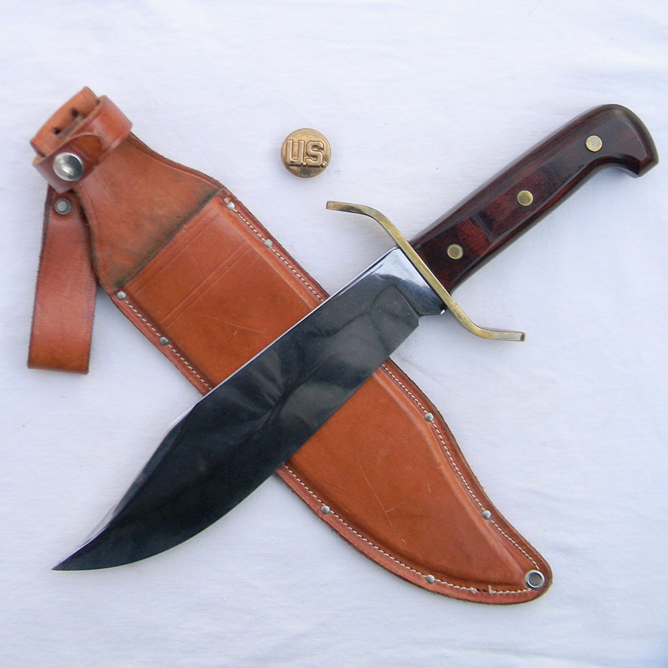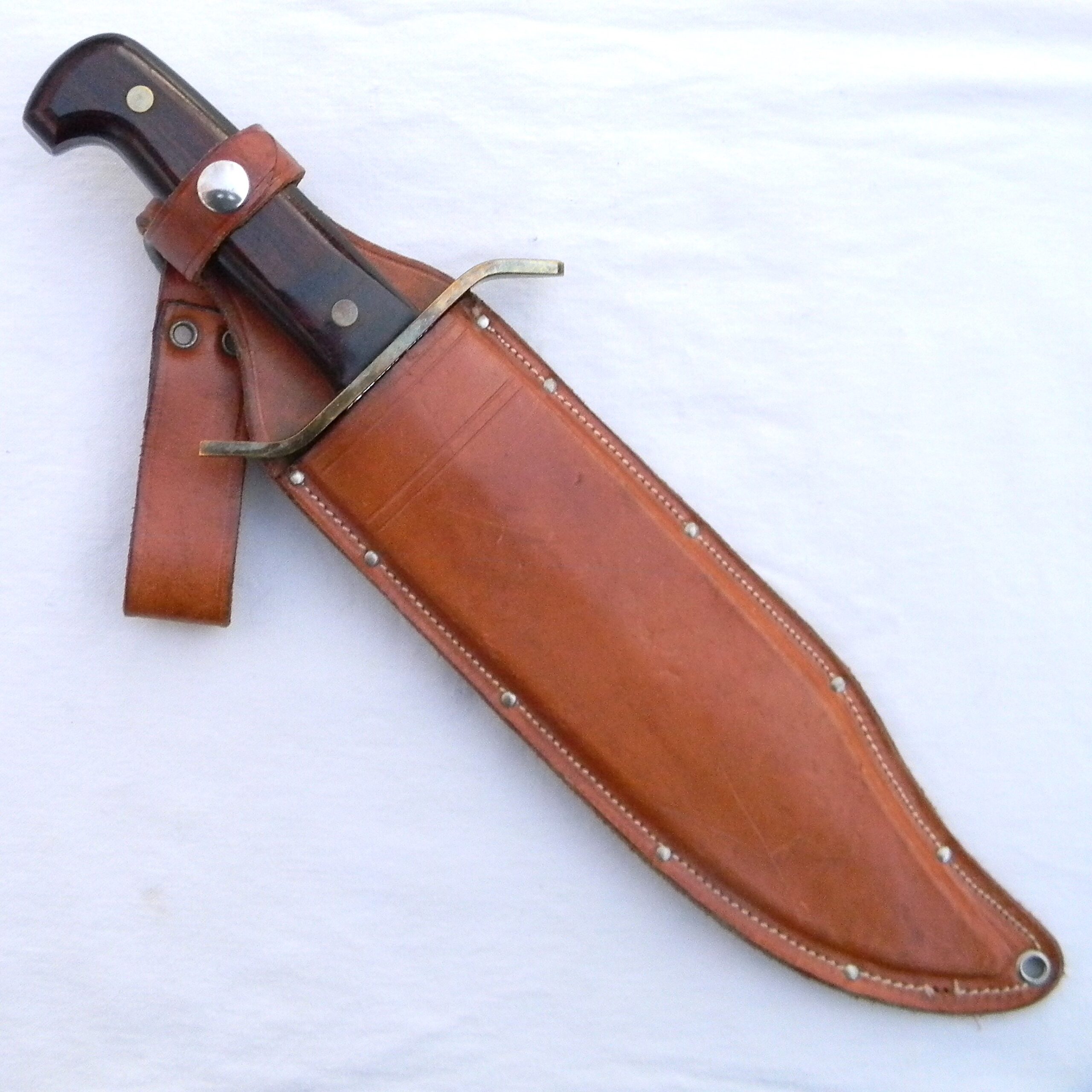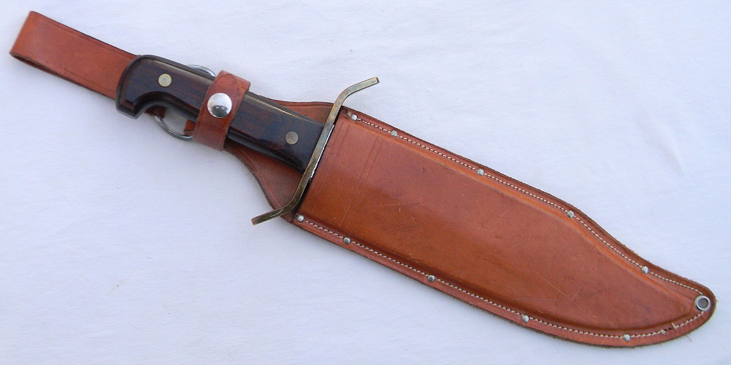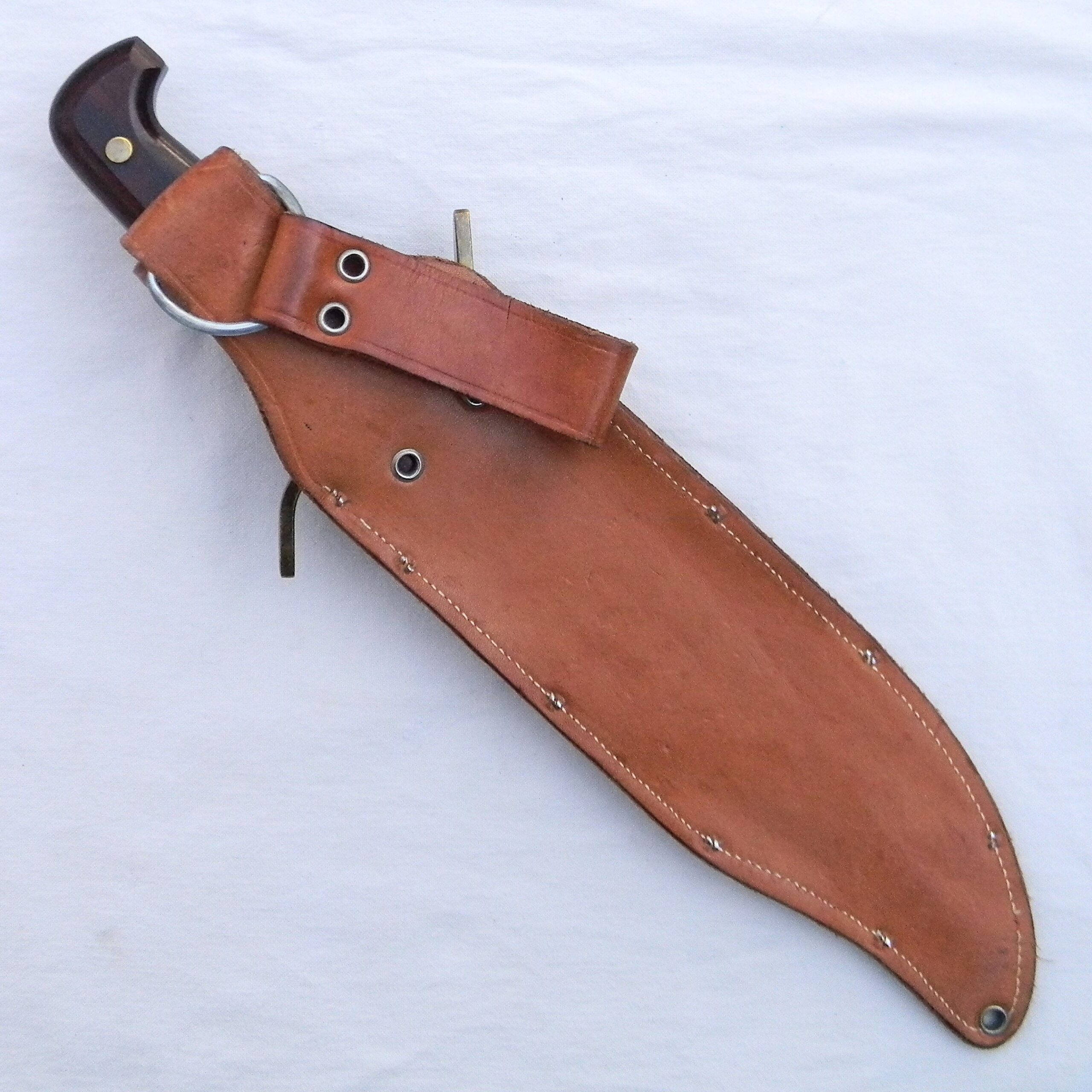 Vietnam War Western W49 Bowie fighting knife, rosewood handle scales, complete original leather scabbard included. Scarce late 1960s manufacture large fighting Bowie in rare UNUSED condition, this type is hard-to-find this nice and complete.