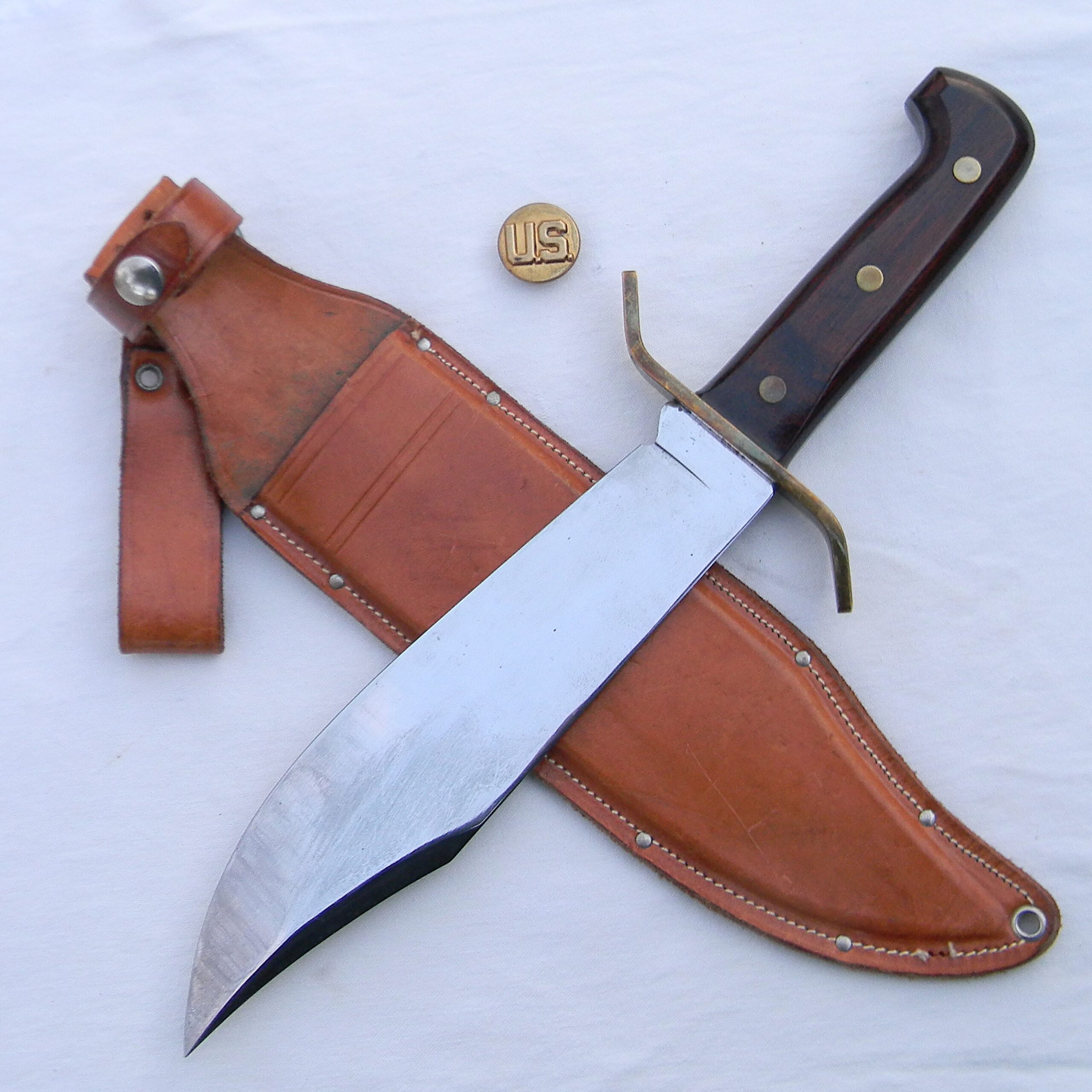 Scarce Western Cutlery model W49 Bowie in rare unused condition. This is an early manufacture type with high-carbon steel blade, laminated rosewood handle scales on “thick” brass pins; original leather sheath in excellent condition is included. This is a nice full-size working Bowie with a large beefy handle that comfortably sits in a hand. Because of its wide and heavy blade which would chop through just about anything and the well-designed heavy duty sheath it came with, Western Bowies had quickly developed a large fan base with the GIs serving in Vietnam. See a scan of 1968 Western Cutlery catalogue advertising the W49 Bowie attached. A lot of these handy Bowies were privately purchased by the troops heading to Vietnam and saw action in the jungles of South-East Asia – see a period photo of a serviceman holding a Western Bowie just like this one (the photo is a curtesy of Wikipedia and is not included with the lot).