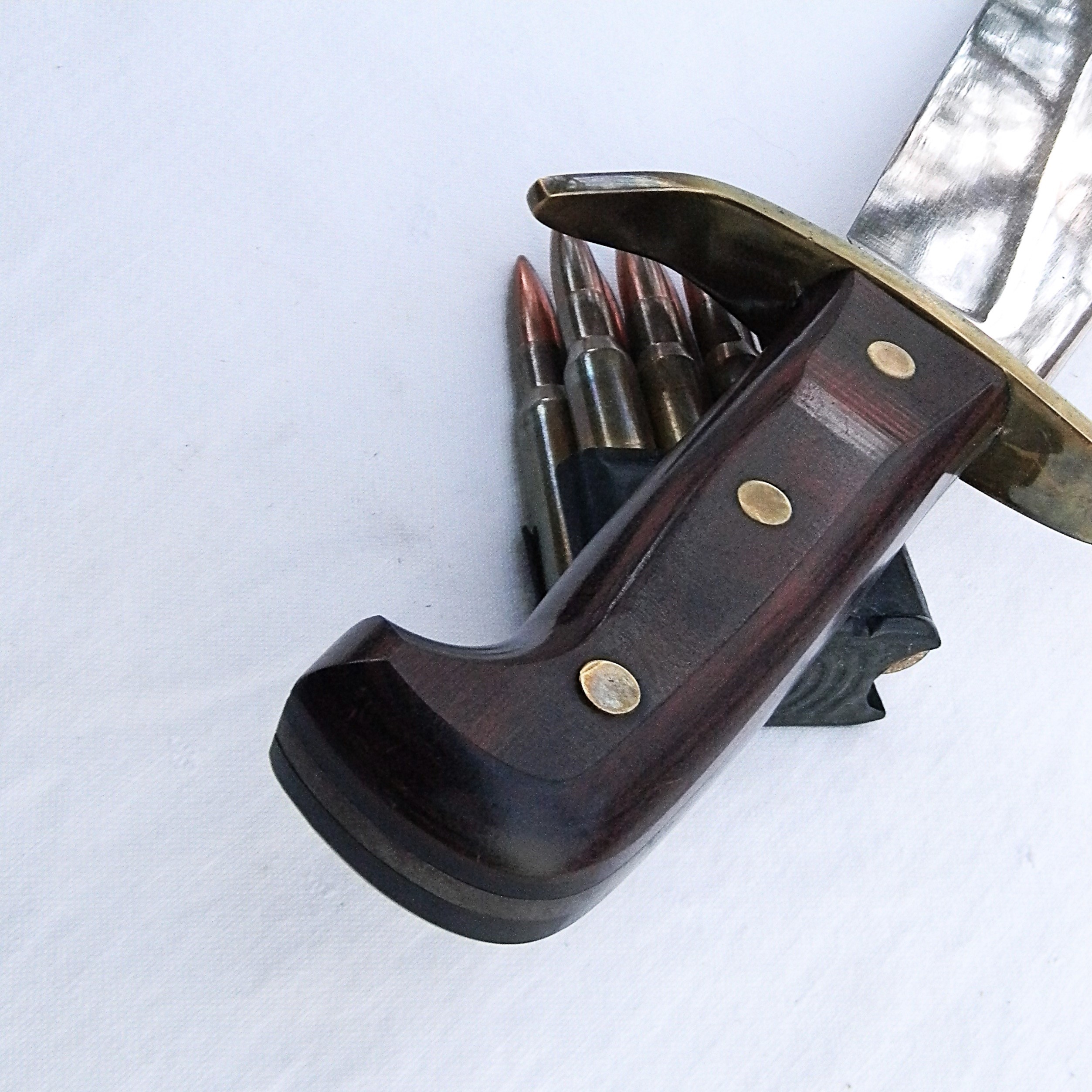 This Vietnam War Western W49 Bowie fighting knife has not been cleaned or tampered with in any way, it is in 100% original “as is” condition. These are the actual photos; Garand clips are nor included with the knife 😉 I have a number of Vietnam War era militaria collectibles and vintage American-made collectible knives in the store, please take a look at the store’s American Blades section. Also, please don’t forget to check out our Militaria section for other WW1 and WW2 era combat knives, including German WW1 era trench knives, vintage USAF WW2 Pilot Knives and a couple of nice WW2 era British fighting daggers available for sale.