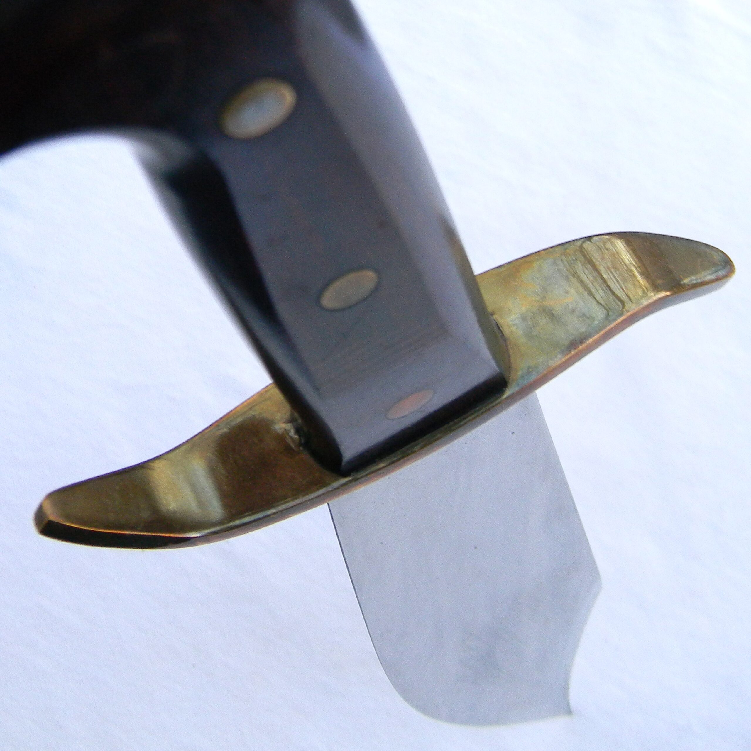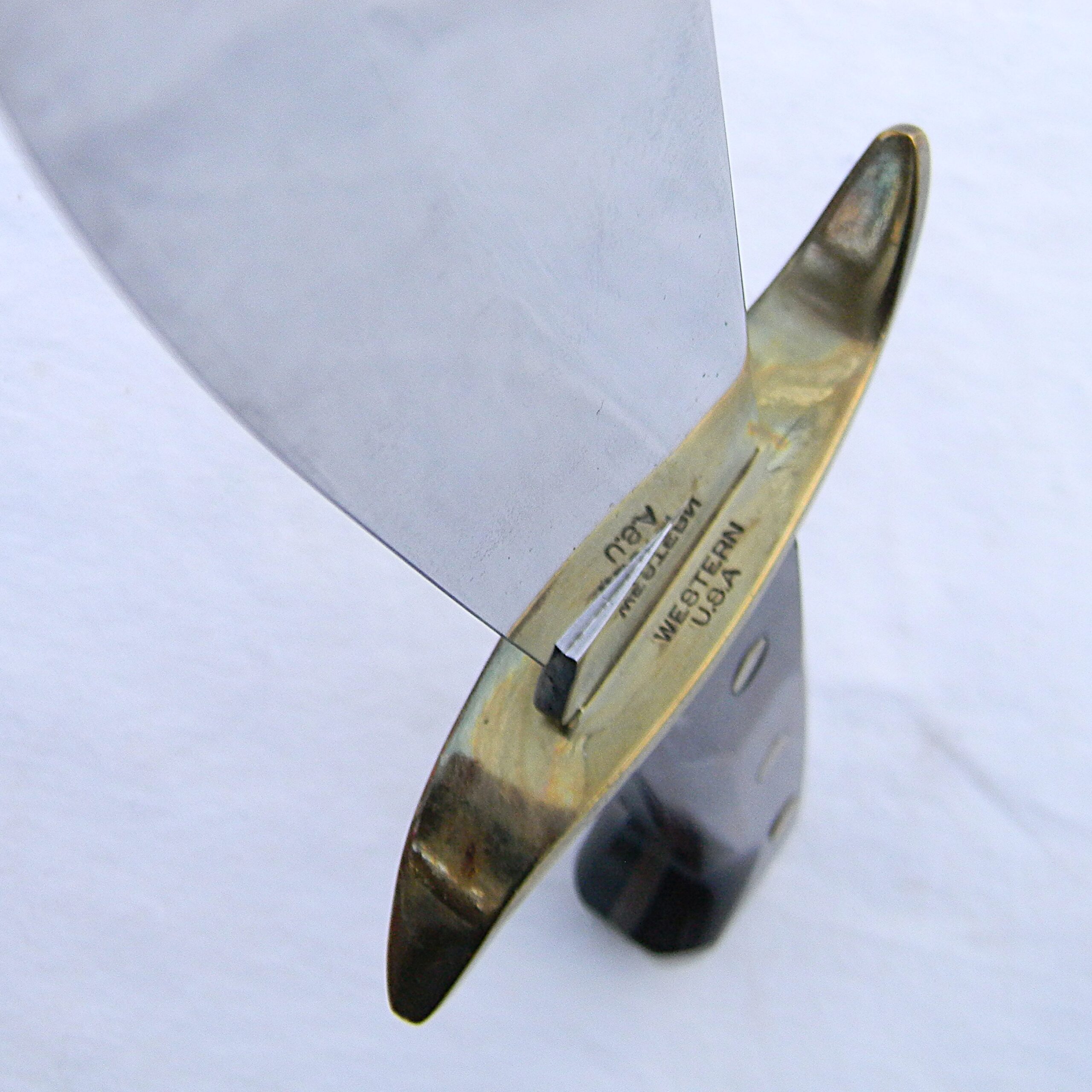 The knife is about 14-3/4″ / 37.4 cm overall; the blade is about 9-1/2″ / 24.2 cm; it’s about 2-1/8″ / 5.3 cm wide at the widest point. The blade has not been re-sharpened; original factory edge is razor-sharp; the tip is intact. Thick solid brass S-guard is stamped W49 on one side, WESTERN / U.S.A. on the other. The guard is solid with no play; all handle parts are tight with no play. This big boy weights 1 pound 8.1 oz (about 0.68 kg) with the sheath. Original-issue brown leather sheath is in excellent overall condition, considering the age, just a couple of minor scuff marks here and there. All original rivets, keeper, and swivel belt loop are intact; minor stitching loss near the tip is noted for accuracy. These vintage 1960s Western Bowies are getting harder and harder to find; this attractive Vietnam War Western W49 bowie specimen would make an excellent addition to any collection.