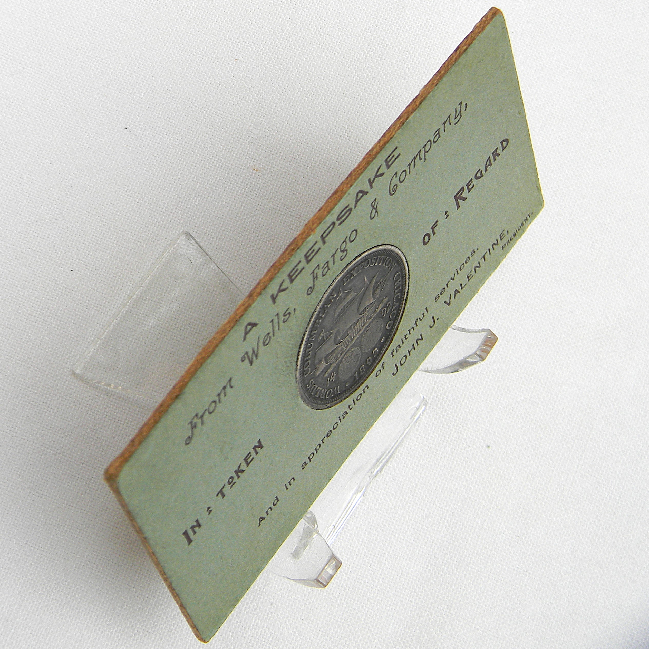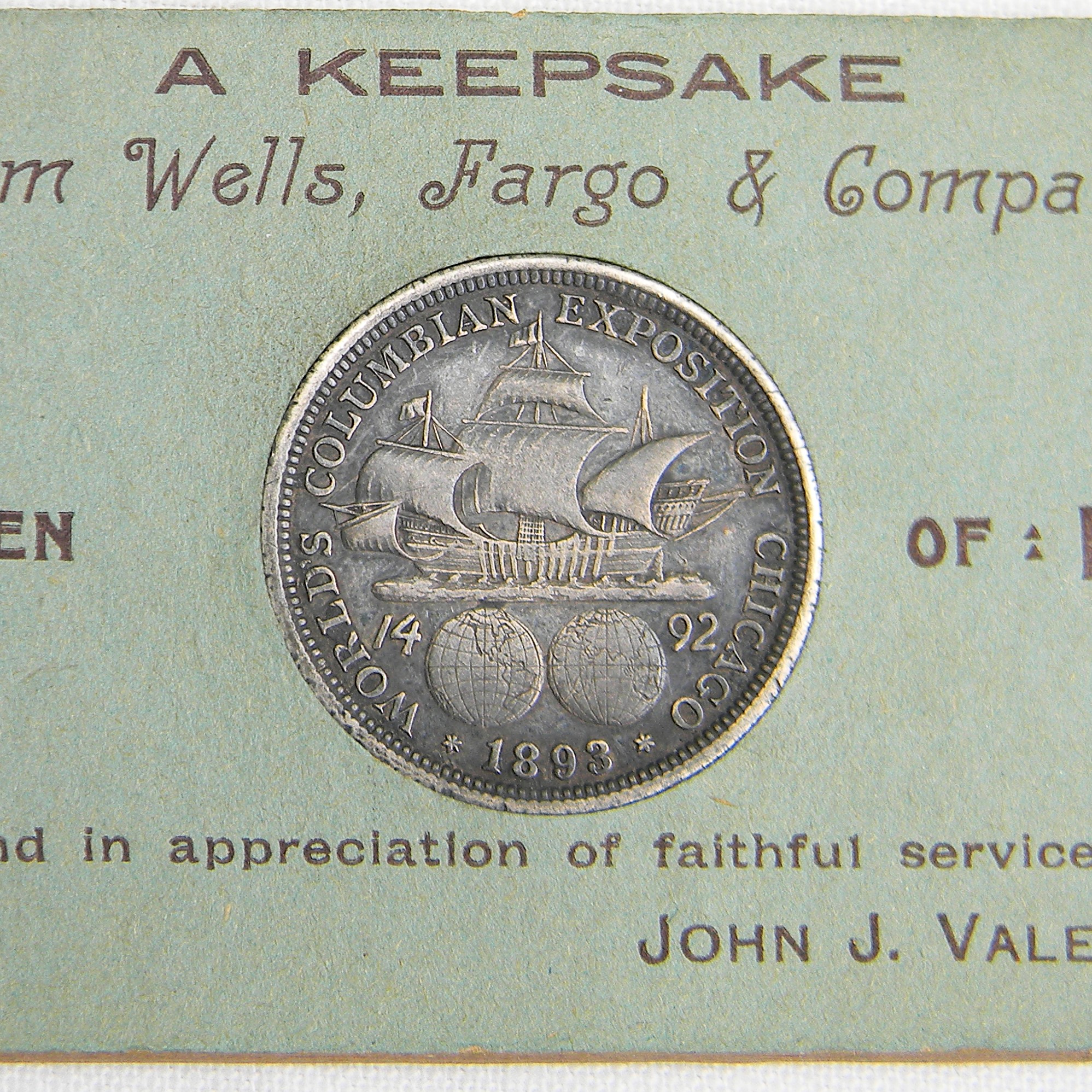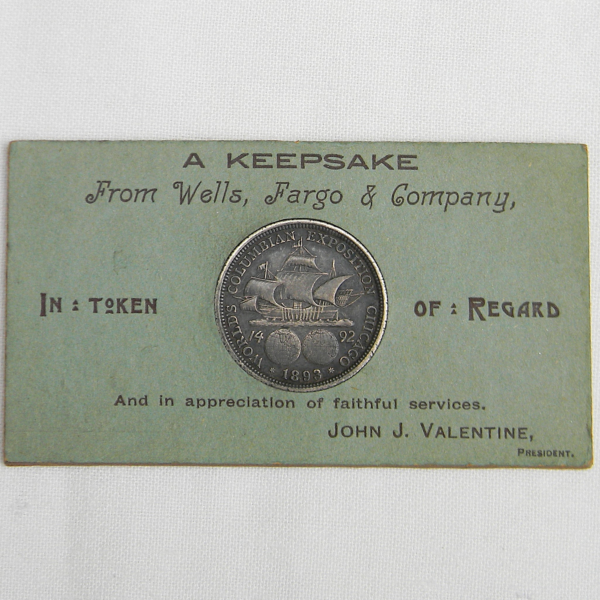 In 1893 Wells Fargo Co. presented to employees a “A Keepsake” described as an 1892 “Columbian Souvenir Coin” along with its display card and a copy of the letter from President John J. Valentine regarding the coin. In his January 2, 1893 letter, Valentine announced that the company had purchased a quantity of the Columbian Half Dollars and would be presenting each employee with a “Souvenir Coin” as an “aid in perpetuating a pleasant recollection of the great commemorative event of the present year, to wit, the World’s Columbian Exposition at Chicago, Illinois, and to secure at the same time a little remembrance of our friendly interest in you individually, in appreciation of your faithful services.”