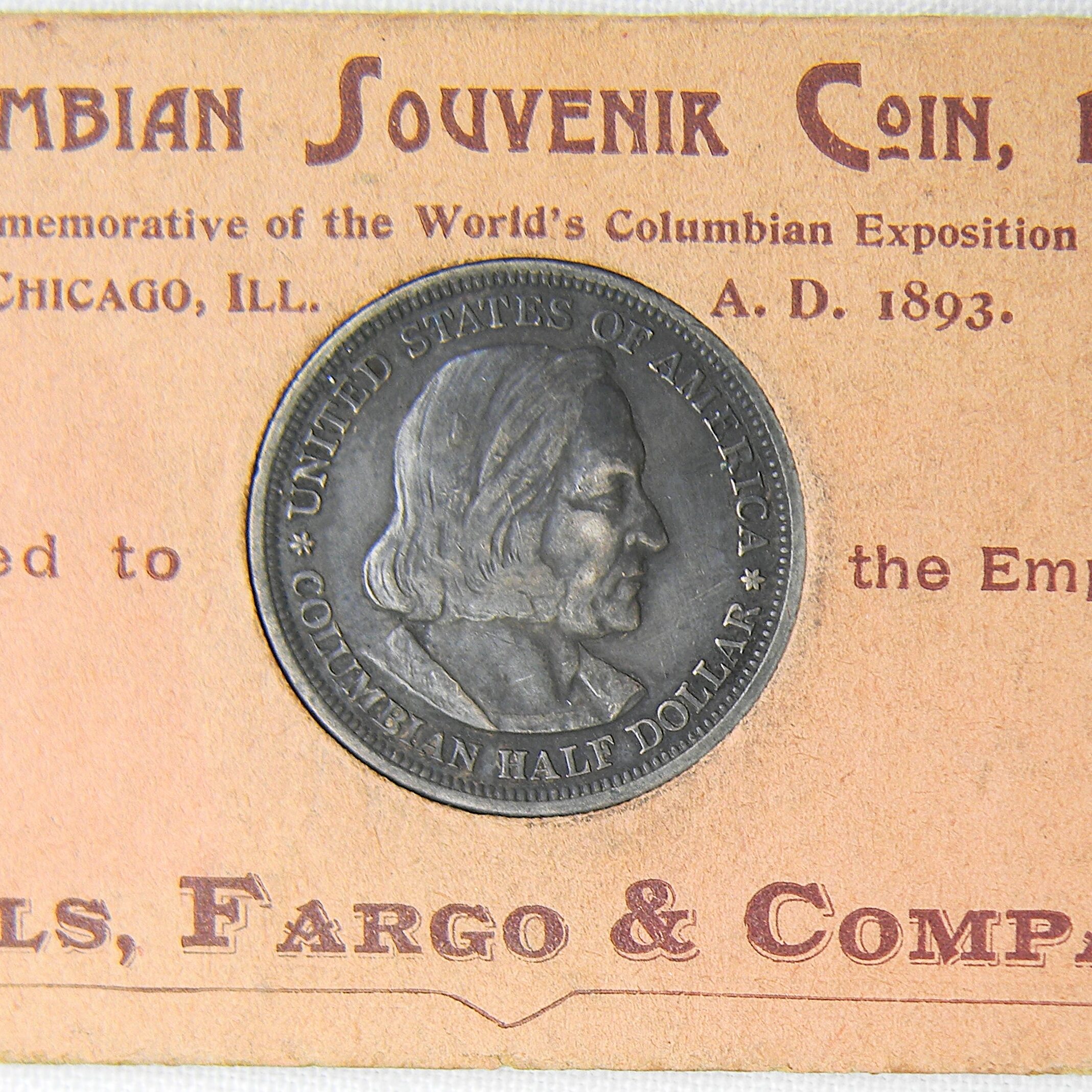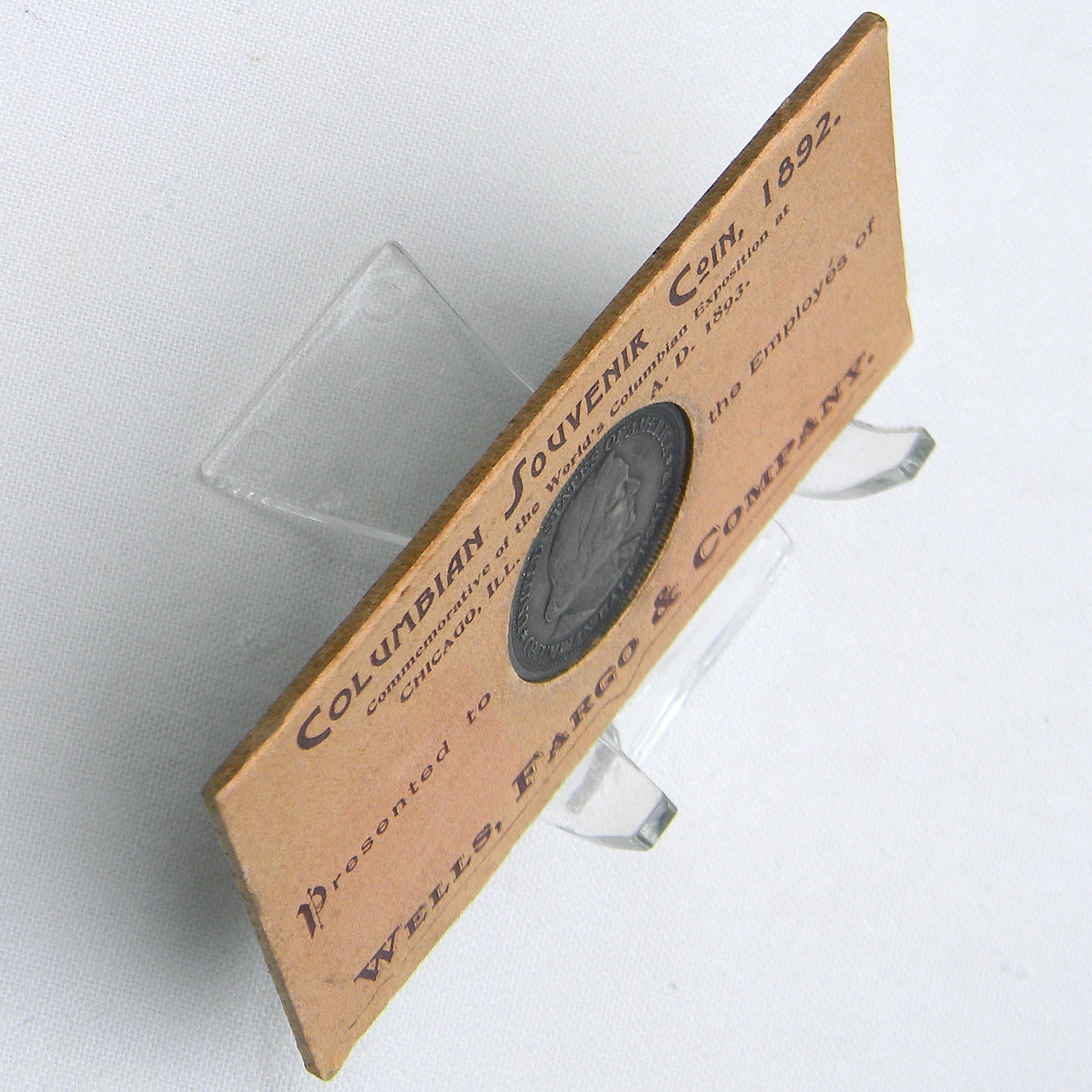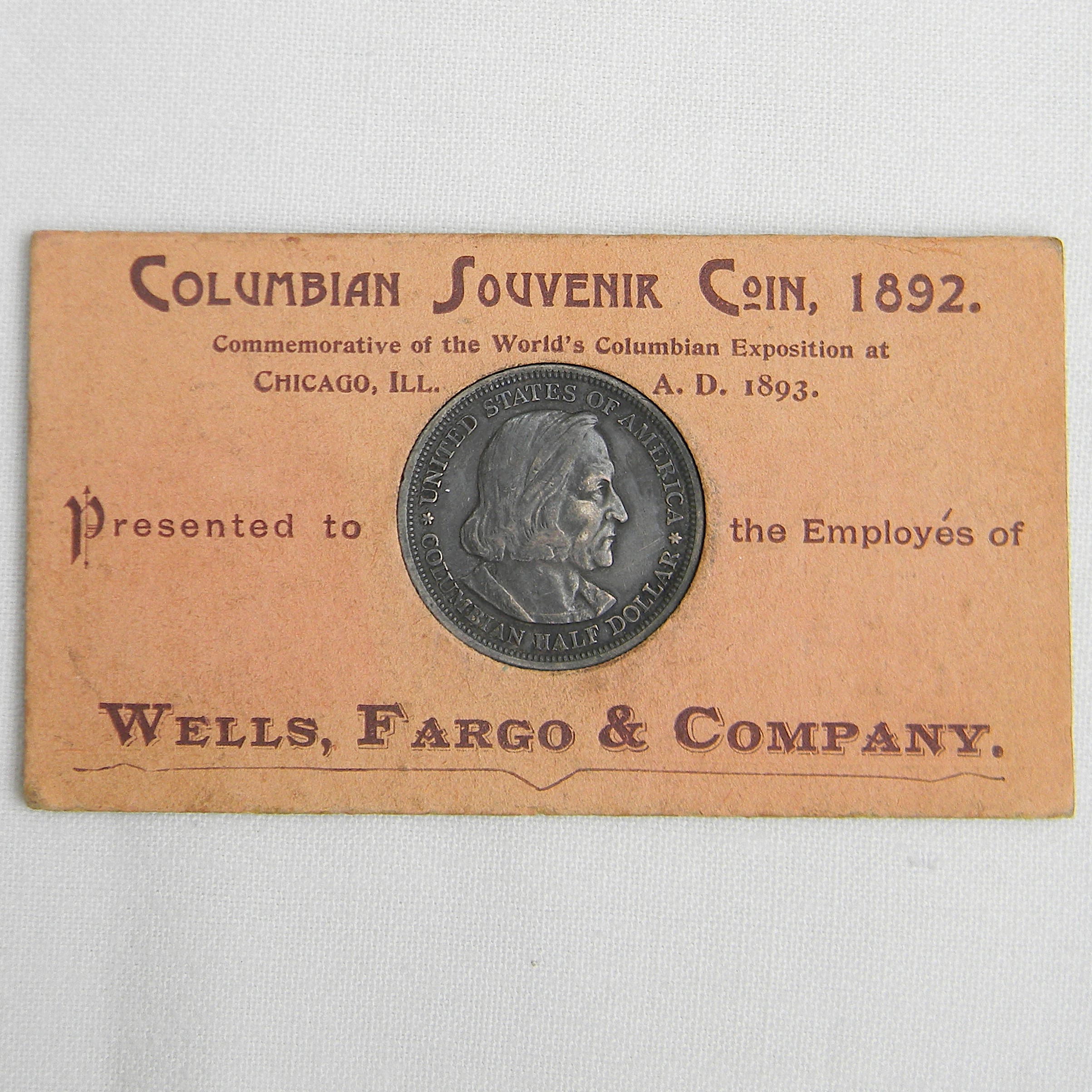 In 1893 Wells Fargo Co. presented to employees a “A Keepsake” described as an 1892 “Columbian Souvenir Coin” along with its display card and a copy of the letter from President John J. Valentine regarding the coin. In his January 2, 1893 letter, Valentine announced that the company had purchased a quantity of the Columbian Half Dollars and would be presenting each employee with a “Souvenir Coin” as an “aid in perpetuating a pleasant recollection of the great commemorative event of the present year, to wit, the World’s Columbian Exposition at Chicago, Illinois, and to secure at the same time a little remembrance of our friendly interest in you individually, in appreciation of your faithful services.”
