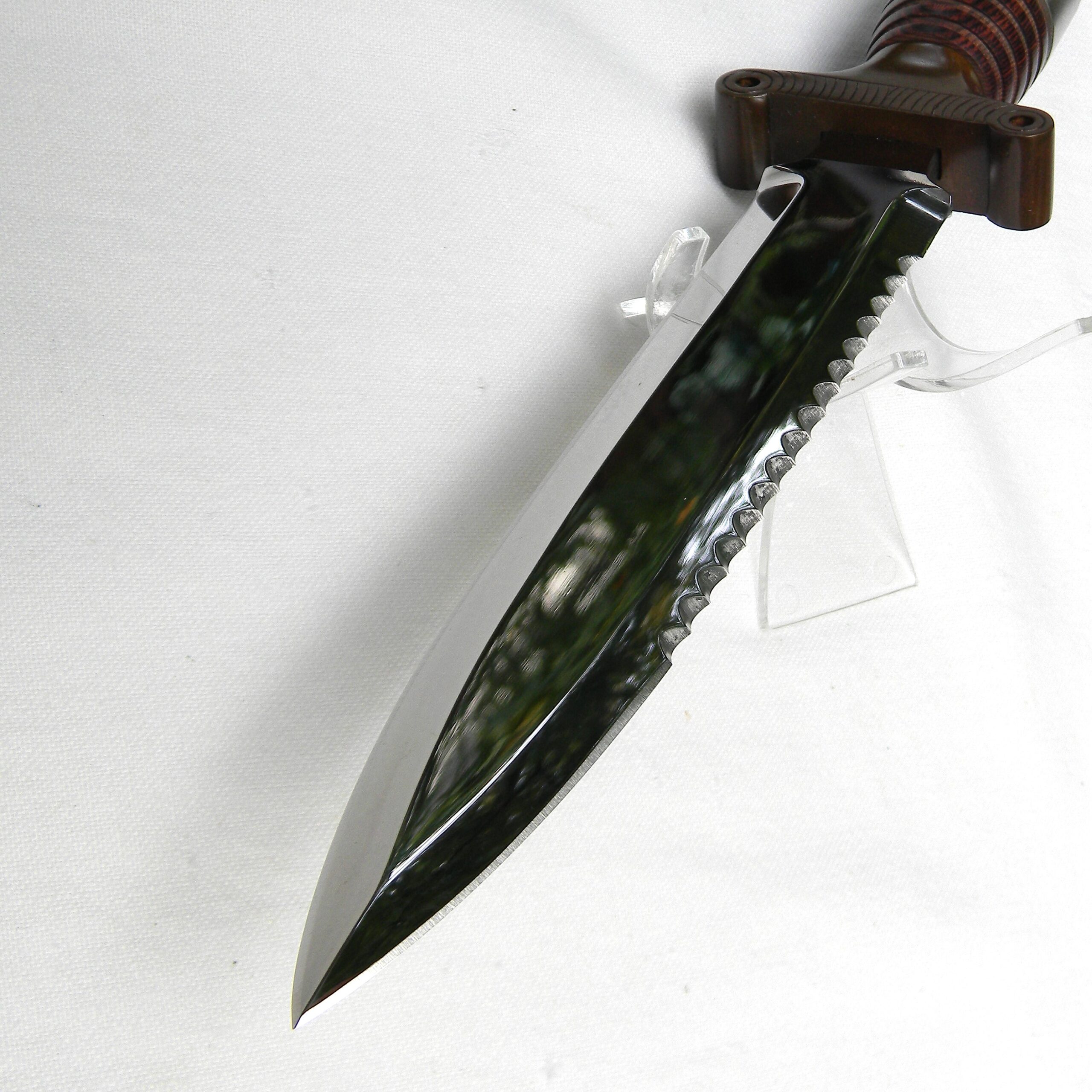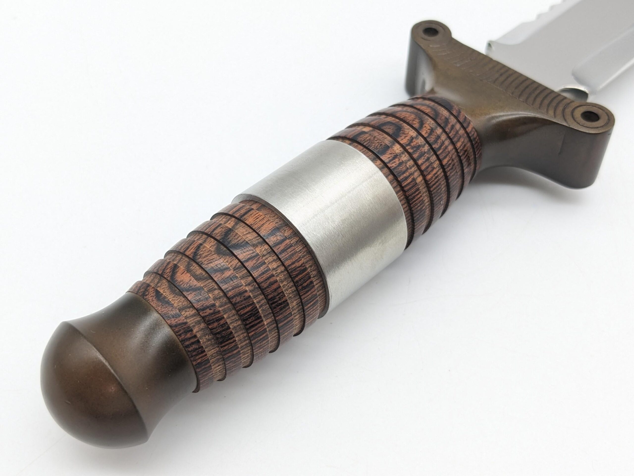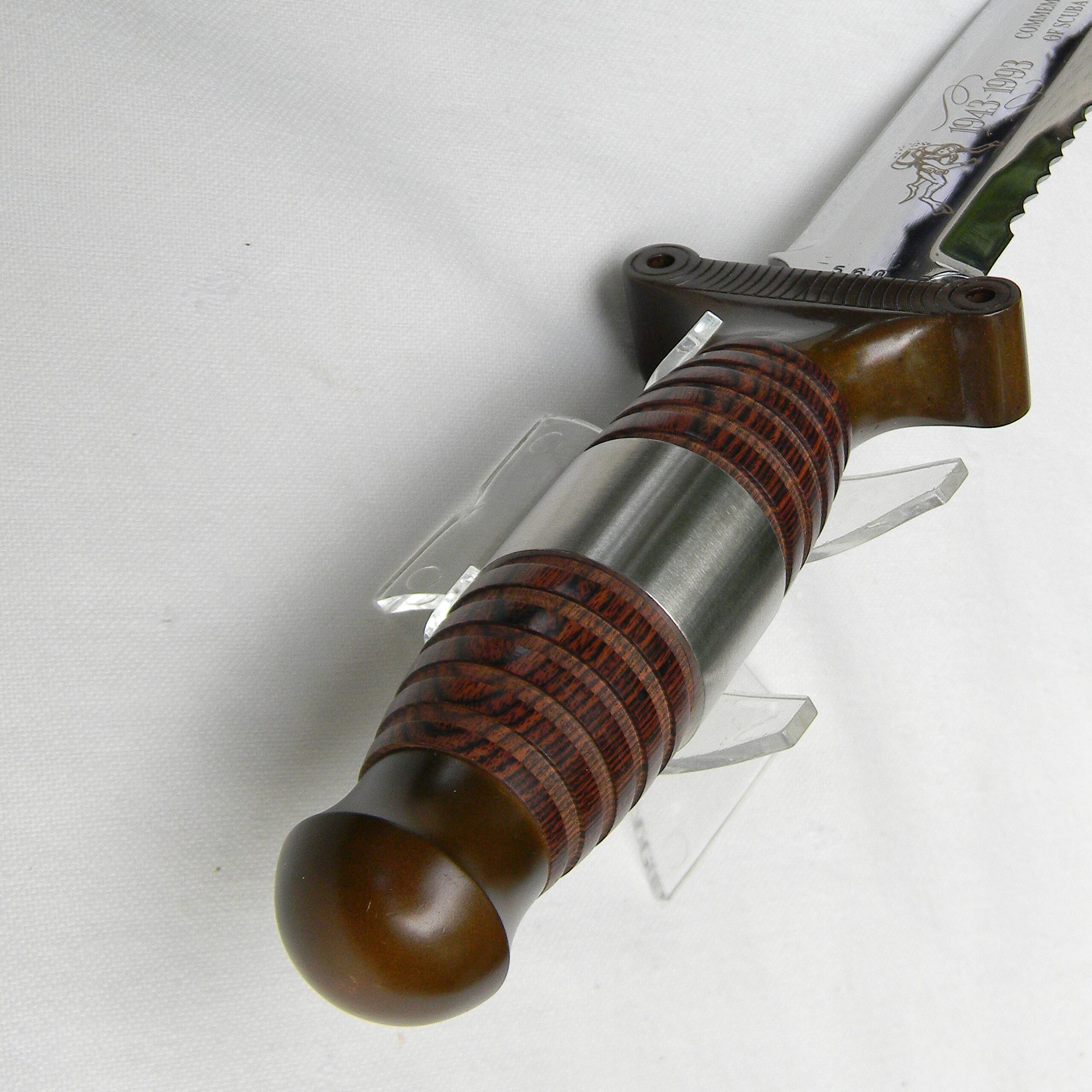This big boy is about 12-1/4″ / 31 cm overall, the mirror-polish blade is about 7-1/4″ / 18.4 cm. The blade is excellent; the original factory edges are razor-sharp; the tip is intact. One side is finely etched in gold; serial number 560 is sharply struck on riocasso. Lathe-turned laminated hardwood handle with cast bronze fittings and stainless ring in the middle. The handle is excellent with no chips or contact marks; all parts are tight with no play. The knife is in unused “as made” condition; it comes in the original cardboard blade protector and original retail cardboard box. These limited edition “50 years of Scuba Diving” commemorative knives were sold without a scabbard.
