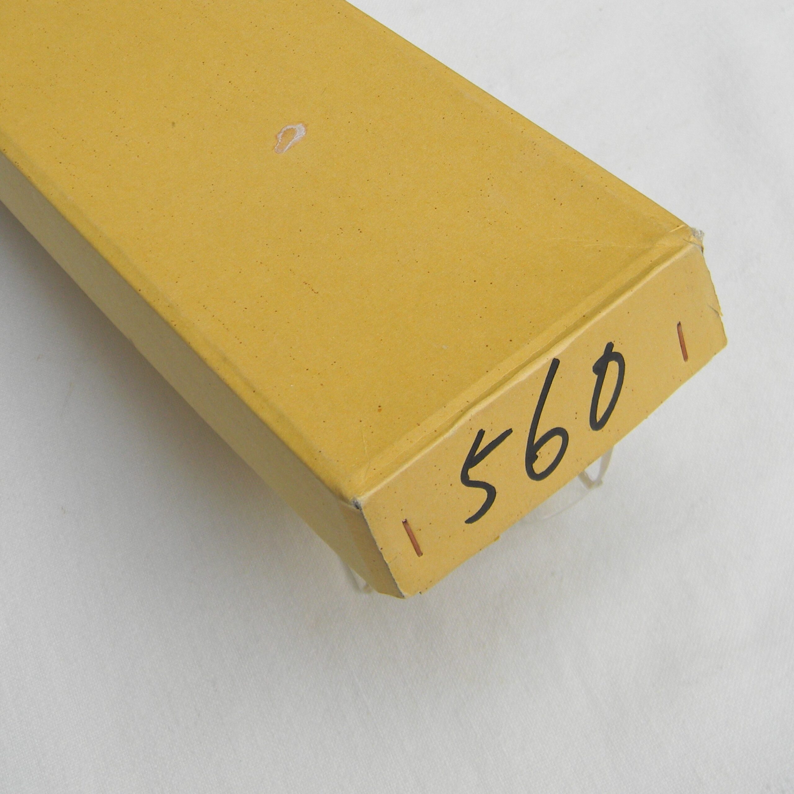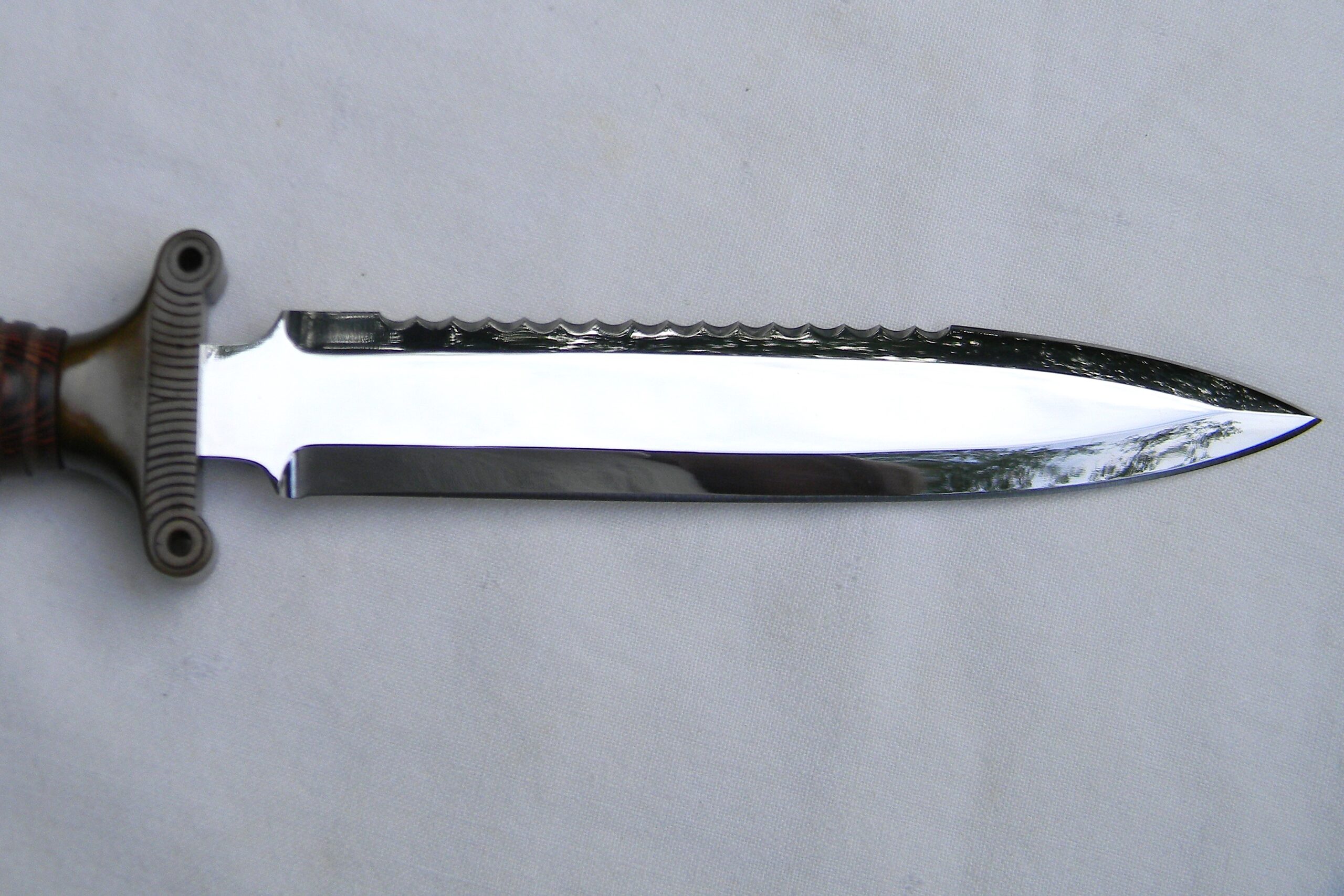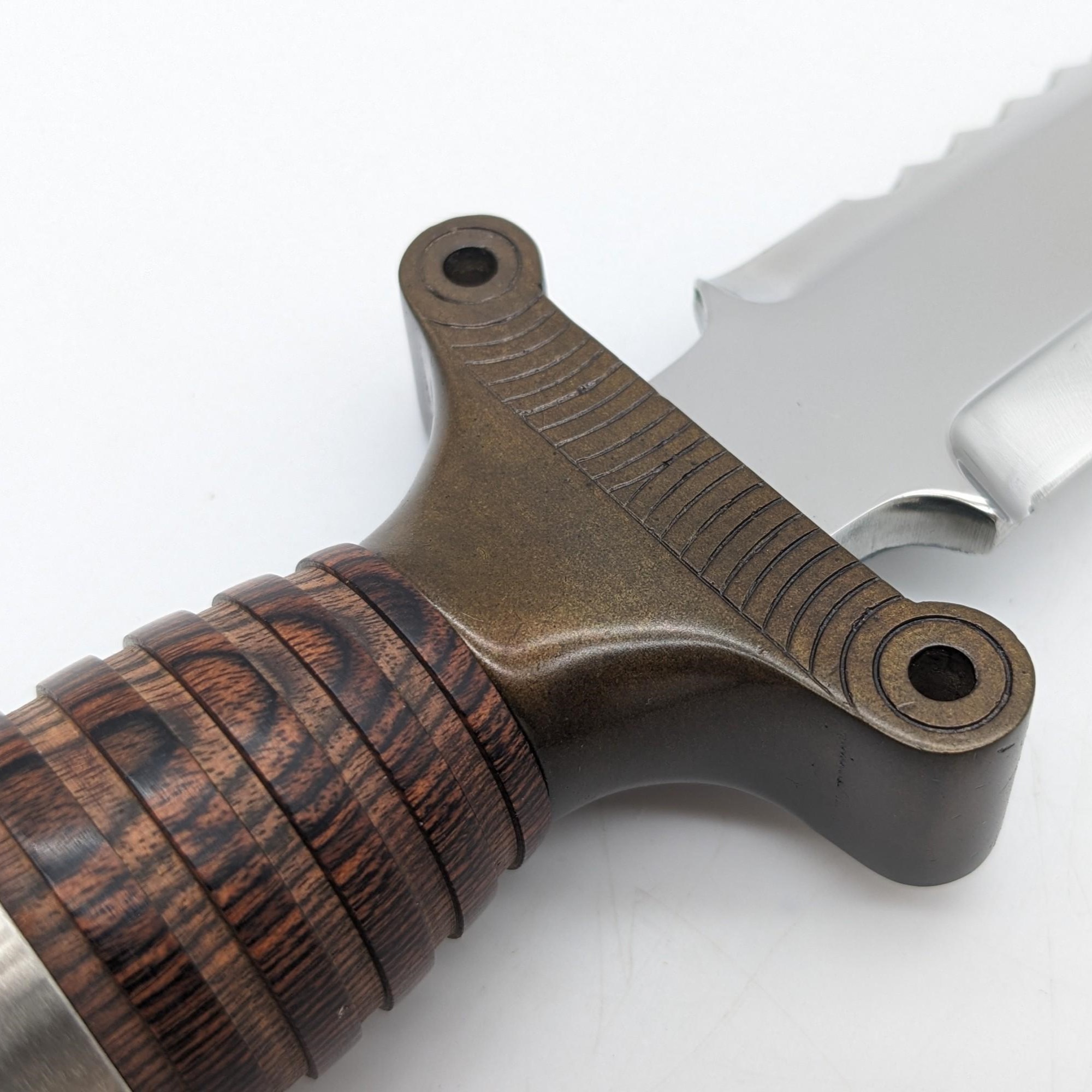 This big boy is about 12-1/4″ / 31 cm overall, the mirror-polish blade is about 7-1/4″ / 18.4 cm. The blade is excellent; the original factory edges are razor-sharp; the tip is intact. One side is finely etched in gold; serial number 560 is sharply struck on riocasso. Lathe-turned laminated hardwood handle with cast bronze fittings and stainless ring in the middle. The handle is excellent with no chips or contact marks; all parts are tight with no play. The knife is in unused “as made” condition; it comes in the original cardboard blade protector and original retail cardboard box. These limited edition “50 years of Scuba Diving” commemorative knives were sold without a scabbard.