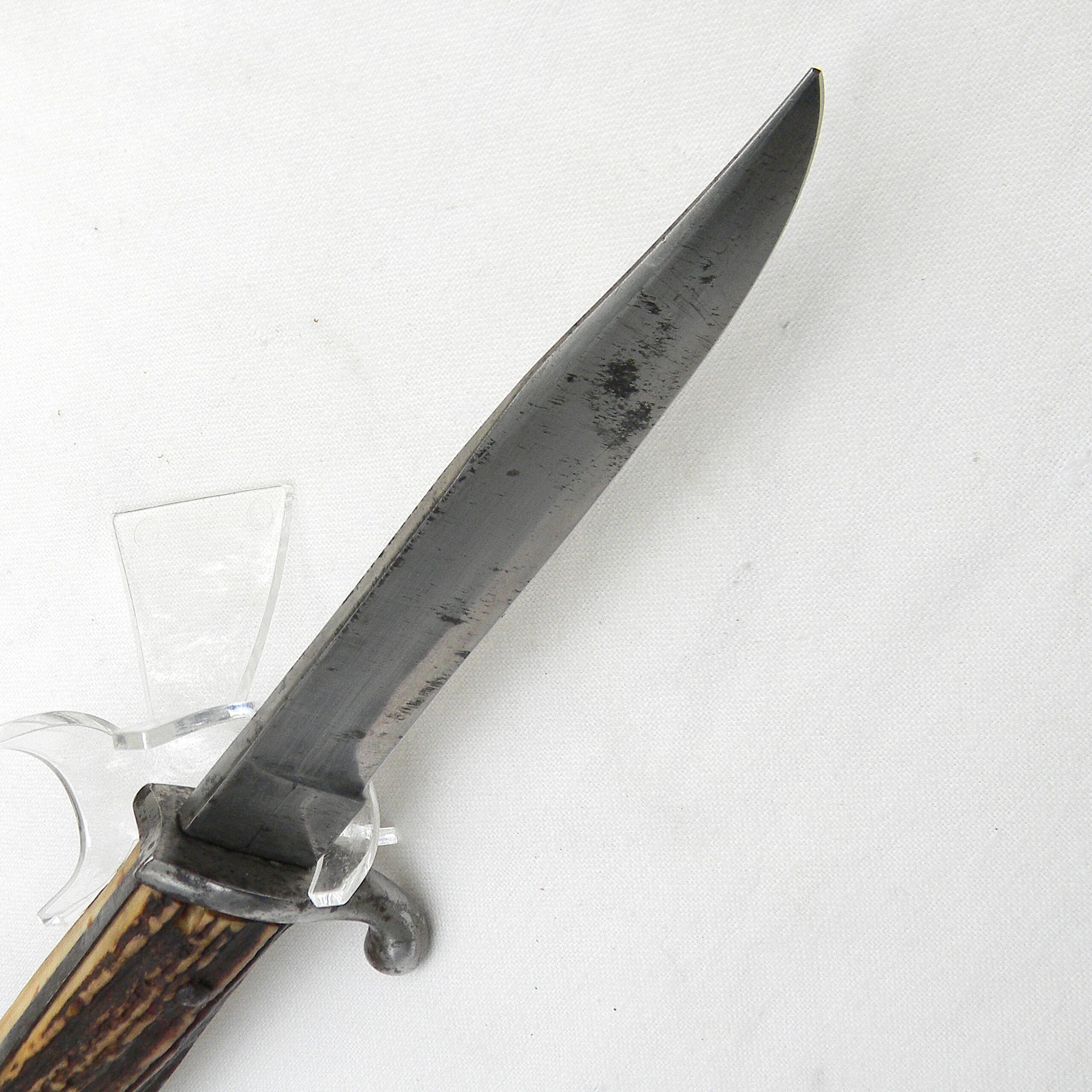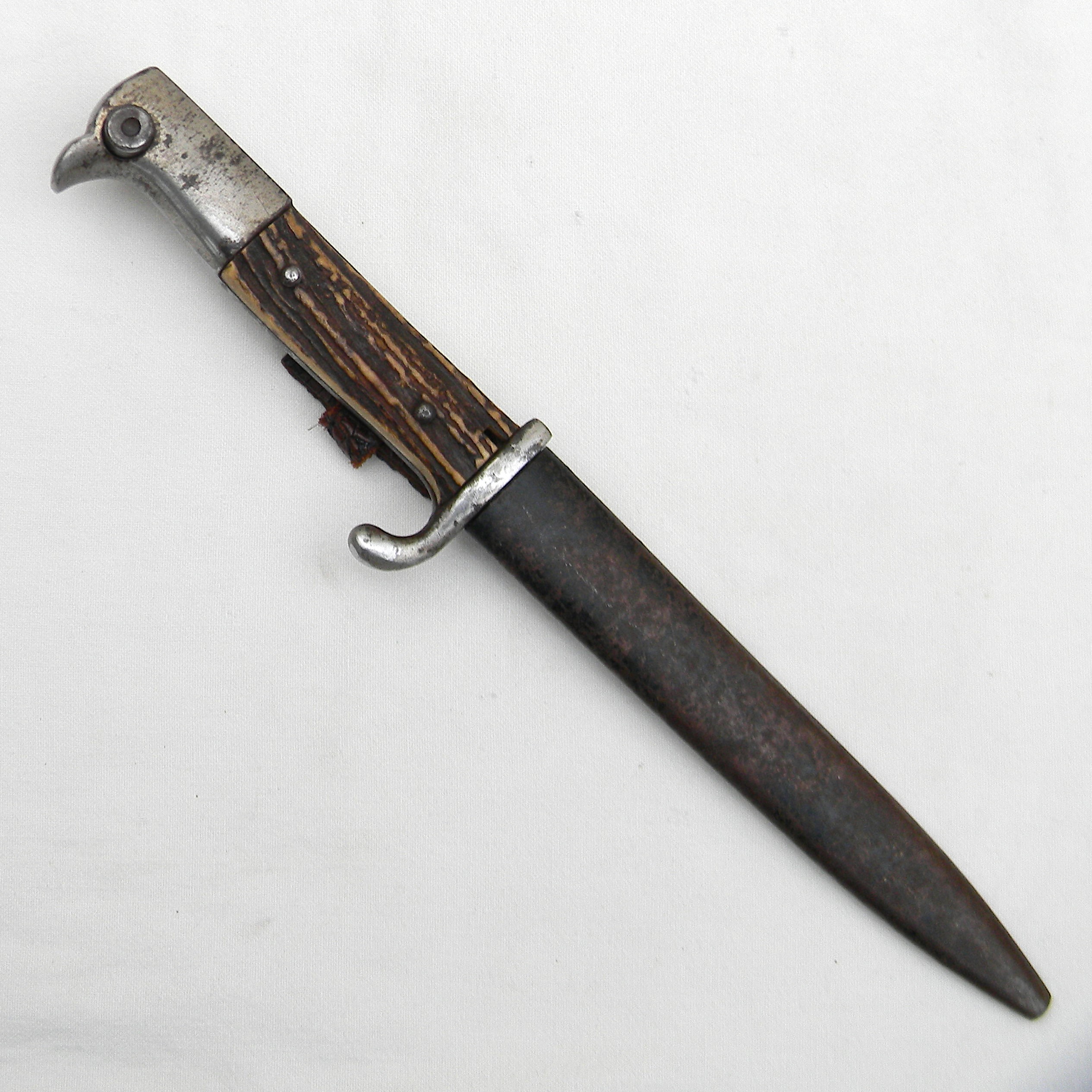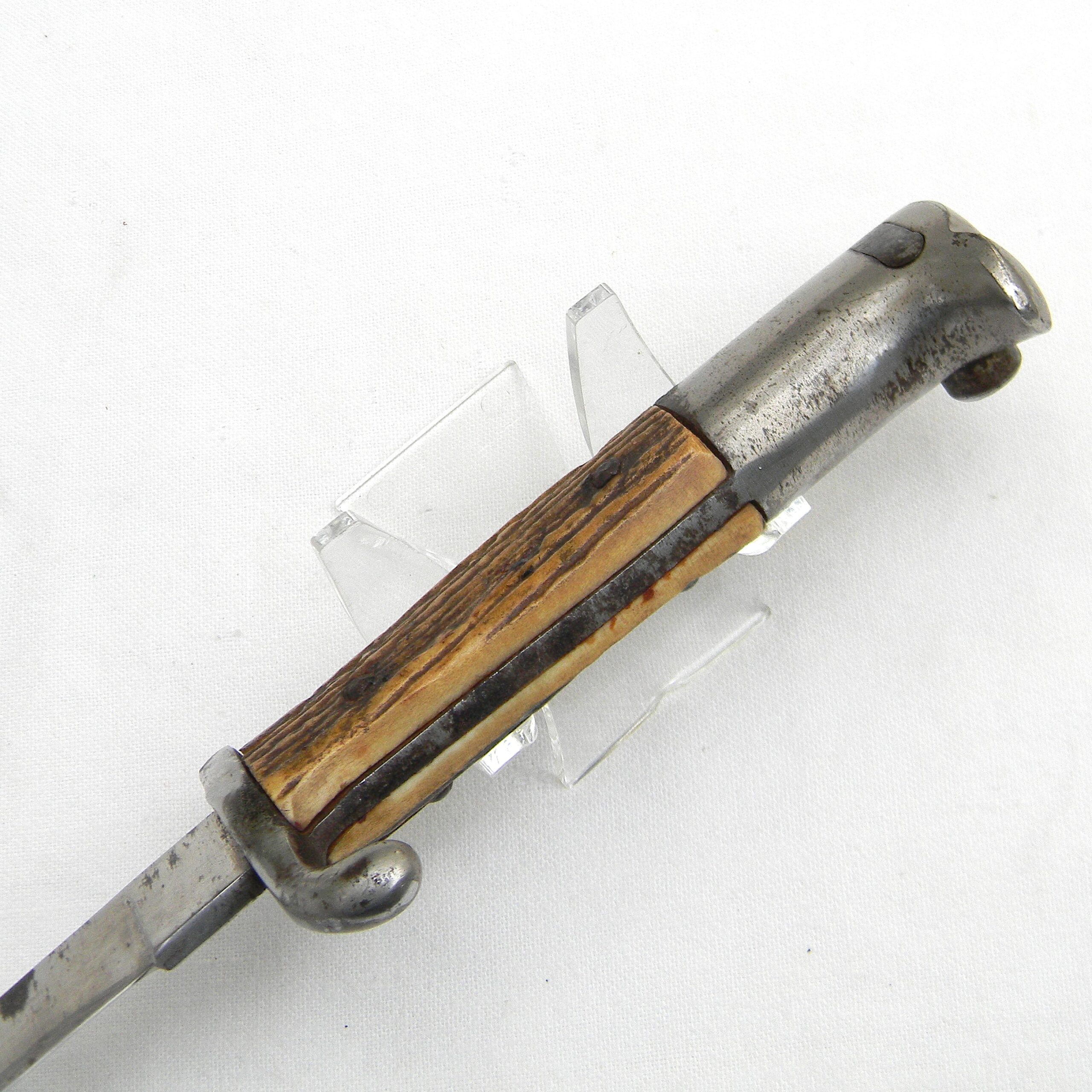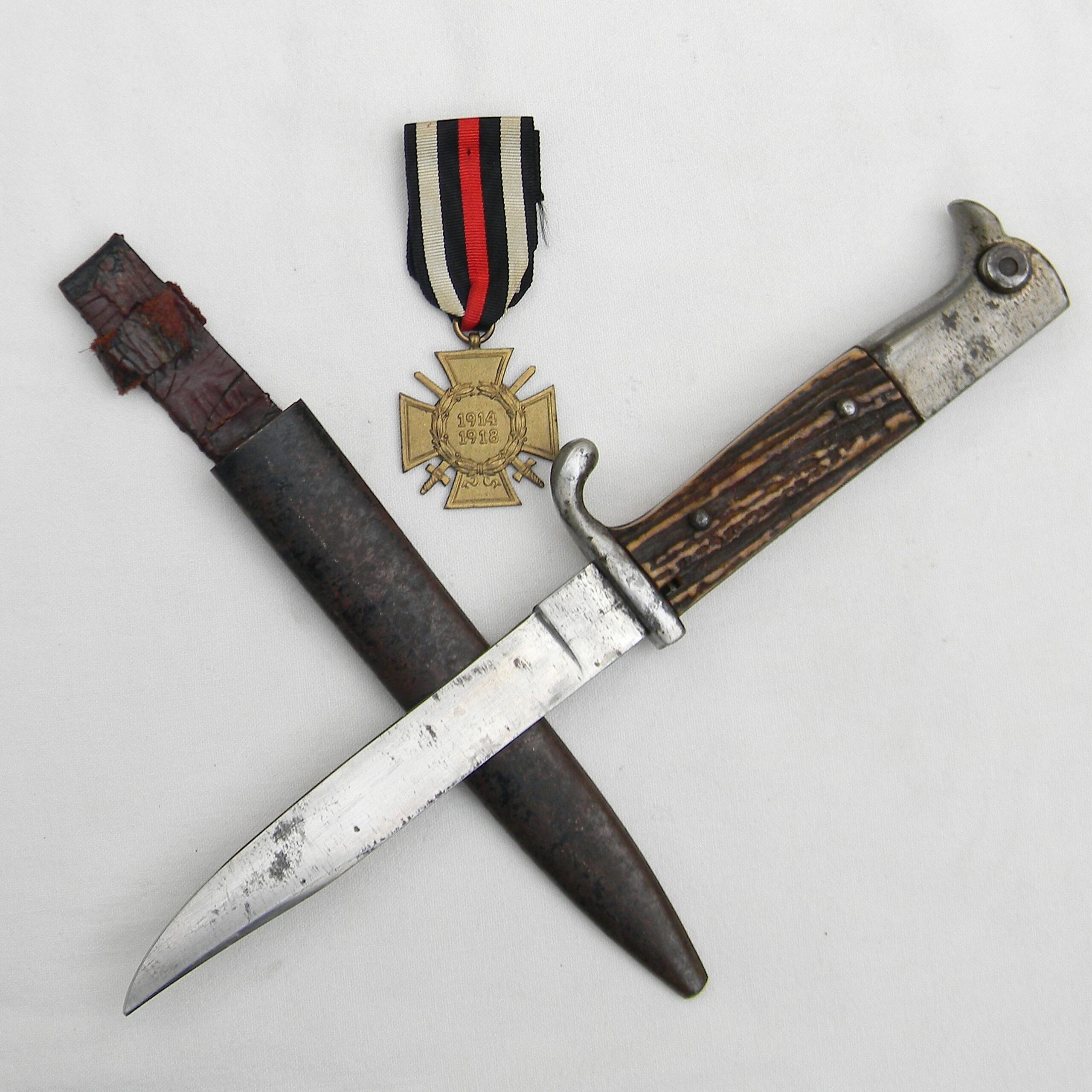 Original late WW1 era German Army fixable close combat knife(Aufpflanzbares Kampfmesser) manufactured circa 1917-1918. This is a sturdy bayonet/trench knife combination sidearm with scarce genuine stag handle scales option, original metal scabbard is included. This exact type is illustrated on pages 149-151 of the excellent French reference book by Christian Mary Knives and Daggers-Bayonets Used by the German Army During 1914-1945 (see the book’s page scan in the photos).