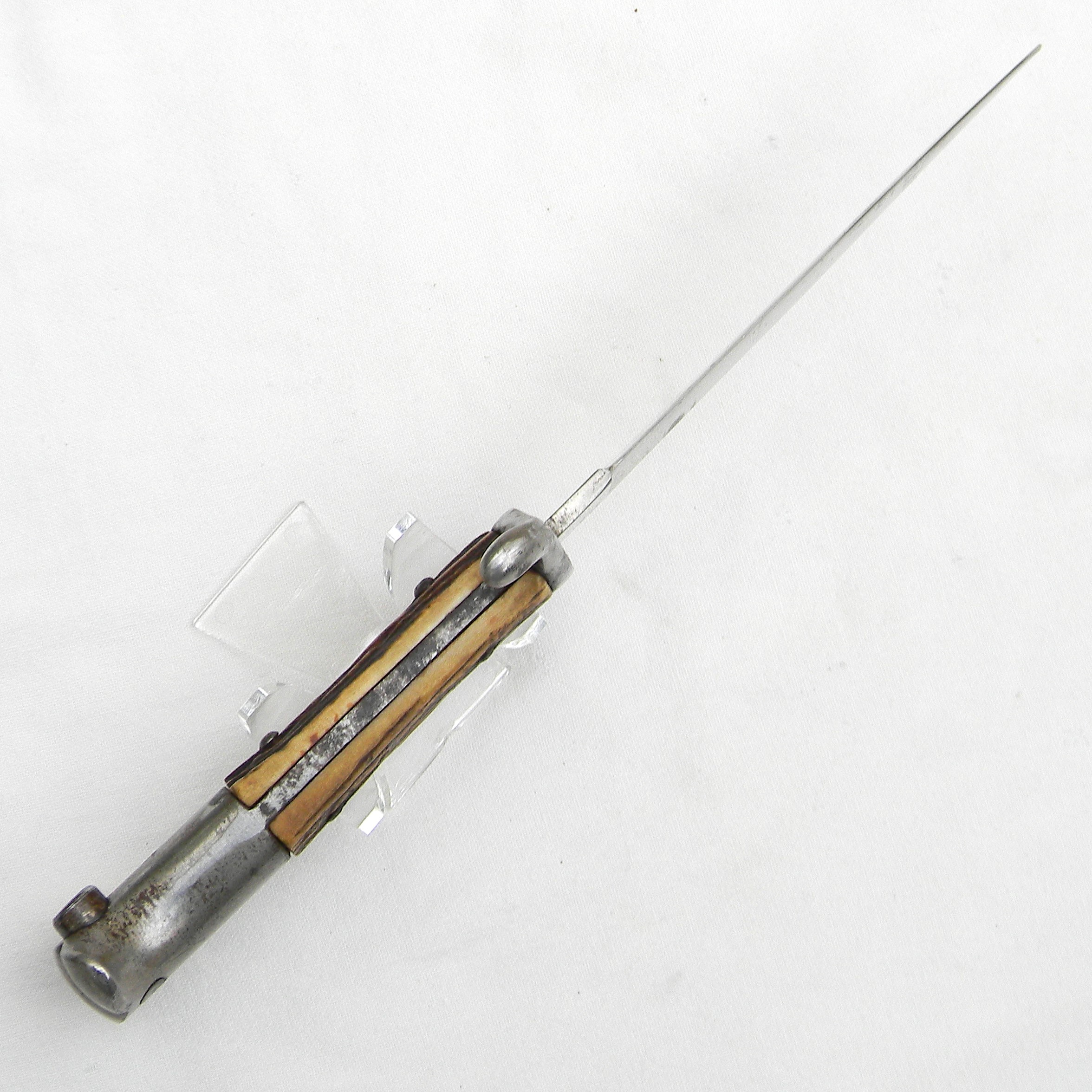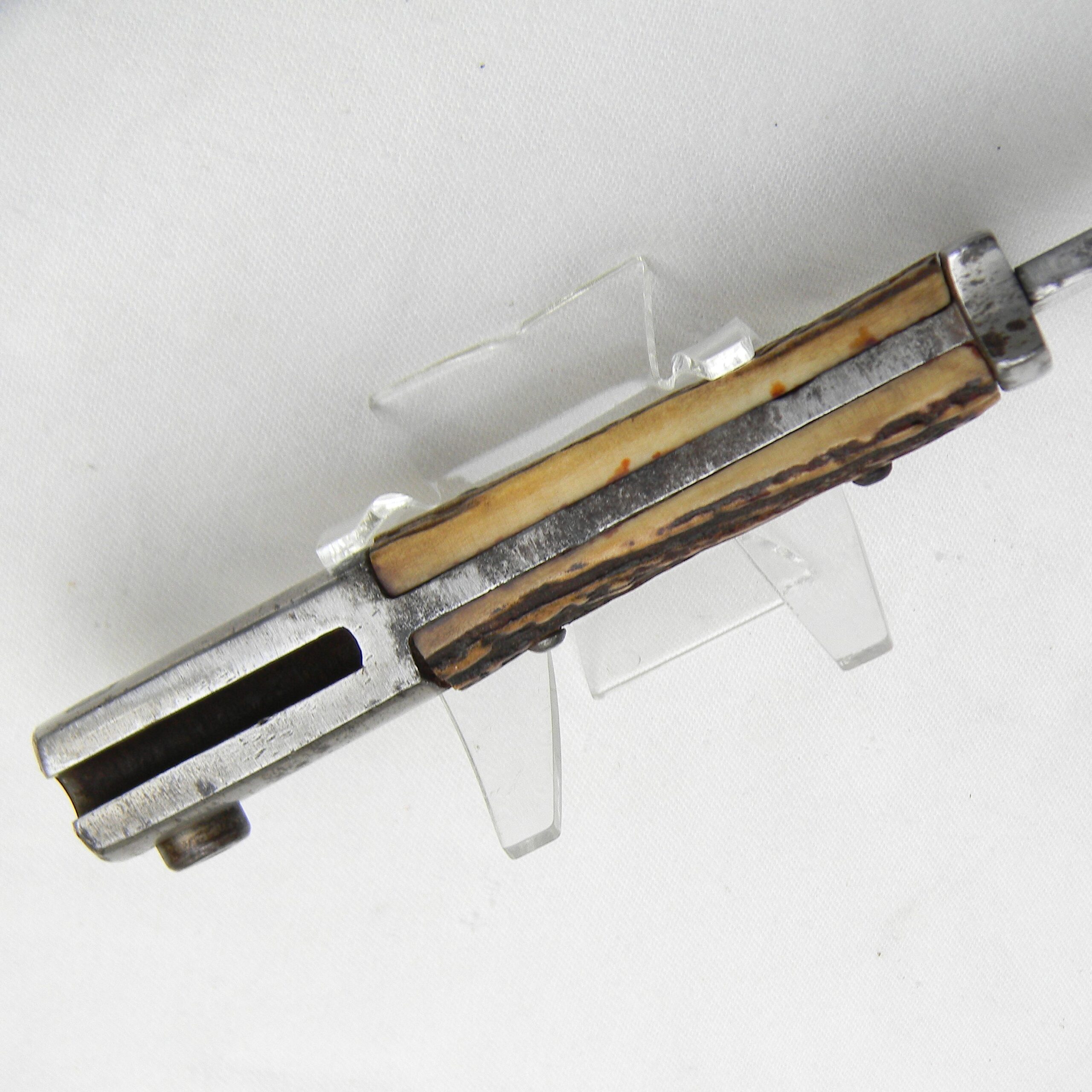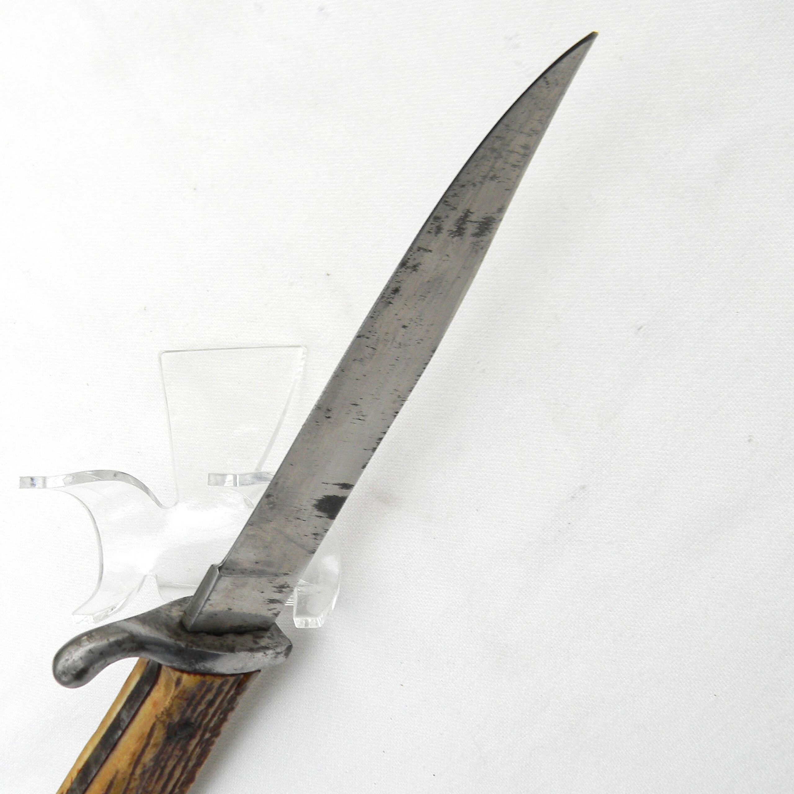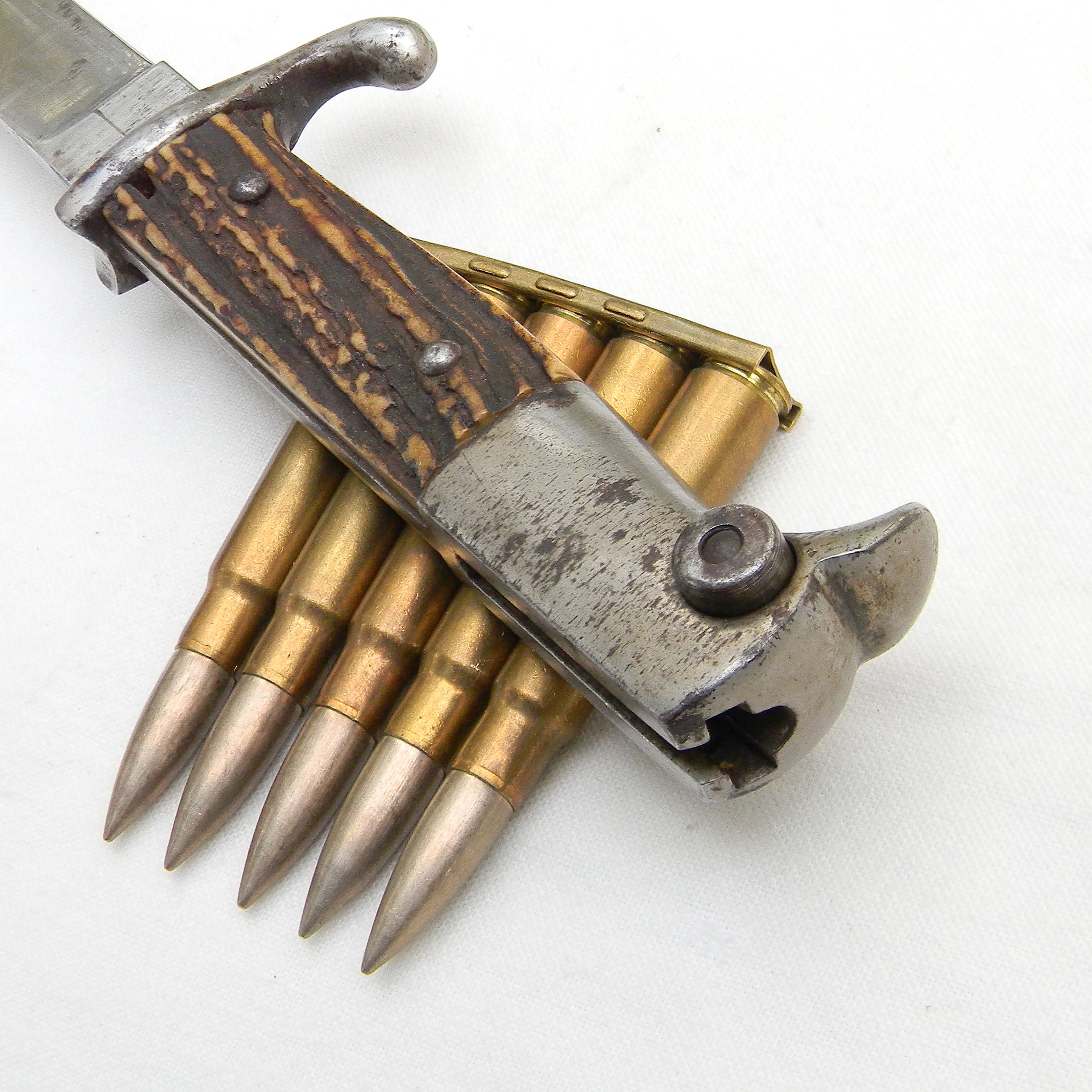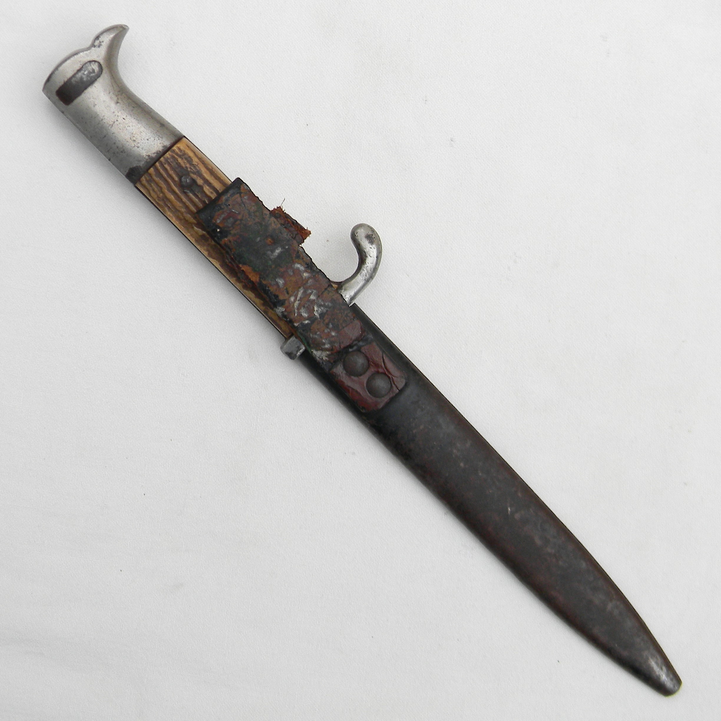 Original late WW1 era German Army fixable close combat knife(Aufpflanzbares Kampfmesser) manufactured circa 1917-1918. This is a sturdy bayonet/trench knife combination sidearm with scarce genuine stag handle scales option, original metal scabbard is included. This exact type is illustrated on pages 149-151 of the excellent French reference book by Christian Mary Knives and Daggers-Bayonets Used by the German Army During 1914-1945 (see the book’s page scan in the photos).
