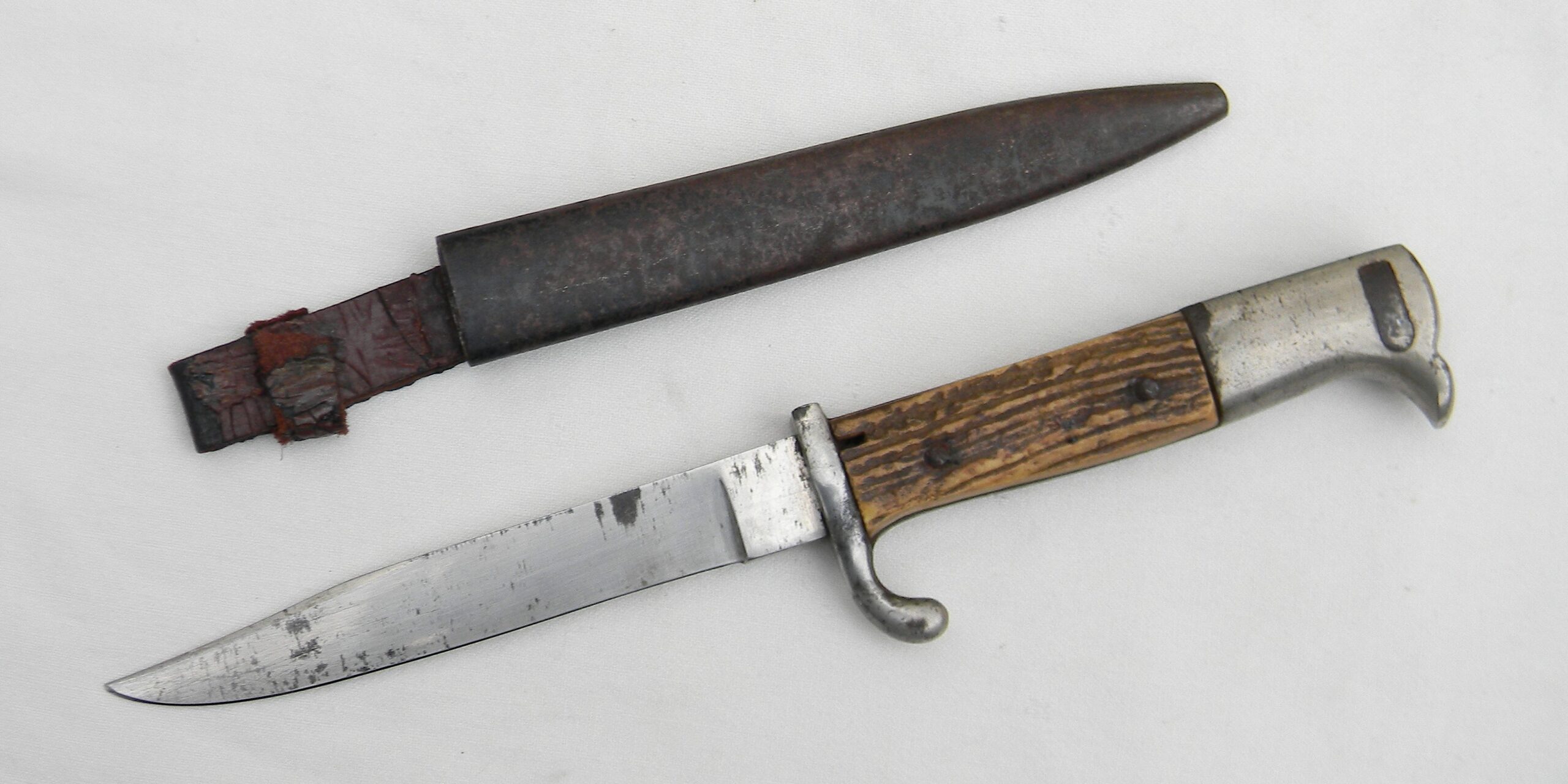 This fighting knife is used, but it’s in better than average condition for the type – stag handle scales are not damaged, no pitting, dings or nicks on the blade; no edge nicks or dings on the spine. The dagger is about 10-1/4” / 25.8 cm overall; the blade is about 5-3/4” / 14.6 cm; a few light surface rust spots on the blade are noted for accuracy. This Aufpflanzbares Kampfmesser specimen is unmarked. Genuine European stag handle scales on two iron pins; all parts are tight with no play; bayonet release mechanism is nice and tight; it’s in 100% working condition. Original metal scabbard is in fair shape; it holds the blade tight with no wobble. The original belt hanger is still on but the keeper has fallen apart over time, which is pretty typical for these late-war issues.