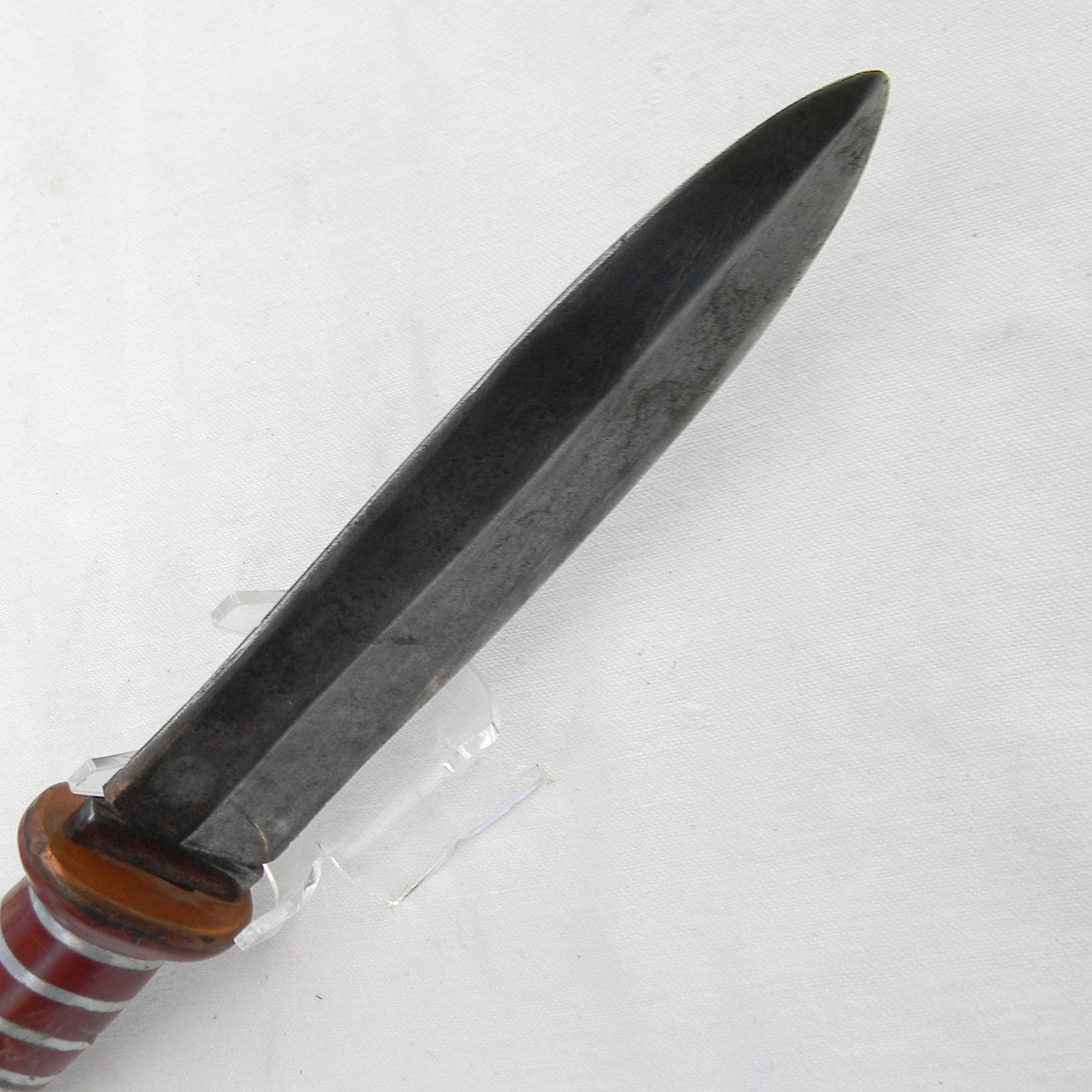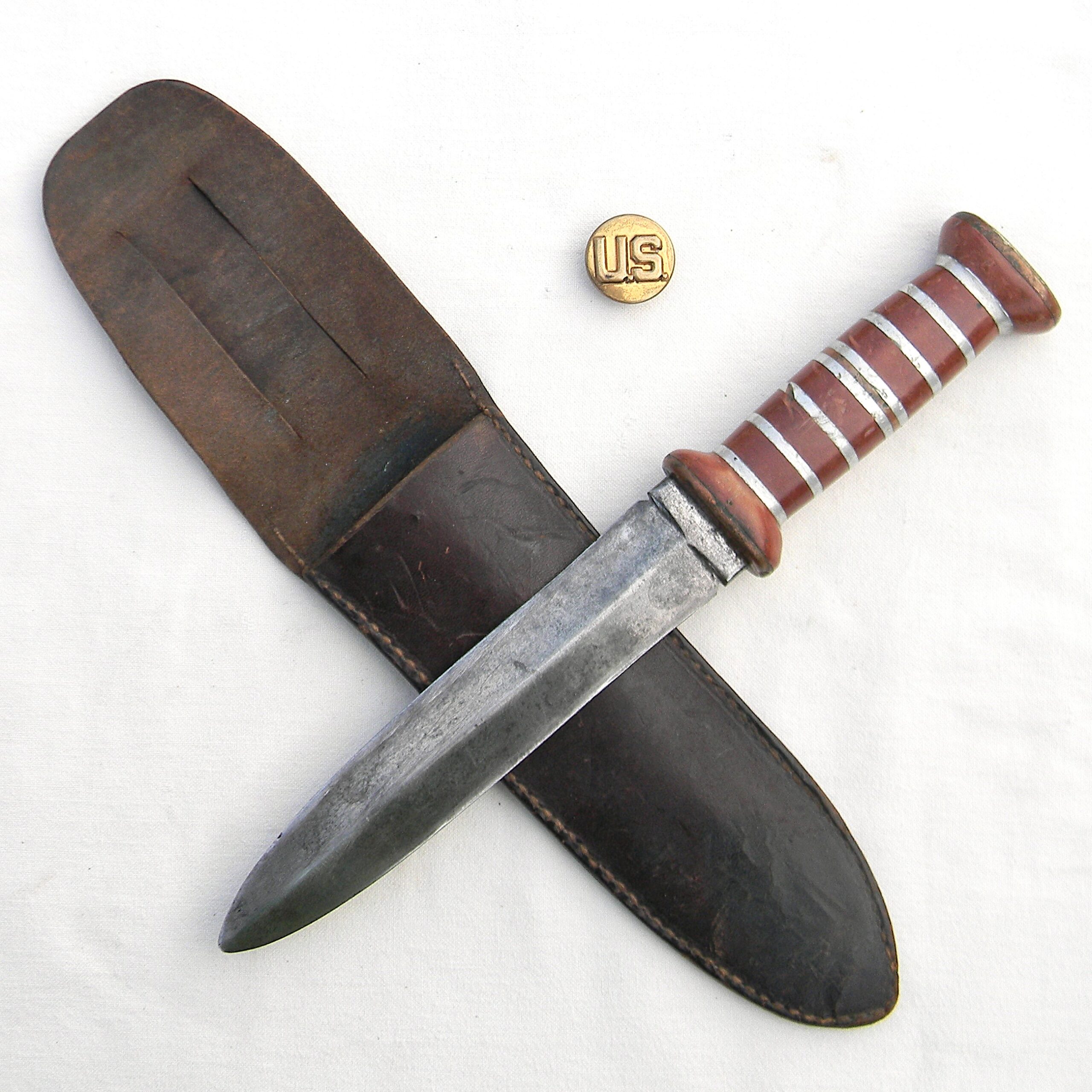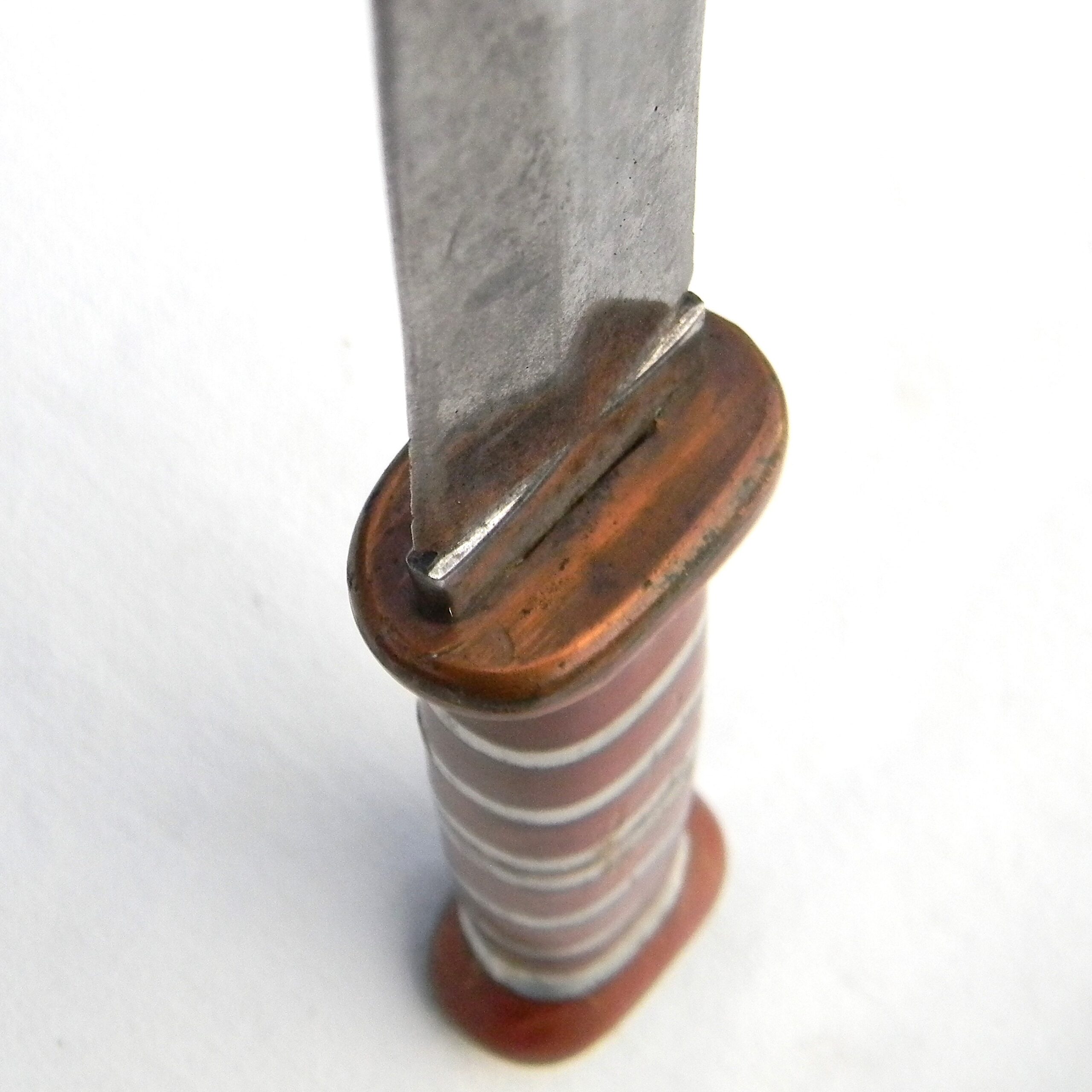 Stacked red Bakelite with aluminum spacers and copper fittings handle. Copper guard was expertly fitted to the blade – no small feat in the rudimentary field conditions. This interesting fighting knife is about 11-3/8″ / 29 cm overall; the blade is about 7″ / 17.5 cm, it is very sharp still; the tip is intact. Original custom-made leather scabbard is in great overall condition – the leather is soft and supple; all original stitching is intact. This interesting and certainly one-of-a kind WW2 American fighting dagger has not been cleaned or tampered with in any way; it is in 100% original “as is” condition. These are the actual photos; Garand clips are not included with the knife 😉