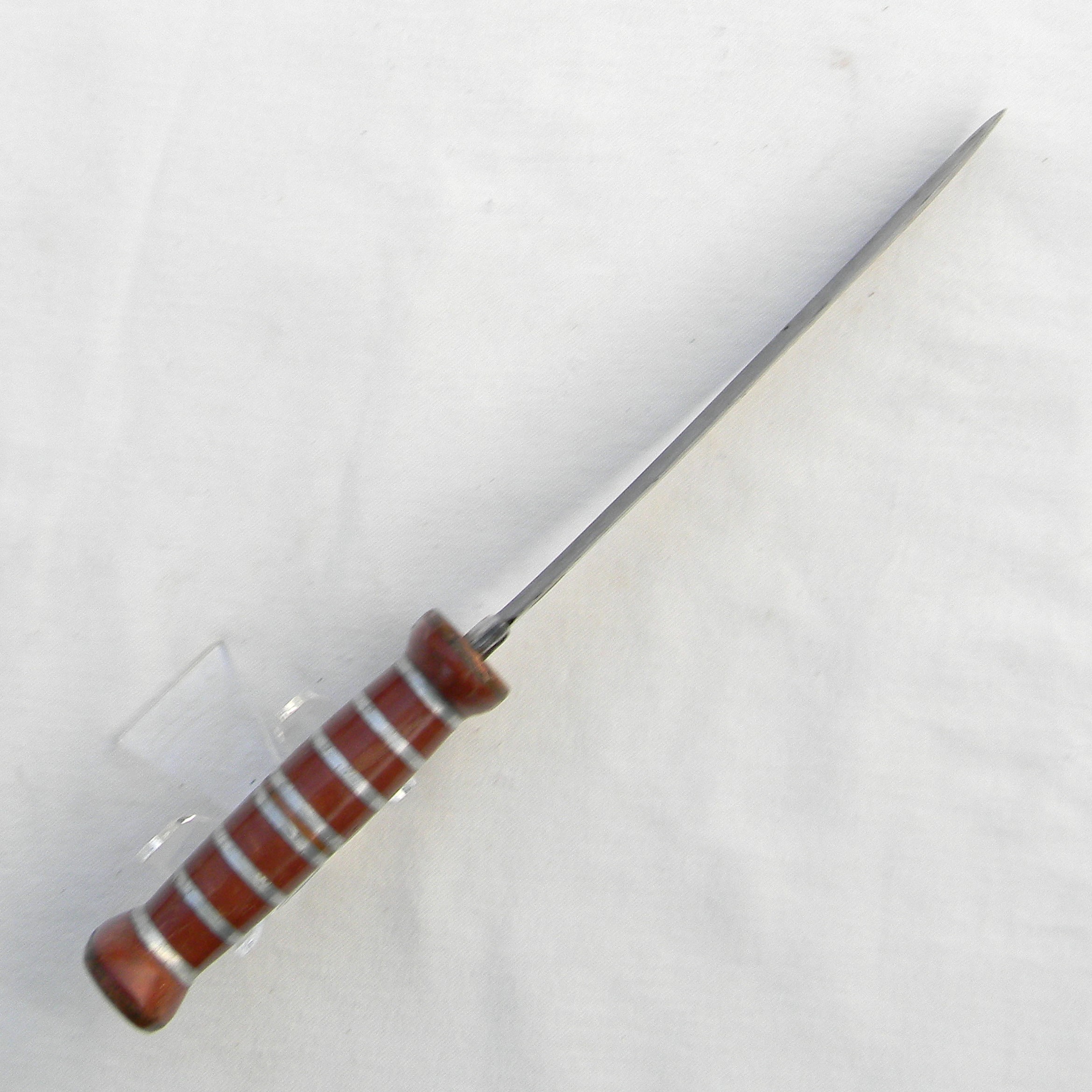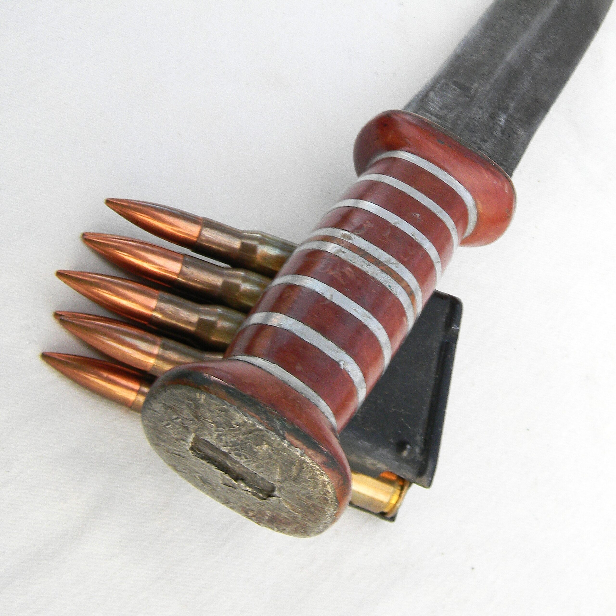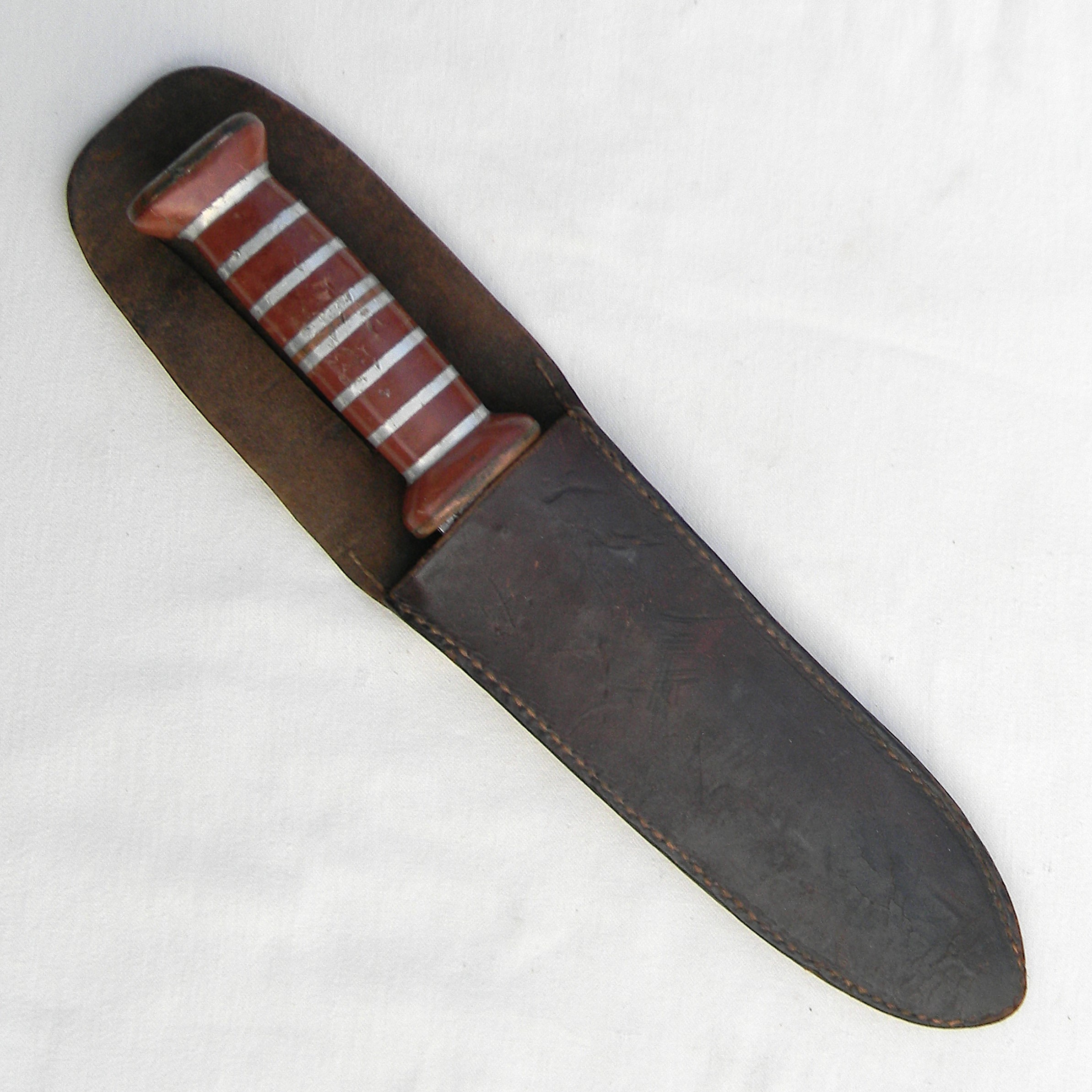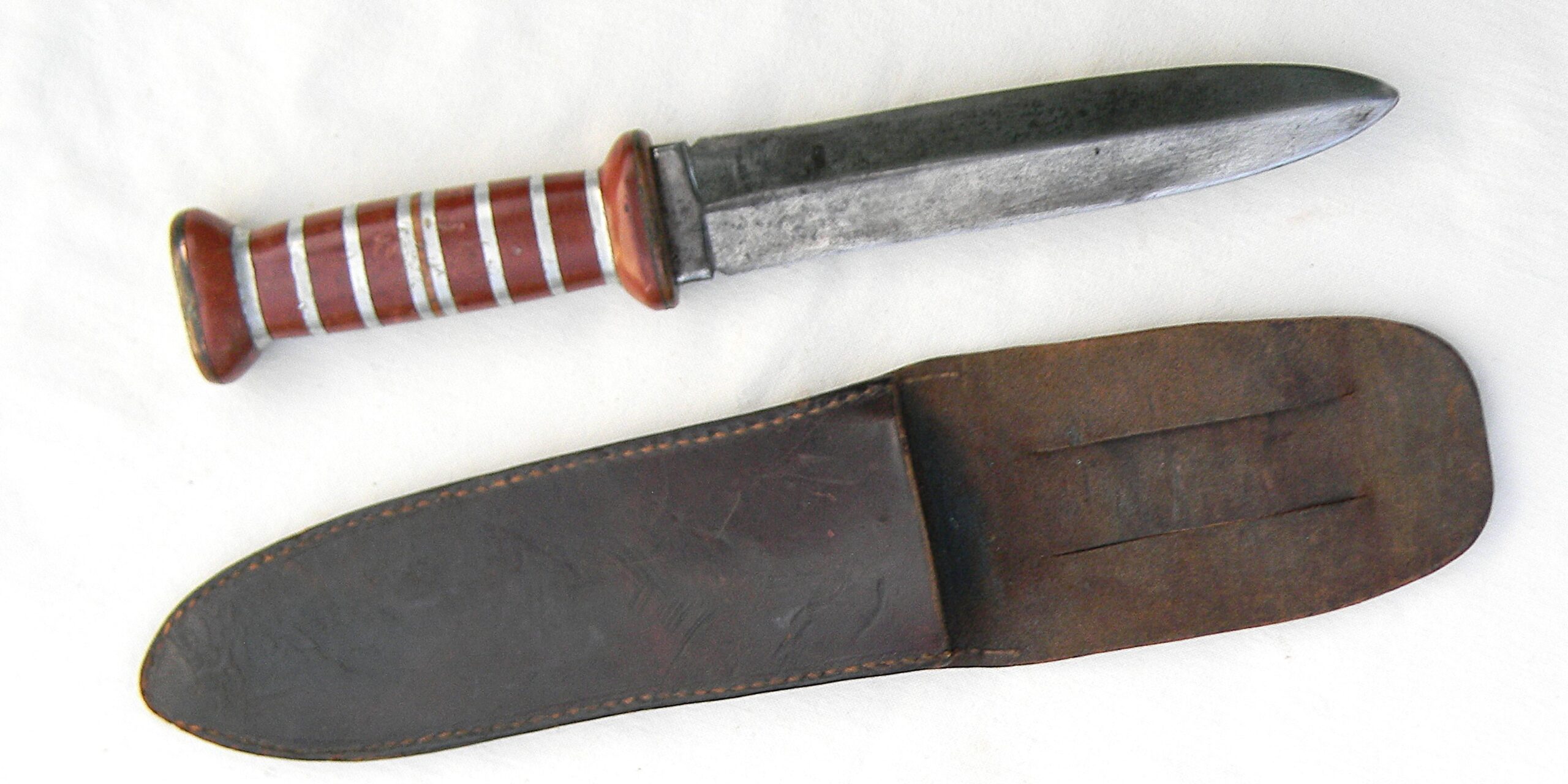 Stacked red Bakelite with aluminum spacers and copper fittings handle. Copper guard was expertly fitted to the blade – no small feat in the rudimentary field conditions. This interesting fighting knife is about 11-3/8″ / 29 cm overall; the blade is about 7″ / 17.5 cm, it is very sharp still; the tip is intact. Original custom-made leather scabbard is in great overall condition – the leather is soft and supple; all original stitching is intact. This interesting and certainly one-of-a kind WW2 American fighting dagger has not been cleaned or tampered with in any way; it is in 100% original “as is” condition. These are the actual photos; Garand clips are not included with the knife 😉
