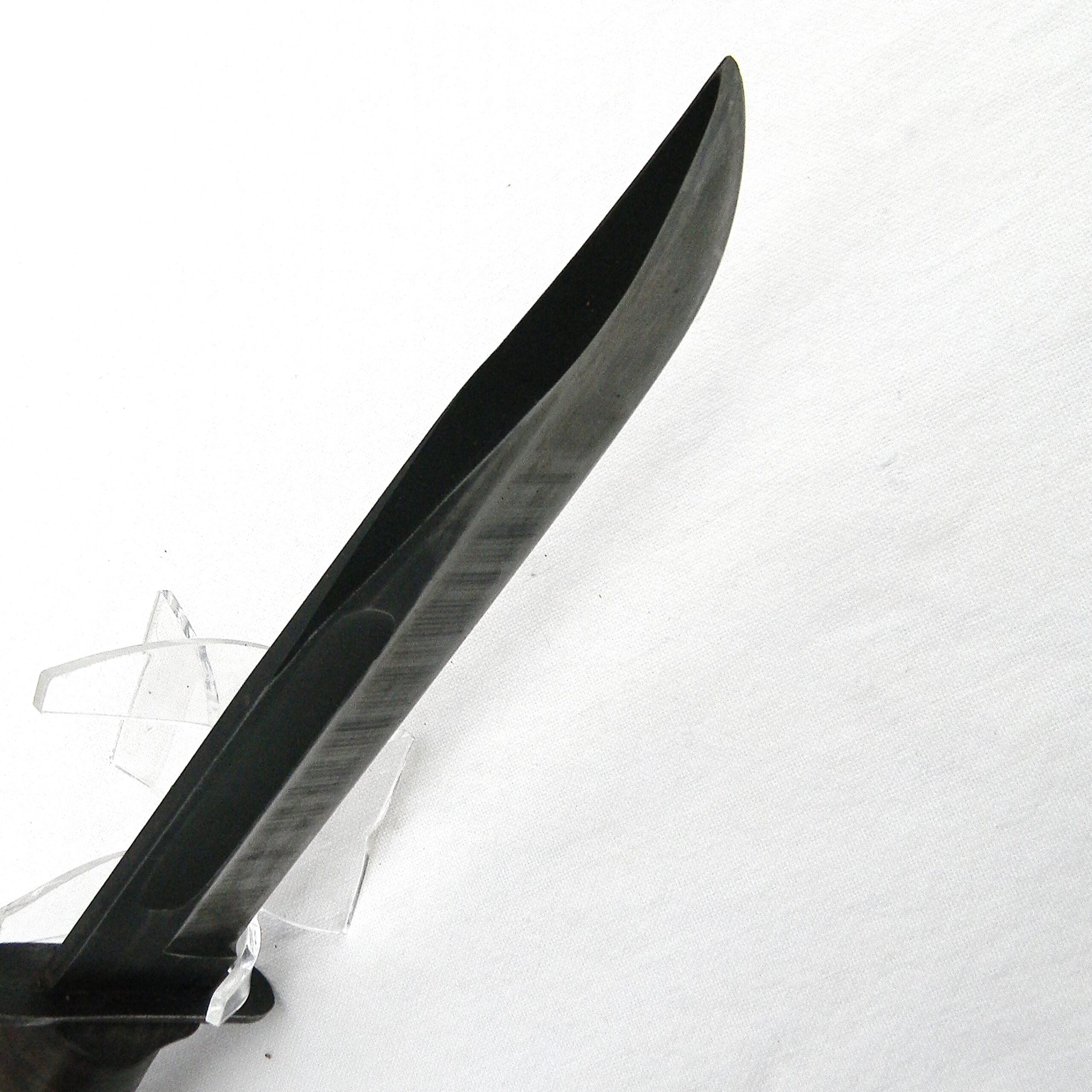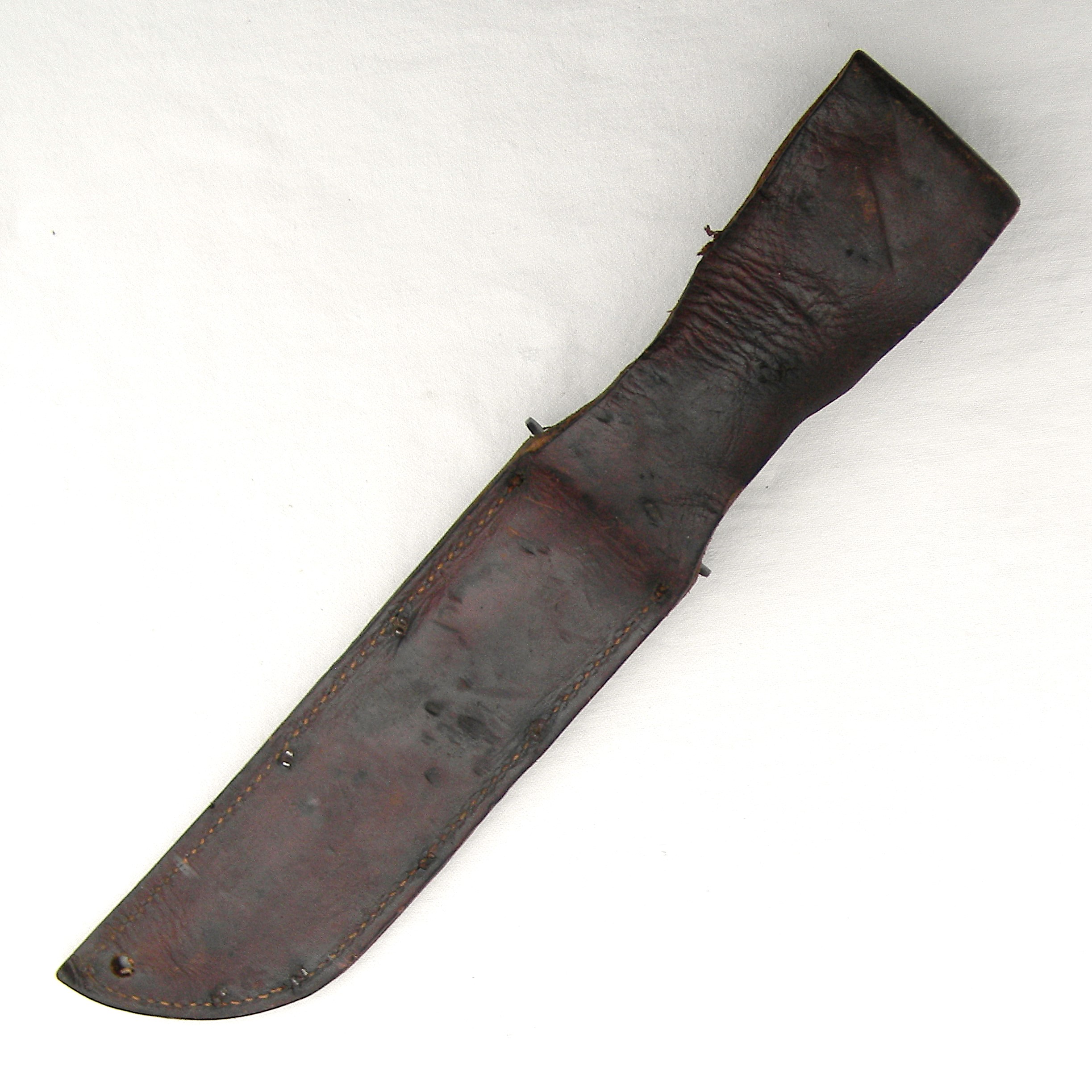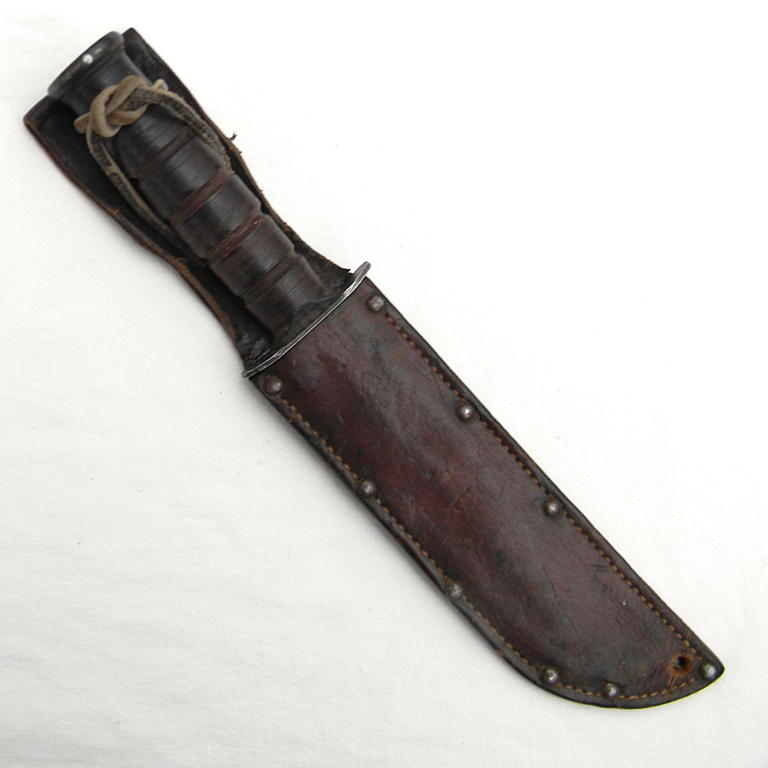 The guard is stamped CAMILLUS, N.Y. and U.S.M.C. on the top side; ricasso is unmarked, as it should be for this type. Leather washers “fat handle” with heavy round pommel and a slightly curved guard is nicely decorated with braided knots. The entire handle was dipped in varnish to prevent corrosion; all parts are tight with no play. The knife is about 12″ / 30.5 cm overall; blued blade is about 7″ / 17.8 cm. The blade has about 60% of its original parkerized finish intact. The edge has been re-sharpened, but not harshly; it is razor-sharp still; the tip is intact. Rare early WW2 issue all-leather scabbard is in great overall condition, considering the age. Original stitching and rivets are intact; the leather is soft and supple still. The keeper has been replaced with a leather tie-down cord. Overall, this scabbard is in better-than-average condition – these early scabbards are hard-to-find in general as most have salt water/moisture damage. This rare USMC-designated WW2 Camillus USMC MK2 fighting knife and its original scabbard are in 100% serviceable condition still. With proper care this old timer will last you another 85 years 😉