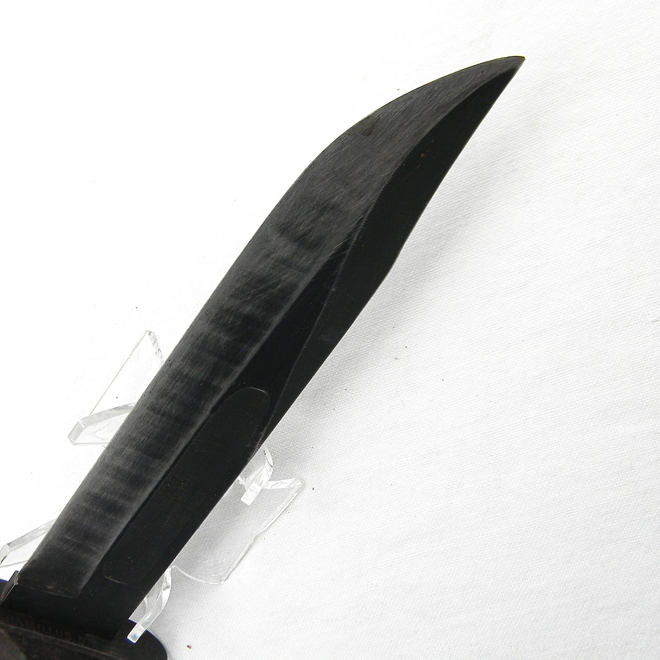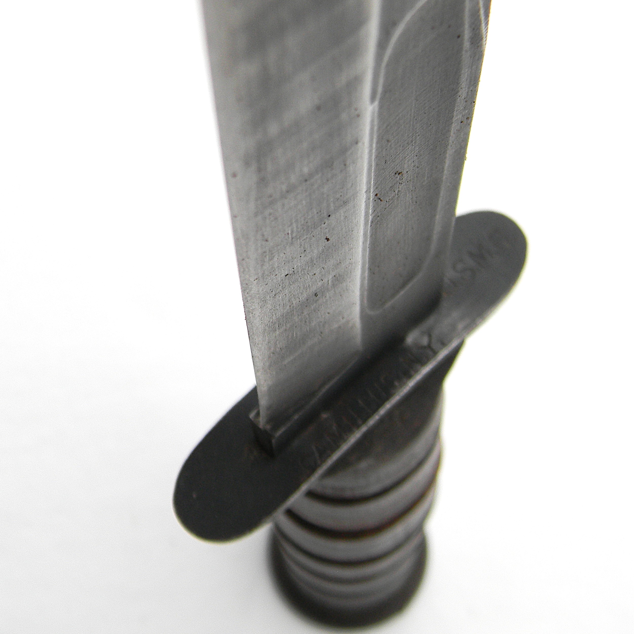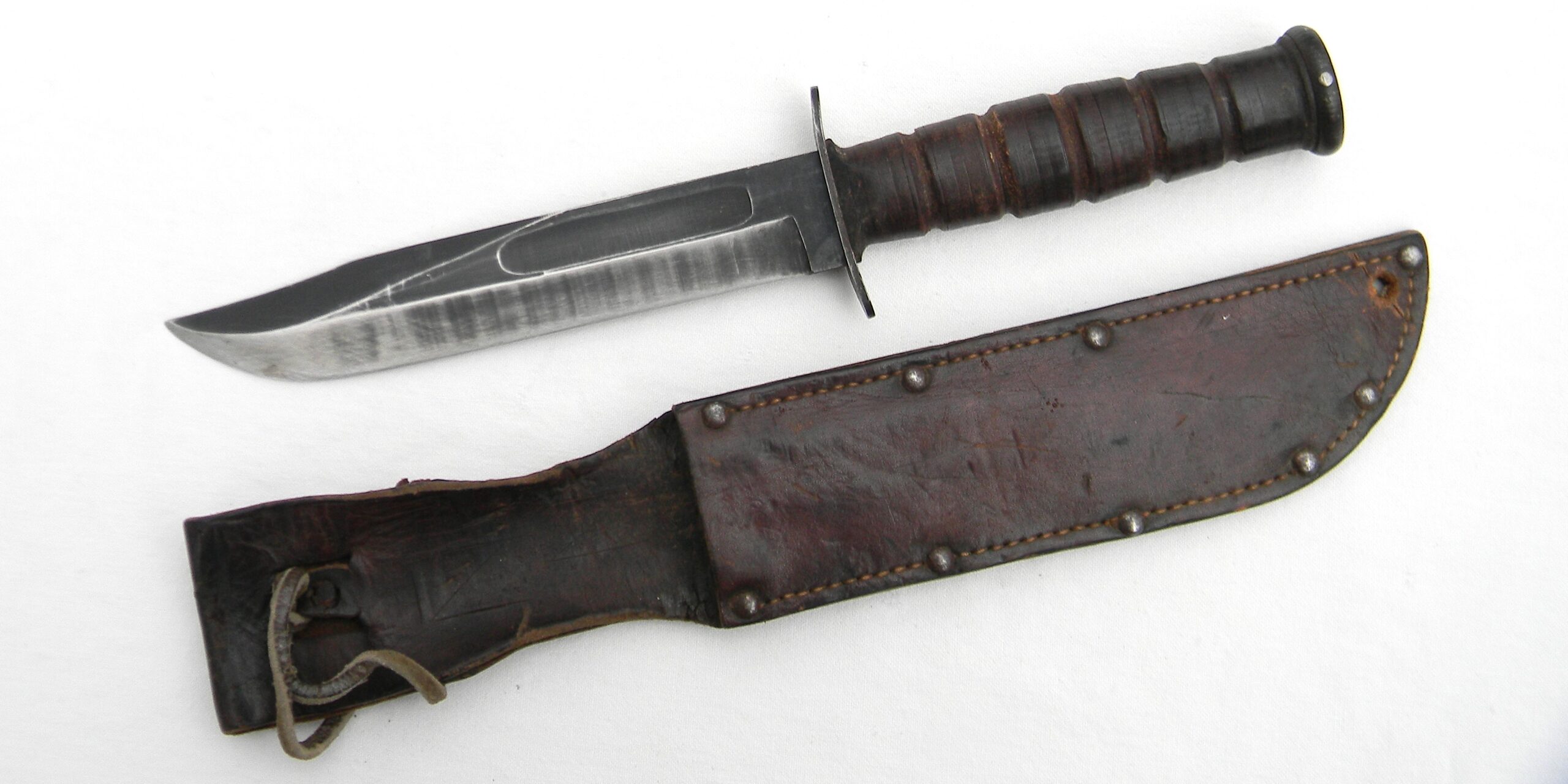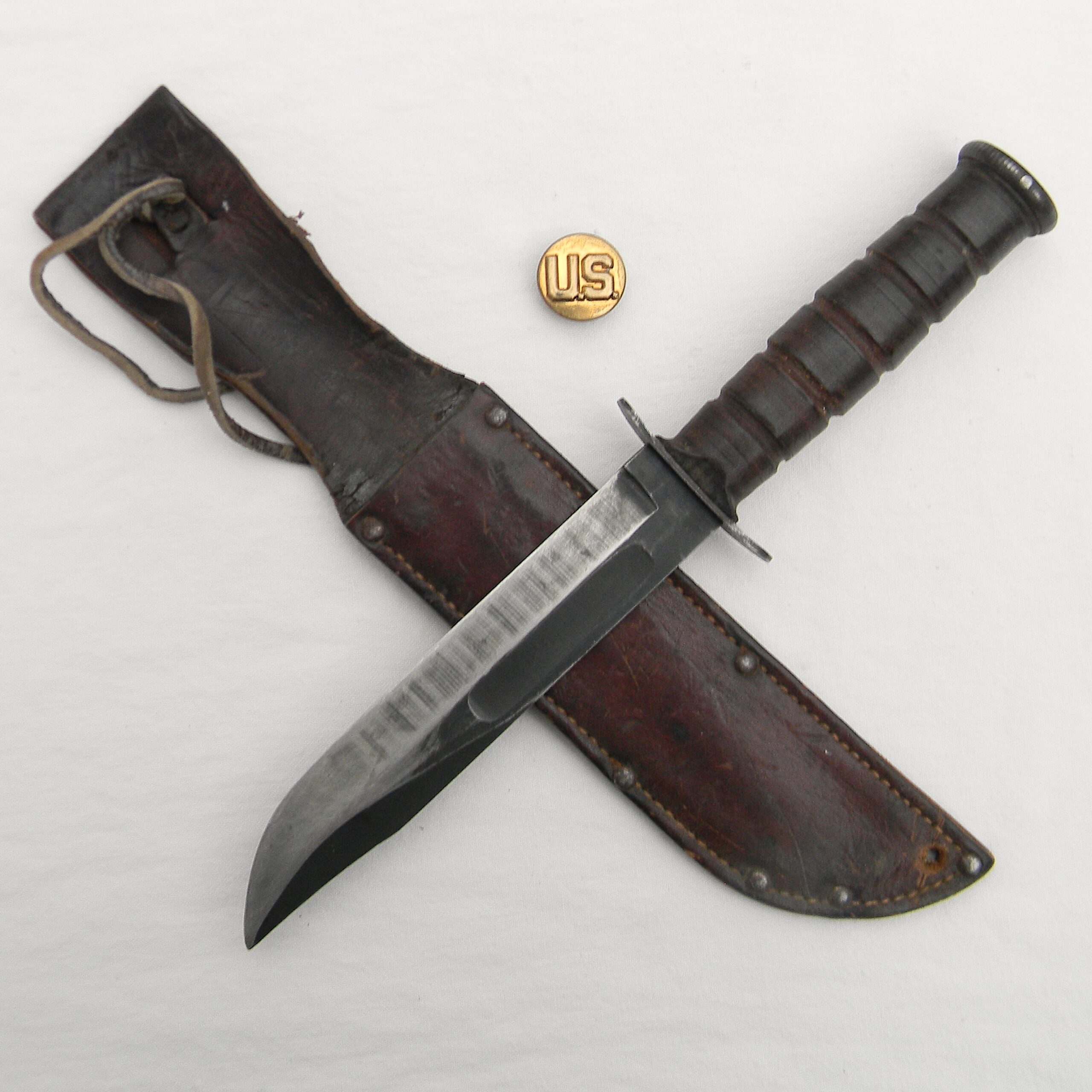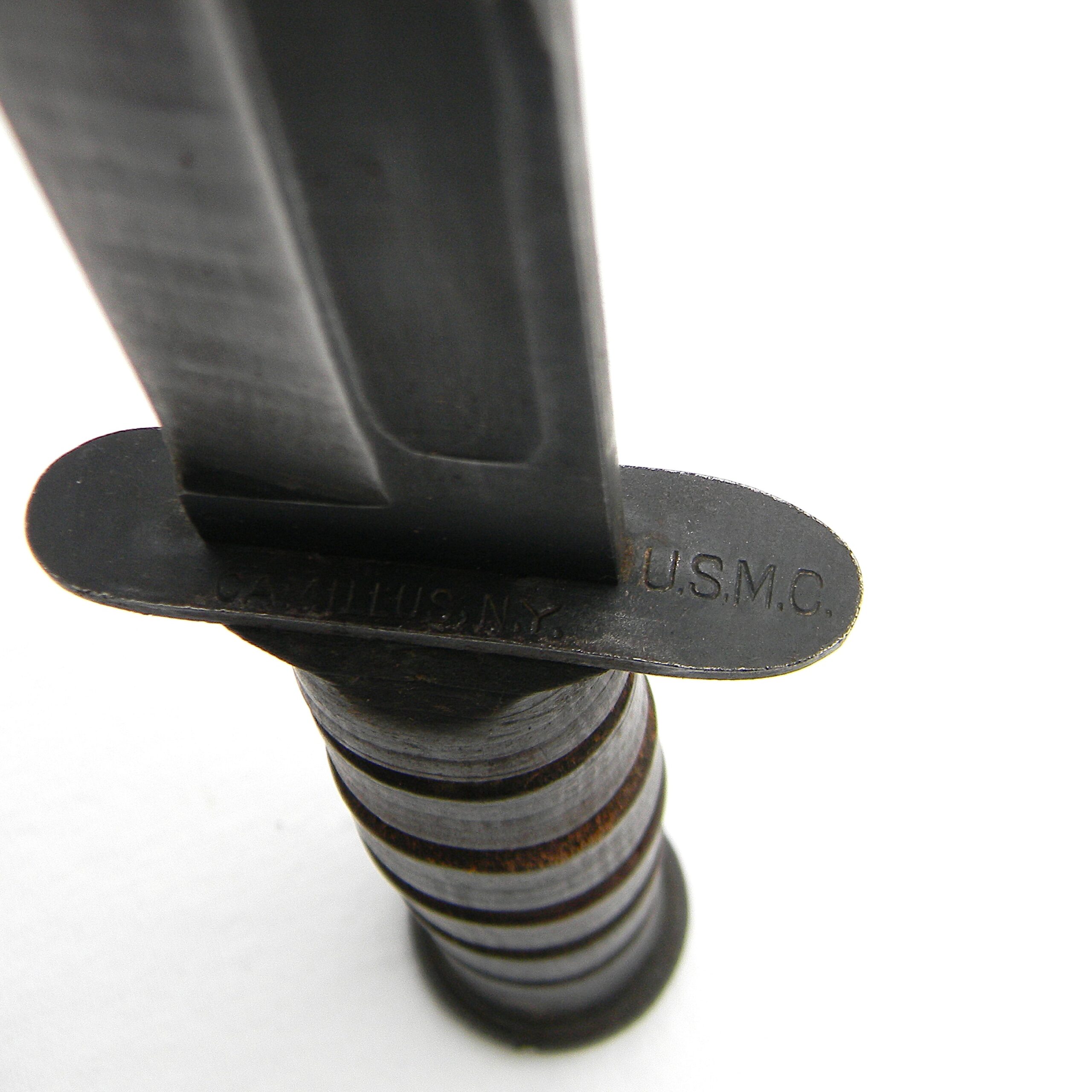 Original early WW2 era US Navy Mark 2 “Ka-Bar” fighting knife with the USMC designation (the link is a courtesy of Wikipedia) manufactured early in the war by Camillus Cutlery in Camillus, New York. MK2 is a classic American WW2 era fighting knife; this type was used in combat by the US Army and the Navy men alike in all theaters of the War. This is a hard-to-find USMC-designated MK2 fighter – these were manufactured for the US Marine Corps in limited quantities. It turns out that the early issue leather scabbards would quickly fail when exposed to salt water. These early-war leather scabbards were quickly replaced with more durable composition scabbards; early all-leather scabbards are hard-to-find nowadays.