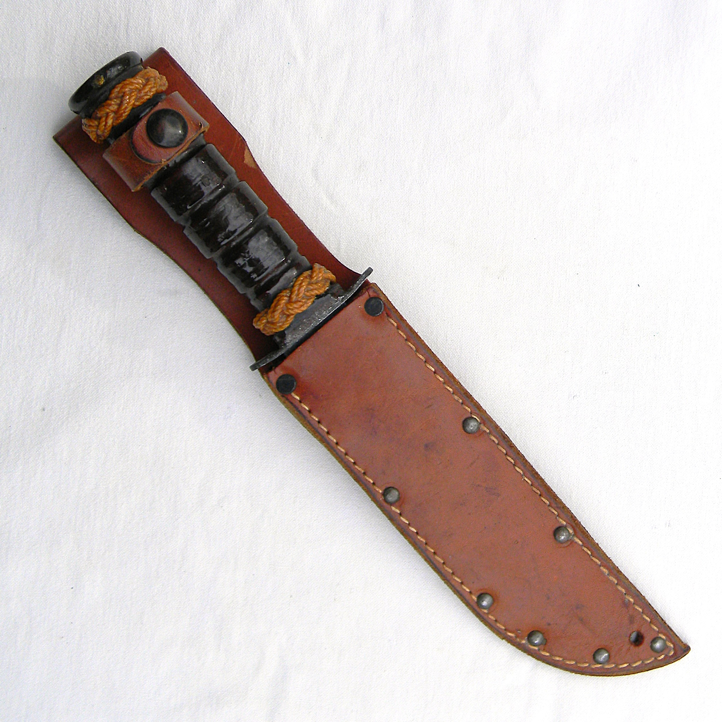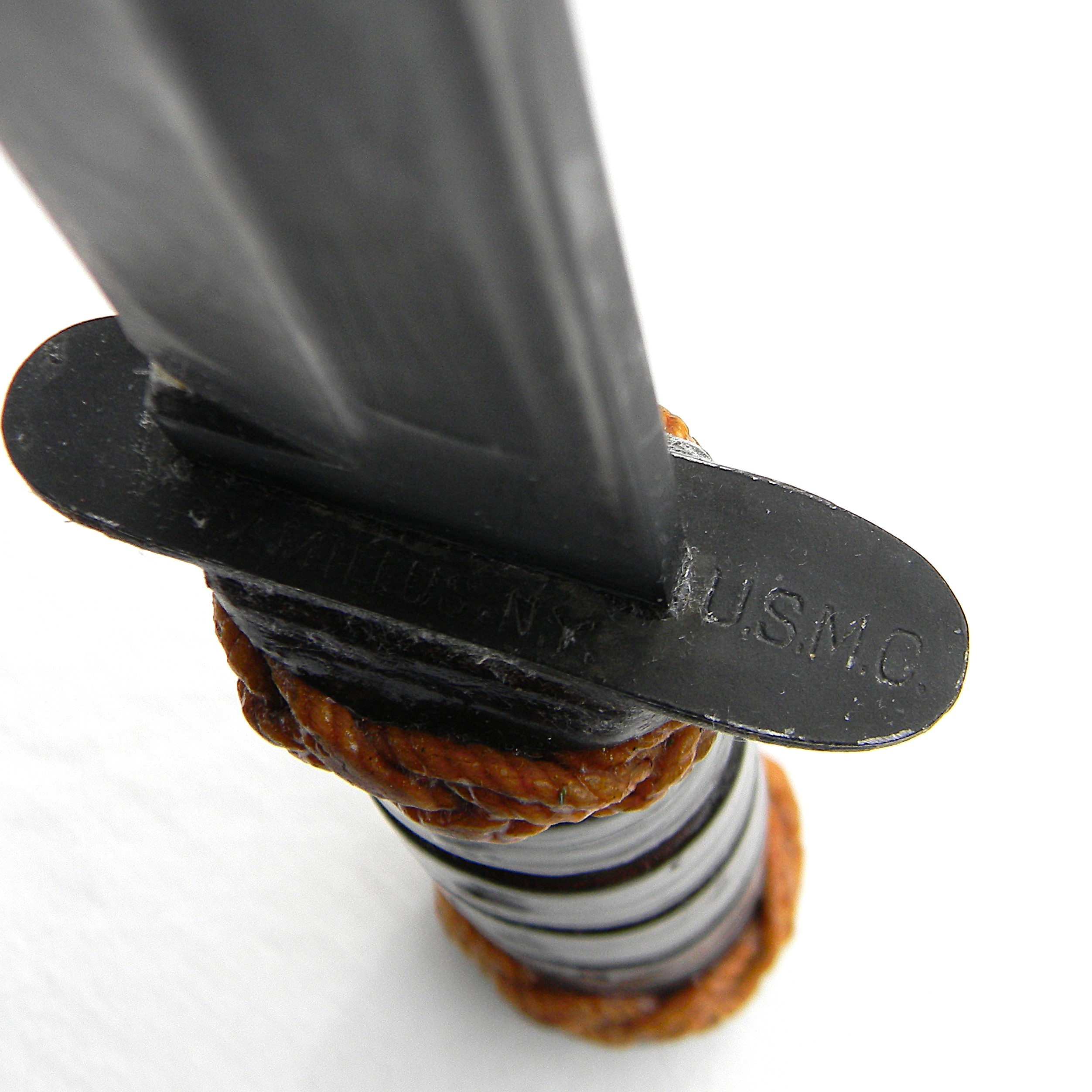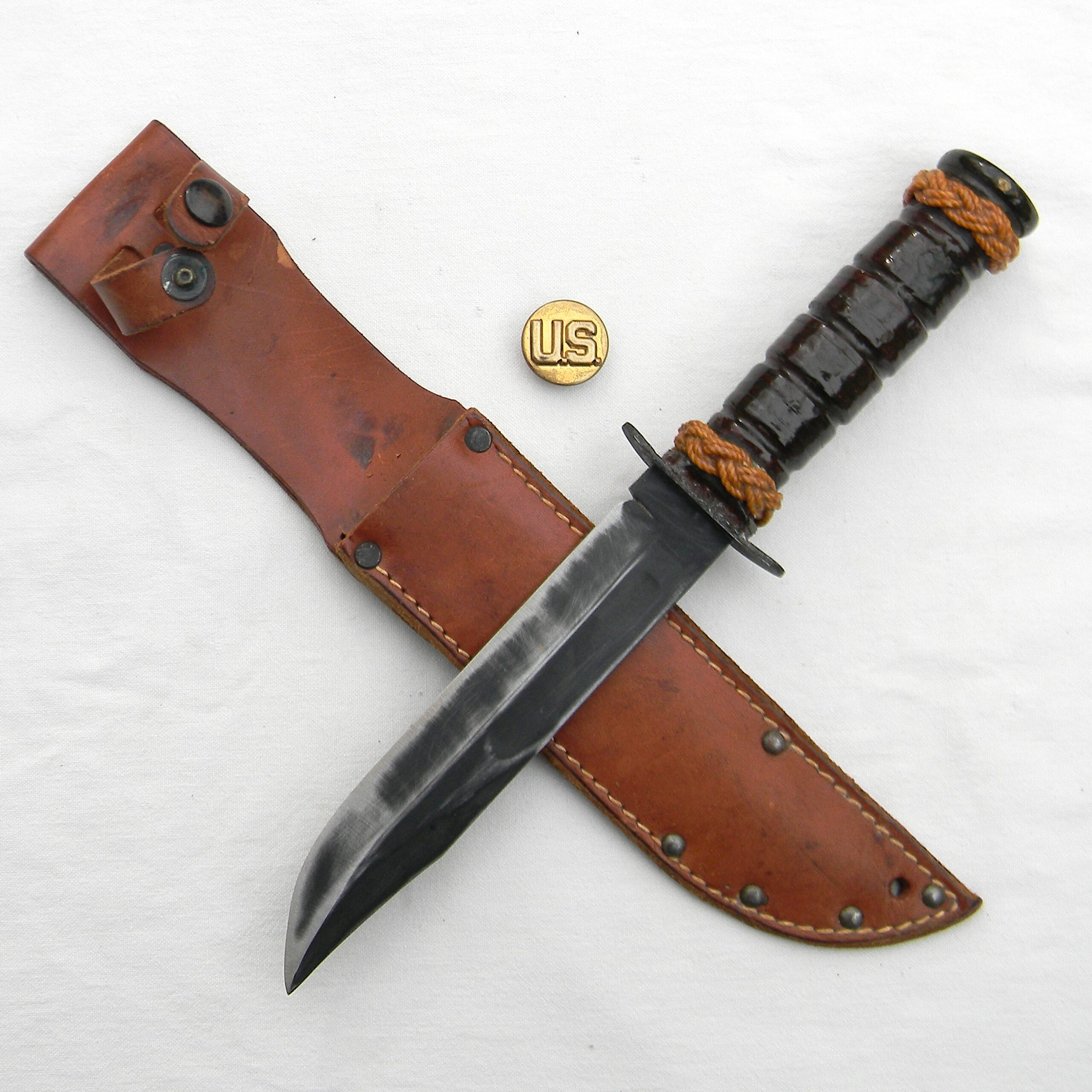 Original early WW2 era US Navy Mark 2 “Ka-Bar” fighting knife with the USMC designation (the link is a courtesy of Wikipedia) manufactured early in the war by Camillus Cutlery in Camillus, New York. MK2 is a classic American WW2 era fighting knife; this type was used in combat by the US Army and the Navy men alike in all theaters of the War. This is a hard-to-find USMC-designated MK2 fighter – these were manufactured for the US Marine Corps in limited quantities. The early issue leather scabbards turned out to fail quickly when exposed to salt water and were quickly replaced with more durable composition scabbards.