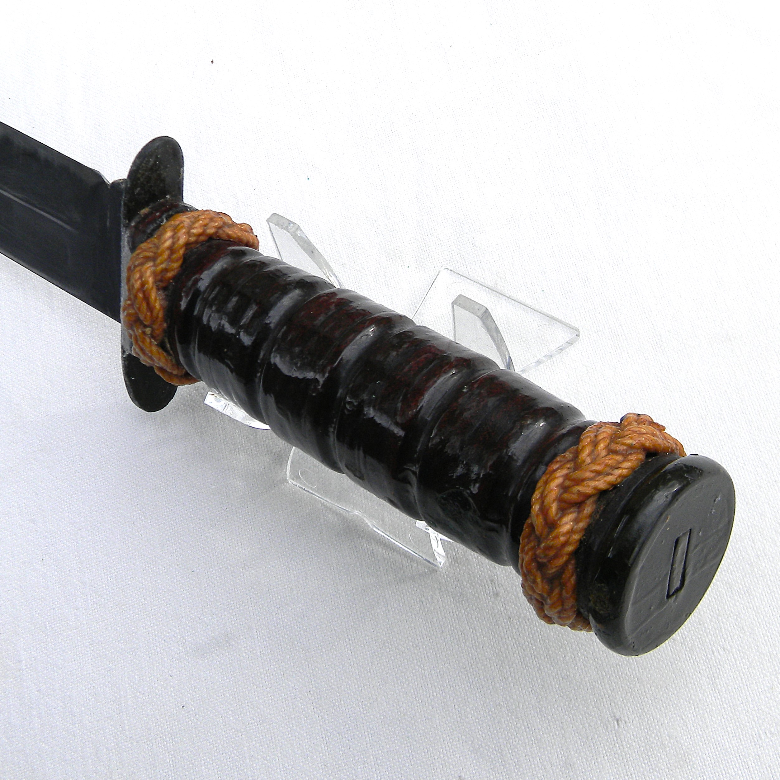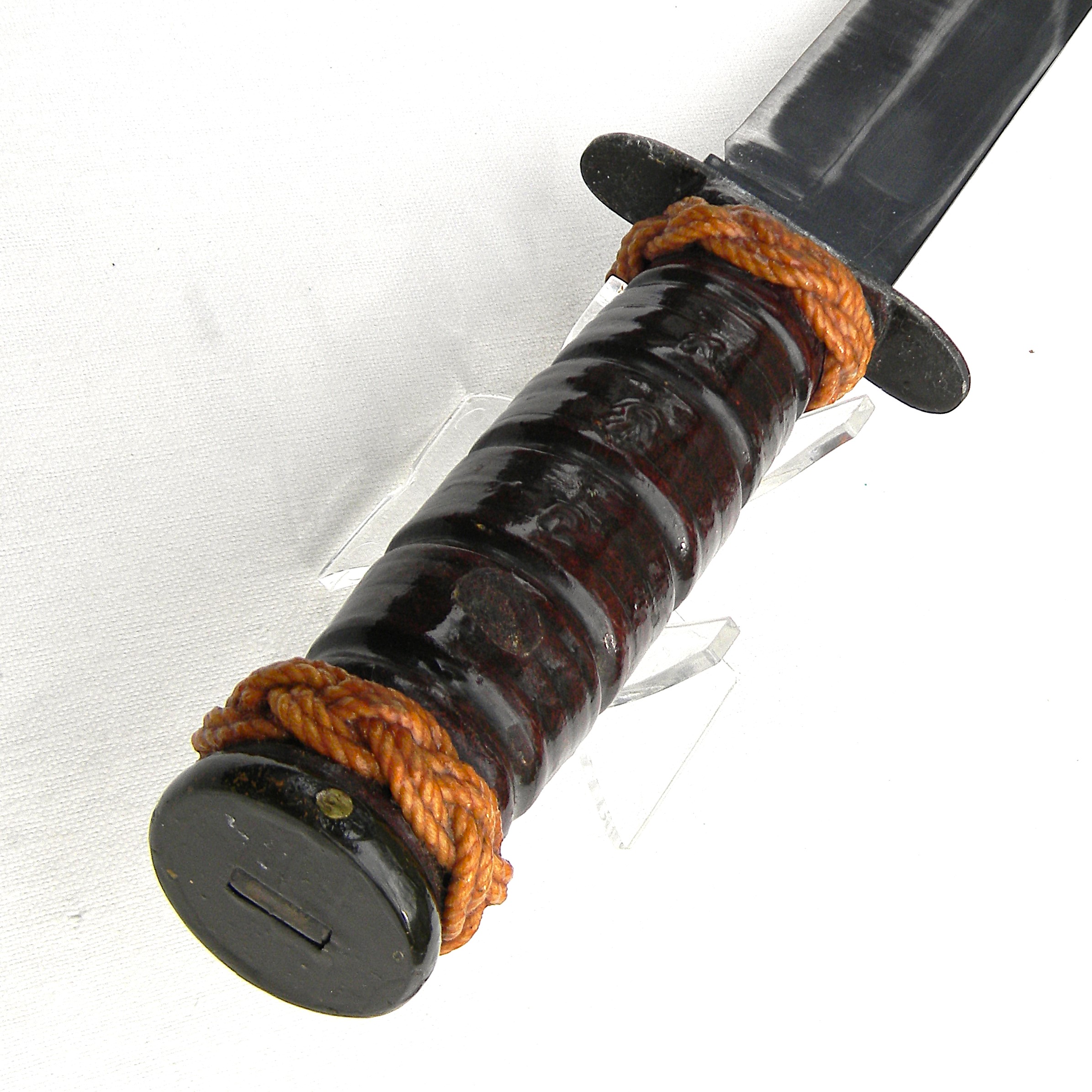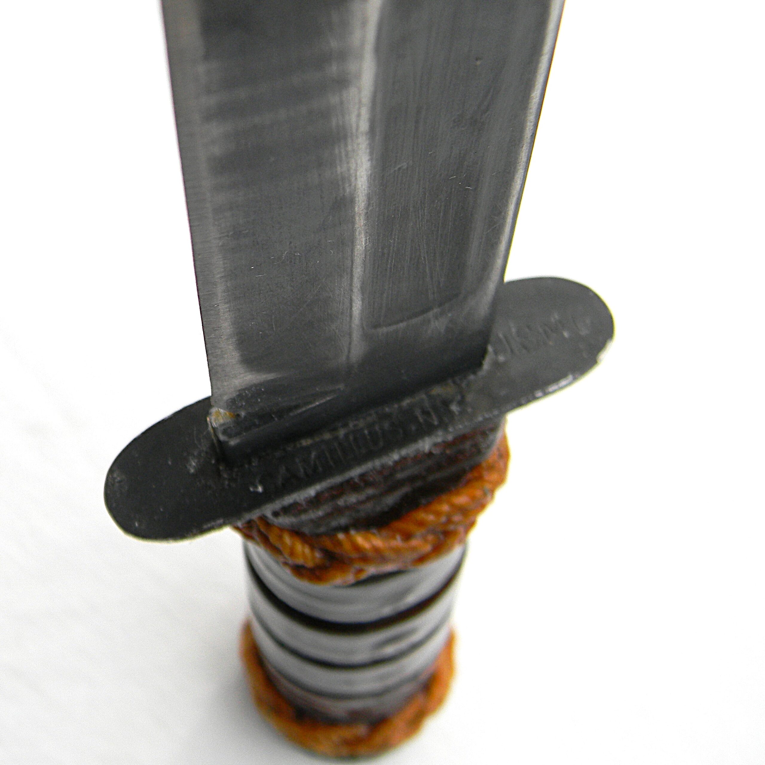 Original early WW2 era US Navy Mark 2 “Ka-Bar” fighting knife with the USMC designation (the link is a courtesy of Wikipedia) manufactured early in the war by Camillus Cutlery in Camillus, New York. MK2 is a classic American WW2 era fighting knife; this type was used in combat by the US Army and the Navy men alike in all theaters of the War. This is a hard-to-find USMC-designated MK2 fighter – these were manufactured for the US Marine Corps in limited quantities. The early issue leather scabbards turned out to fail quickly when exposed to salt water and were quickly replaced with more durable composition scabbards.