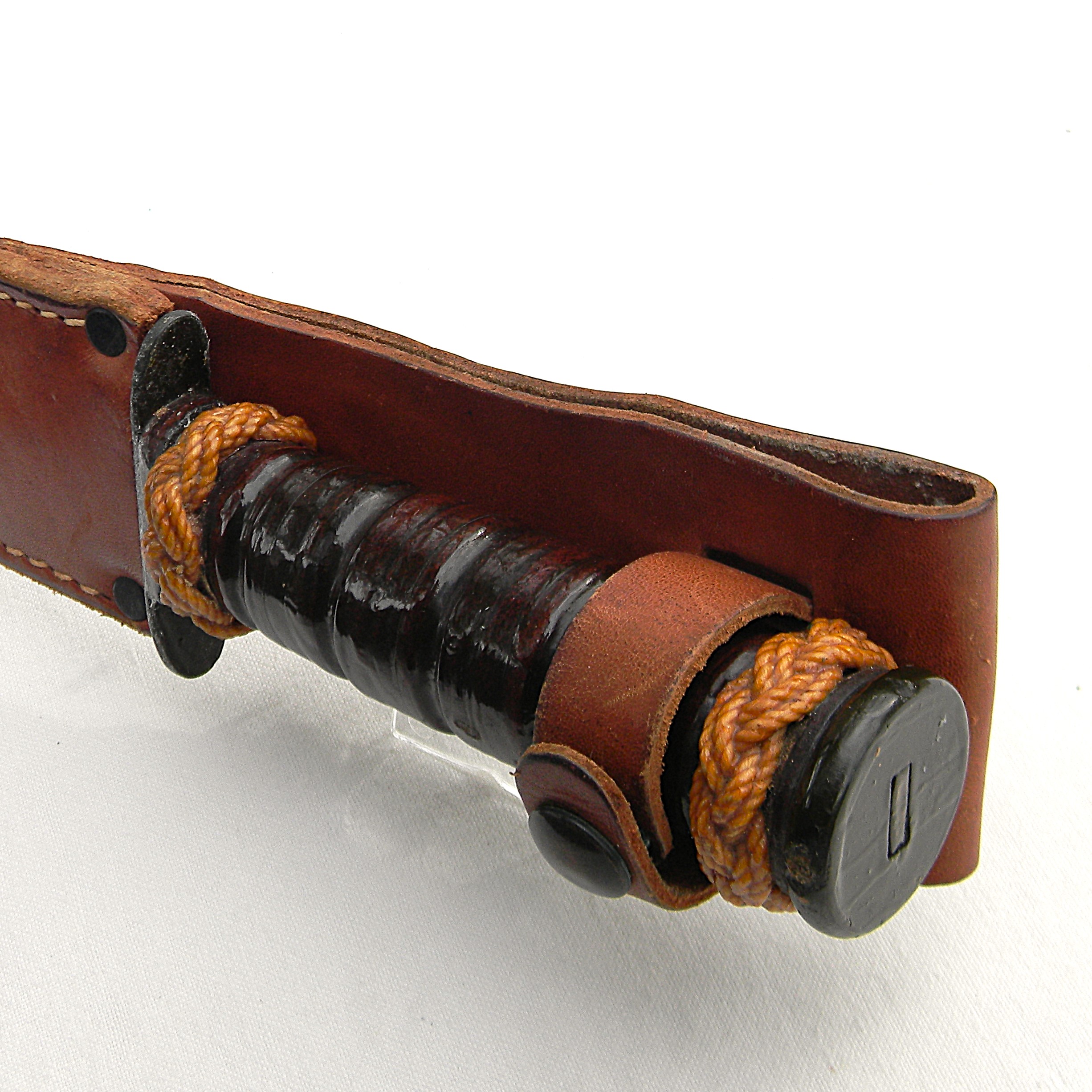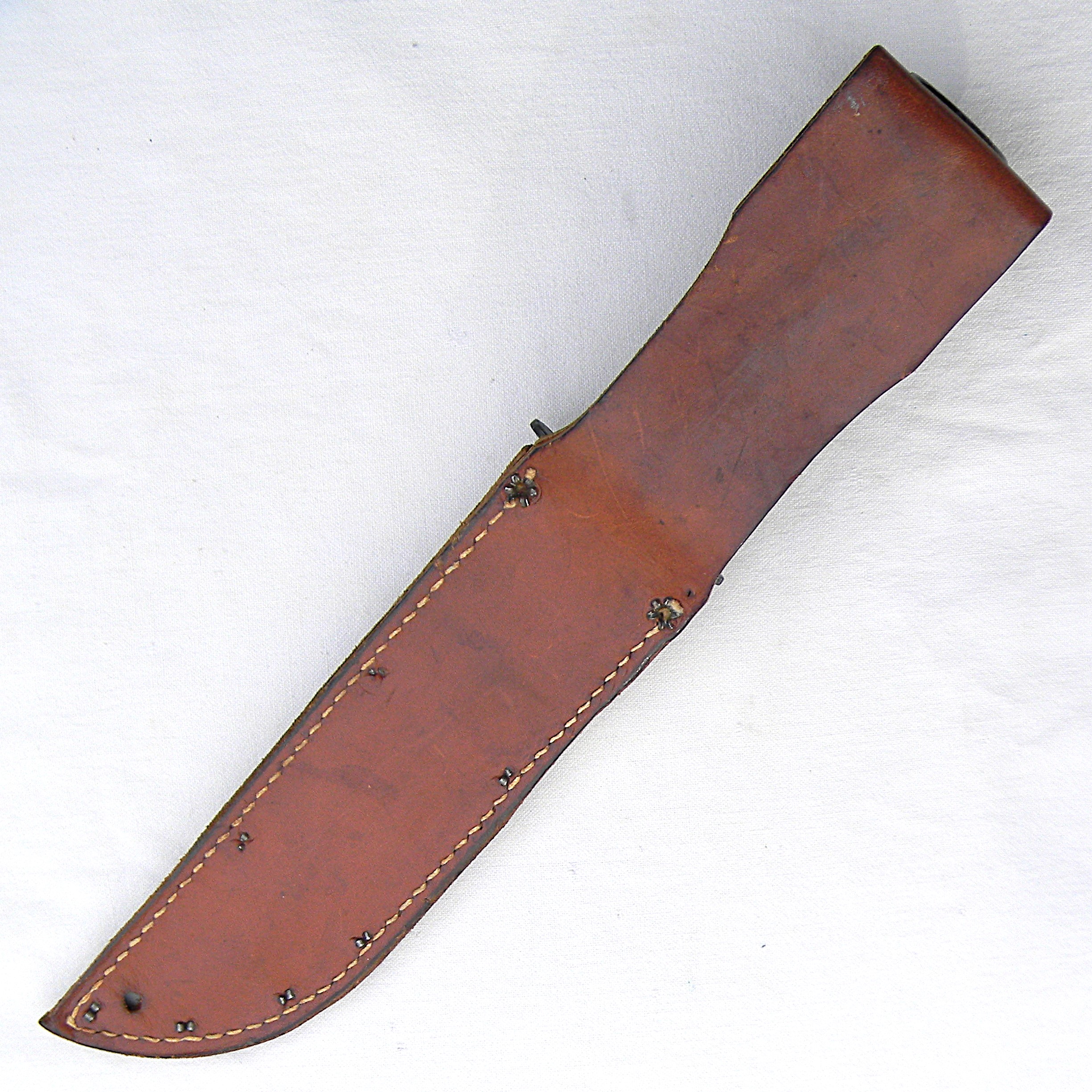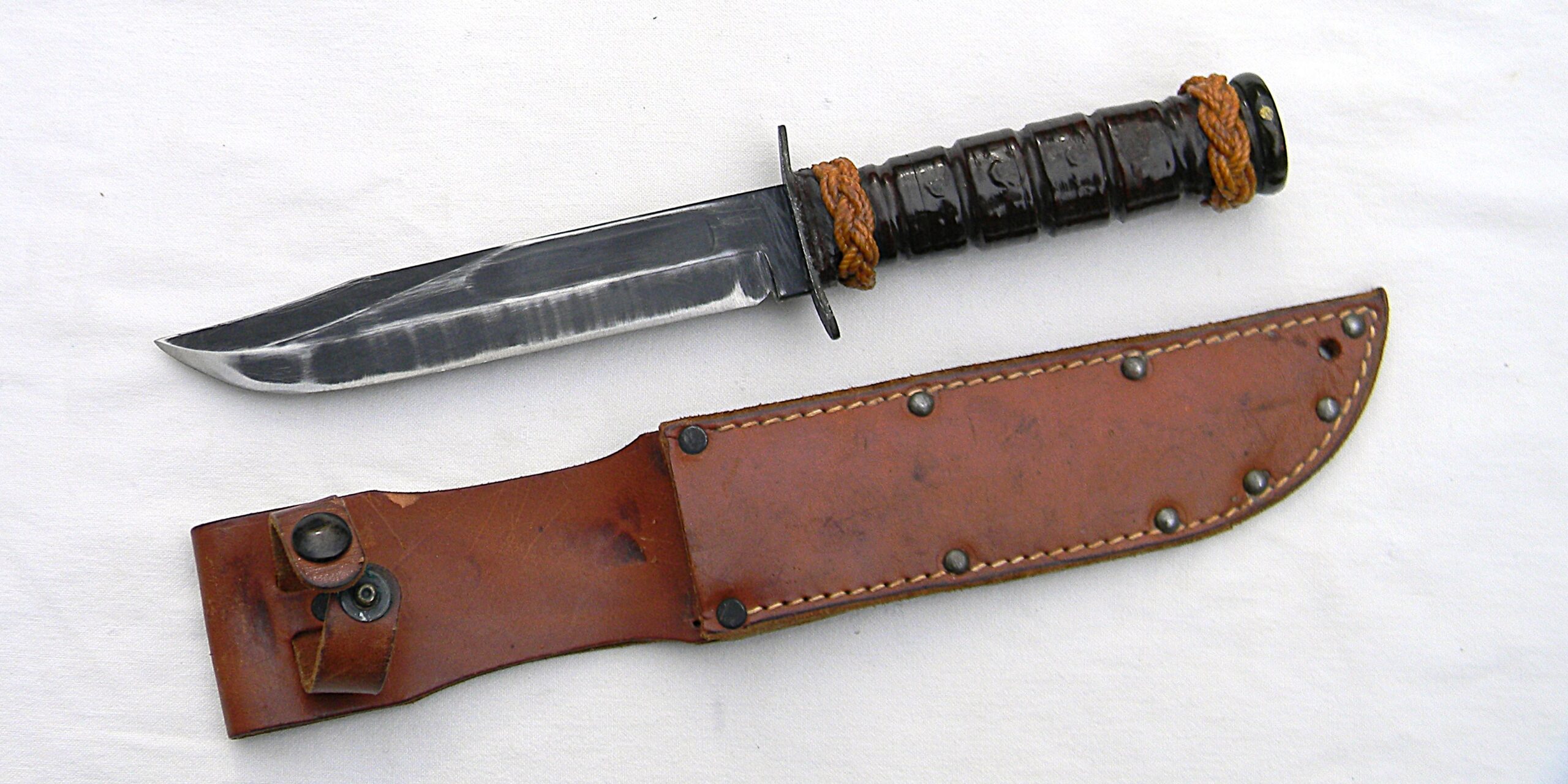 The guard is stamped CAMILLUS, N.Y. and U.S.M.C. on the top side; ricasso is unmarked, as it should be for this type. Leather washers “fat handle” with heavy round pommel and a slightly curved guard is nicely decorated with braided knots. The entire handle was dipped in varnish to prevent corrosion; all parts are tight with no play. The knife is about 12″ / 30.5 cm overall; blued blade is about 7″ / 17.8 cm. The blade has about 80% of its original parkerized finish intact. The edge has been lightly re-sharpened; it is razor-sharp; the tip is intact. Rare early WW2 issue all-leather scabbard is in excellent condition, considering the age. Original keeper with brass snaps is intact; all original rivets and stitching are intact; the leather is soft and supple still. Overall, this scabbard is in better-than-average condition – these early scabbards are hard-to-find in general and are very rare this nice as most have salt water damage. This rare USMC-designated WW2 Camillus USMC MK2 fighting knife and its original scabbard are in 100% serviceable condition. With proper care this old timer will last you another 85 years 😉