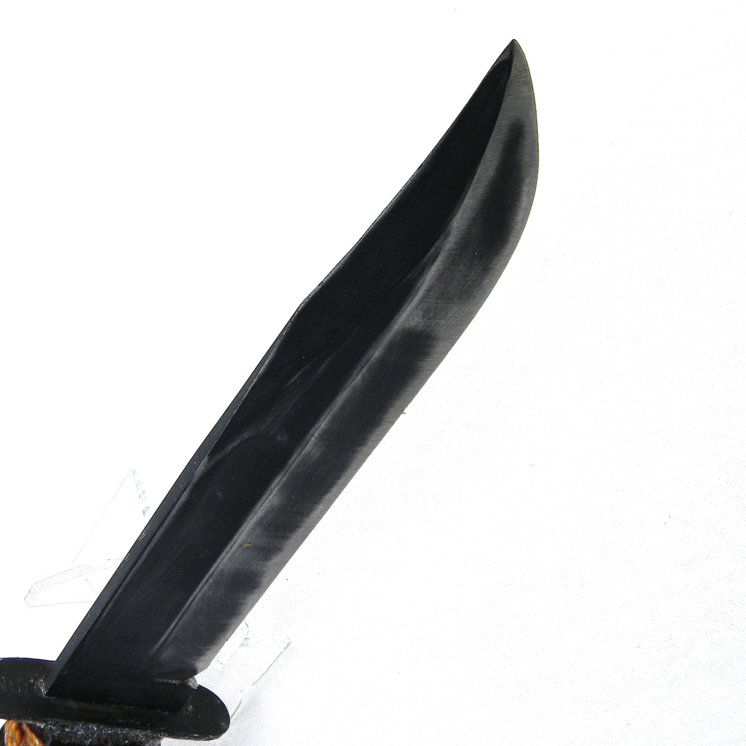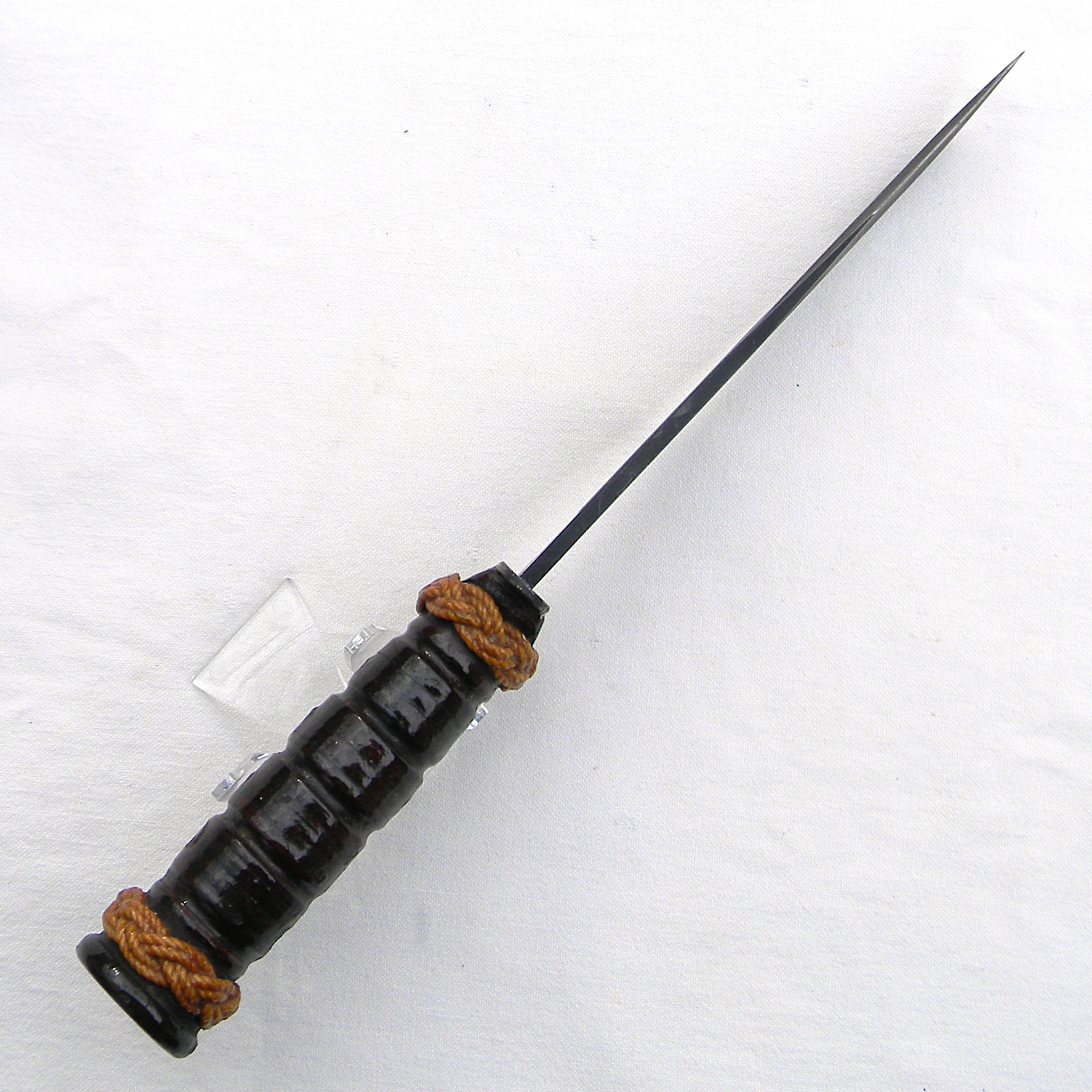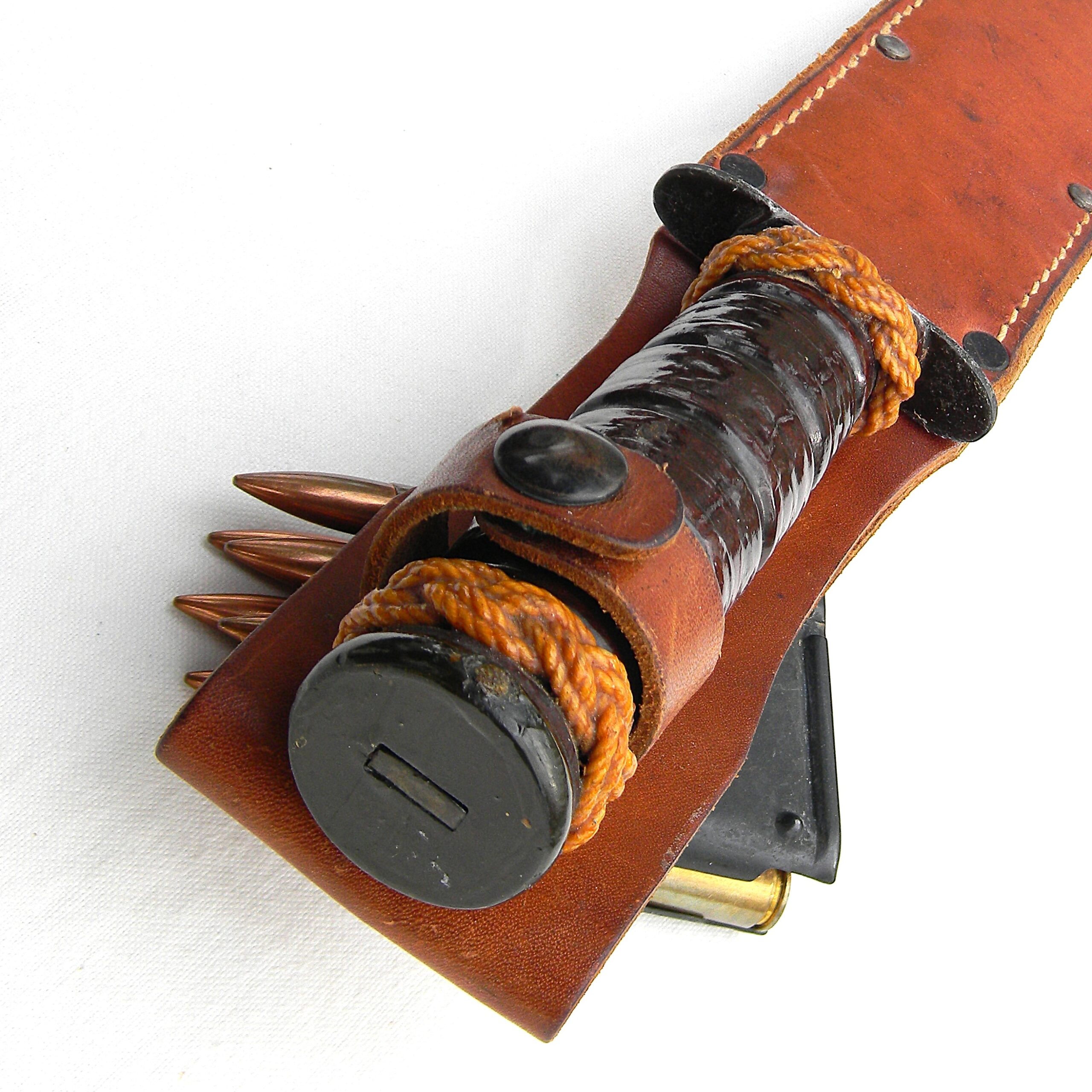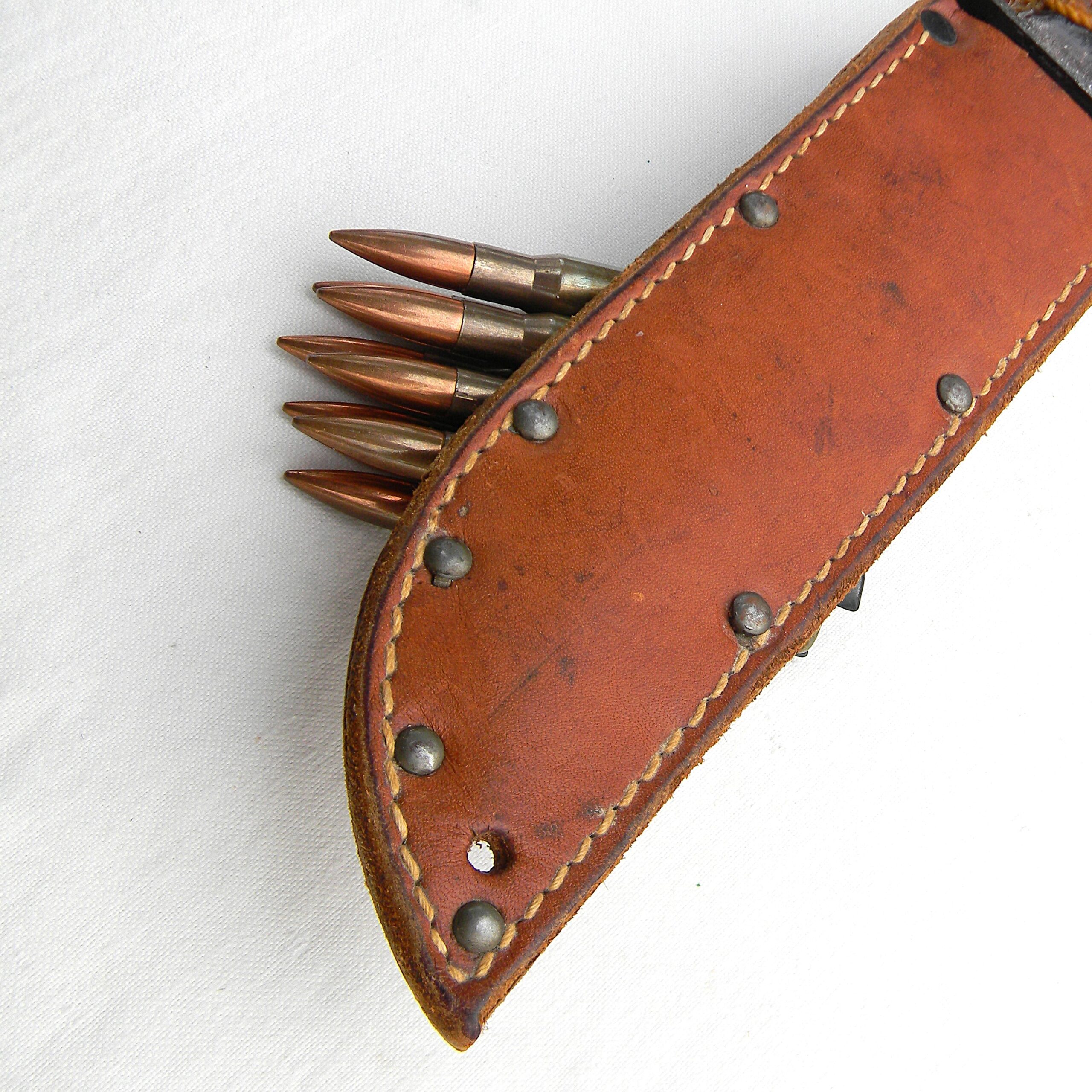 The guard is stamped CAMILLUS, N.Y. and U.S.M.C. on the top side; ricasso is unmarked, as it should be for this type. Leather washers “fat handle” with heavy round pommel and a slightly curved guard is nicely decorated with braided knots. The entire handle was dipped in varnish to prevent corrosion; all parts are tight with no play. The knife is about 12″ / 30.5 cm overall; blued blade is about 7″ / 17.8 cm. The blade has about 80% of its original parkerized finish intact. The edge has been lightly re-sharpened; it is razor-sharp; the tip is intact. Rare early WW2 issue all-leather scabbard is in excellent condition, considering the age. Original keeper with brass snaps is intact; all original rivets and stitching are intact; the leather is soft and supple still. Overall, this scabbard is in better-than-average condition – these early scabbards are hard-to-find in general and are very rare this nice as most have salt water damage. This rare USMC-designated WW2 Camillus USMC MK2 fighting knife and its original scabbard are in 100% serviceable condition. With proper care this old timer will last you another 85 years 😉