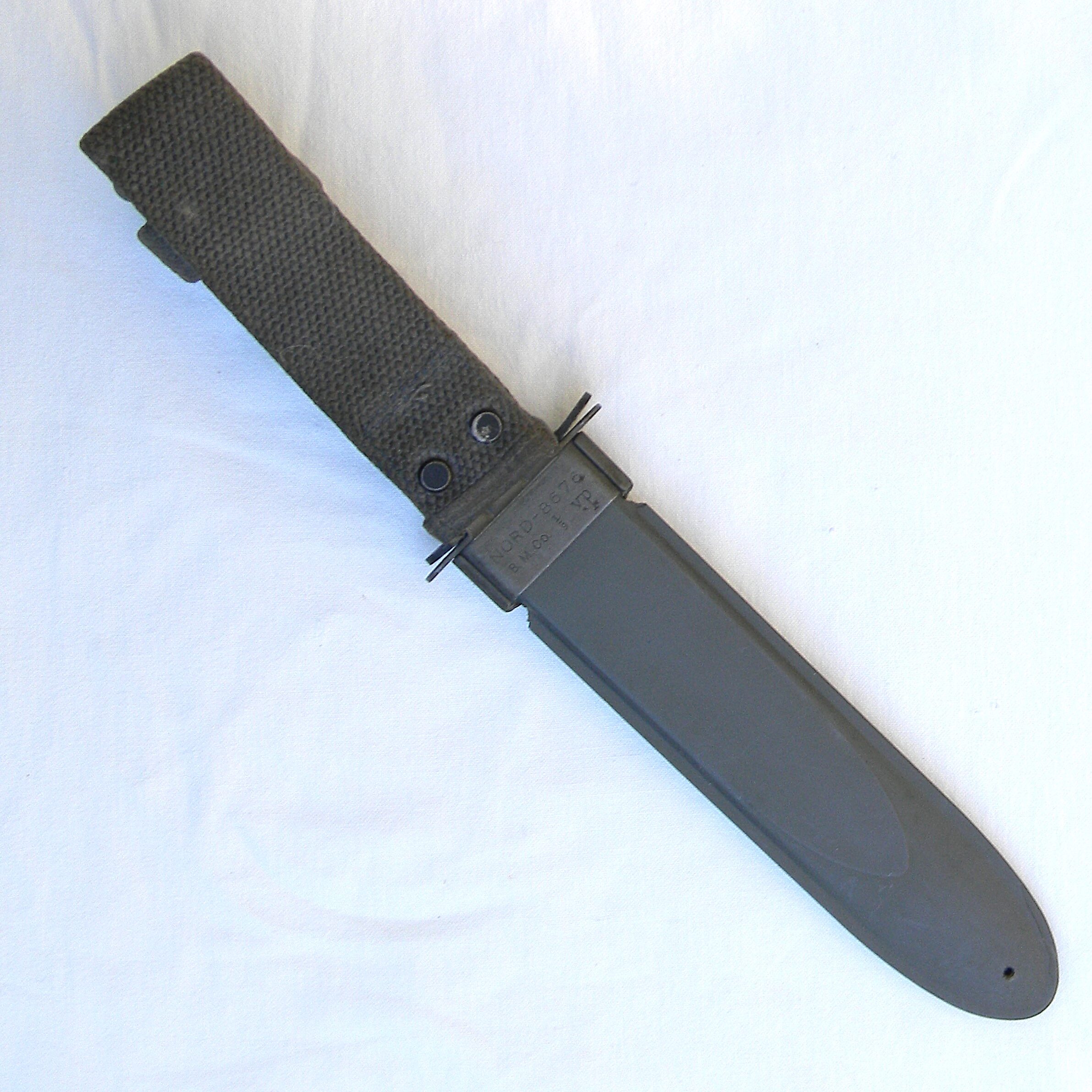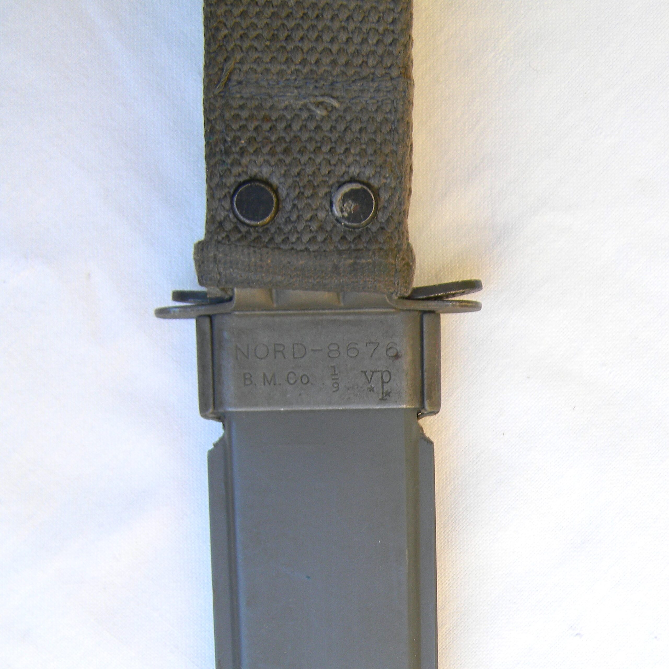 Original “navy-gray” NORD composition scabbard was made by Victory Plastics division of Beckwith Manufacturing (B.M. Co.). The numbers on the back of the throat indicate delivery date to the Navy as March 1945. The scabbard is in excellent overall condition with all of the original “navy gray” finish intact; no stains on the webbing; original keeper is intact. Over 90 years later this MK2 and original scabbard are in 100% serviceable condition still.