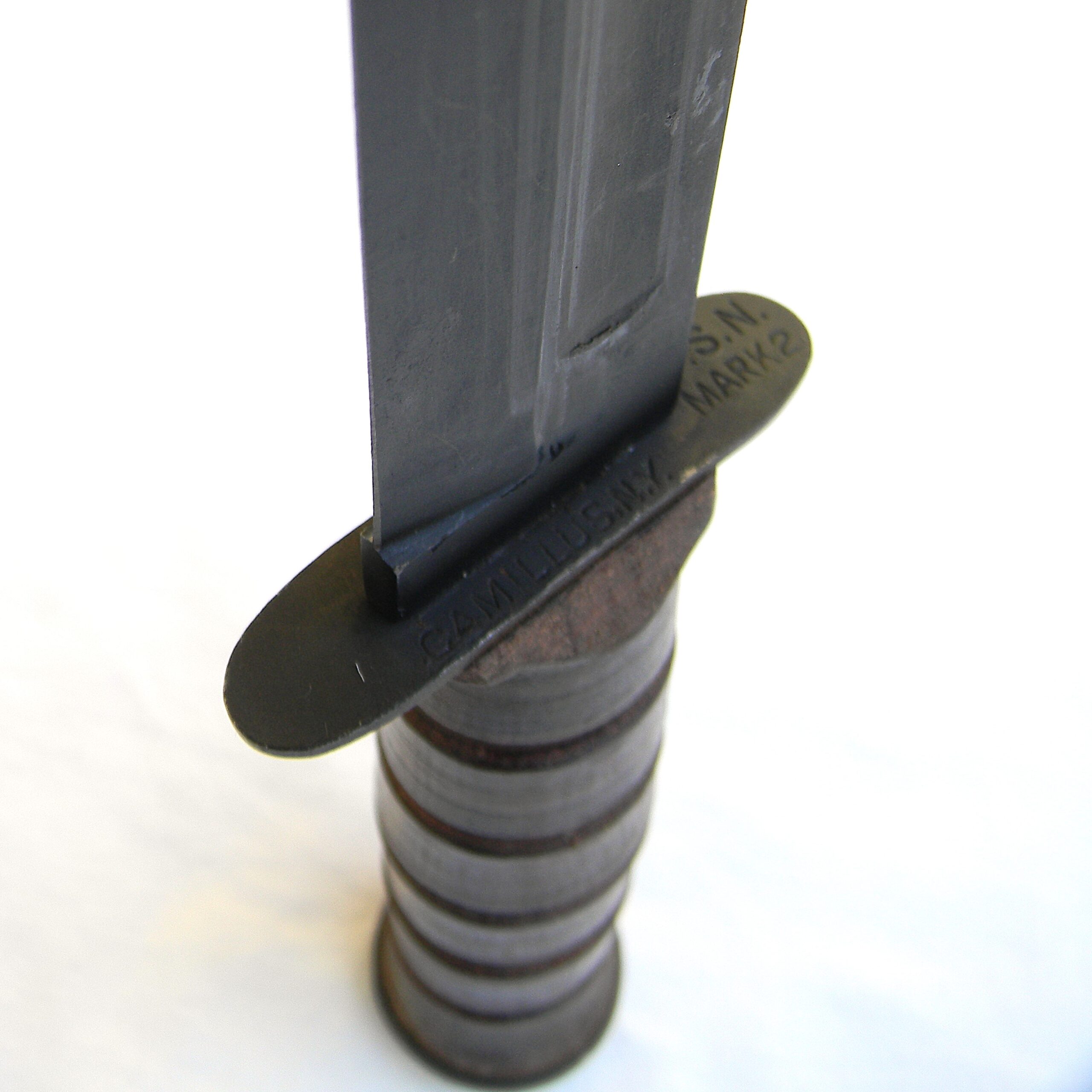 This is the “guard-marked” type with a plain unmarked ricasso. The guard is stamped CAMILLUS, N.Y. and U.S.N. / MARK 2 on the guard’s top side. The knife is about 12″ / 30.5 cm overall; blued blade is about 7″ / 17.8 cm. The blade has not been re-sharpened; original factory edge is razor-sharp. No contact marks on the spine or the edge, the tip is intact. Stacked leather washers handle with a heavy round pommel and slightly curved guard; all parts are perfectly tight with no play. The pommel is excellent with no typical ding marks; the guard is solid with no play. Leather washers are nice and tight with no damage.