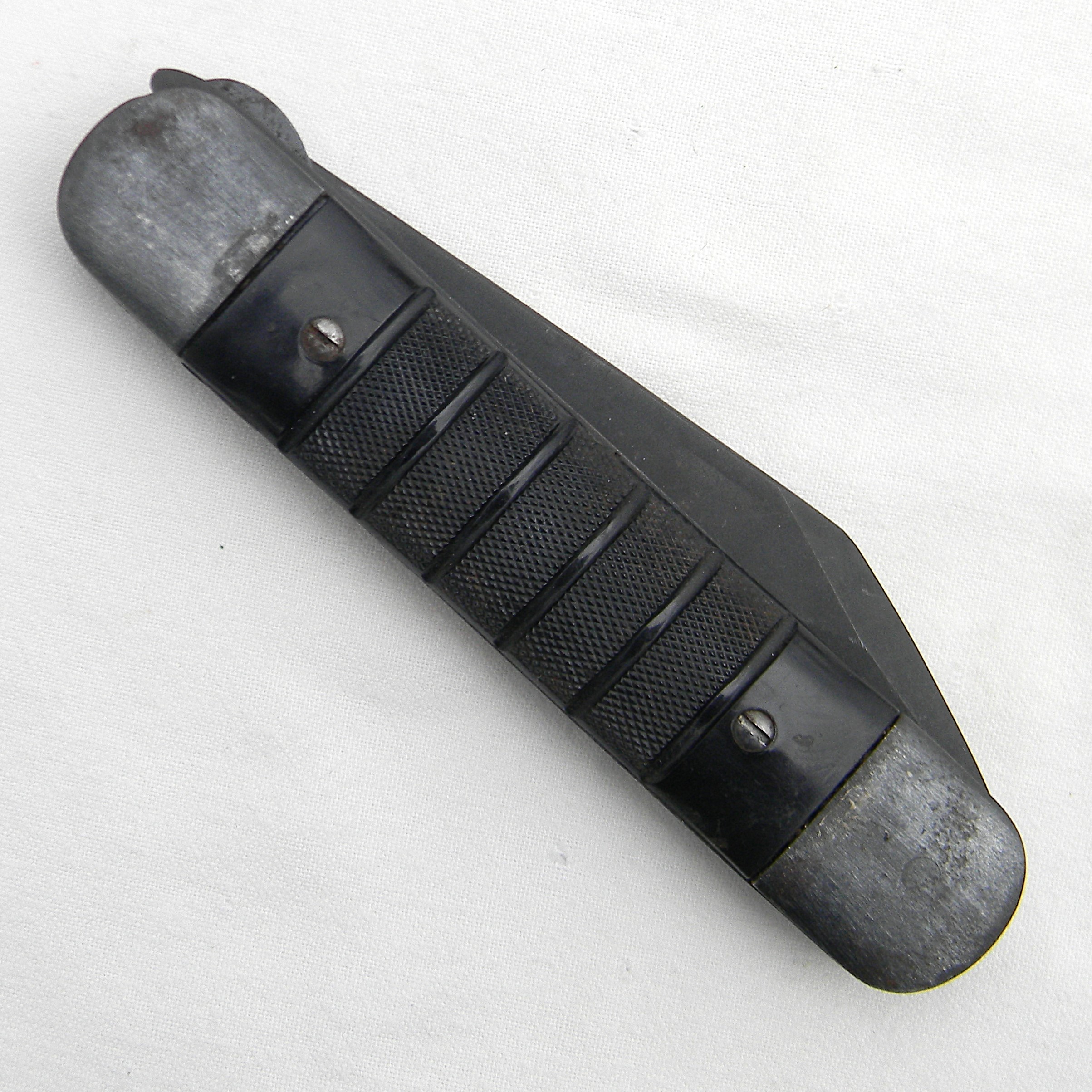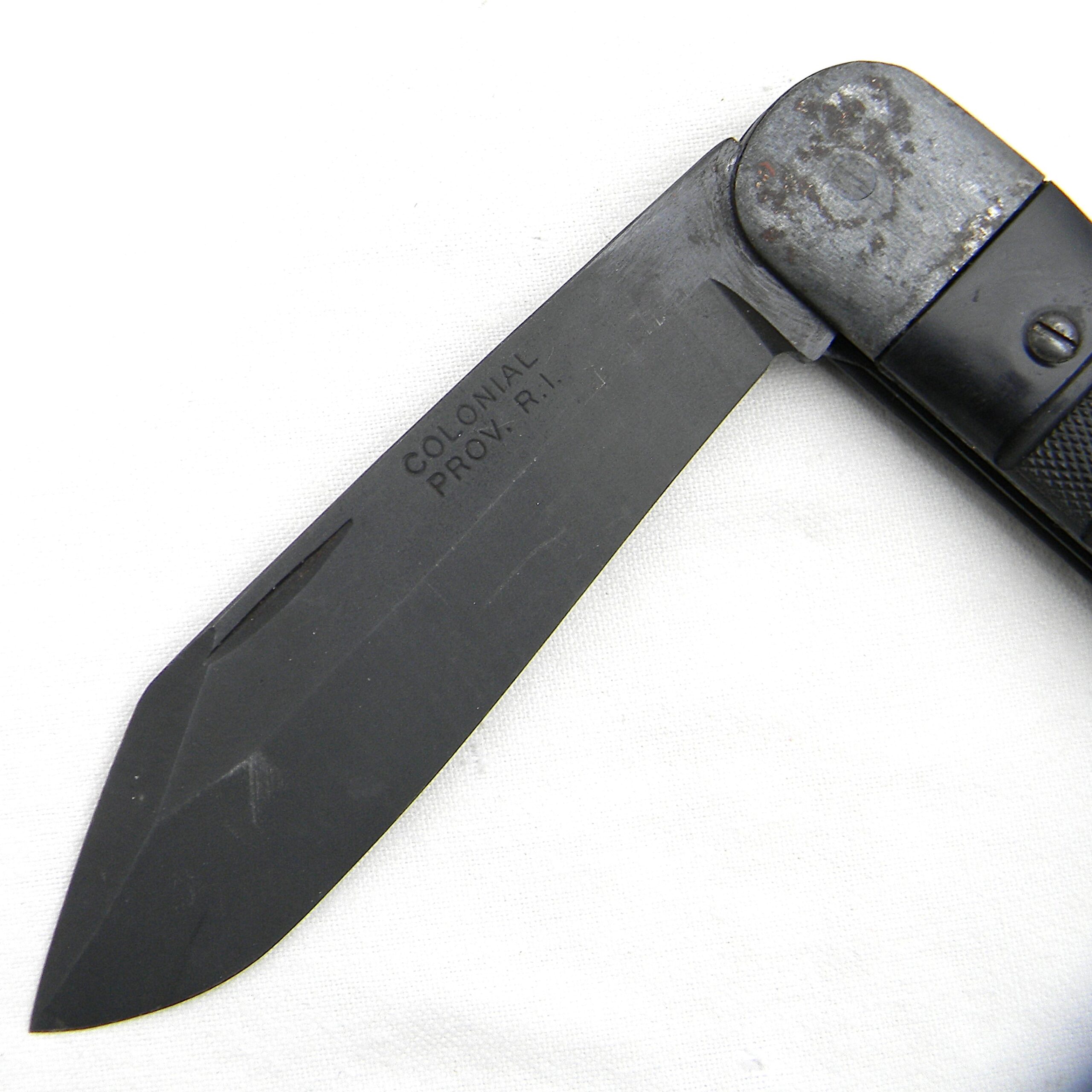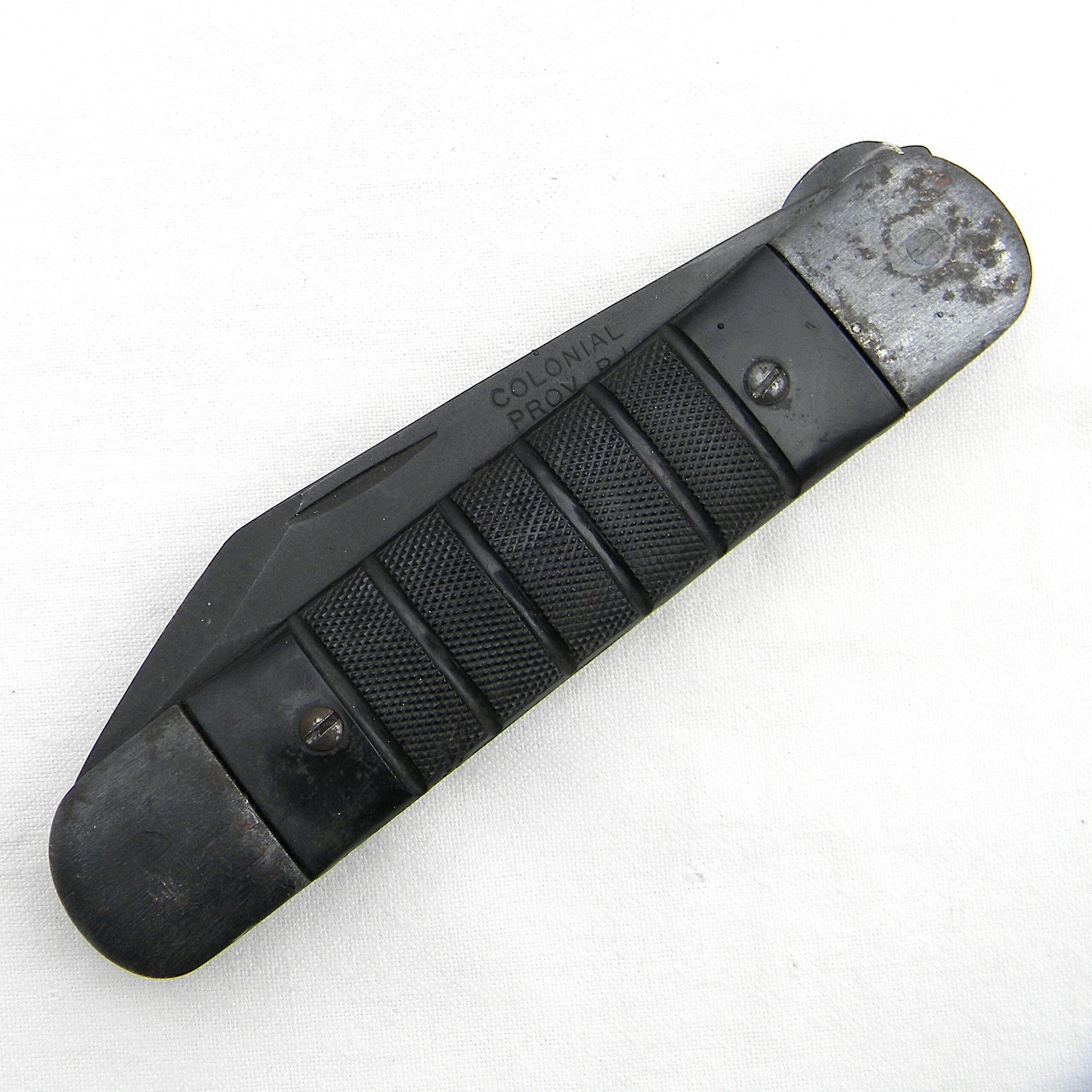 The knife is about 6″ / 15.3 cm closed; large heavy-duty clip point blade is about 4-3/4″ /12 cm; it locks well with no play. COLONIAL / PROV. R.I. is sharply struck on the side of the blade; the saw blade is unmarked as intended. Black plastic handle scales are in excellent overall condition with no cracks, chips, or typical contact marks. The saw blade is intact ; it’s very sharp still. This big boy is not your typical pocket knife a bit over 6″ long even when closed and weighs about 13 oz / 360 grams. This old-timer is in 100% serviceable condition still; with proper it will last you another 85 years 😉