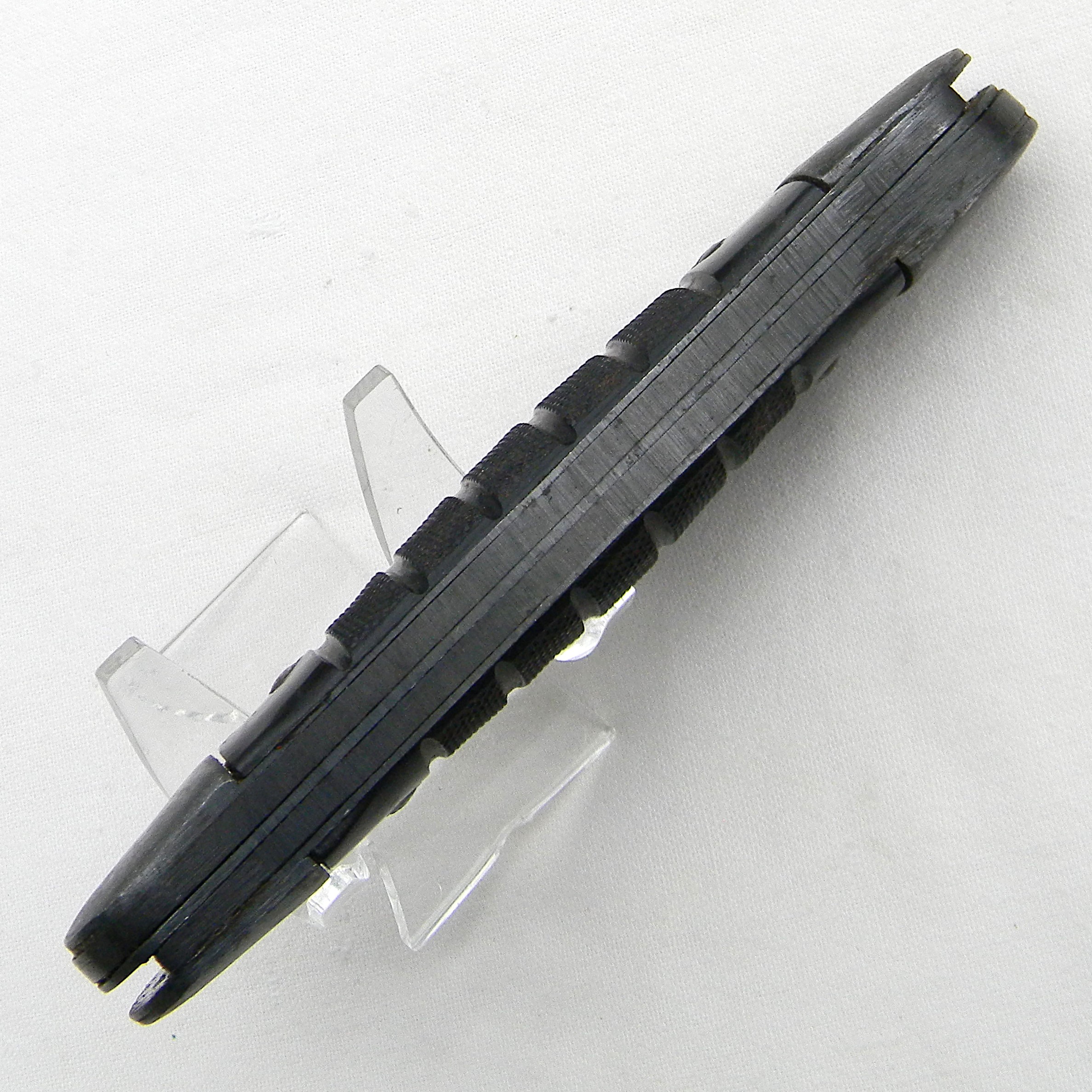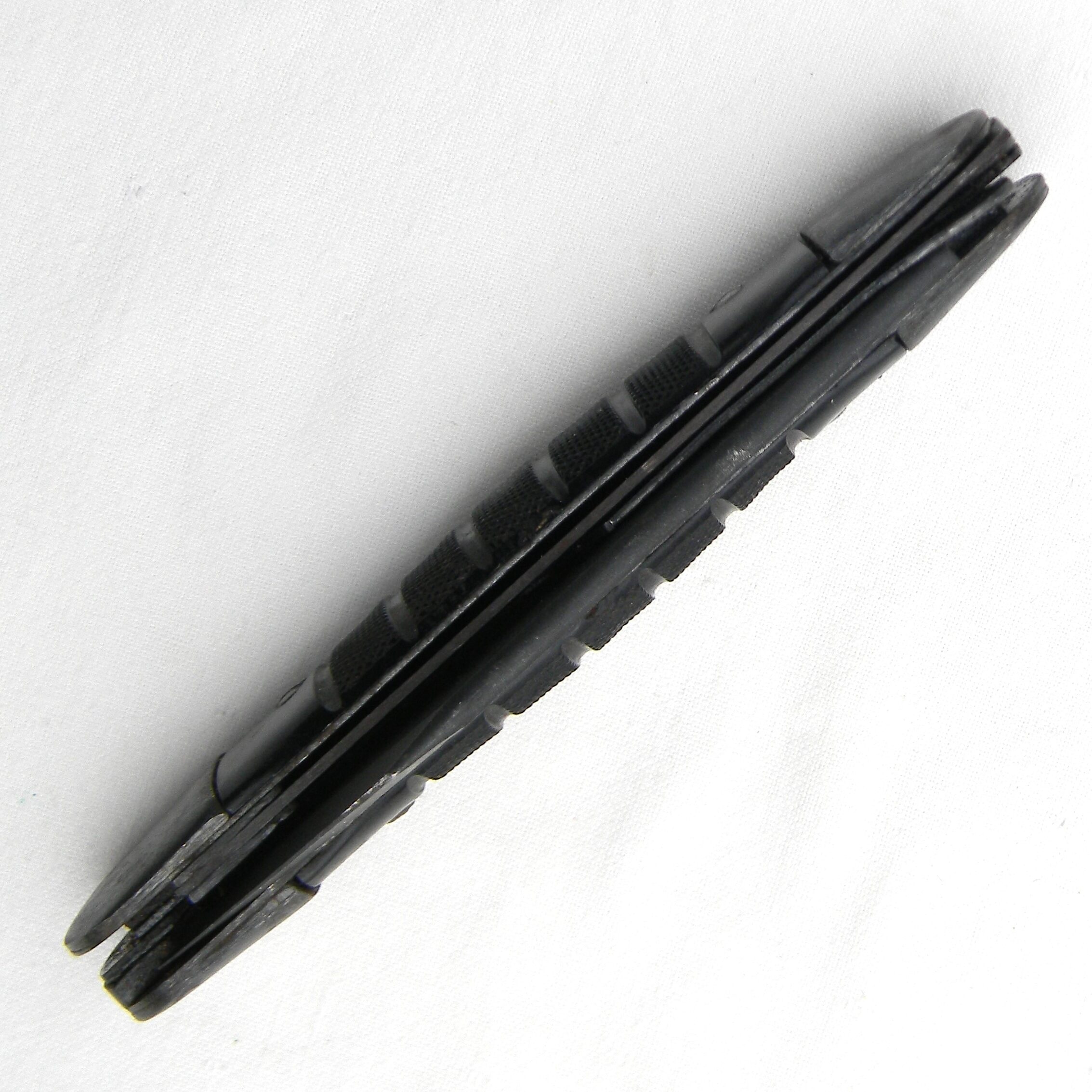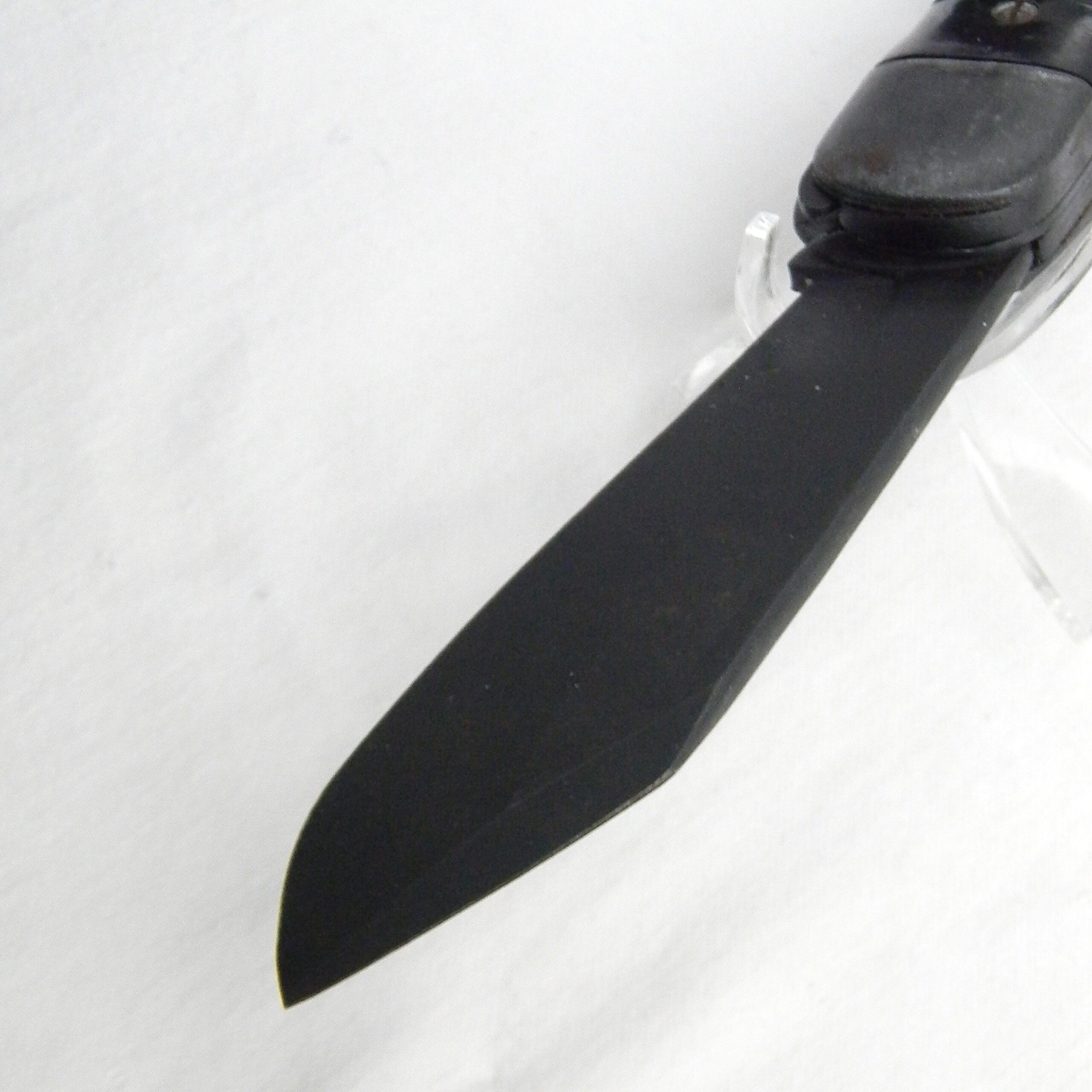 The knife is about 6″ / 15.3 cm closed; large heavy-duty clip point blade is about 4-3/4″ /12 cm; it locks well with no play. COLONIAL / PROV. R.I. is sharply struck on the side of the blade; the saw blade is unmarked as intended. Black plastic handle scales are in excellent overall condition with no cracks, chips, or typical contact marks. The saw blade is intact ; it’s very sharp still. This big boy is not your typical pocket knife a bit over 6″ long even when closed and weighs about 13 oz / 360 grams. This old-timer is in 100% serviceable condition still; with proper it will last you another 85 years 😉