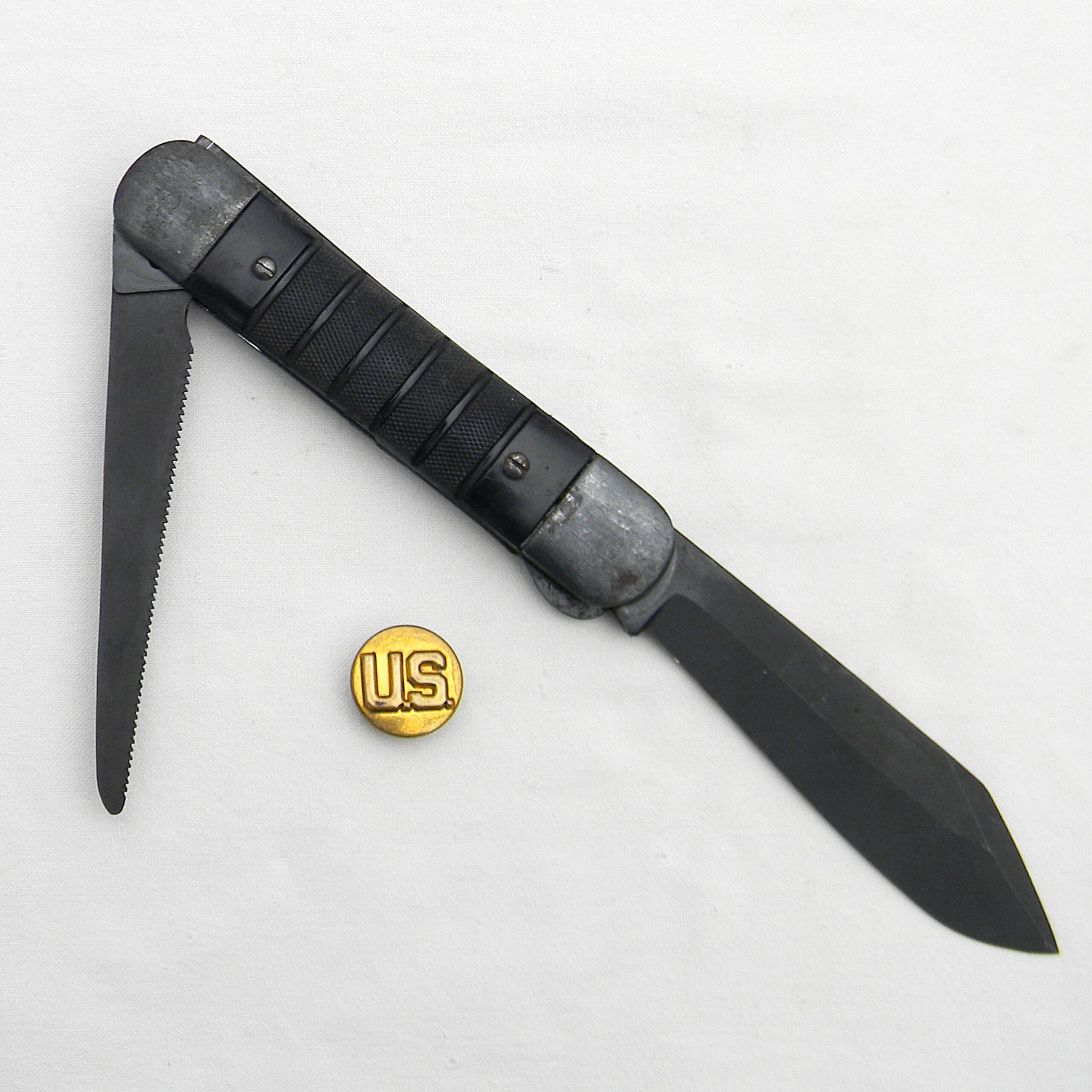 Extra-large WW2 era “Jumbo Jack” folder from the US Navy and Army Air Corps survival kits in extremely hard-to-find UNUSED condition. See reference photos of the complete layout of one of such WW2 era survival kits attached. These extra-large folders are almost impossible to find in unused condition these days, especially rust-free and with original finish intact. This specimen was manufactured by Colonial Cutlery in Providence, Rhode island. This type is illustrated on page 188 of KNIVES OF THE UNITED STATES MILITARY WORLD WAR II book by Michael W Silvey – a well-established expert and the author of a number of books on the subject of the US military edged weapons (see book’s page scan attached).