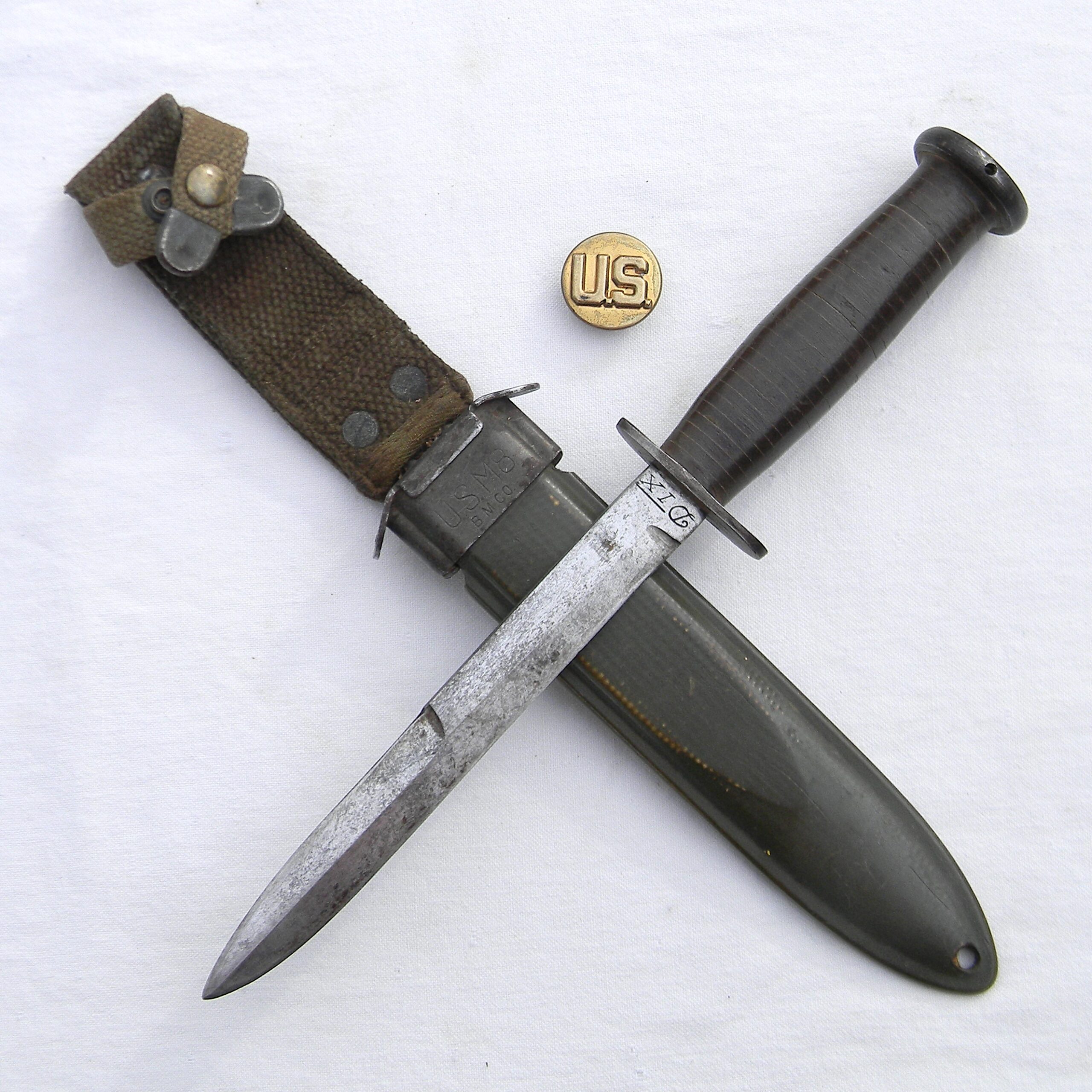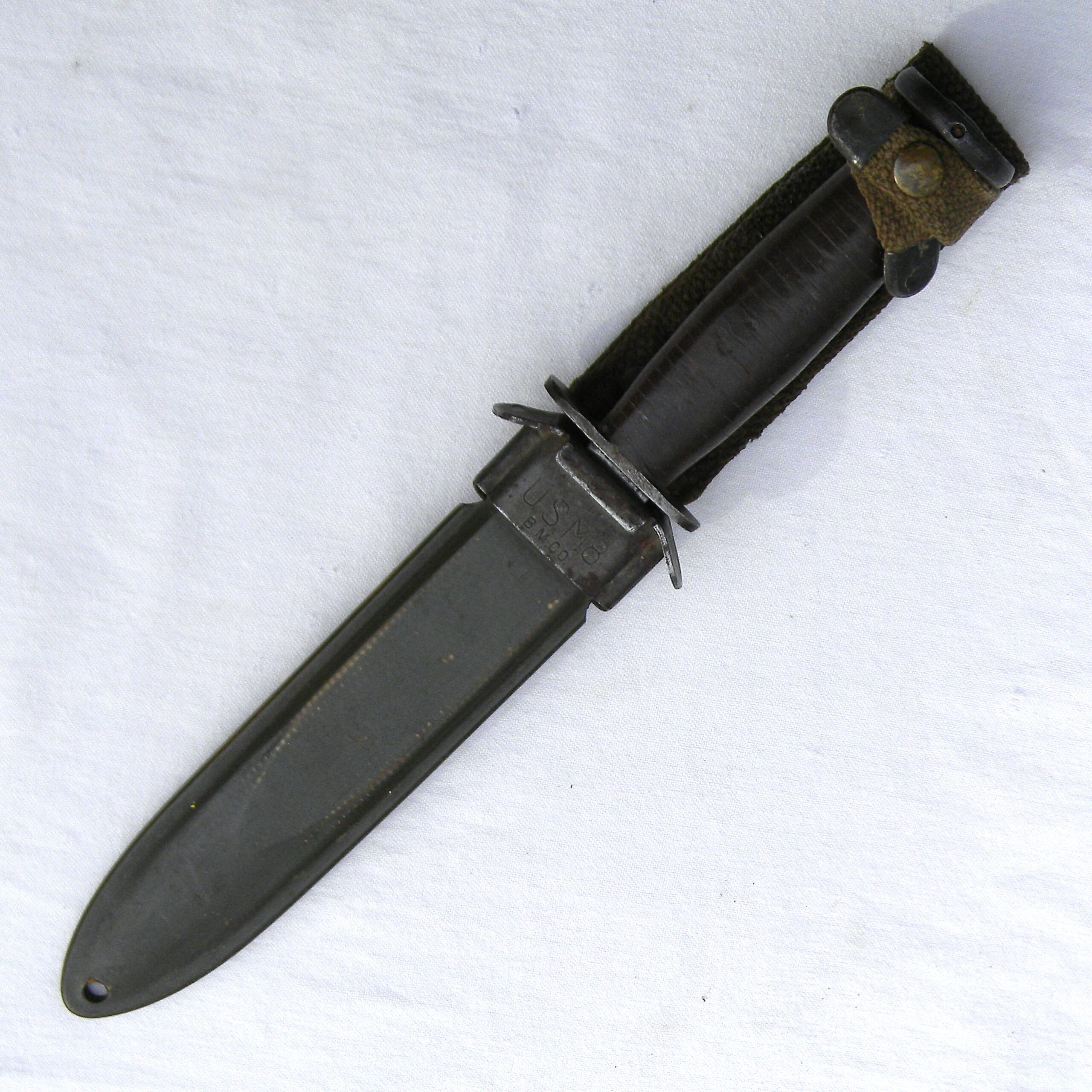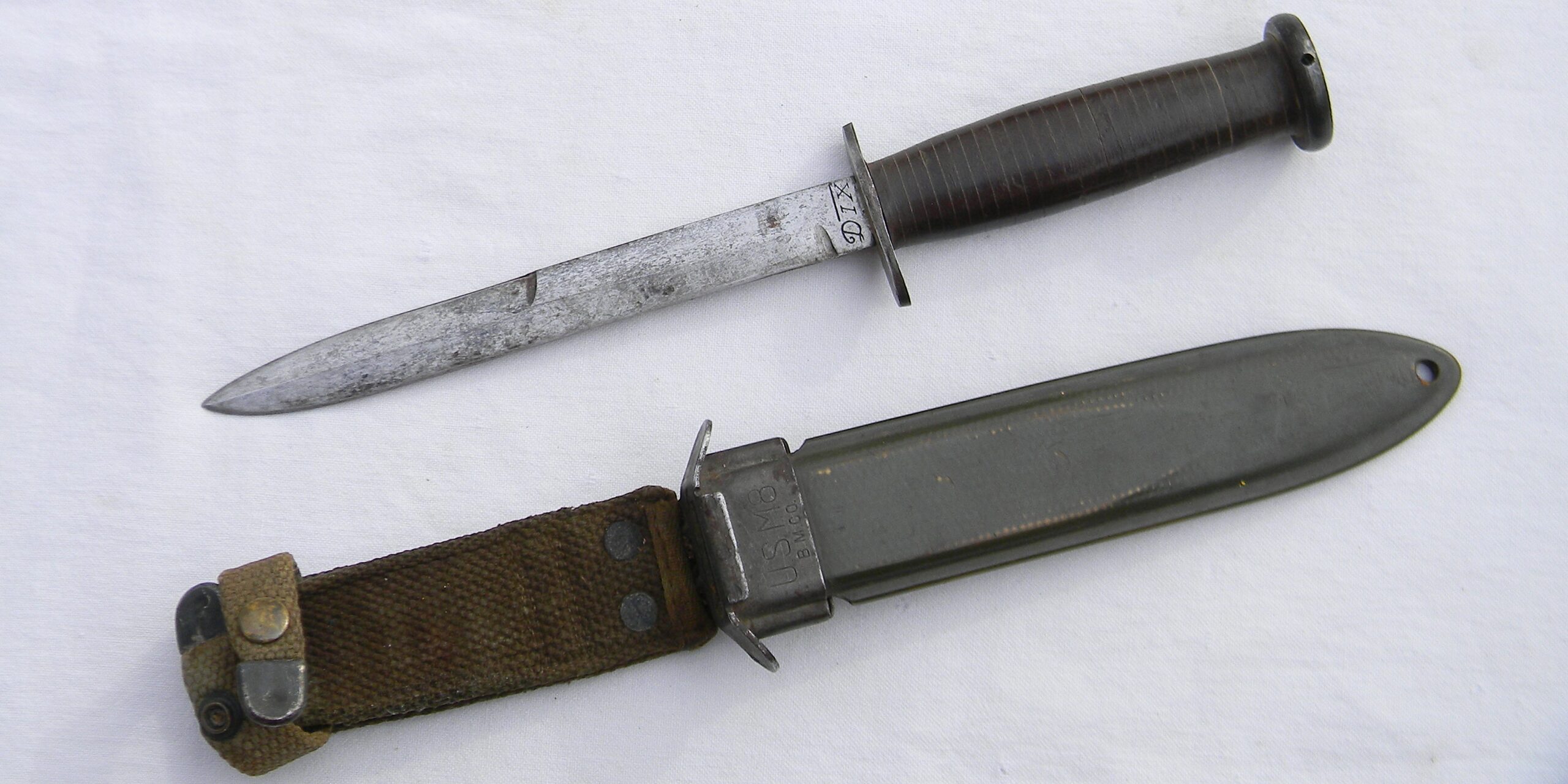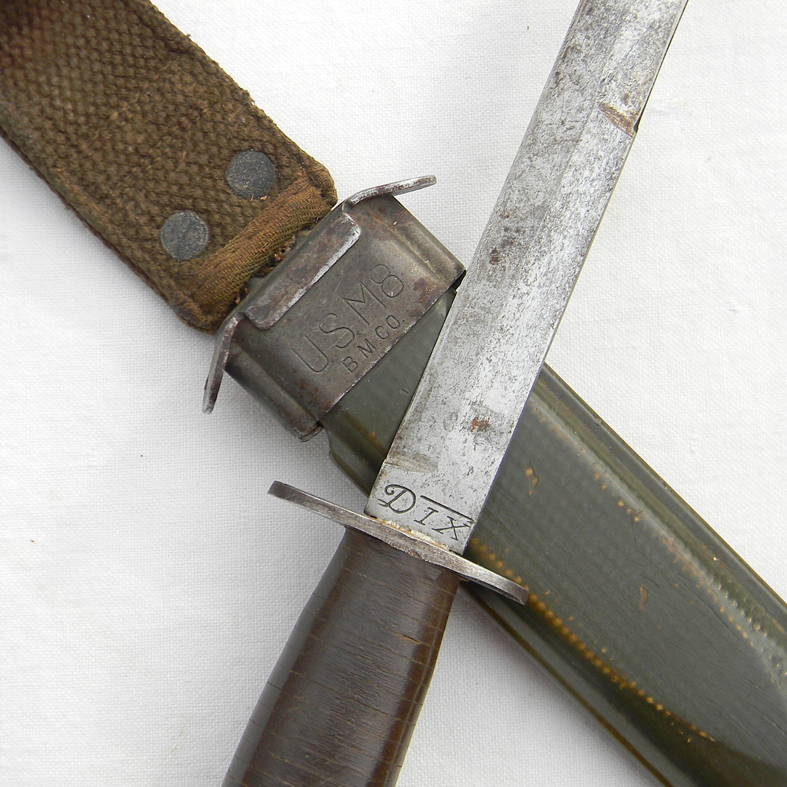 WW2 Dix fighting knife, 6.5-inch M3 style blade, original M8 composition scabbard. Very rare American “private purchase” type fighter in excellent overall condition, considering the age. FREE USPS PRIORITY MAIL SHIPPING WITHIN THE U.S. FOR THIS ITEM!