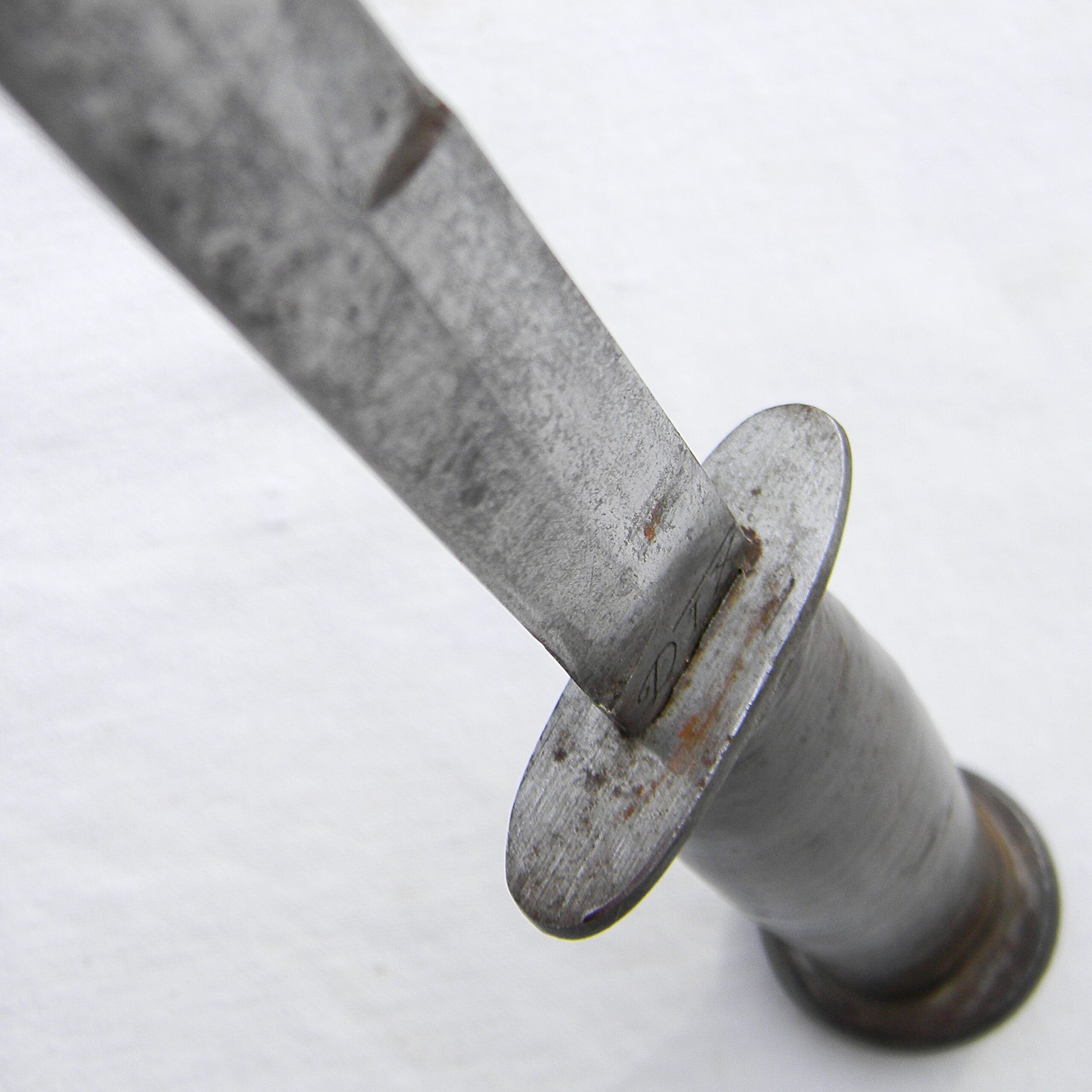 The knife is about 11″ / 28 cm overall; the blade is about 6-1/2″ / 16.5 cm long; the edge is very sharp still; the tip is intact. Stacked leather washers handle with large pinned round iron pommel and steel guard. The handle is solid; all parts are tight; the guard has a tiny bit of a play. Original WW2 era M8 composition scabbard is in excellent overall condition as well. With proper care this WW2 Dix fighting knife will last you another 85 years 😉