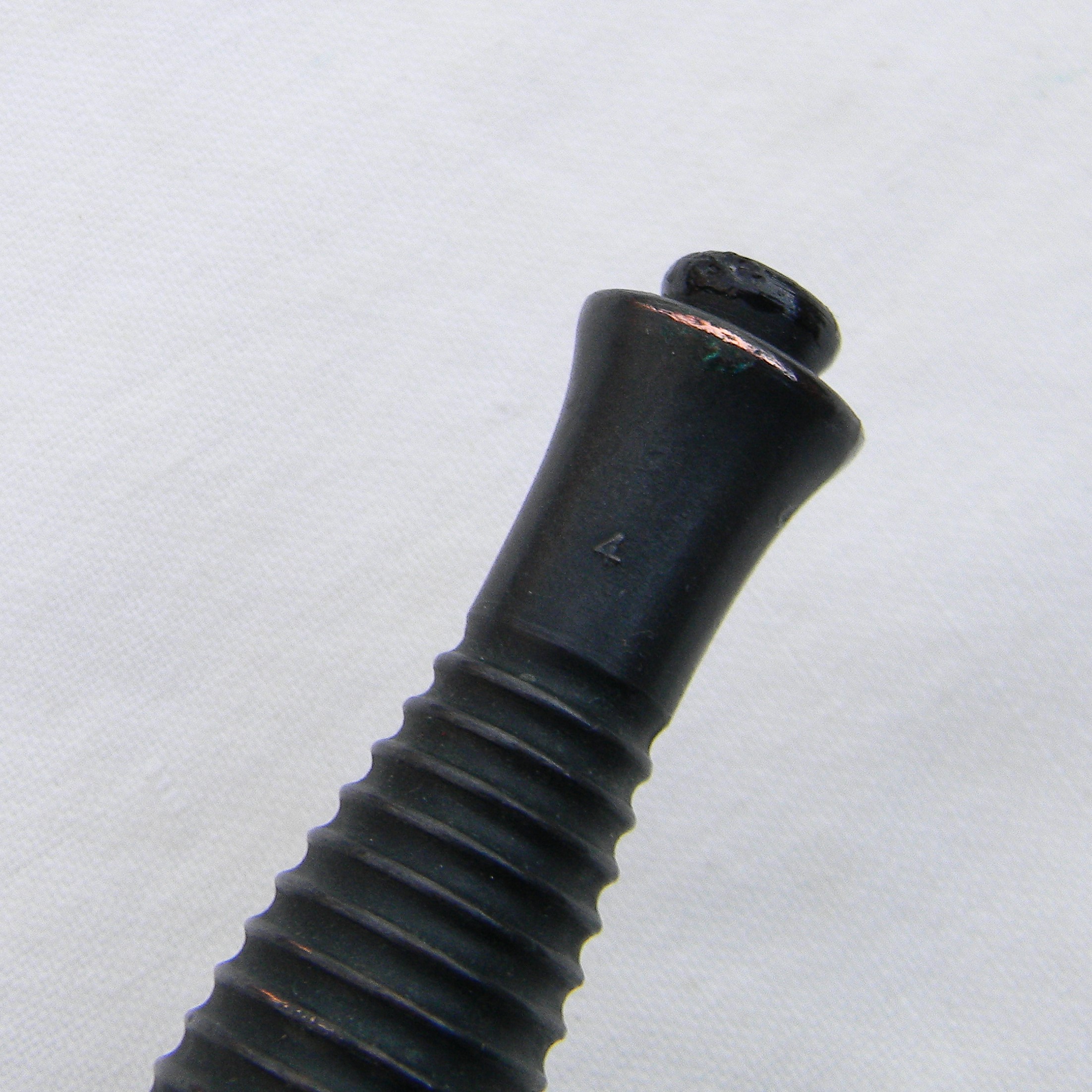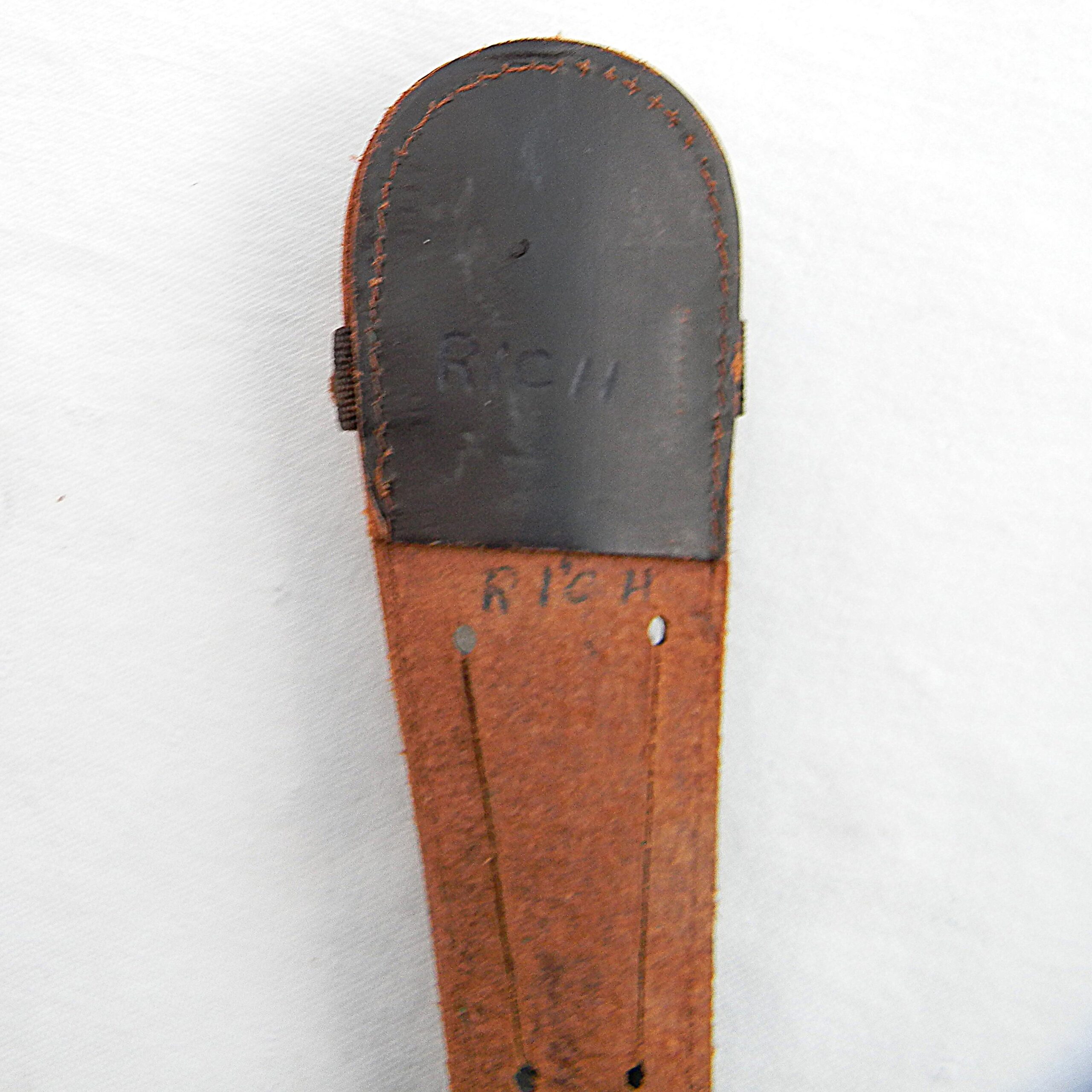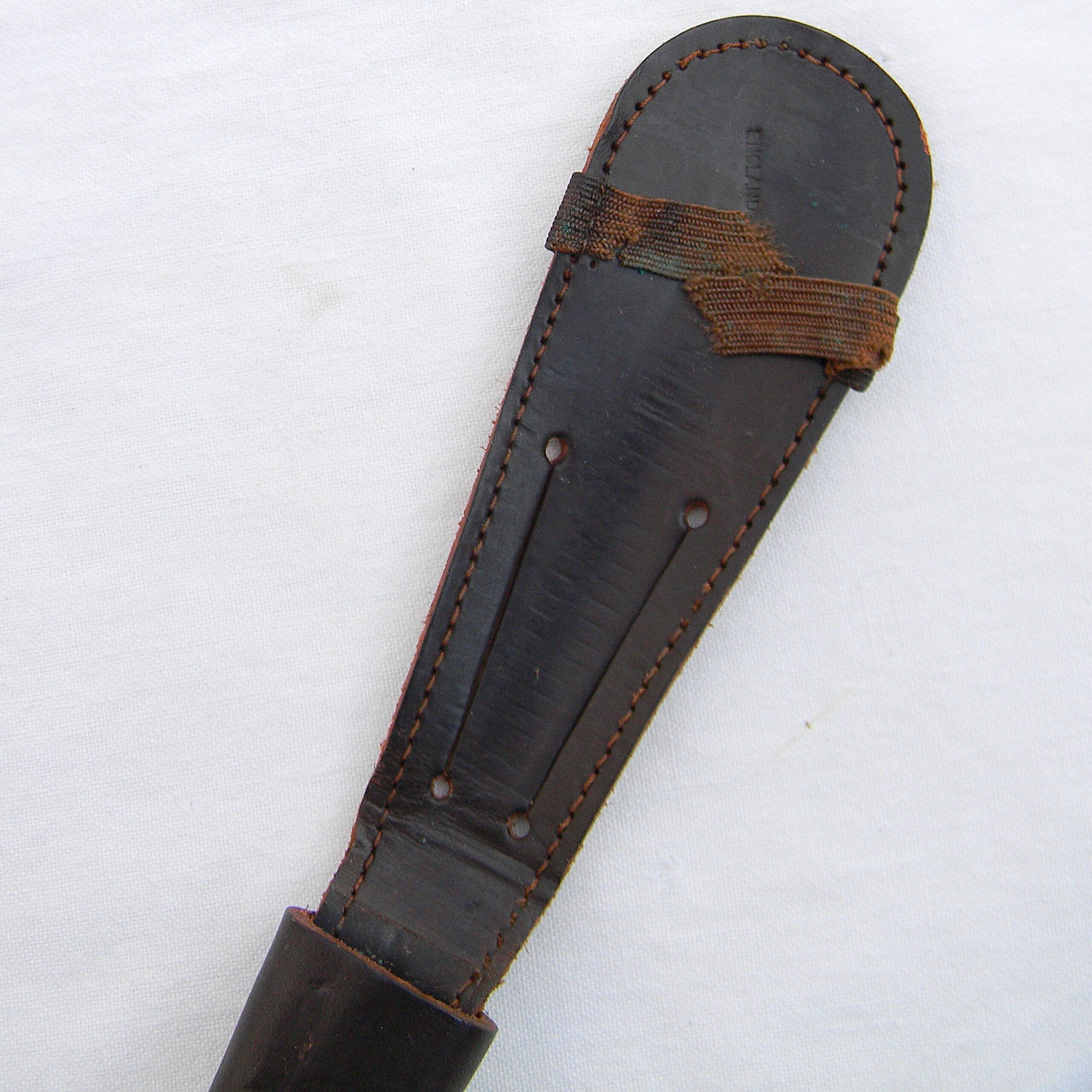 This WW2 Fairbairn-Sykes dagger is only lightly used; it is in better-than-average condition for the type; it’s a great-looking combat specimen. The blade is very sharp with no edge damage; grooved cast handle with a thick iron double-guard and a bronze lug nut for the pommel. The pommel is marked with number 4, indication one of the first molds used in the production. Vise marks on the lug nut indicate Wilkinson Sword production. The underside of the guard is marked ENGLAND on one side and 42 / “broad arrow” proof mark on the other. All parts are solid with no play. This 3rd pattern dagger is about 11-5/8″ / 29.5 cm overall; the blade is about 6-7/8″ / 17.5 cm; the tip is intact; about 99% of the original “gun-gray” blade bluing remaining. Original leather scabbard is in great shape overall, considering the age. Leather “wings” are intact; the belt hanger is in excellent shape with no damage; the back side of the hanger is signed RICH. The elastic retention strap is broken – typical for this type of a scabbard. Original metal scabbard’s tip is in excellent condition with no play. The throat is intact; no typical cuts or “puncture wounds” – this type is rare this nice. Don’t miss your chance to add this original WW2 British Fairbairn Sykes FS dagger to your collection!