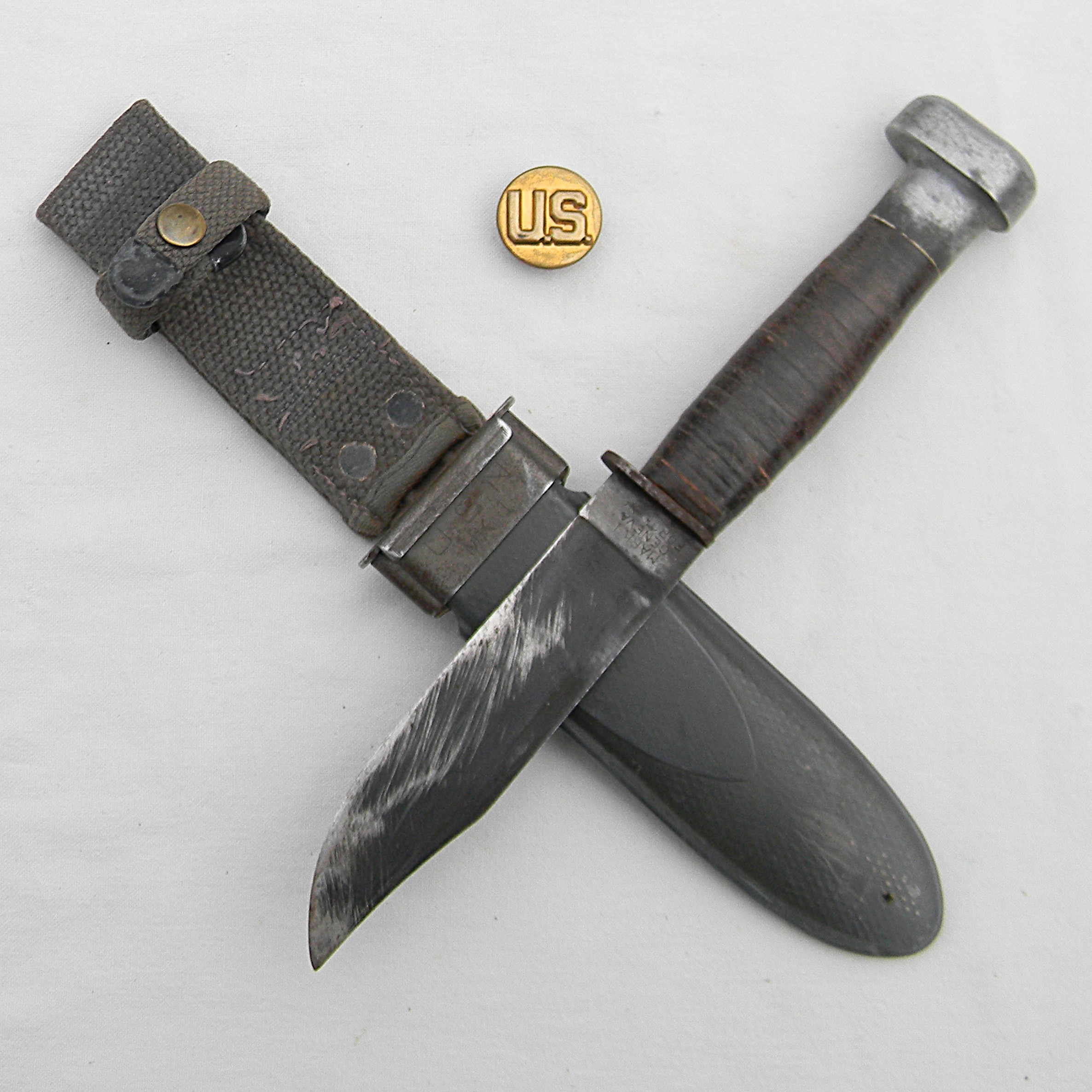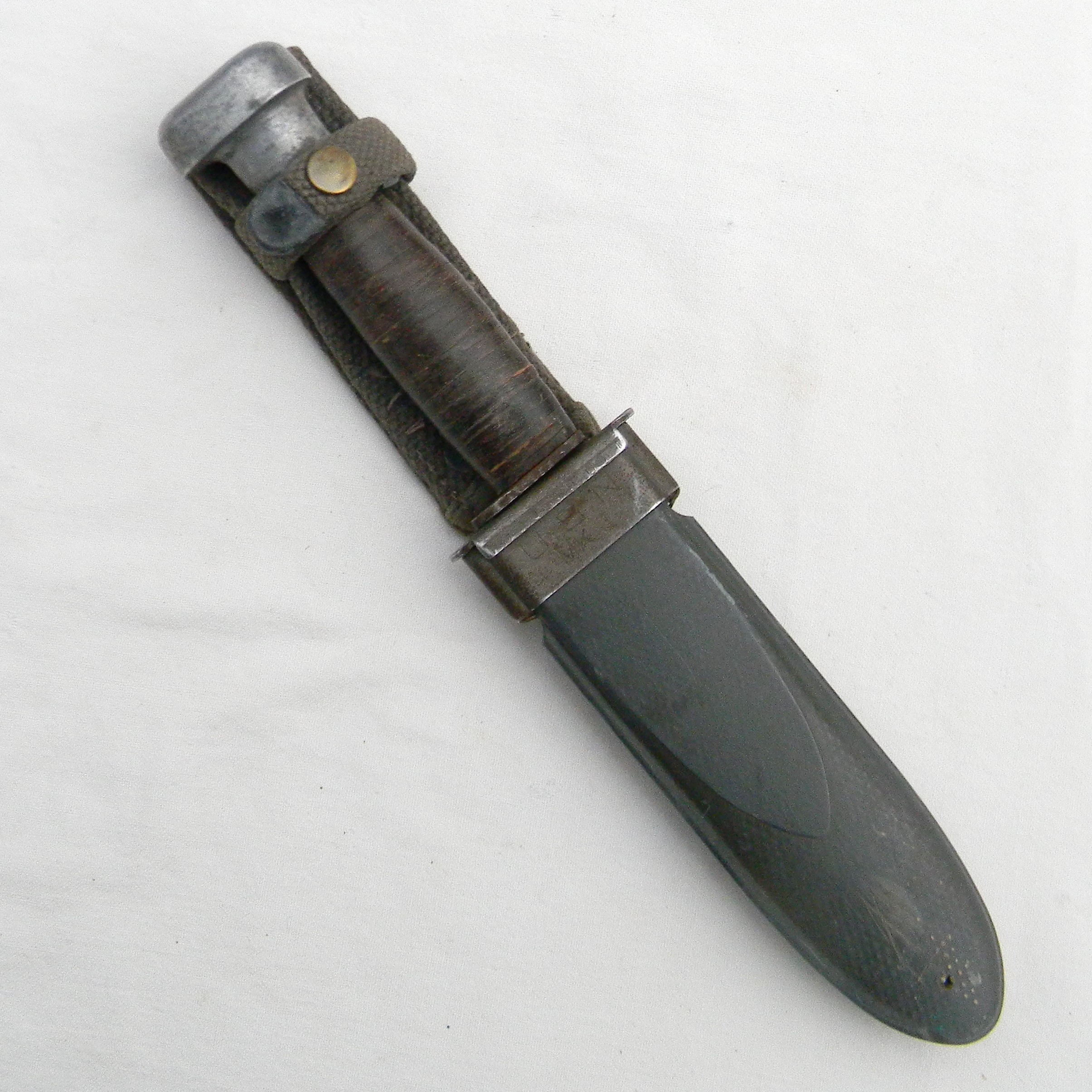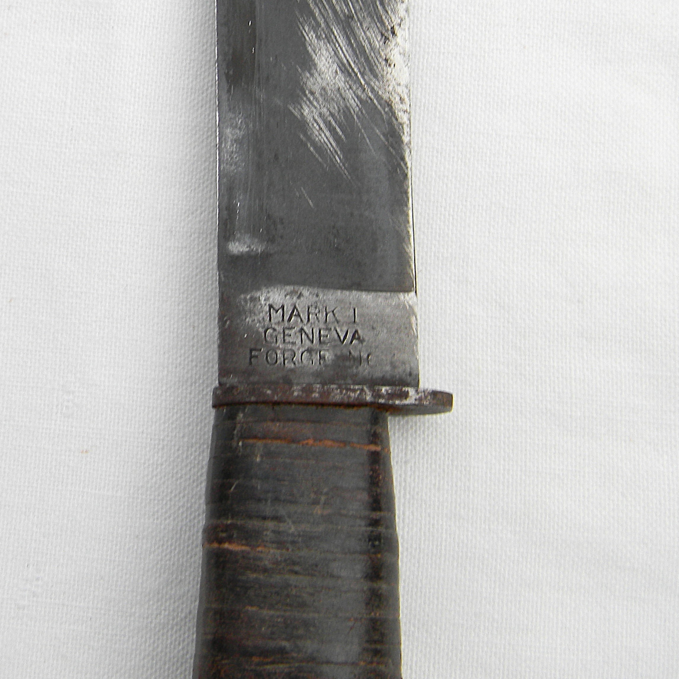 Original World War II era US Navy early issue of Mark I Utility Knife manufactured early in the war by Geneva Forge Inc – a scarce maker. Early “large aluminum pommel” Geneva Forge Mark I production – later MK1s had war-expedient wood pommels instead, as aluminum was needed for the aviation industry. This type is illustrated on page 9 in KNIVES OF THE UNITED STATES MILITARY WORLD WAR II book by Michael W. Silvey – a well-established expert an author of many books on the subject of US military edged weapons (see the scan attached). Relatively common type, but hard in good condition since most of the these early MK1 knives were used as intended, were broken, lost, or fell apart from contact with salt water.