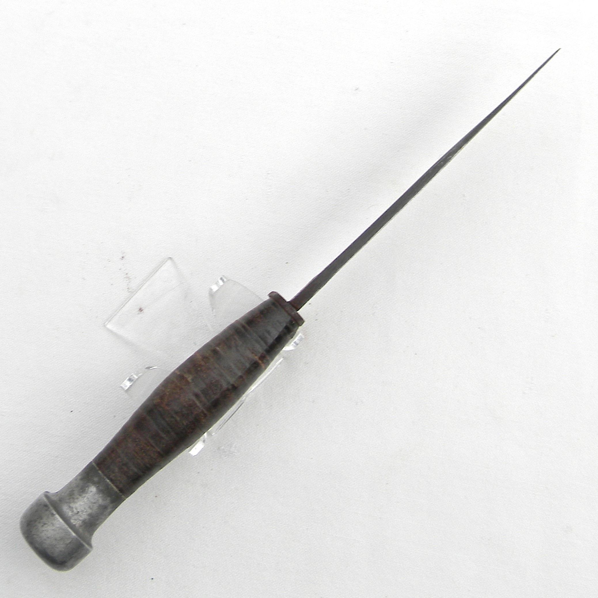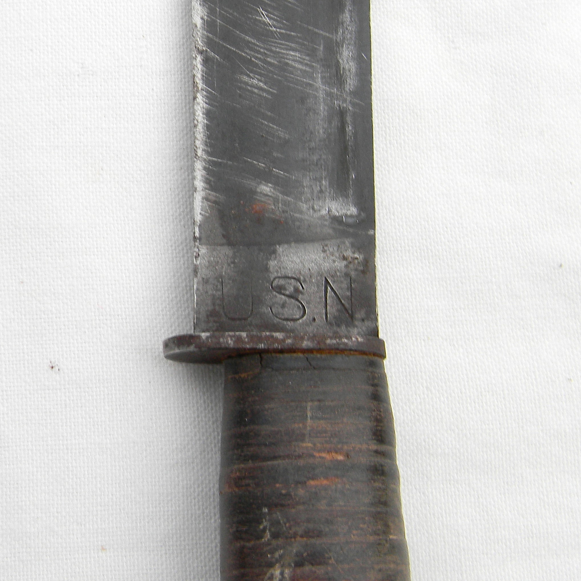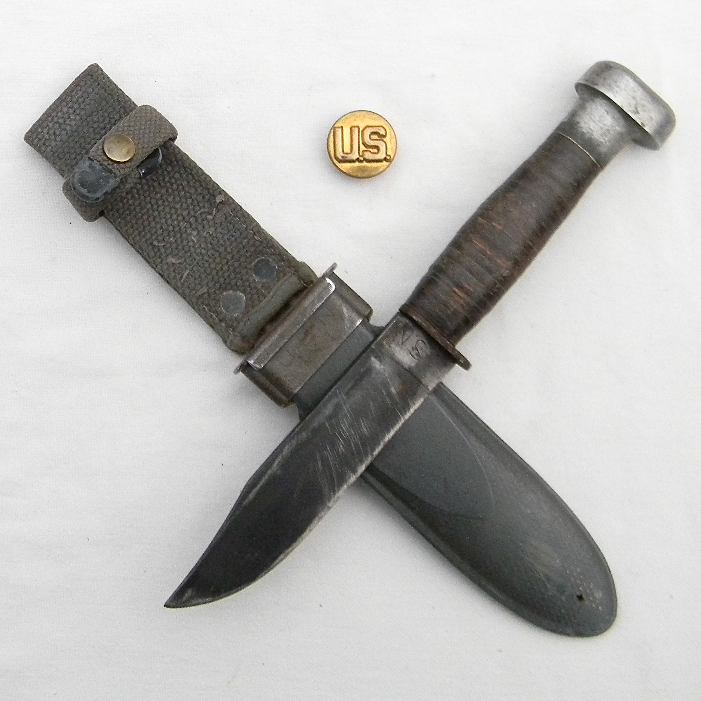 Original World War II era US Navy early issue of Mark I Utility Knife manufactured early in the war by Geneva Forge Inc – a scarce maker. Early “large aluminum pommel” Geneva Forge Mark I production – later MK1s had war-expedient wood pommels instead, as aluminum was needed for the aviation industry. This type is illustrated on page 9 in KNIVES OF THE UNITED STATES MILITARY WORLD WAR II book by Michael W. Silvey – a well-established expert an author of many books on the subject of US military edged weapons (see the scan attached). Relatively common type, but hard in good condition since most of the these early MK1 knives were used as intended, were broken, lost, or fell apart from contact with salt water.
