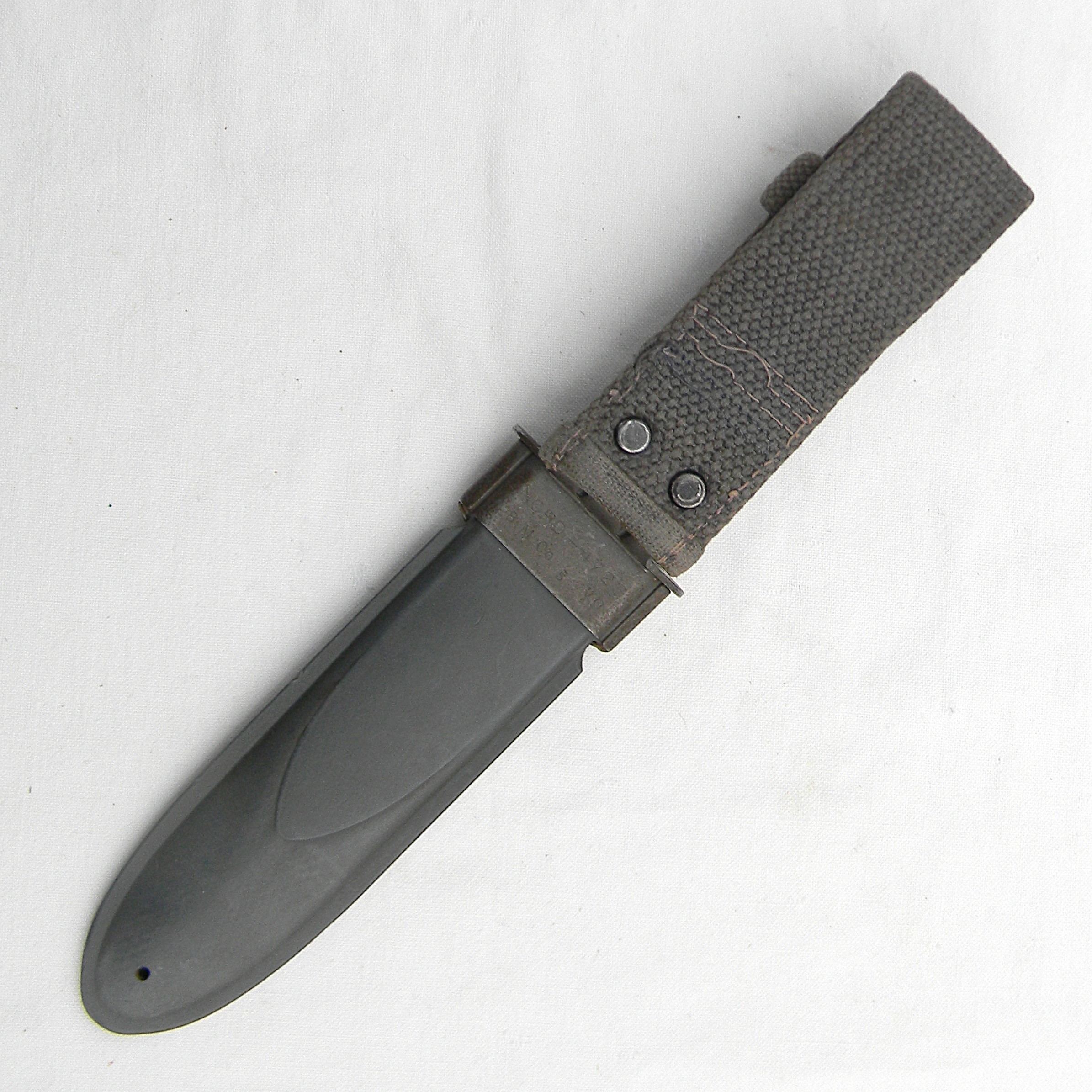 The knife is about 9-3/4″ / 24.8 cm overall; blued blade is about 5-1/8″ / 13 cm. The blade has been re-sharpened, but not harshly; it’s razor-sharp still; the tip is intact; no edge nicks or dings on the spine. Stacked leather washers, iron guard and a solid aluminum pommel handle. No typical contact marks on the pommel; leather washer handle is solid; all parts are tight with no play. Geneva Forge has manufactured the “large aluminum pommel” MK1 for a short time; later issues had plastic or even wood pommels to conserve the much-needed aluminum. Ricasso is stamped MARK 1 / GENEVA / FORGE INC. on one side and U.S.N. on the other. Original USN MK1 marked NORD composition scabbard is in great condition, considering the age – no chips or cracks on the plastic or stains/rust on the webbing. The scabbard was made by Victory Plastics division of Beckwith Manufacturing (B.M. Co.). The numbers on the back of the throat indicate that this scabbard was part of the very first November 1943 delivery to the Navy.
