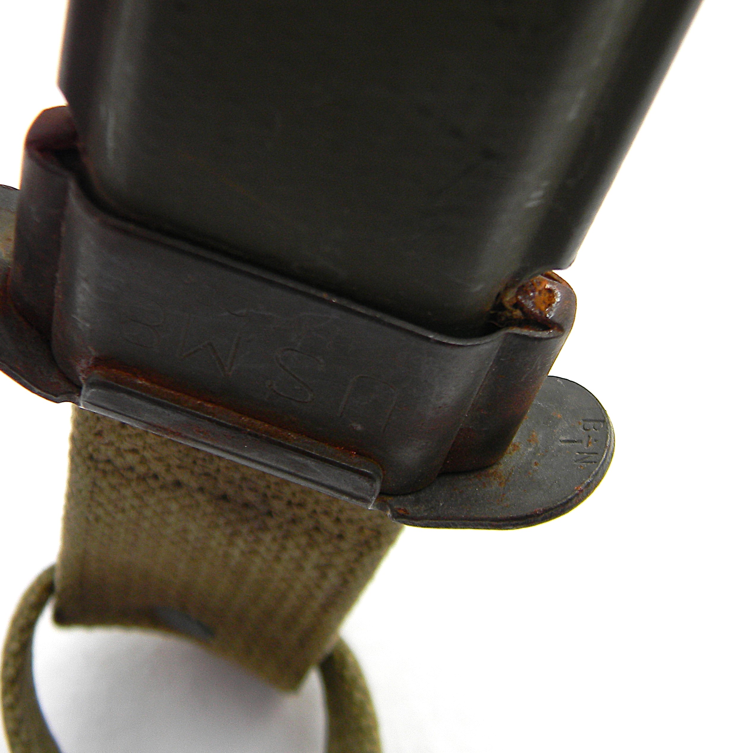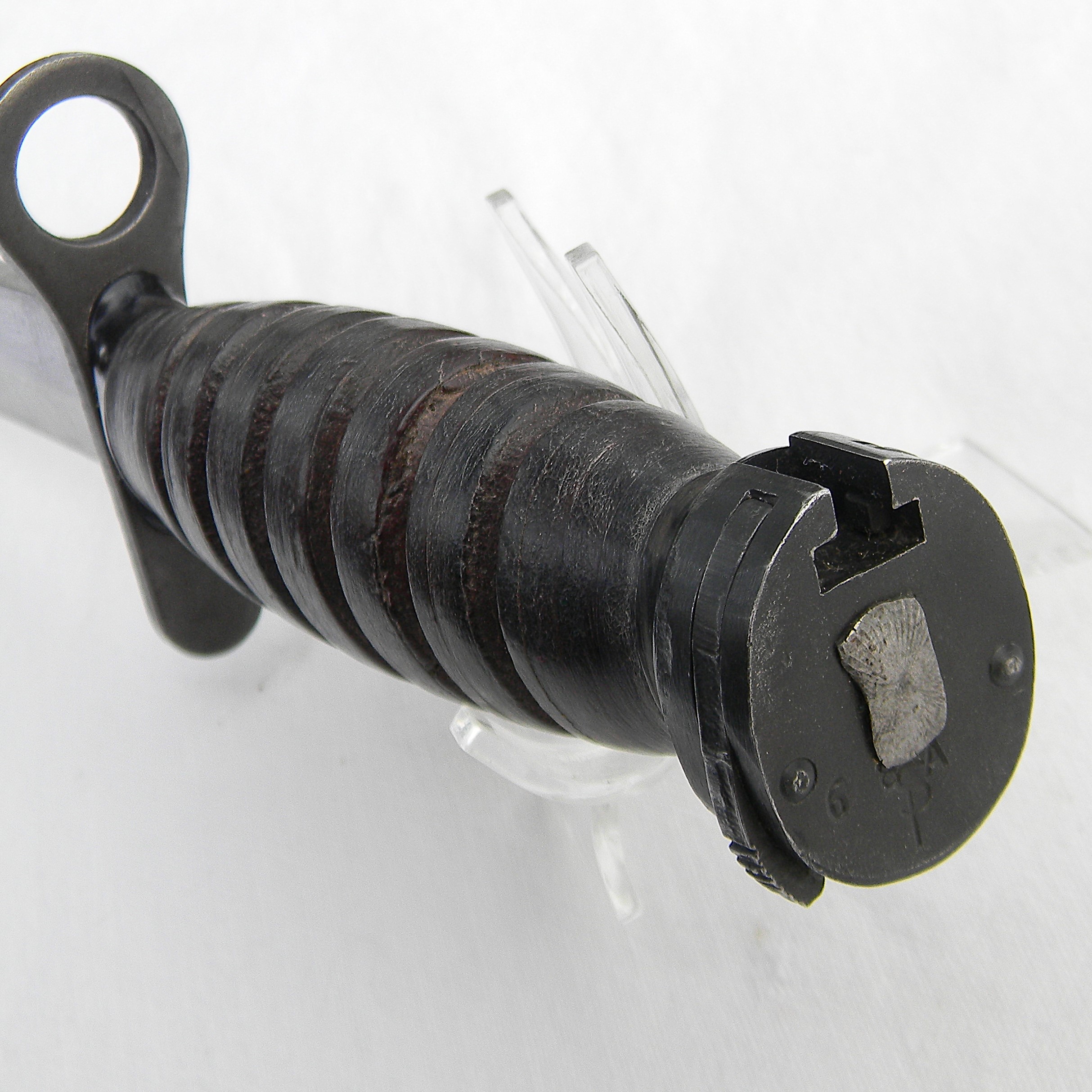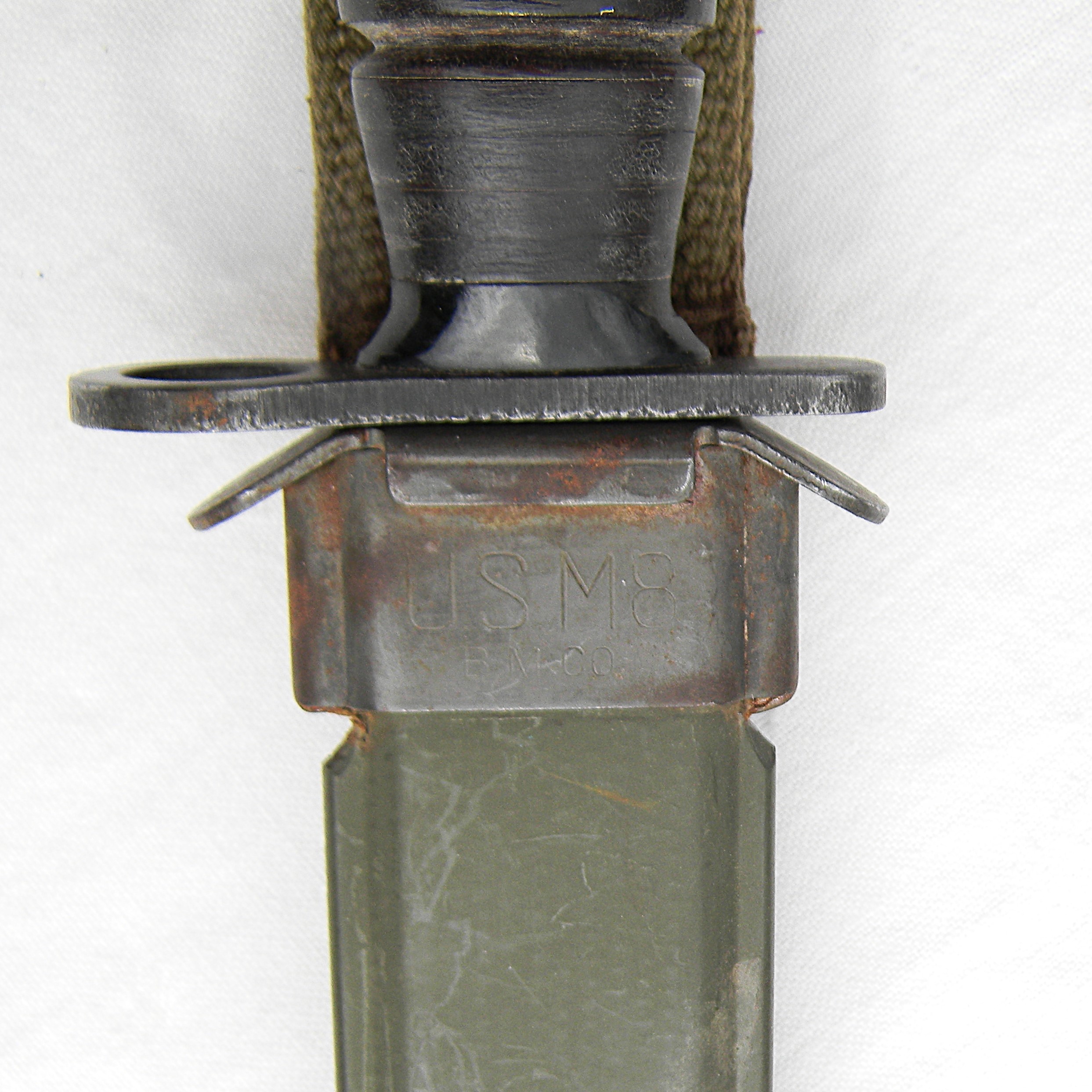 This M4 is about 11-5/8” / 29.5 cm overall; the bright finish blade is about 6-5/6″ / 17 cm long. The blade has been very gently re-sharpened; it is razor-sharp still; the tip is intact. The handle is stacked and grooved leather washers with black Bakelite spacers at the ends and steel muzzle ring & pommel. The muzzle ring is marked with the “flaming bomb” US ordinance mark and U.S. M4 / IMPERIAL stamp on the top. The pommel is excellent with no contact marks; bayonet lock/release is 100% functional; all parts are tight with no play. Original M8 scabbard is in excellent shape as well, considering the age; no dings on the steel throat or cracks/chips on the plastic body. The webbing is intact and rust-free; all original stitching is intact; the keeper is nice and tight. This scabbard was manufactured by Beckwith Mfg Co. (BM CO.) division of Victory Plastics.
