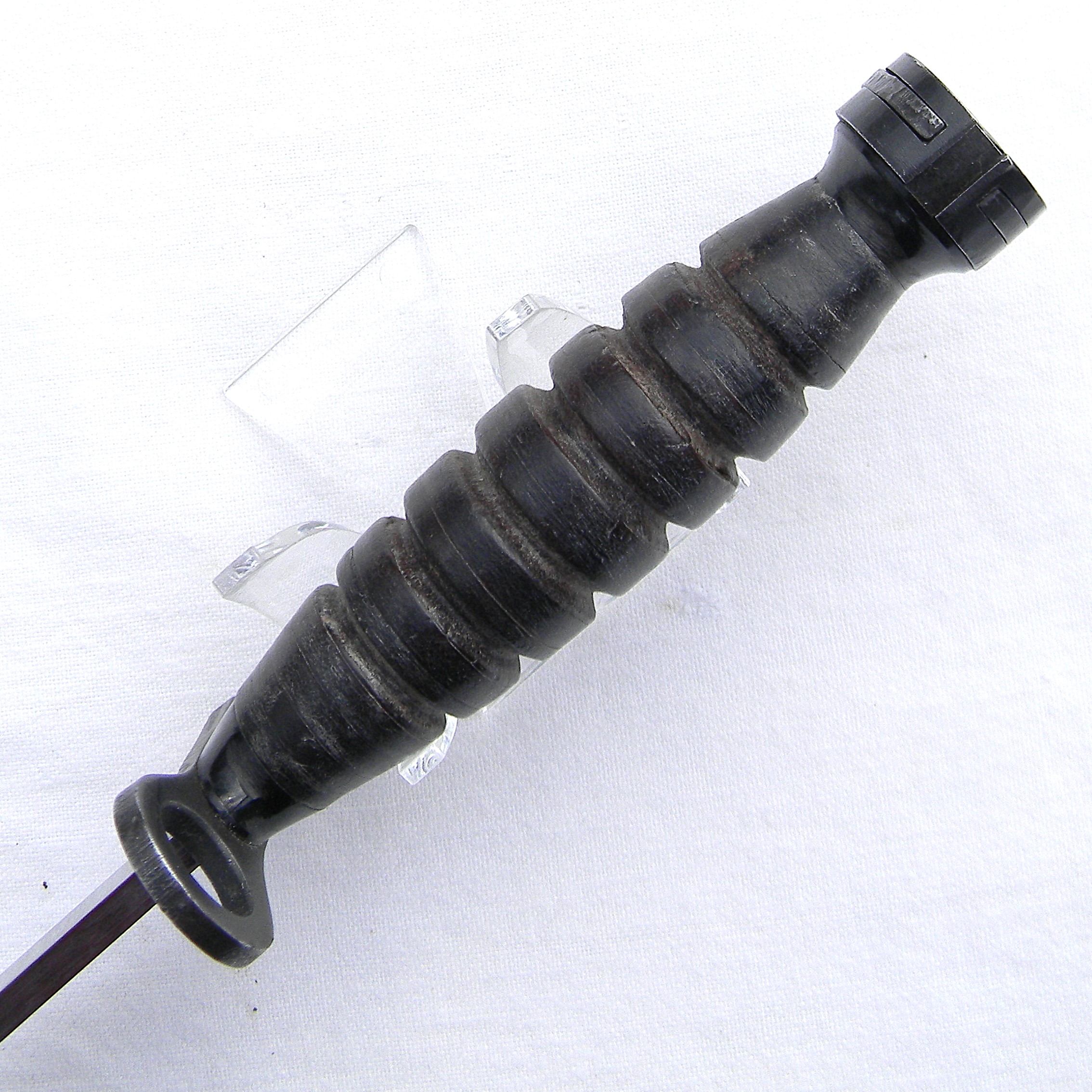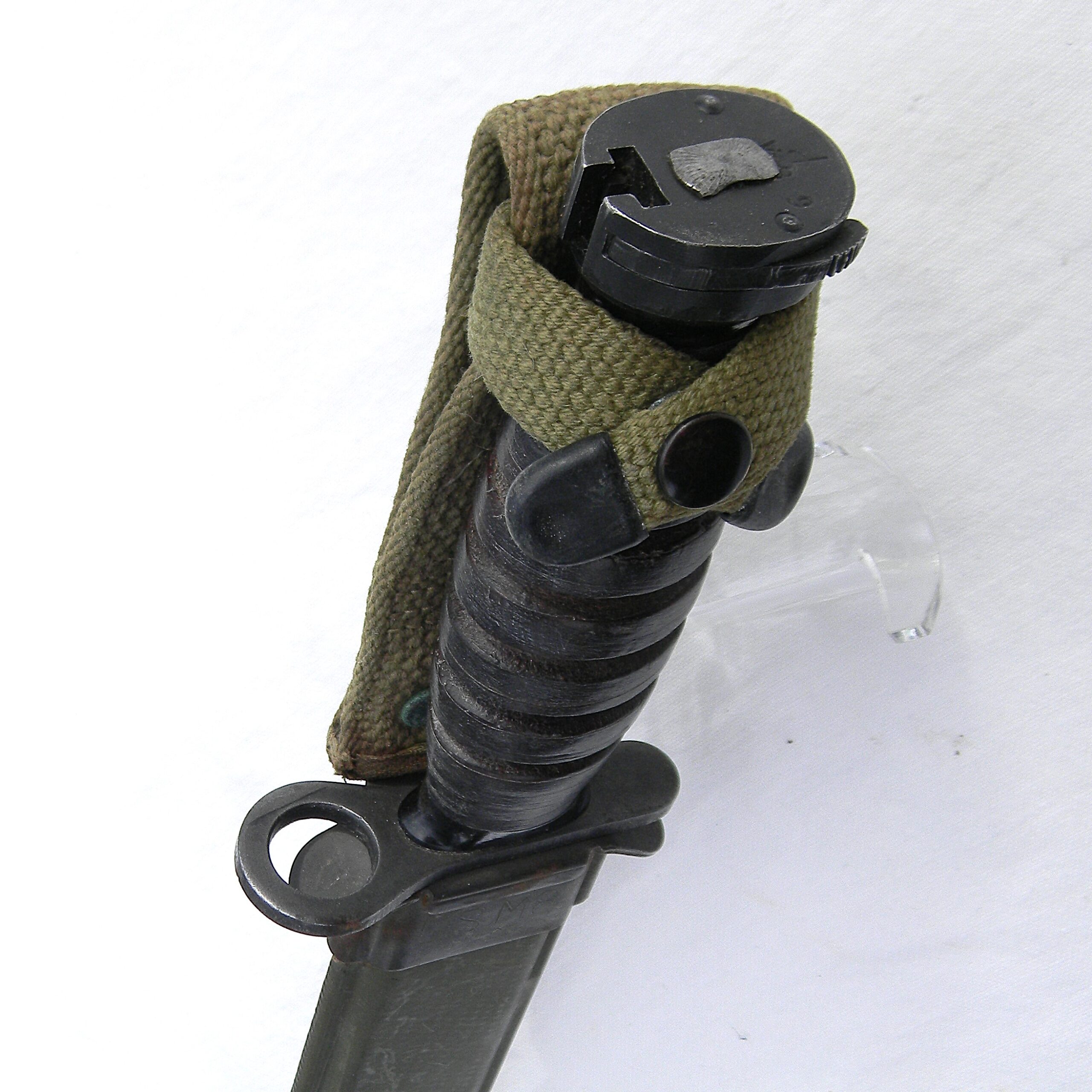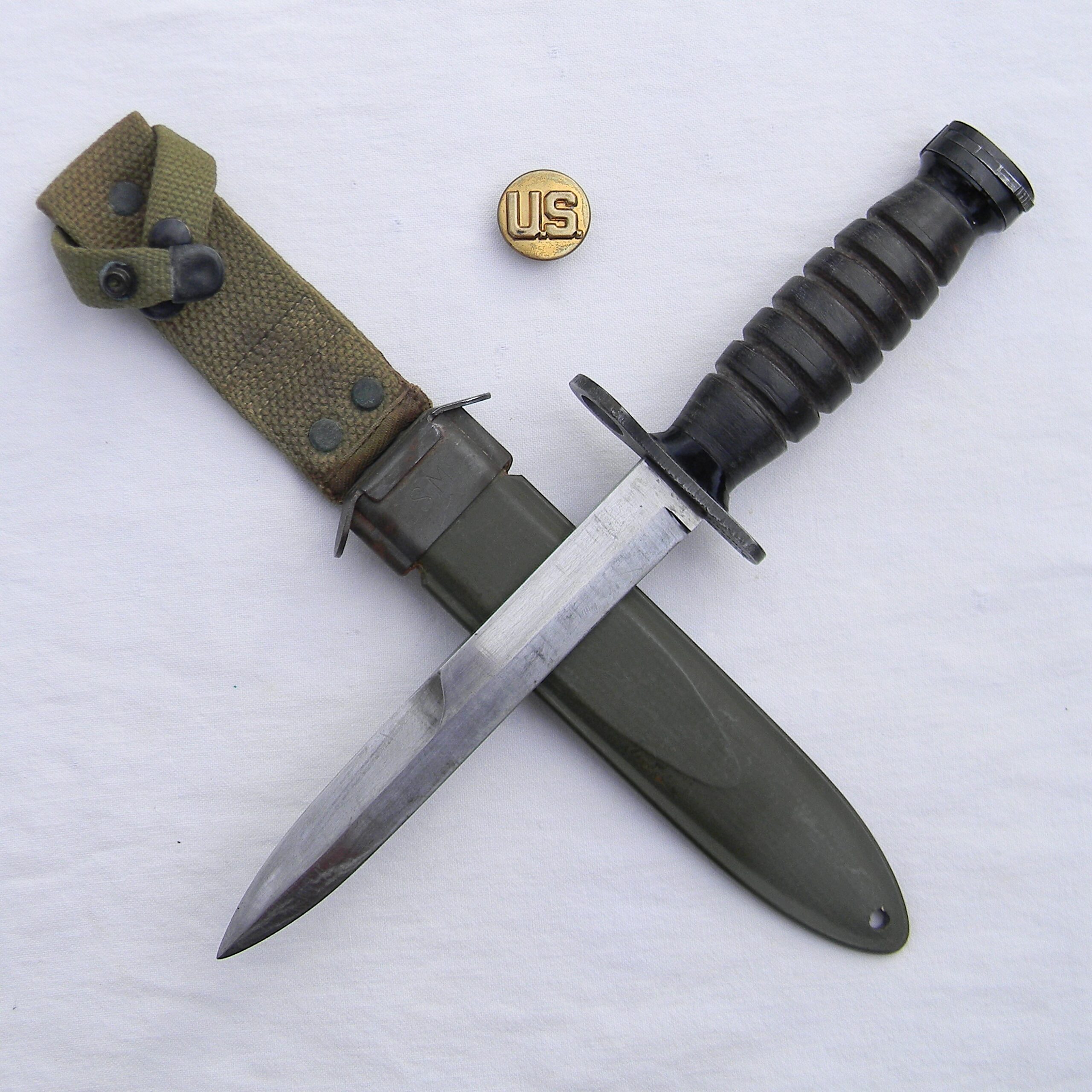 This M4 is about 11-5/8” / 29.5 cm overall; the bright finish blade is about 6-5/6″ / 17 cm long. The blade has been very gently re-sharpened; it is razor-sharp still; the tip is intact. The handle is stacked and grooved leather washers with black Bakelite spacers at the ends and steel muzzle ring & pommel. The muzzle ring is marked with the “flaming bomb” US ordinance mark and U.S. M4 / IMPERIAL stamp on the top. The pommel is excellent with no contact marks; bayonet lock/release is 100% functional; all parts are tight with no play. Original M8 scabbard is in excellent shape as well, considering the age; no dings on the steel throat or cracks/chips on the plastic body. The webbing is intact and rust-free; all original stitching is intact; the keeper is nice and tight. This scabbard was manufactured by Beckwith Mfg Co. (BM CO.) division of Victory Plastics.