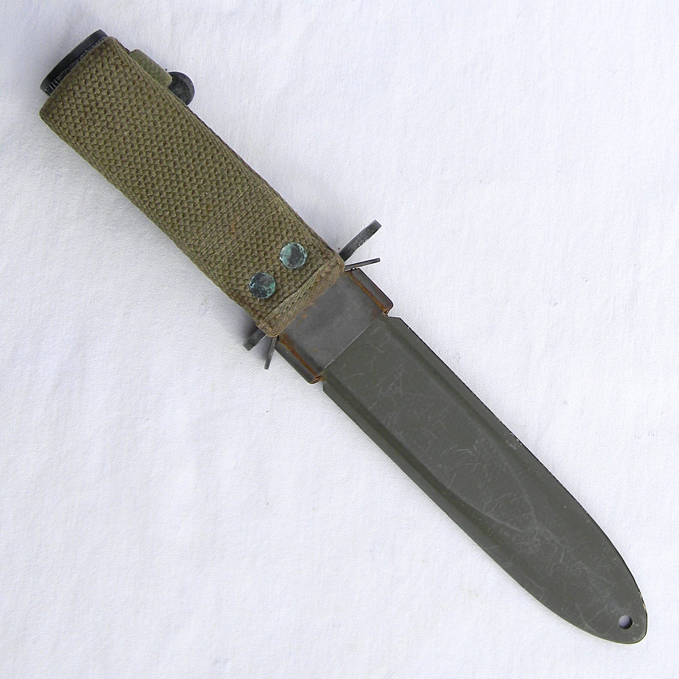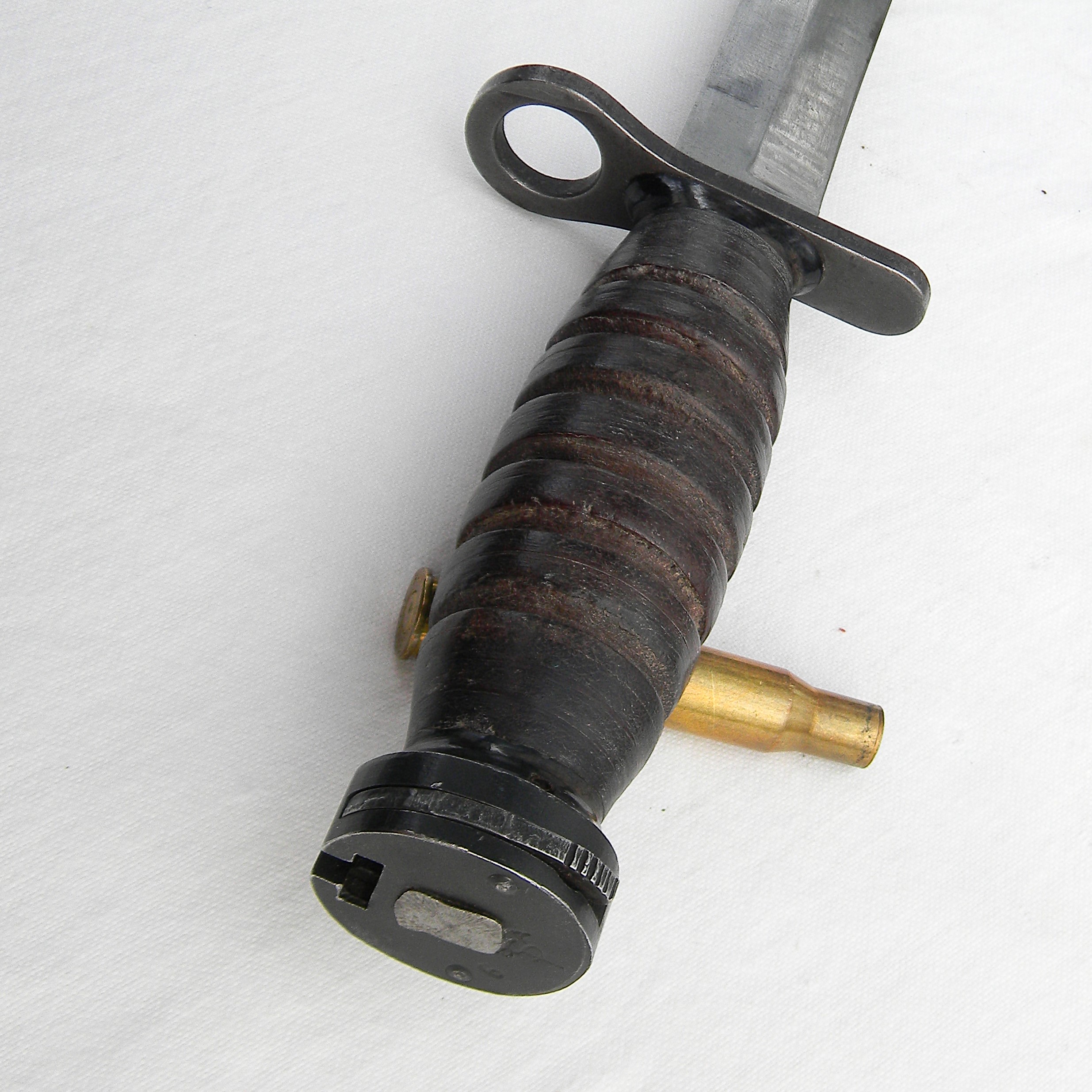 This original WW2 Imperial M4 bayonet and M8 composition scabbard are in 100% serviceable condition still; this type is scarce this nice. These are the actual photos; spent brass is not included with the bayonet I have a few more WW2 US-made bayonets, as well as some scarce WW1 and WW2 era fighting daggers and trench knives made in the US, Great Britain, France, Germany, and other countries available for sale – please take a look in the Militaria section.