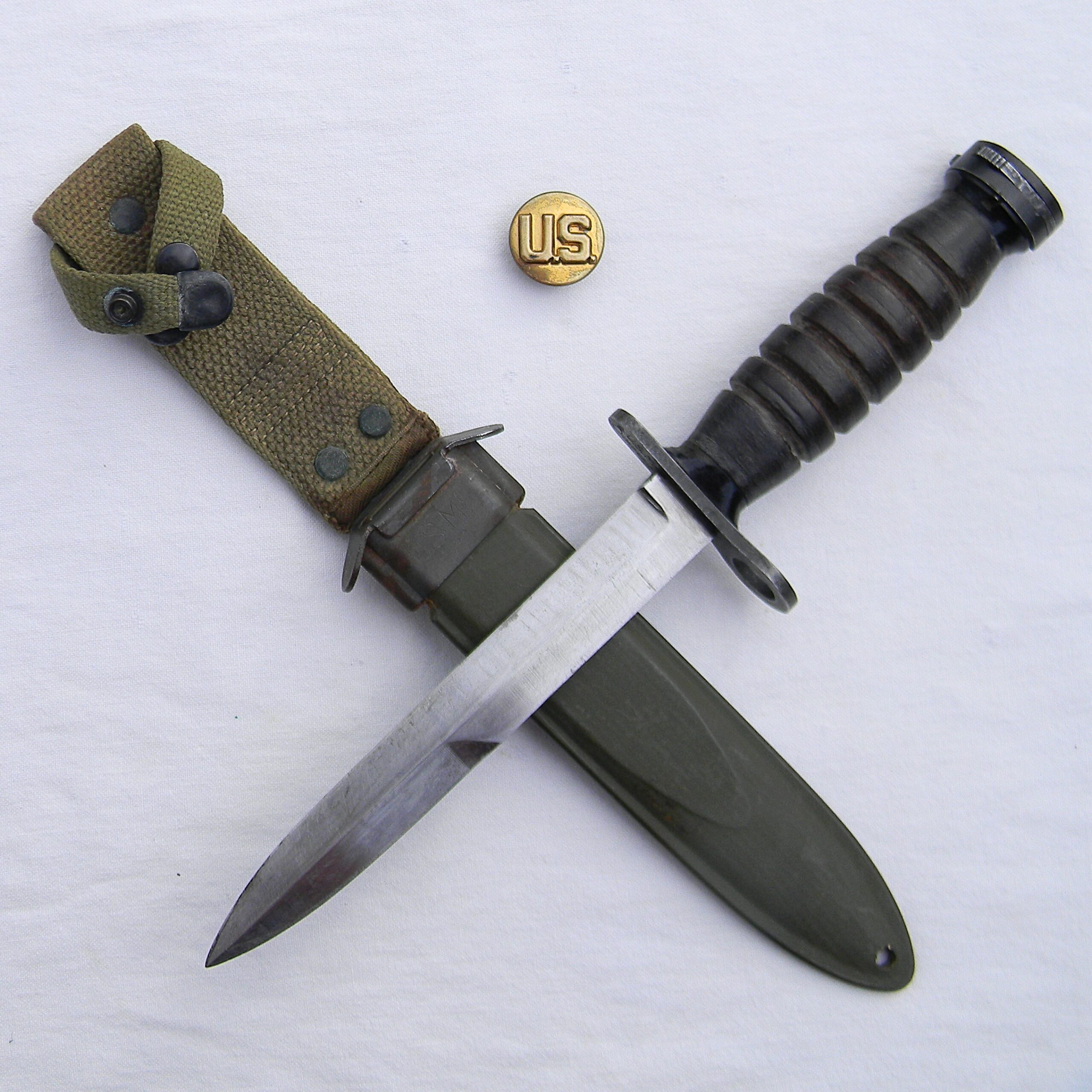 The M4 was intended to be used as a bayonet on a M1 carbine but it was mostly utilized as a fighting and utility knife, just like its “big brother” M3 Trench knife. Both edged weapons were popular with the troops and were used expensively in all theaters of the war. See the WW2 era photo of similar M4 bayonets on US 17th Airborne Division troops firing the M18 recoilless rifle at German positions somewhere around Essen, Germany. On the second WW2 ear photo taken past the Siegfried line in Germany one can clearly see that US M1 carabines did not come with a lug under the barrel to attach a bayonet. These photos are used as a reference only and will not be included with the lot.