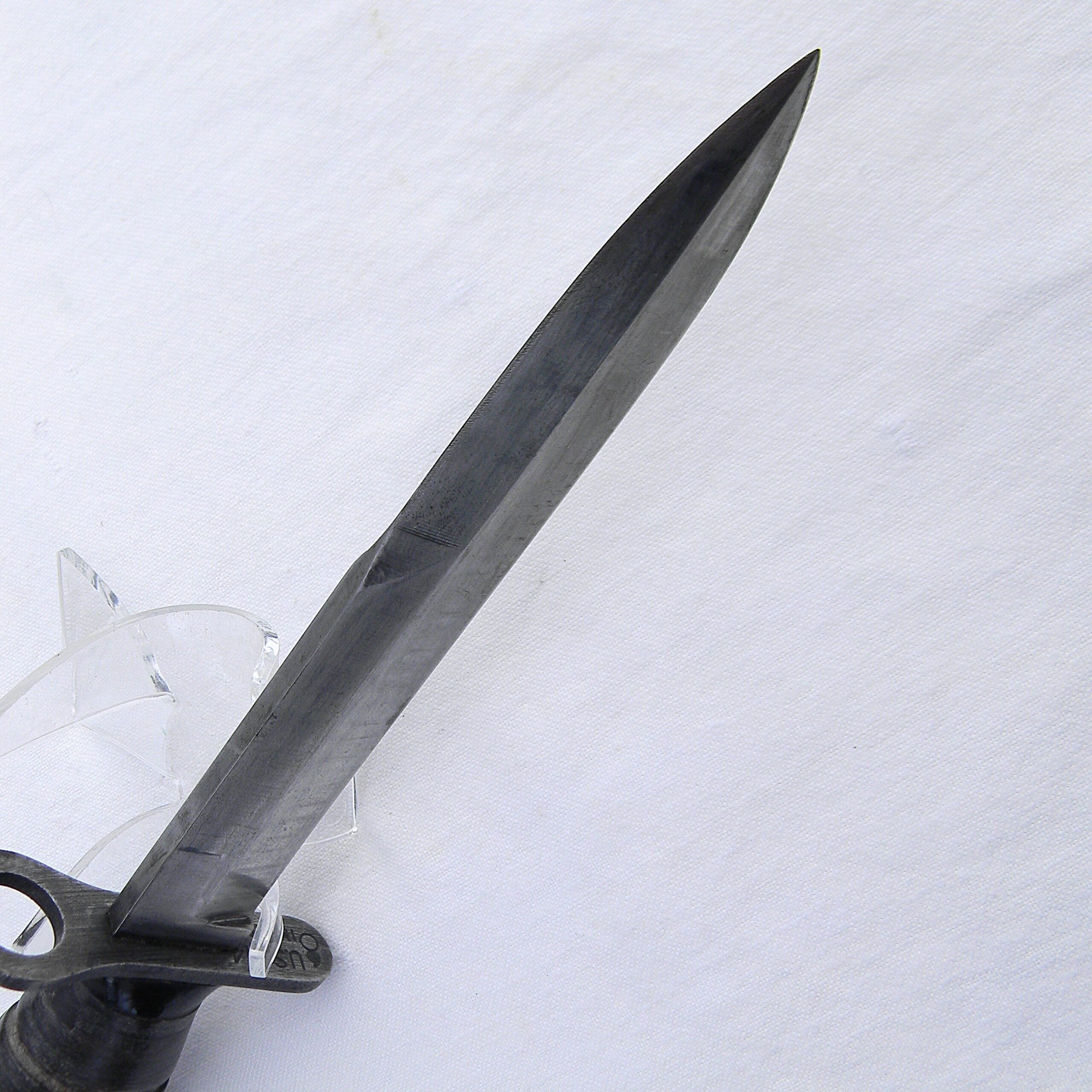 Original WW2 era M1 carbine M4 bayonet in excellent overall condition; this specimen was manufactured by Imperial Cutlery in Providence, RI. This M4 comes with the original issue M8 composition scabbard in rare practically unused condition. This M4 bayonet type is scarce this nice as most had seen heavy use during WW2. Also, many tens of thousands of M4s were refurbished after WW2 and used extensively during the war in Korea; many more were transferred to the member countries’ militaries after the NATO block was established. During the WW2 years Imperial has manufactured close to 918,000 M4 bayonets, however only a fraction of original WW2 era specimens survived in collectable grades.