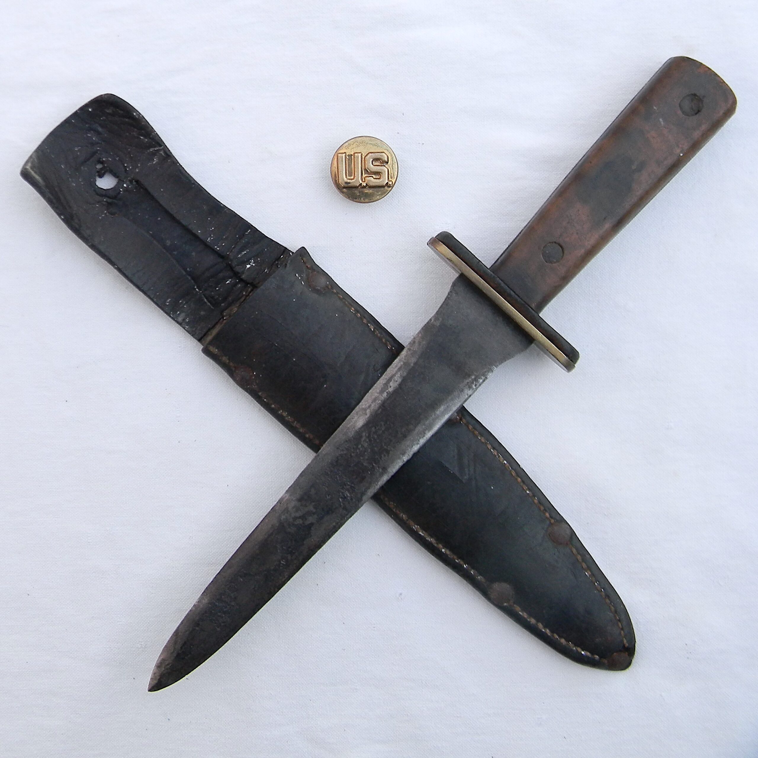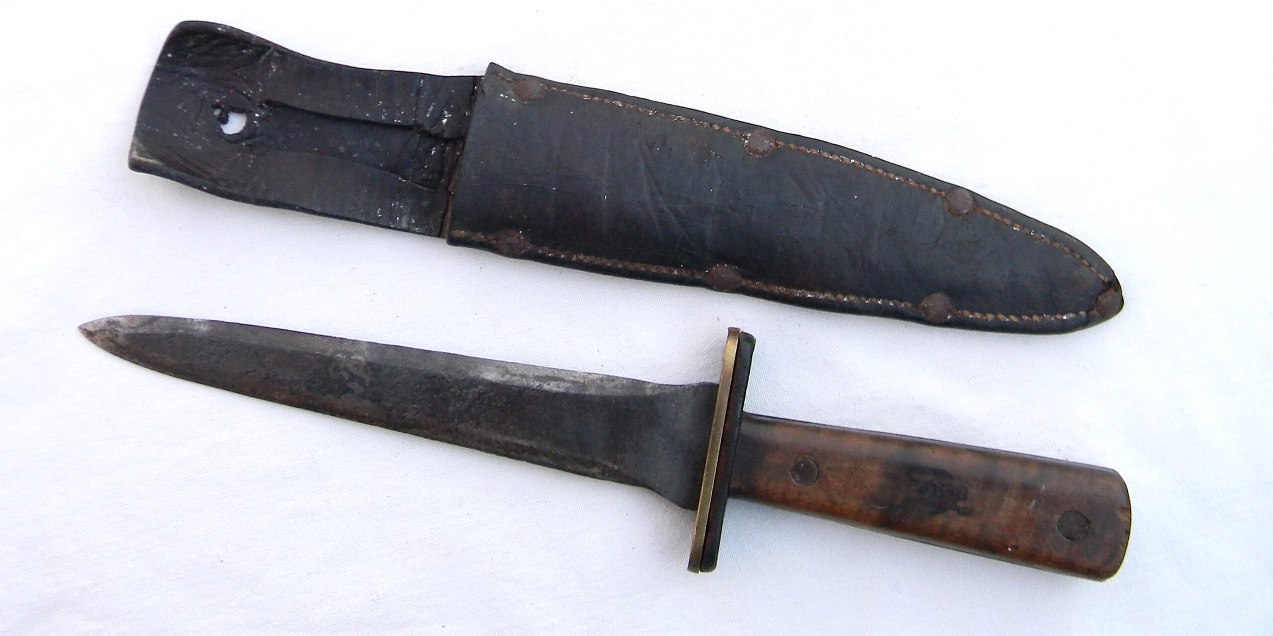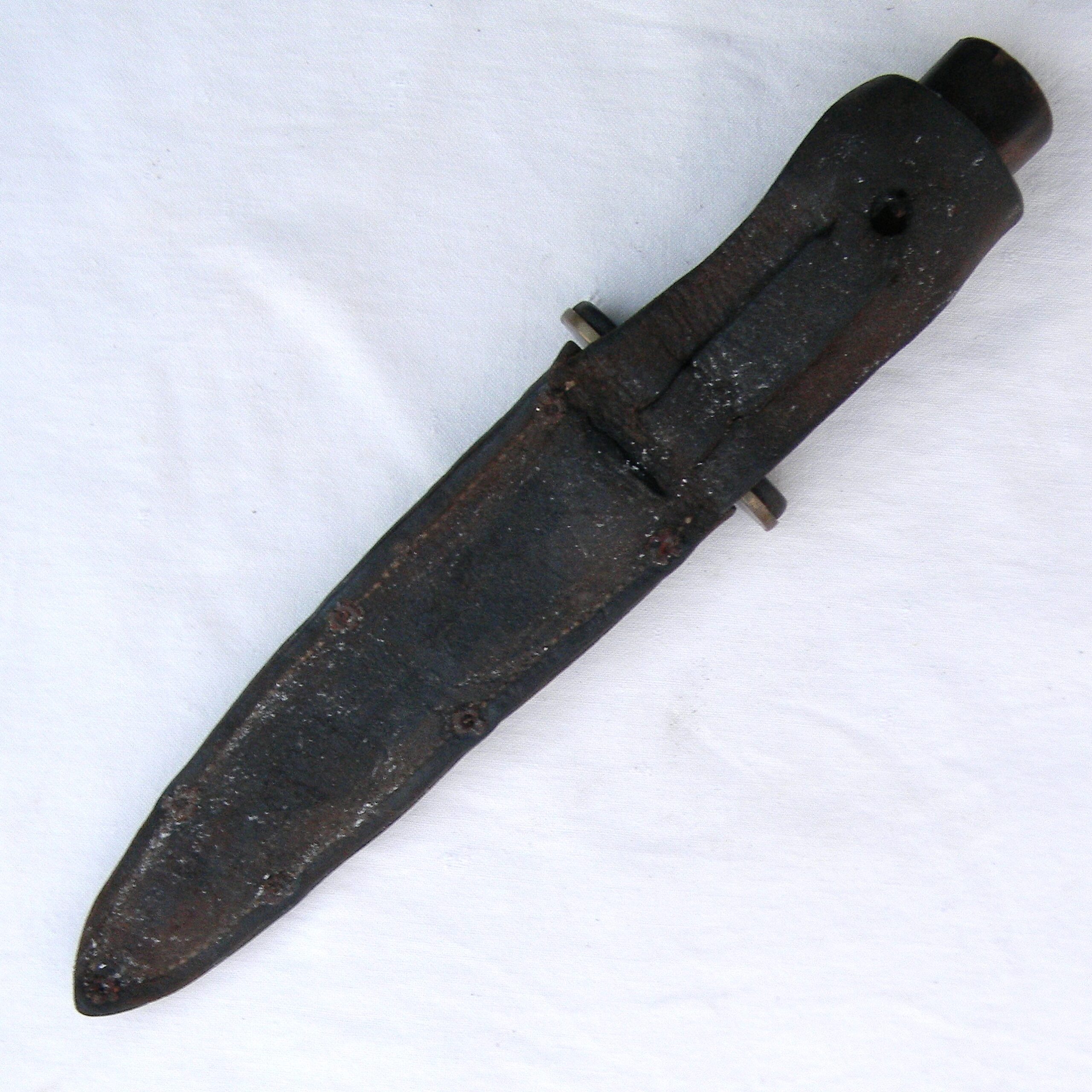 This fighter is in used condition and it was probably poorly stored – the blade is pitted; original leather sheath is dry and fragile with the keeper MIA. Still, all Kennedy Bros Arms fighting knives are VERY hard-to-find in any shape or form nowadays. Kennedy Bros Arms sold a relatively small number of knives before aluminum and bronze was banned from use in products that were “not essential for the war effort”; all of their WW2 era knives are highly sough after now. The knife is about 12″ / 30.5 cm overall; the blade is about 7-1/2″ / 19 cm; the tip is intact. Original leather scabbard has a weakly-struck KENNEDY BROS ARMS CO ST. PAUL circular stamp on the front panel; only a few letters are visible. The scabbard is in poor shape with several dry cracks and stiff leather; at this point it’s good for display only. This rare WW2 Kennedy Arms fighting knife “private purchase” type is rare and hardly ever come up for sale. Don’t miss your chance to add this original WW2 Kennedy Arms fighting knife to your collection!