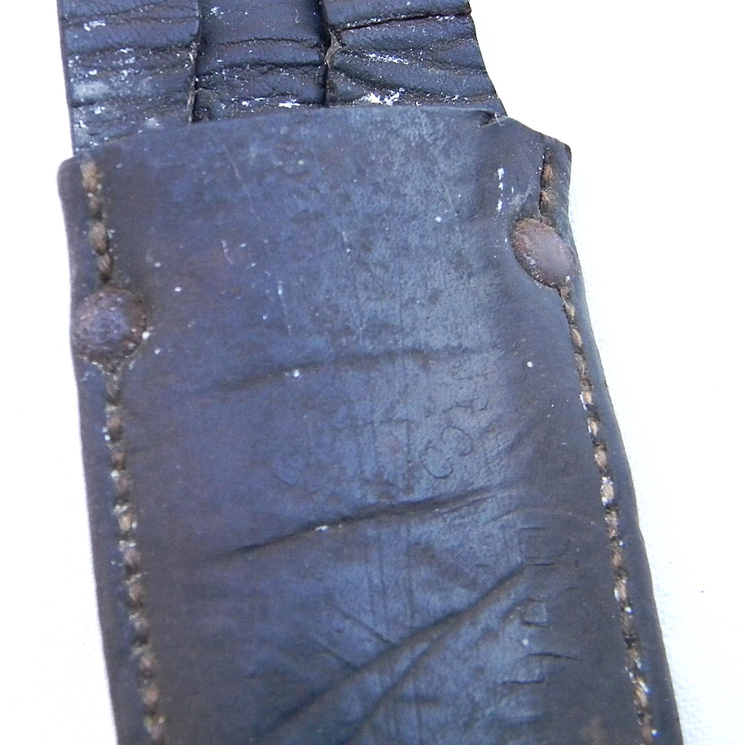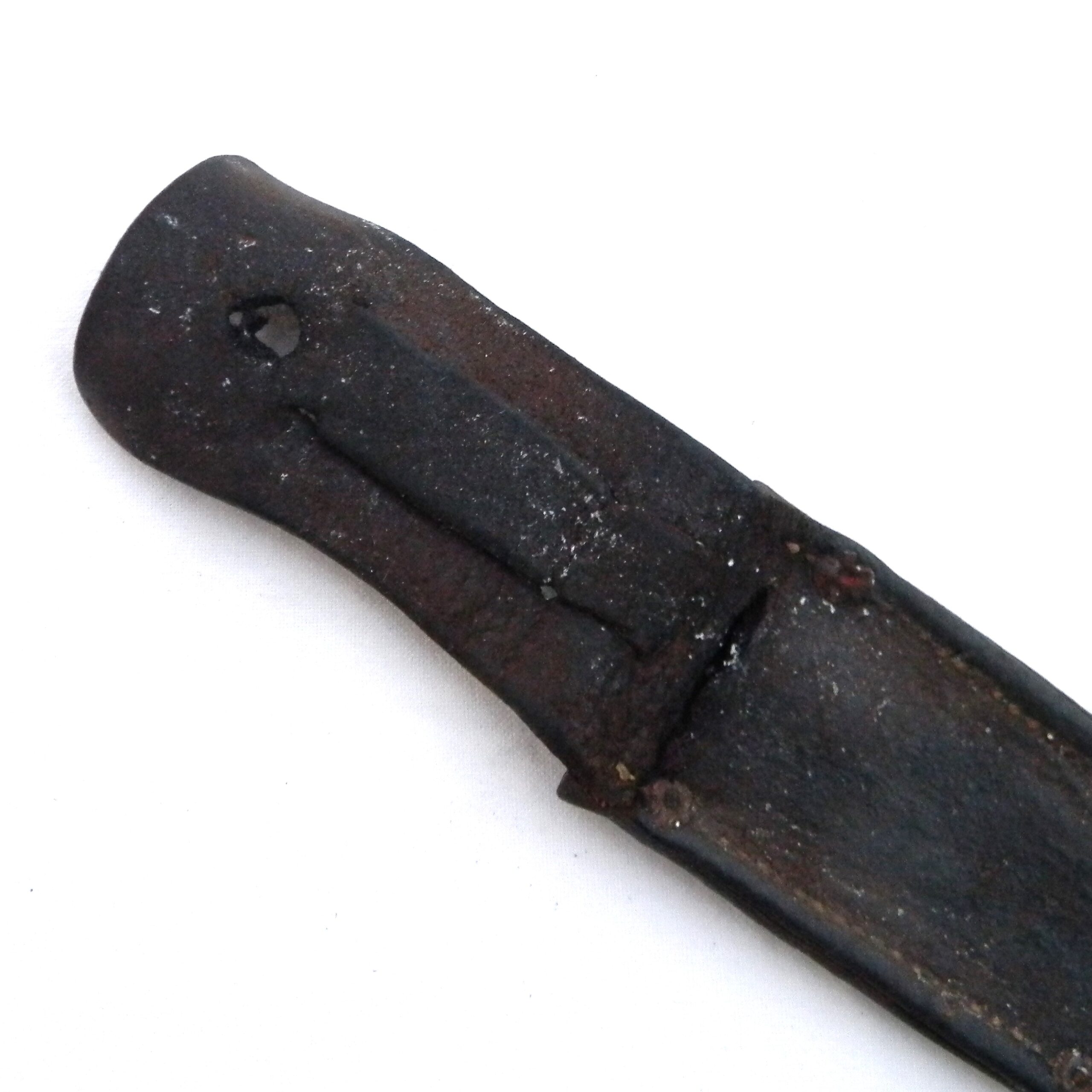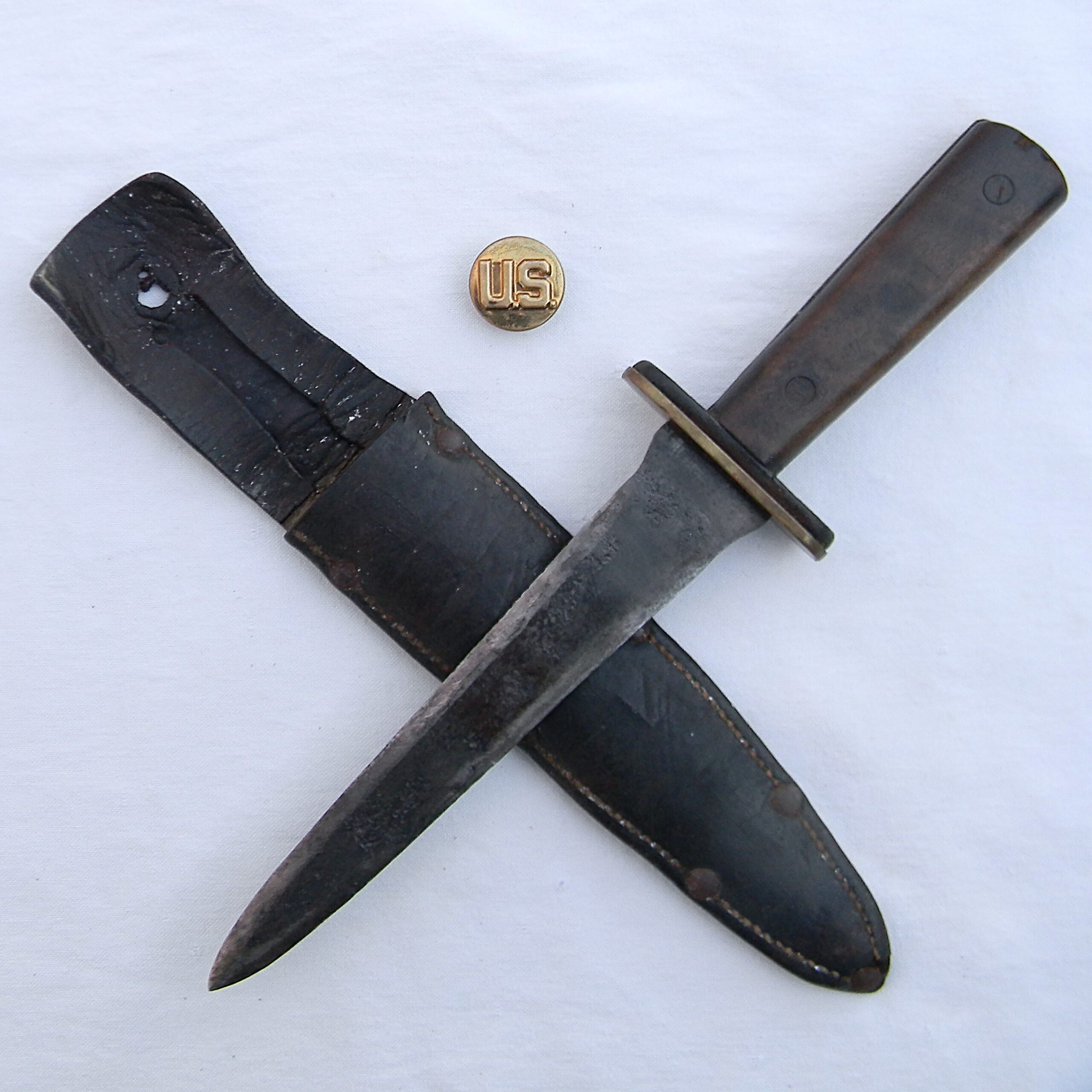 This fighter is in used condition and it was probably poorly stored – the blade is pitted; original leather sheath is dry and fragile with the keeper MIA. Still, all Kennedy Bros Arms fighting knives are VERY hard-to-find in any shape or form nowadays. Kennedy Bros Arms sold a relatively small number of knives before aluminum and bronze was banned from use in products that were “not essential for the war effort”; all of their WW2 era knives are highly sough after now. The knife is about 12″ / 30.5 cm overall; the blade is about 7-1/2″ / 19 cm; the tip is intact. Original leather scabbard has a weakly-struck KENNEDY BROS ARMS CO ST. PAUL circular stamp on the front panel; only a few letters are visible. The scabbard is in poor shape with several dry cracks and stiff leather; at this point it’s good for display only. This rare WW2 Kennedy Arms fighting knife “private purchase” type is rare and hardly ever come up for sale. Don’t miss your chance to add this original WW2 Kennedy Arms fighting knife to your collection!