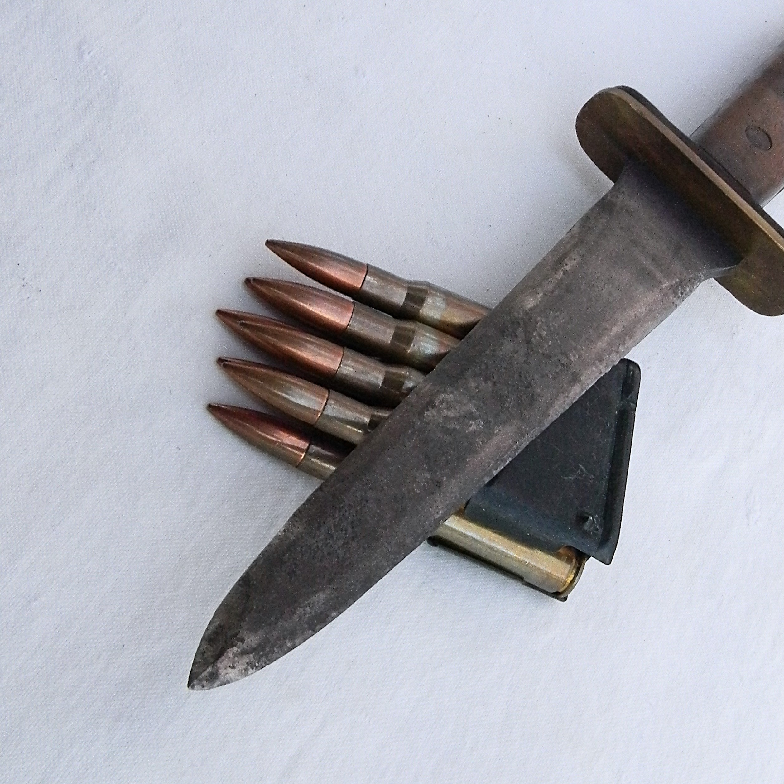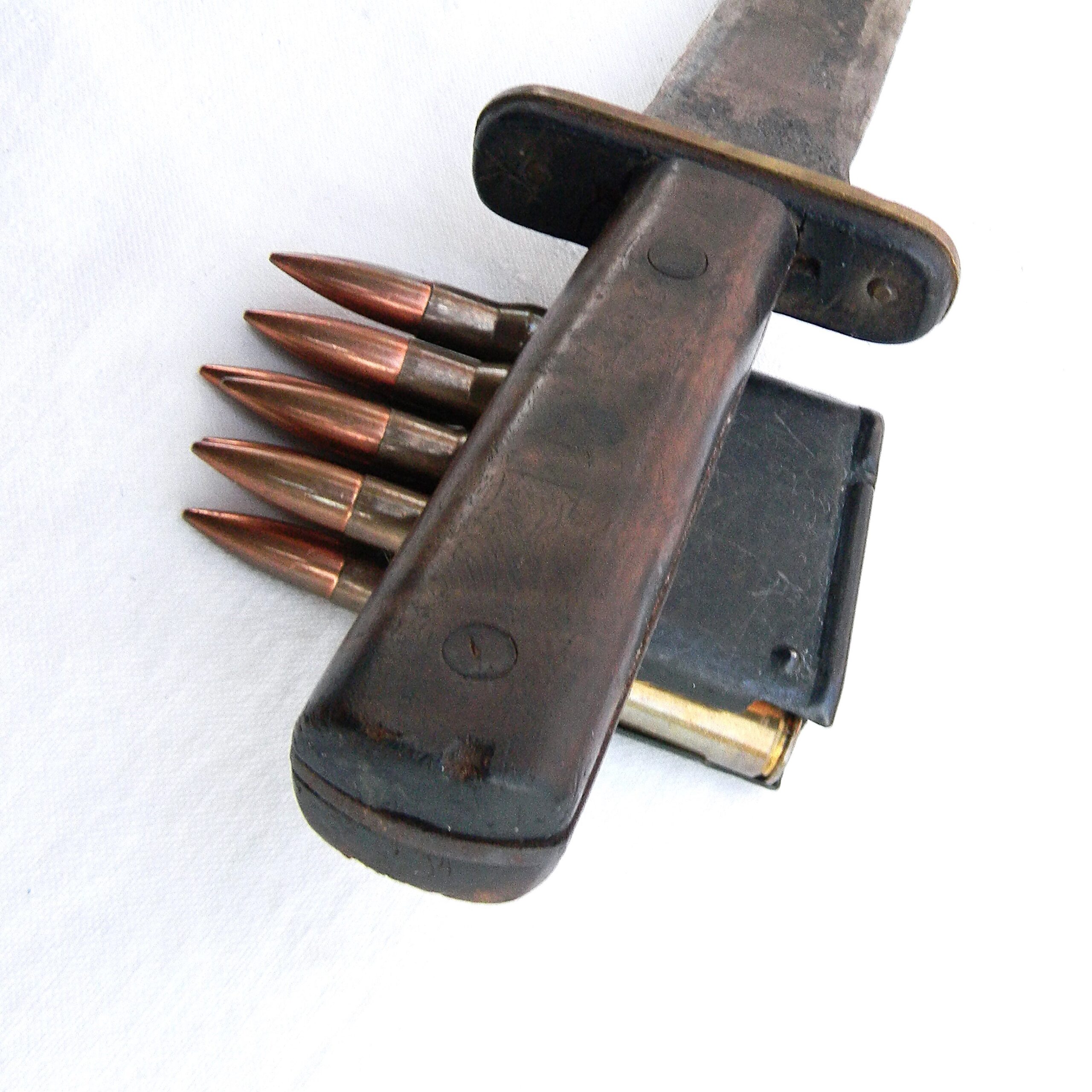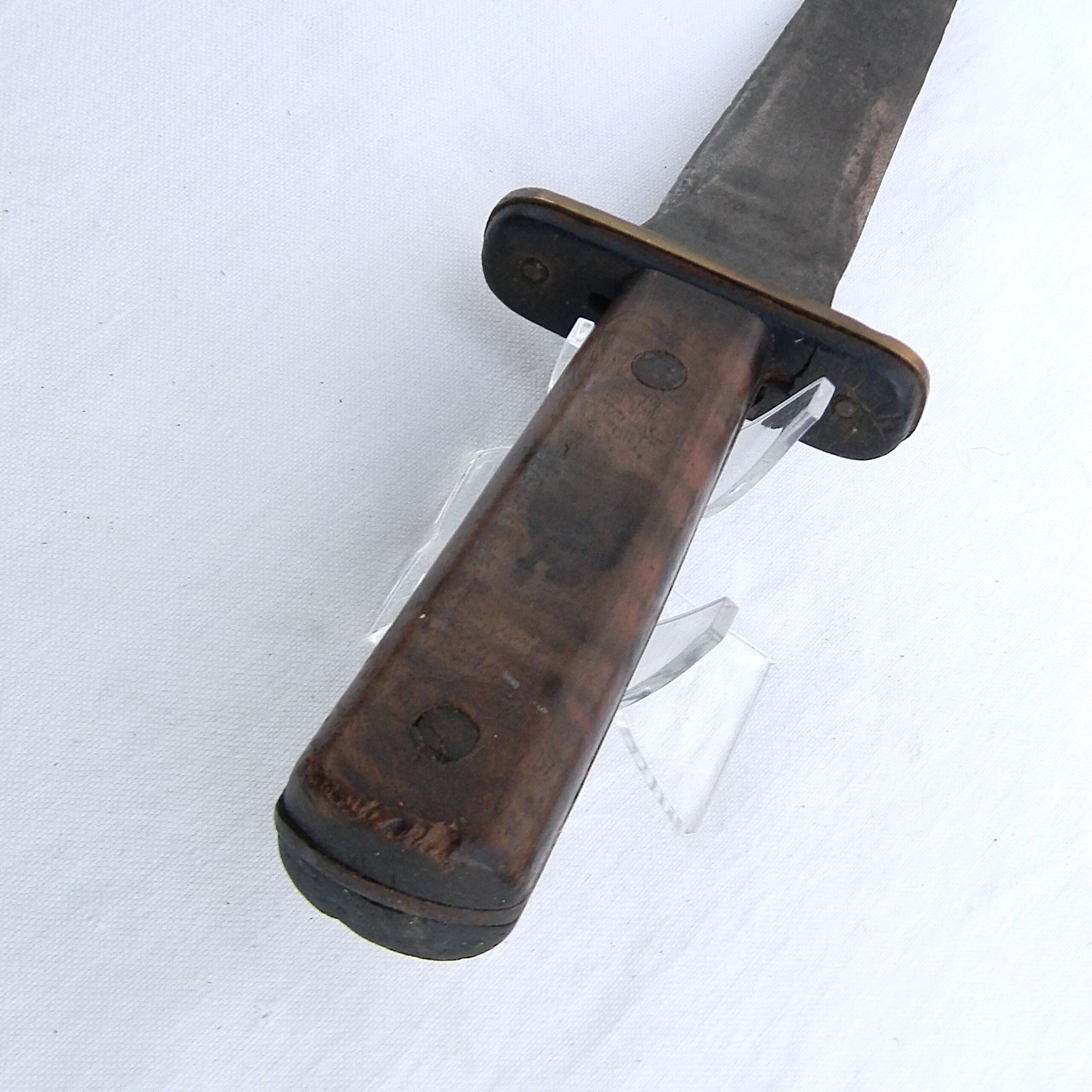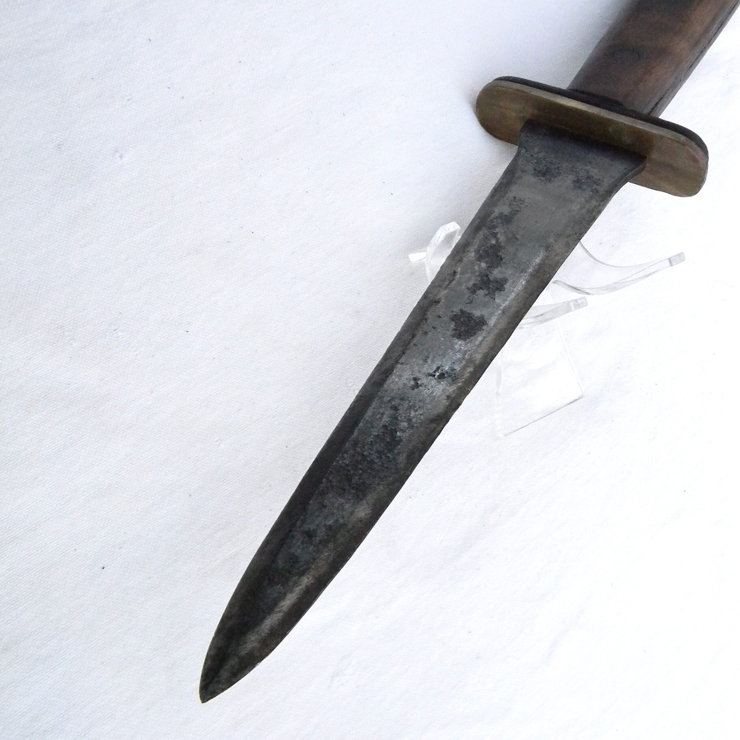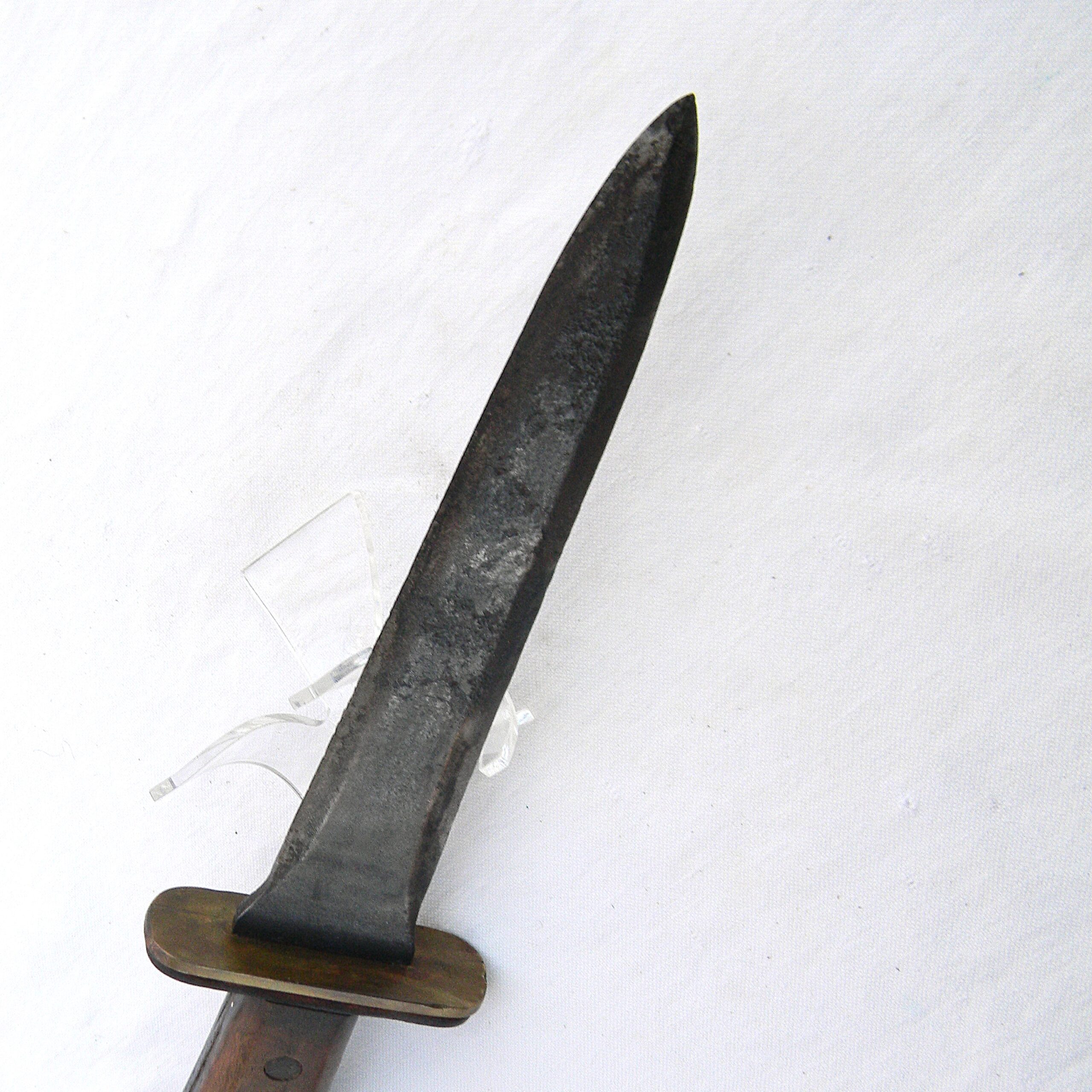 This rare WW2 Kennedy Arms fighting knife has not been cleaned or tampered with in any way, it is in 100% original “as is” condition. These are the actual photos; Garand clips are not included with the knife I have a few more American-made WW2 “private purchase” knives & daggers, several rare fighting knives made from converted sabers, as well as some scarce WW1 and WW2 fighting daggers and trench knives available for sale – please take a look in our Militaria section. I also have a very rare US-made Camillus OSS stiletto fighting dagger that was modeled after the British FS dagger available for sale – please take a look.