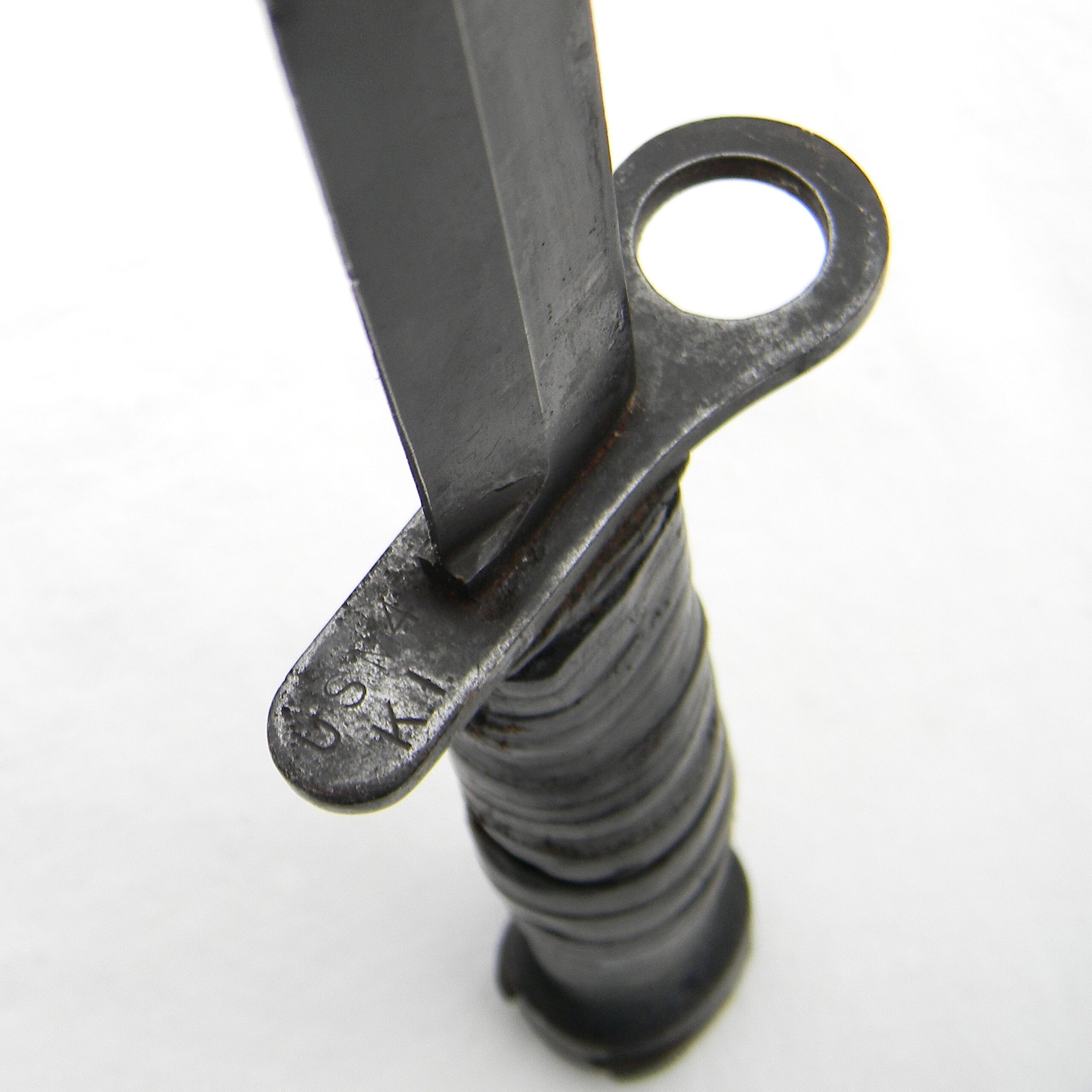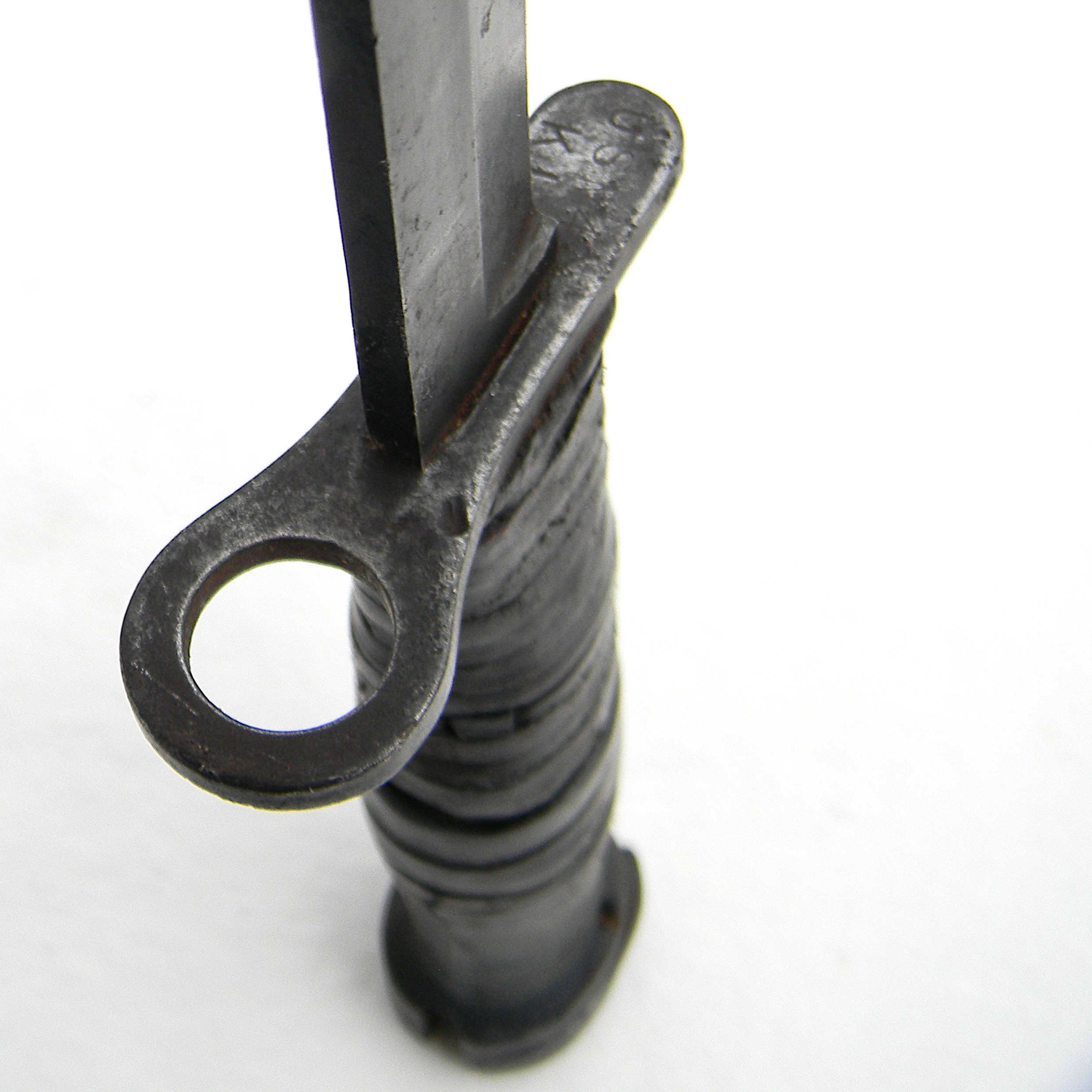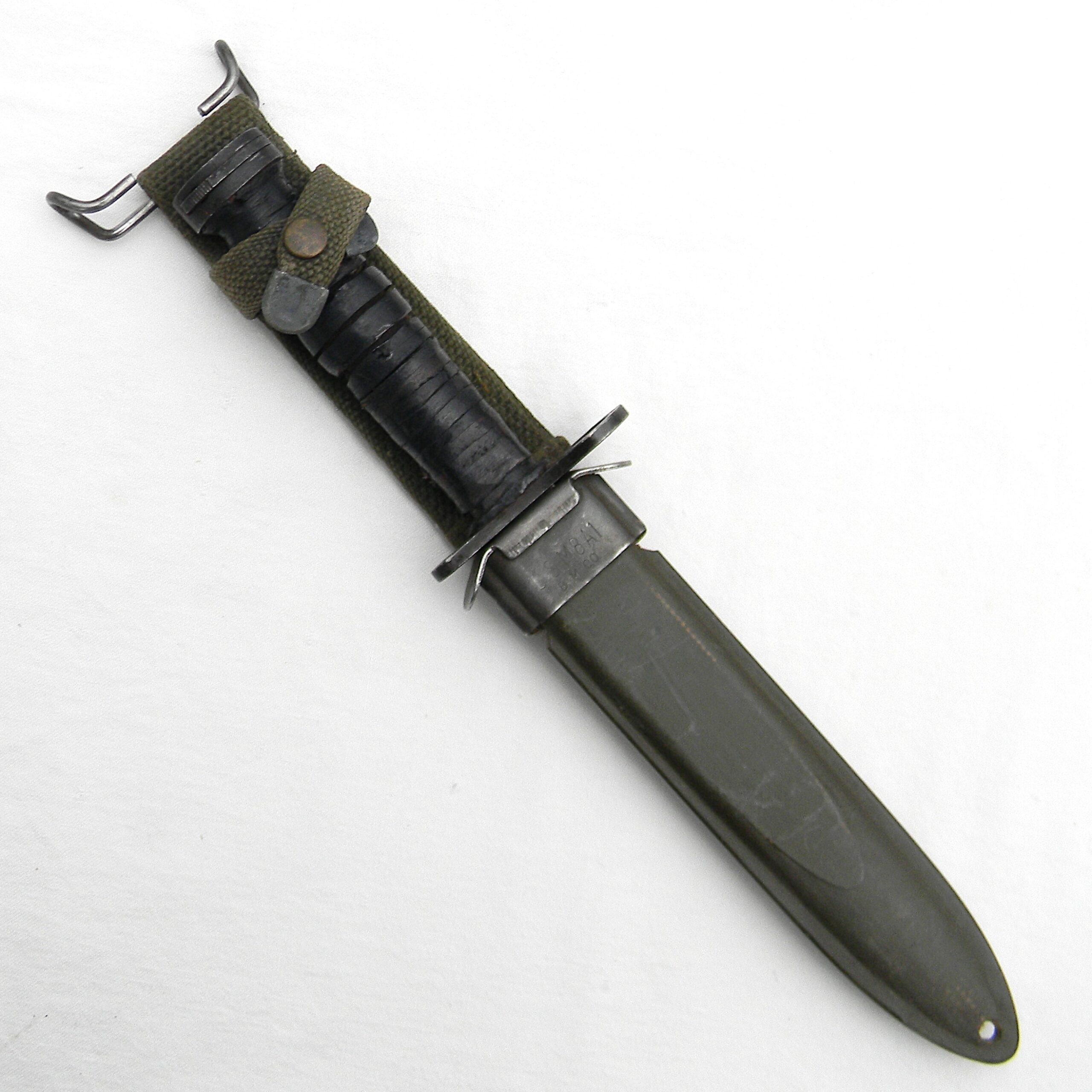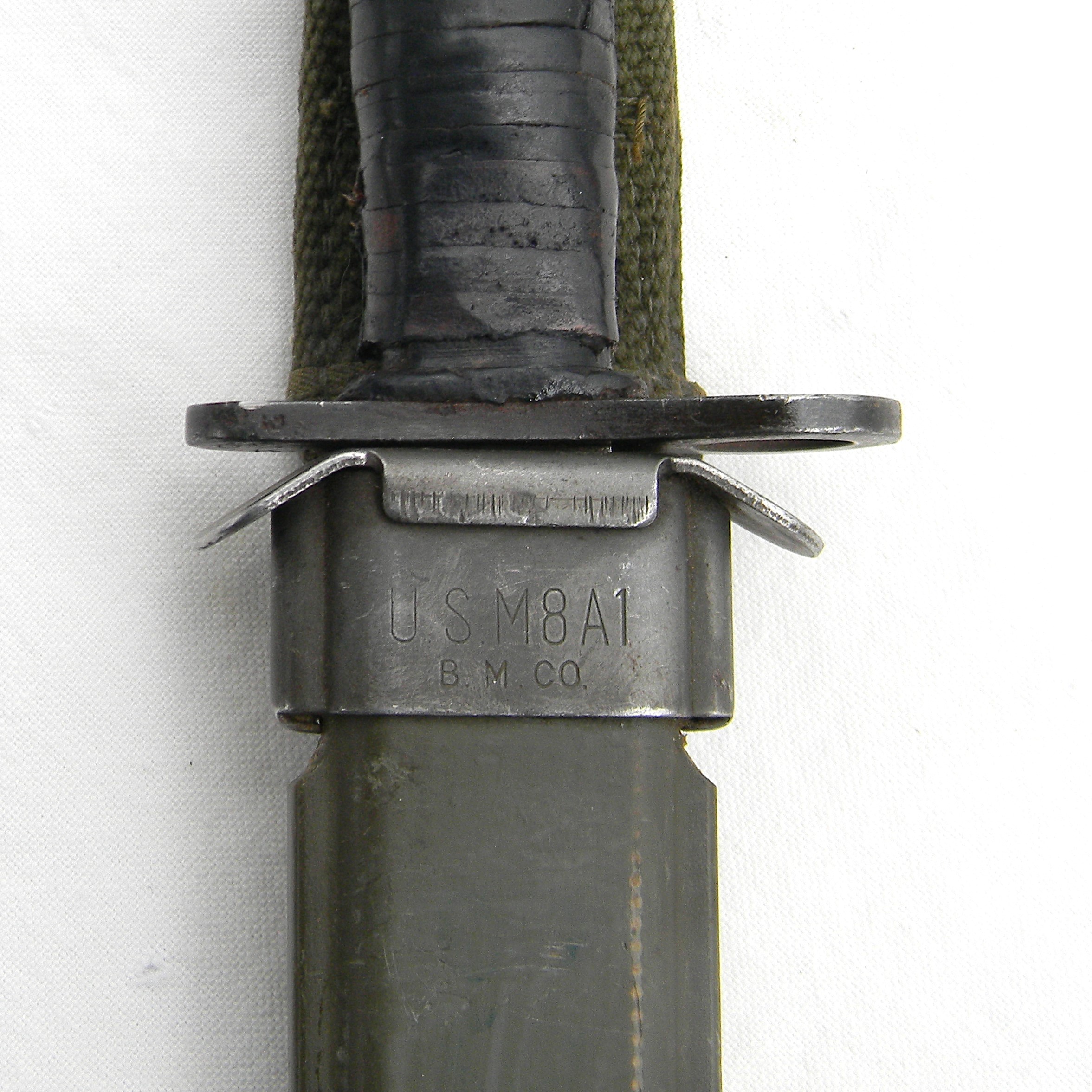 This M4 is about 11-5/8” / 29.5 cm overall; blued blade is about 7″ / 17.8 cm long. The blade has been re-sharpened and it’s razor-sharp still; the tip is intact. The handle is stacked and grooved leather washers with brown plastic spacers at the ends and steel muzzle ring & pommel. The muzzle ring is marked with the “flaming bomb” US ordinance mark and U.S. M4 / KI stamp on the top. The pommel is excellent with no contact marks; bayonet lock/release is 100% functional; all parts are tight with no play. Original M8A1 scabbard is in great shape as well, considering the age; no dings on the steel throat or cracks/chips on the composite plastic. The webbing is intact; all original stitching is intact; the keeper is nice and tight. This scabbard was manufactured by Beckwith Mfg Co. (BM CO.) division of Victory Plastics.