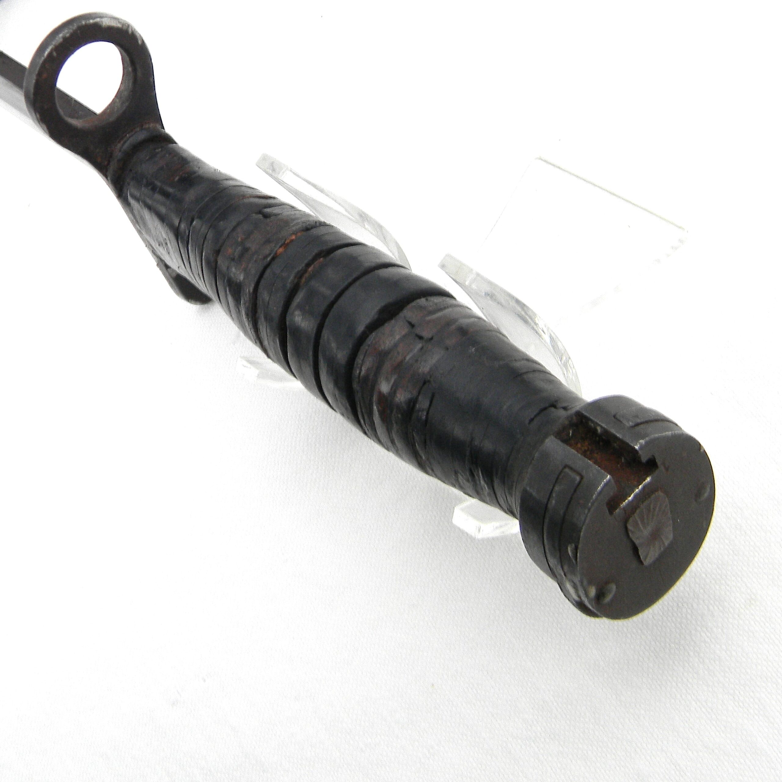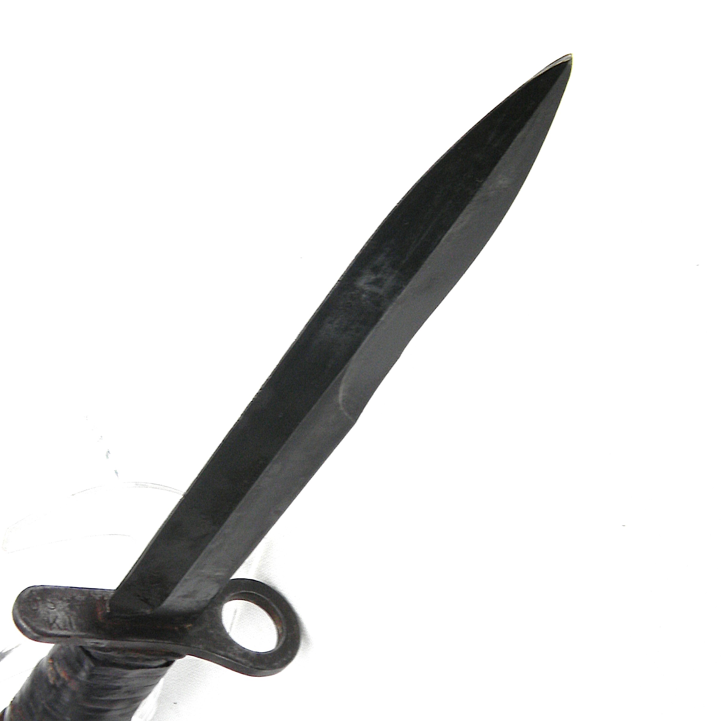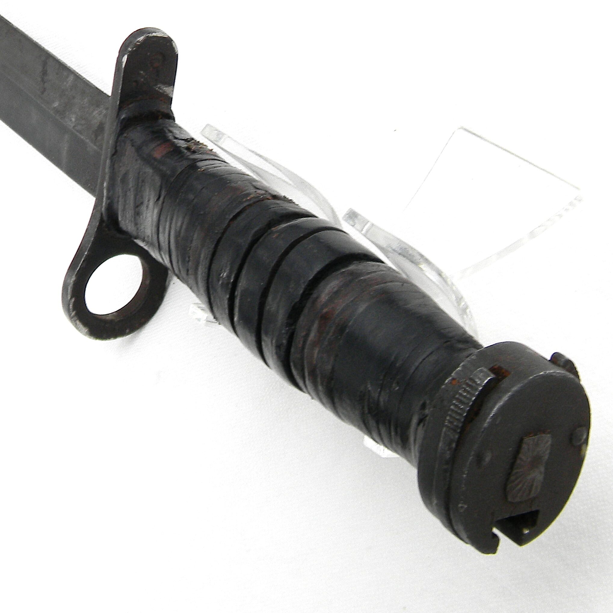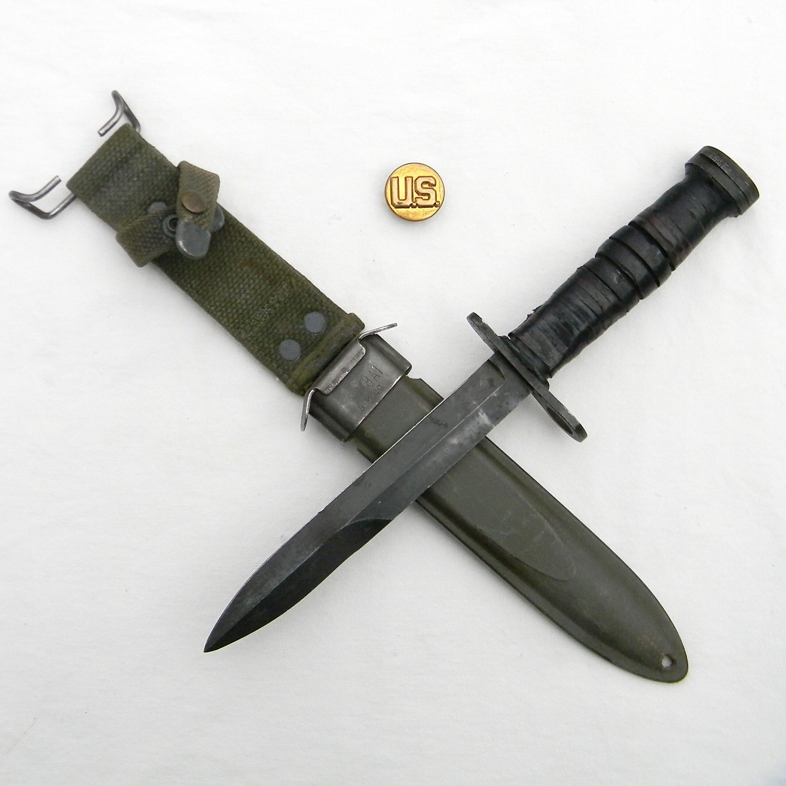 This M4 is about 11-5/8” / 29.5 cm overall; blued blade is about 7″ / 17.8 cm long. The blade has been re-sharpened and it’s razor-sharp still; the tip is intact. The handle is stacked and grooved leather washers with brown plastic spacers at the ends and steel muzzle ring & pommel. The muzzle ring is marked with the “flaming bomb” US ordinance mark and U.S. M4 / KI stamp on the top. The pommel is excellent with no contact marks; bayonet lock/release is 100% functional; all parts are tight with no play. Original M8A1 scabbard is in great shape as well, considering the age; no dings on the steel throat or cracks/chips on the composite plastic. The webbing is intact; all original stitching is intact; the keeper is nice and tight. This scabbard was manufactured by Beckwith Mfg Co. (BM CO.) division of Victory Plastics.