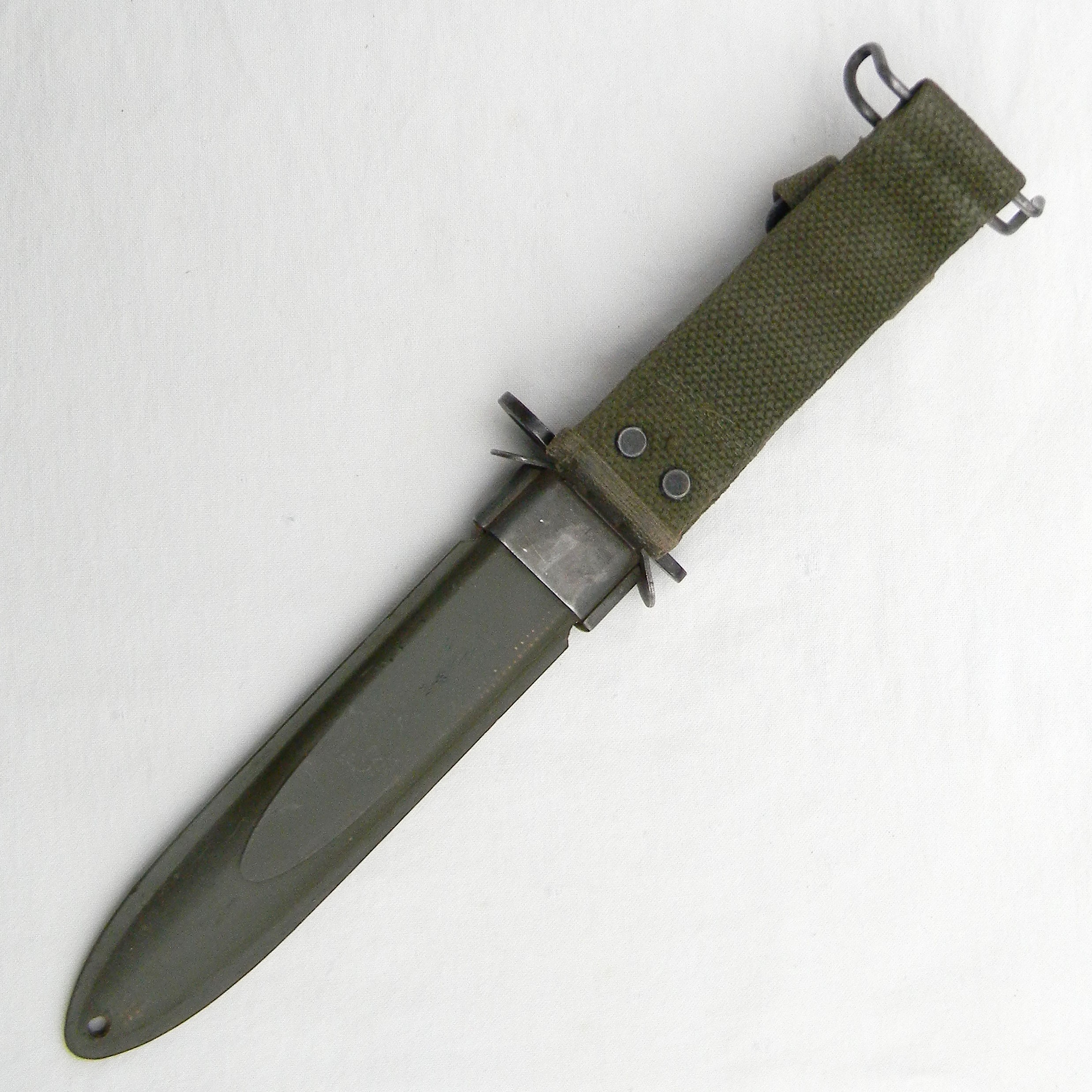 This original WW2 Kinfolks M4 bayonet and M8A1 composition scabbard are in 100% serviceable condition still; this type is scarce this nice. These are the actual photos; Garand clips are not included with the bayonet I have a few more WW2 US-made bayonets, as well as some scarce WW1 and WW2 era fighting daggers and trench knives made in the US, Great Britain, France, Germany, and other countries available for sale – please take a look in the Militaria section.