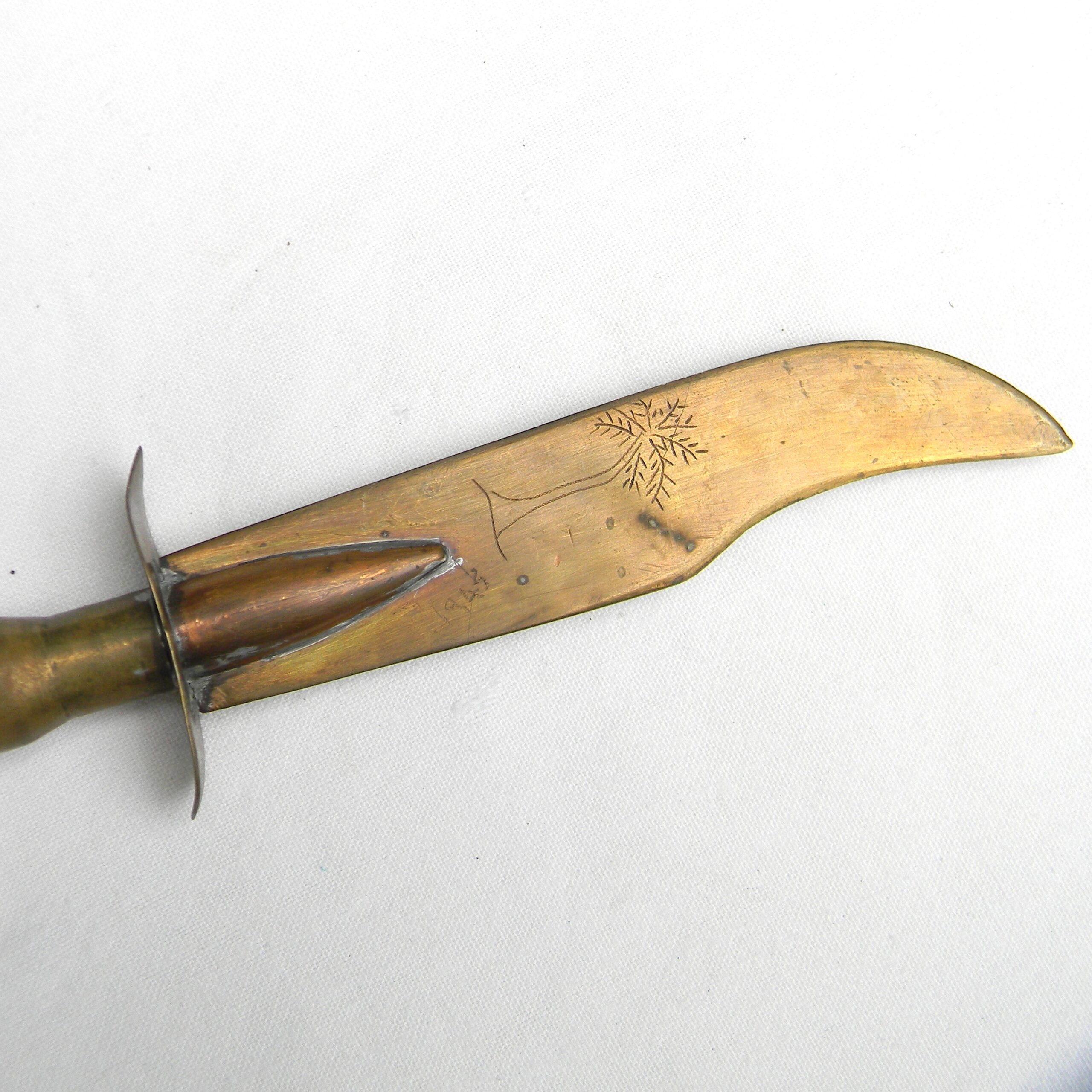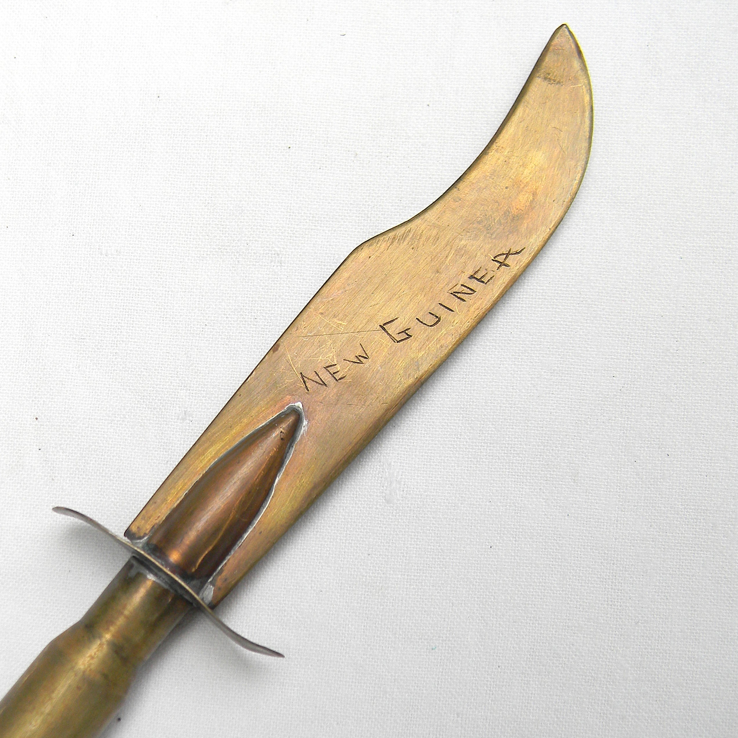 WW2 New Guinea trench art letter opener made from 50 cal BMG casing. Brass blade is hand-engraved and dated 1943; a unique souvenir in excellent condition, considering the age. FREE SHIPPING WITHIN THE U.S FOR THIS ITEM.