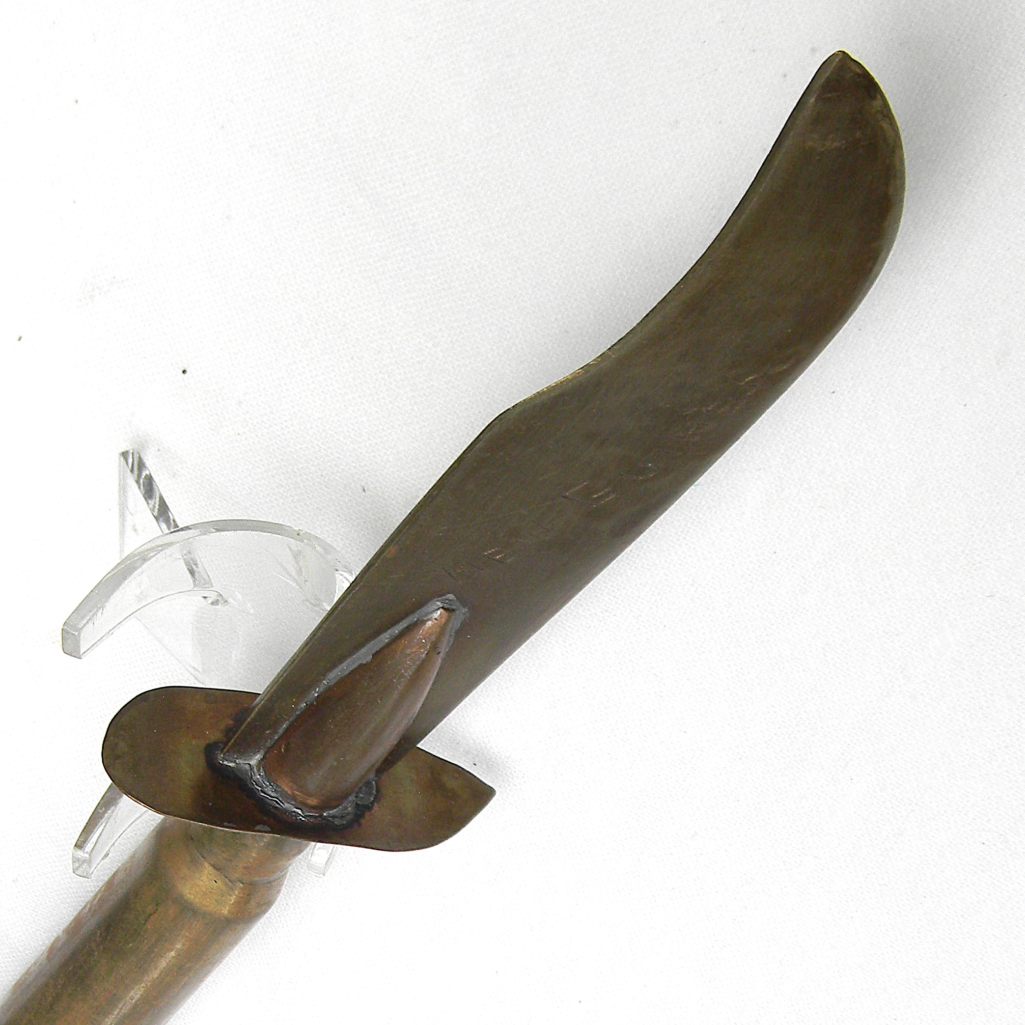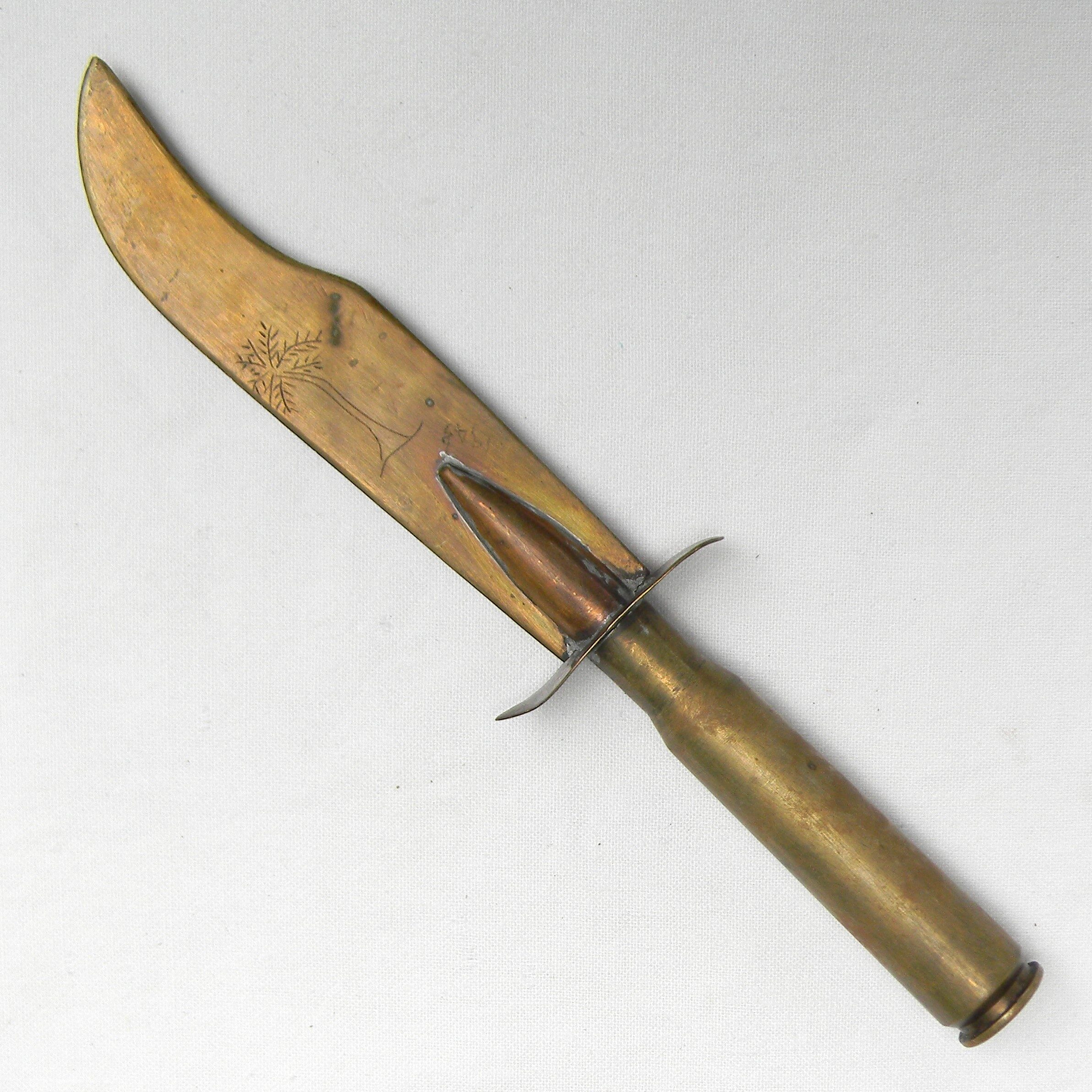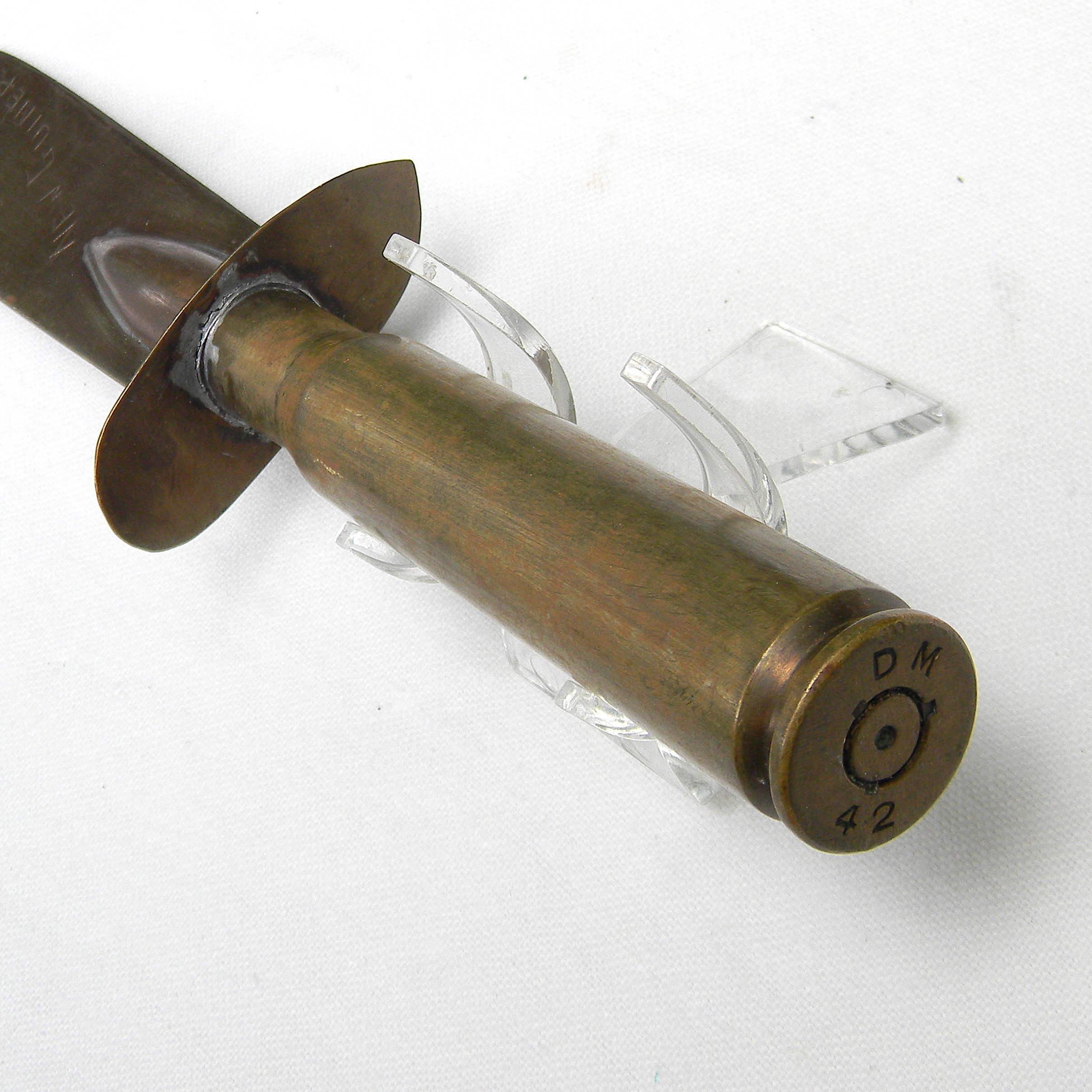Very cool-looking WW2 era letter opener made from a spend 50 cam BMG casing and bullet and all-brass blade. The blade is crudely decorated on both sides of the blade and dated 1943. The 50 cal round was manufactured in 1942, based on the head stamp. This interesting “trench art” letter opener is in excellent overall condition. It is about 8-7/8” / 20 cm overall; brass blade is about 5″ / 12.7 cm; no edge dings, the tip is intact; the blade is very sharp still.