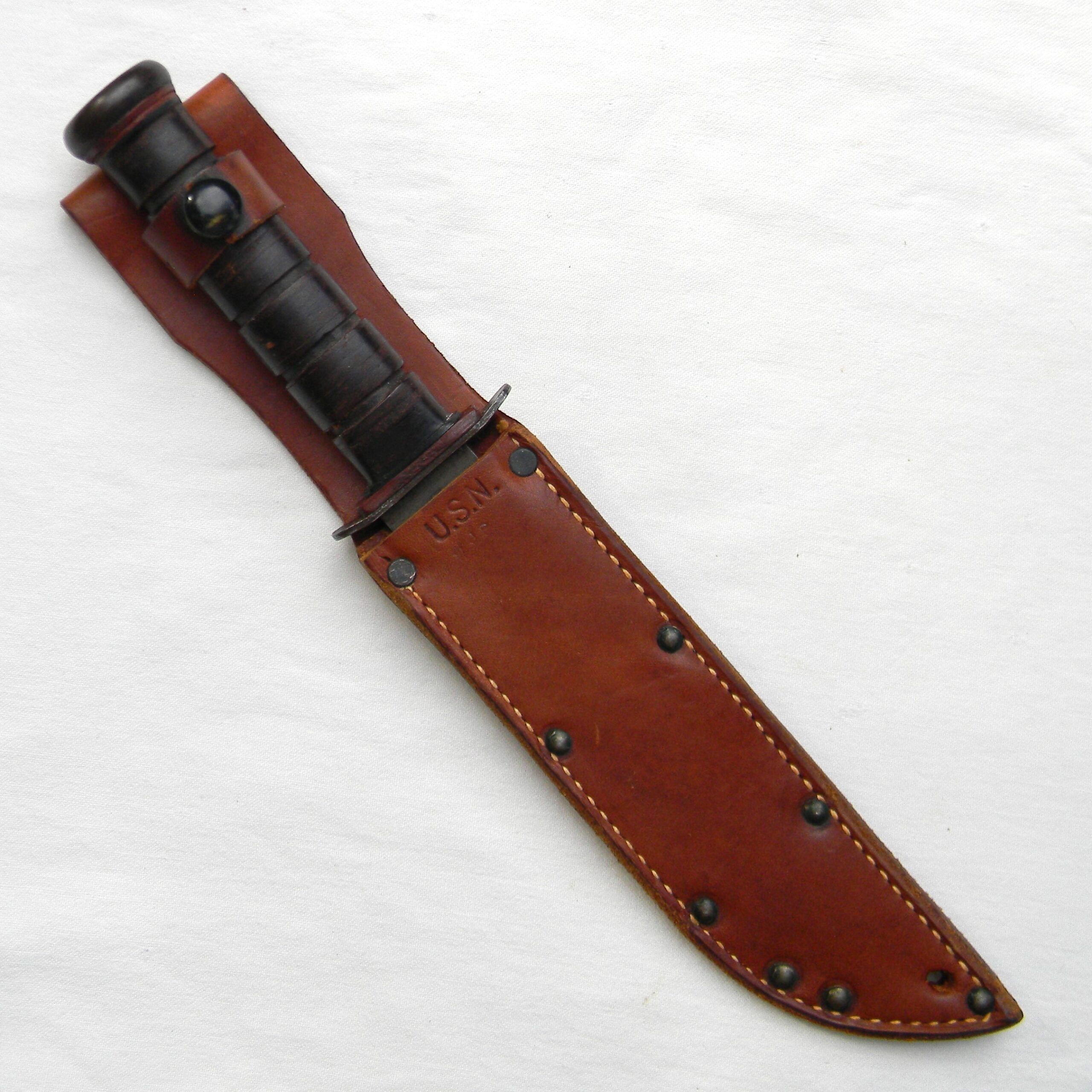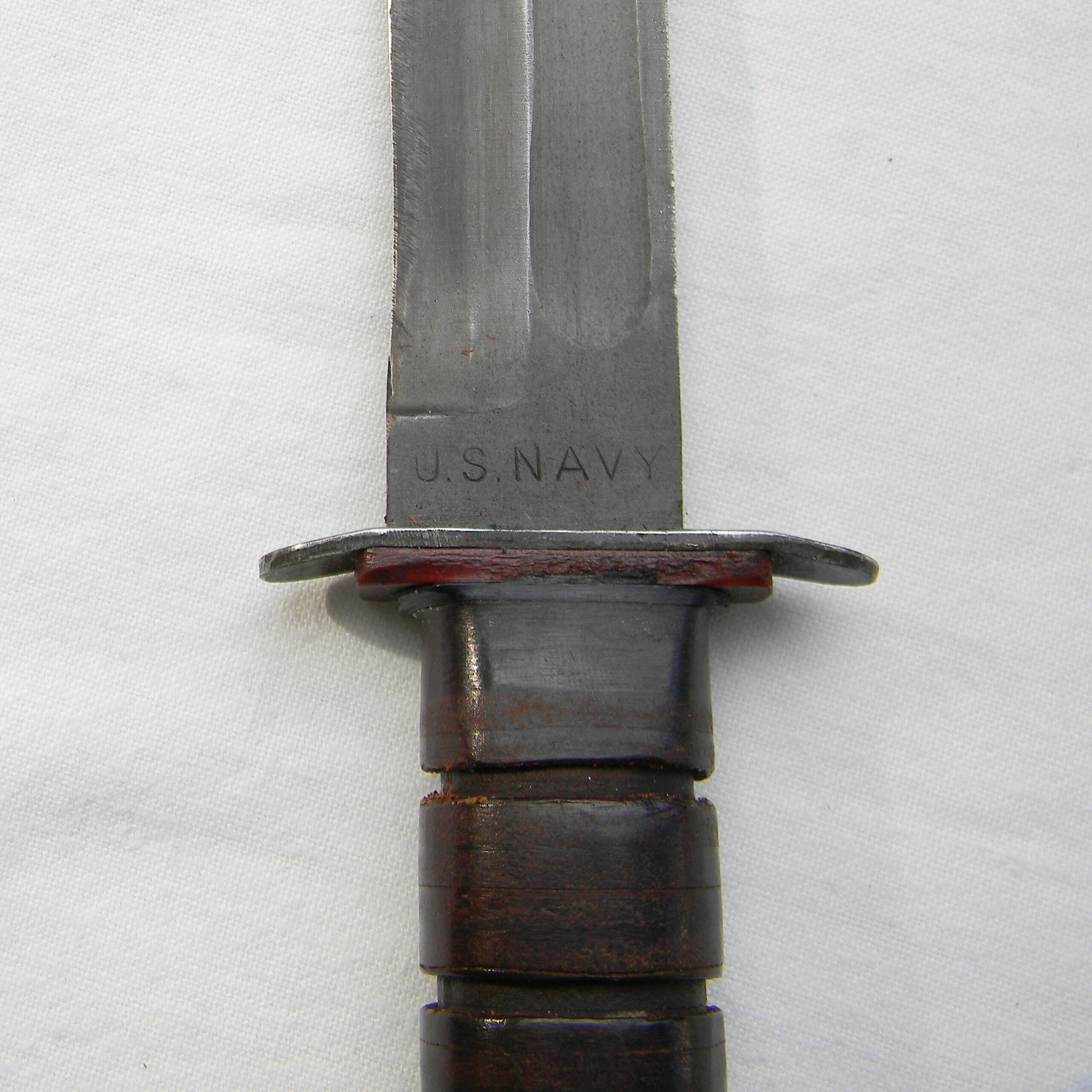 Original WW2 era famous US Navy Mark 2 “Ka-Bar” fighting knife (the link is a courtesy of Wikipedia) manufactured early in the war by PAL Cutlery. This is the scarce and desirable early-production “red spacer” type Mark 2 with the scarce US NAVY designated blade. MK2 is a classic American WW2 era fighting knife; this type was used in combat by the US Army and the Navy men alike in all theaters of the War.