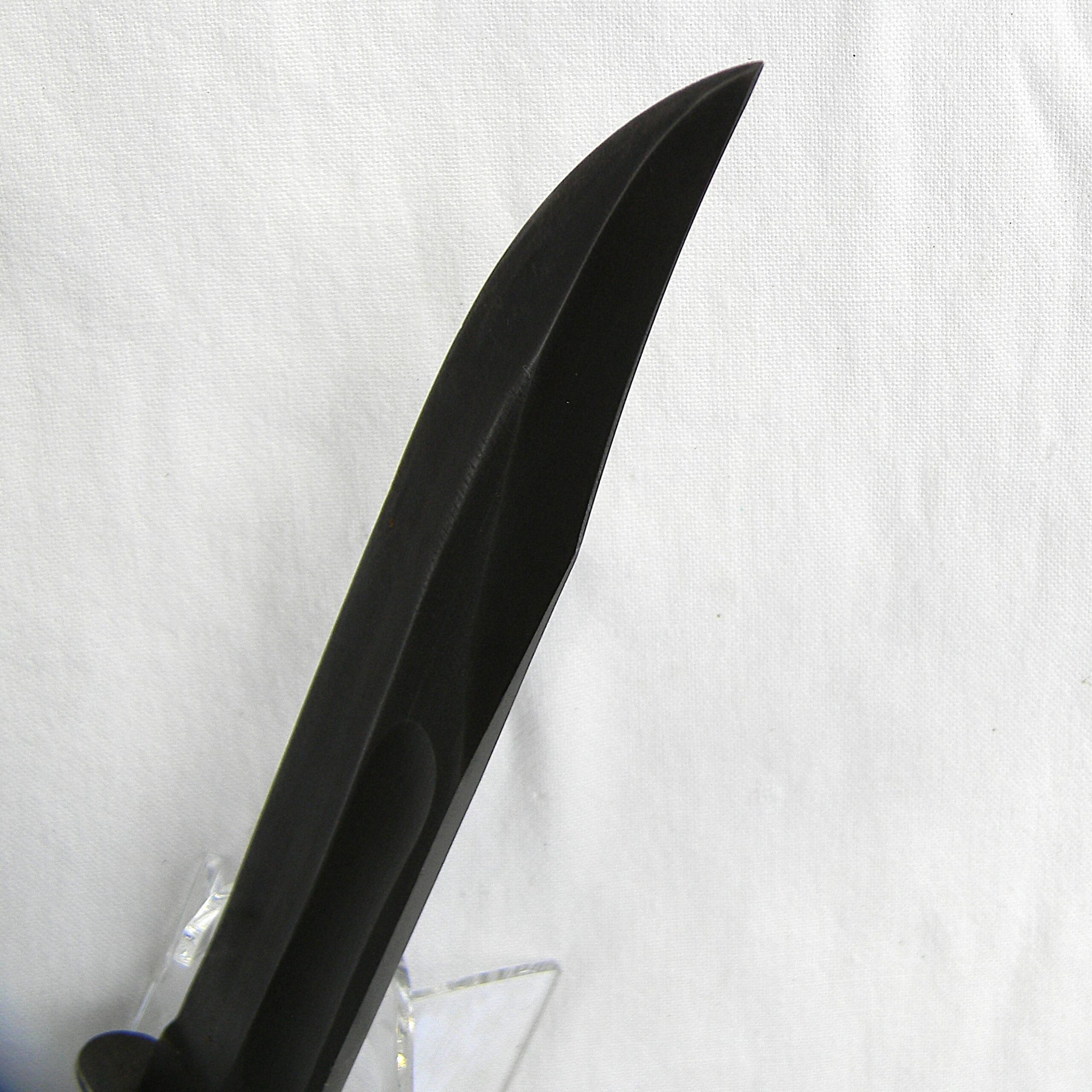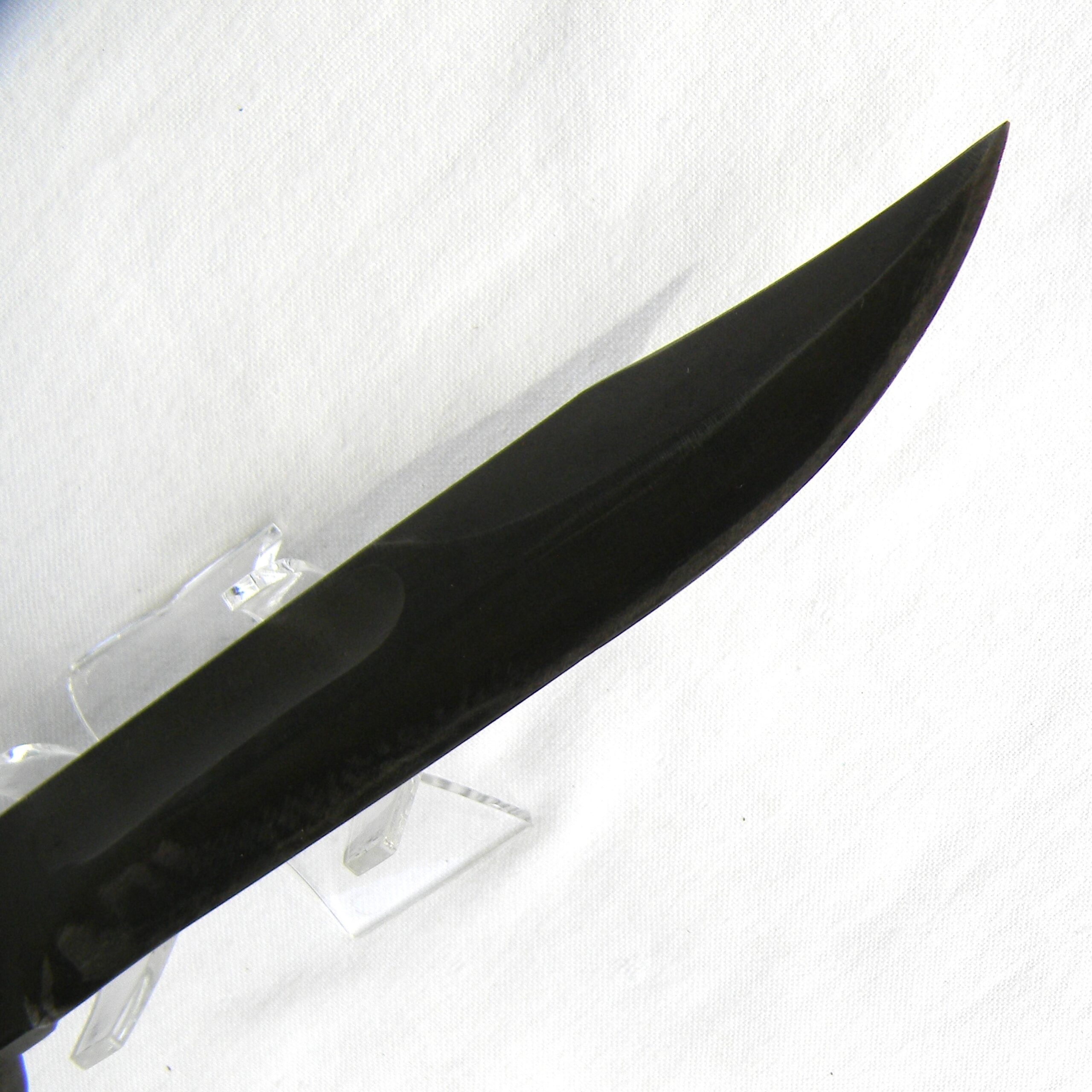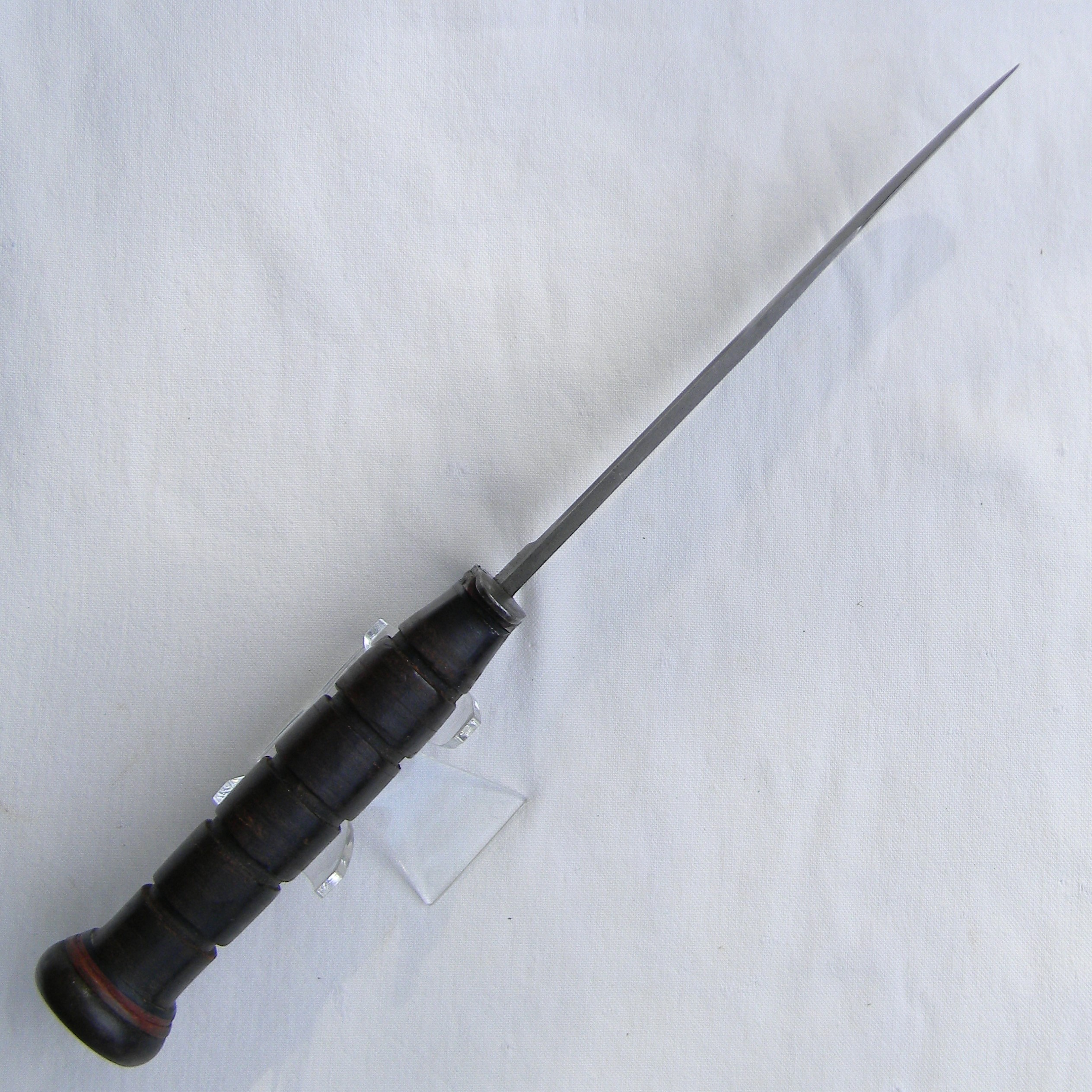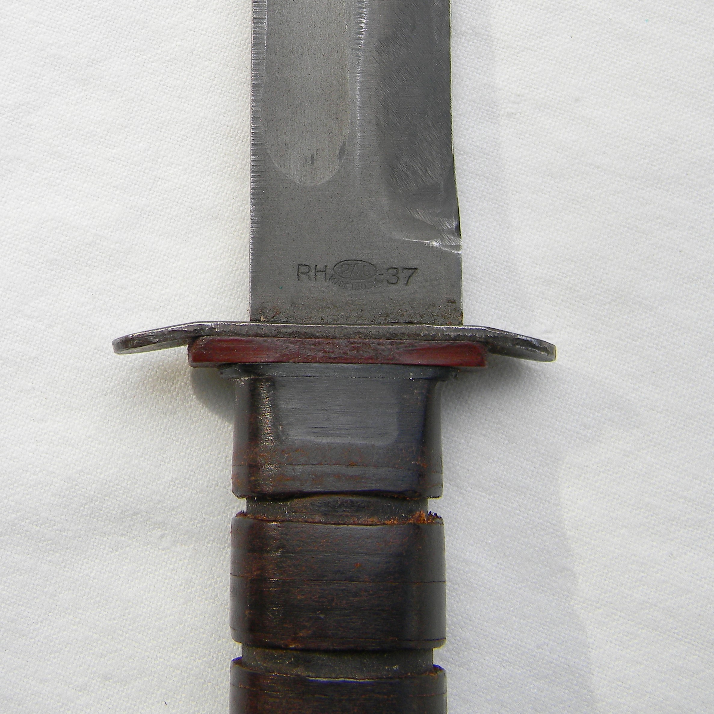 This MK2 is about 12-1/4″ / 31 cm overall; the blade is about 7″ / 17.8 cm long. The knife is only slightly used; the edge has been lightly re-sharpened; it is razor-sharp still; the tip is intact. Ricasso is stamped PAL / RH-37 / MADE IN USA on one side and U.S. NAVY on the other. Stacked leather washers handle with red and black fiber spacers on both ends. An early double-thickness threaded round hammer-like steel pommel and slightly curved handguard. The handle is tight; all parts are solid with no play; no typical ding marks on the pommel or nicks on the spine of the blade – rare as such.